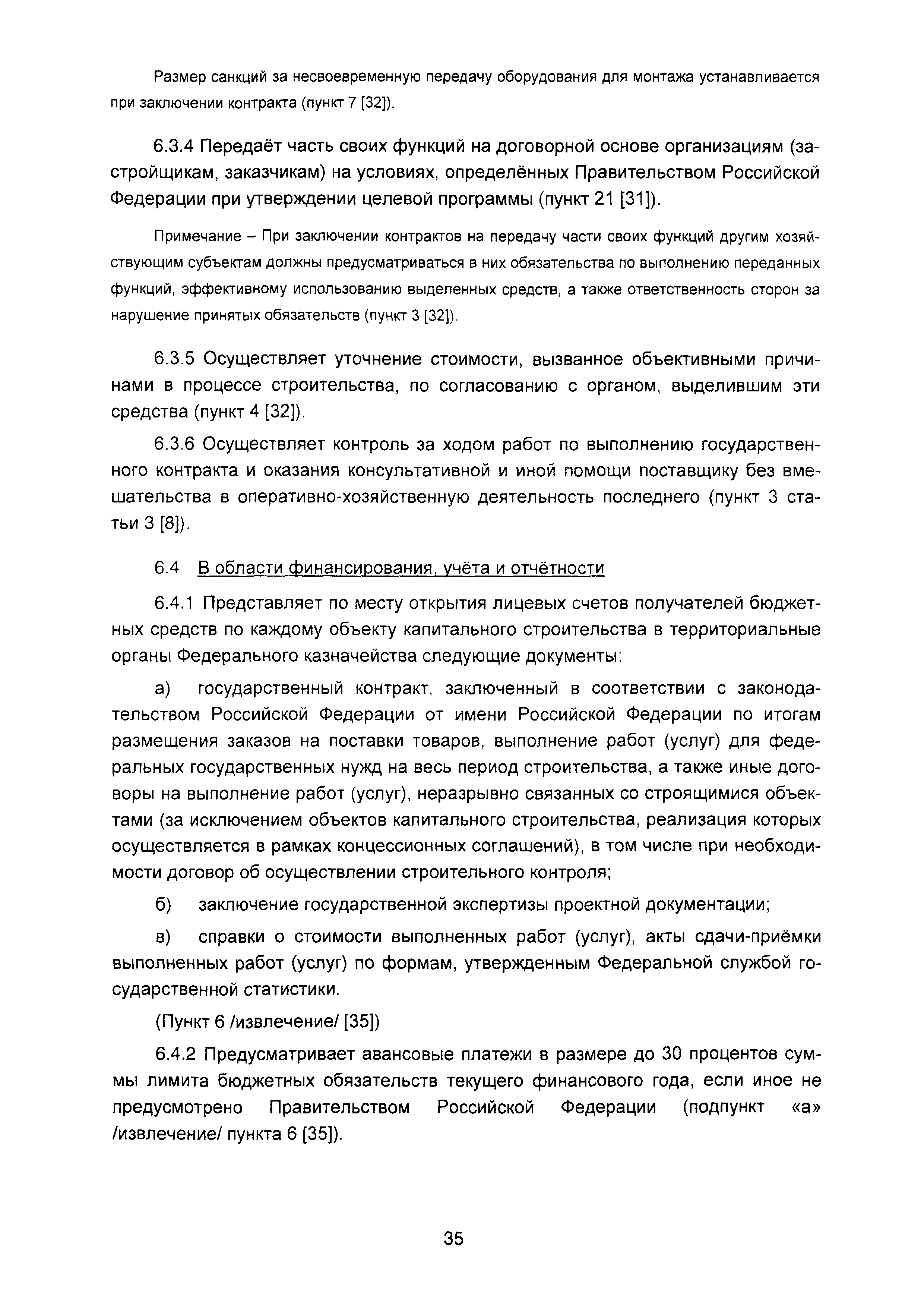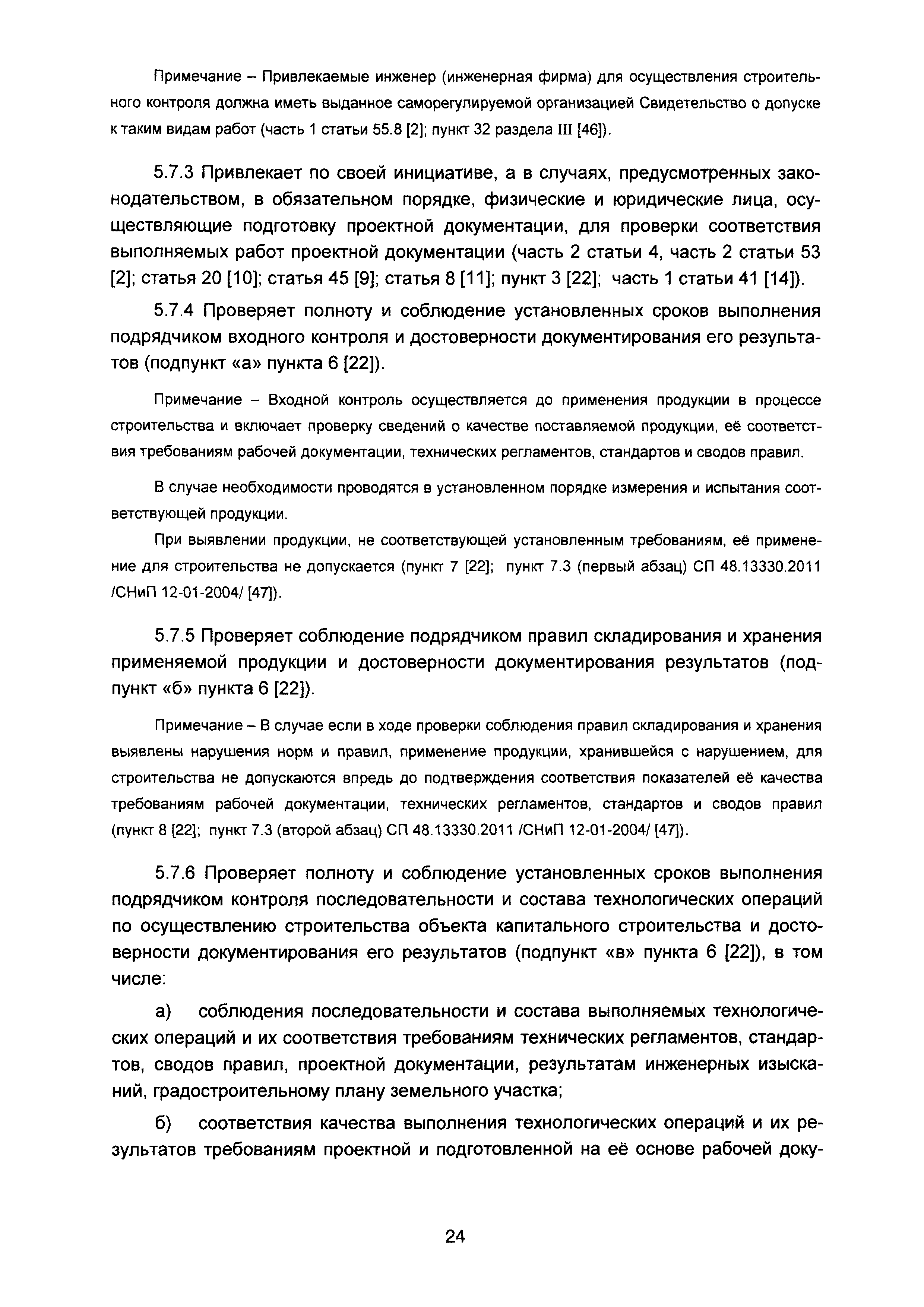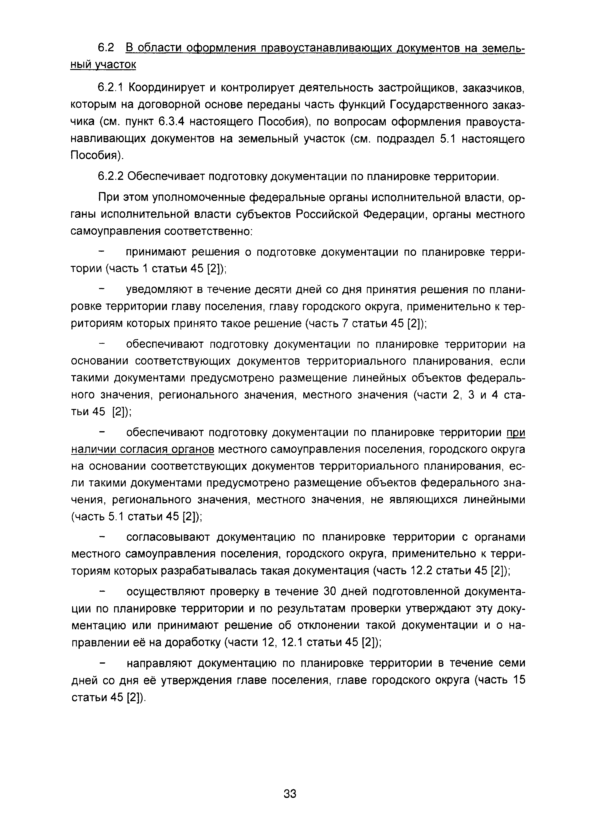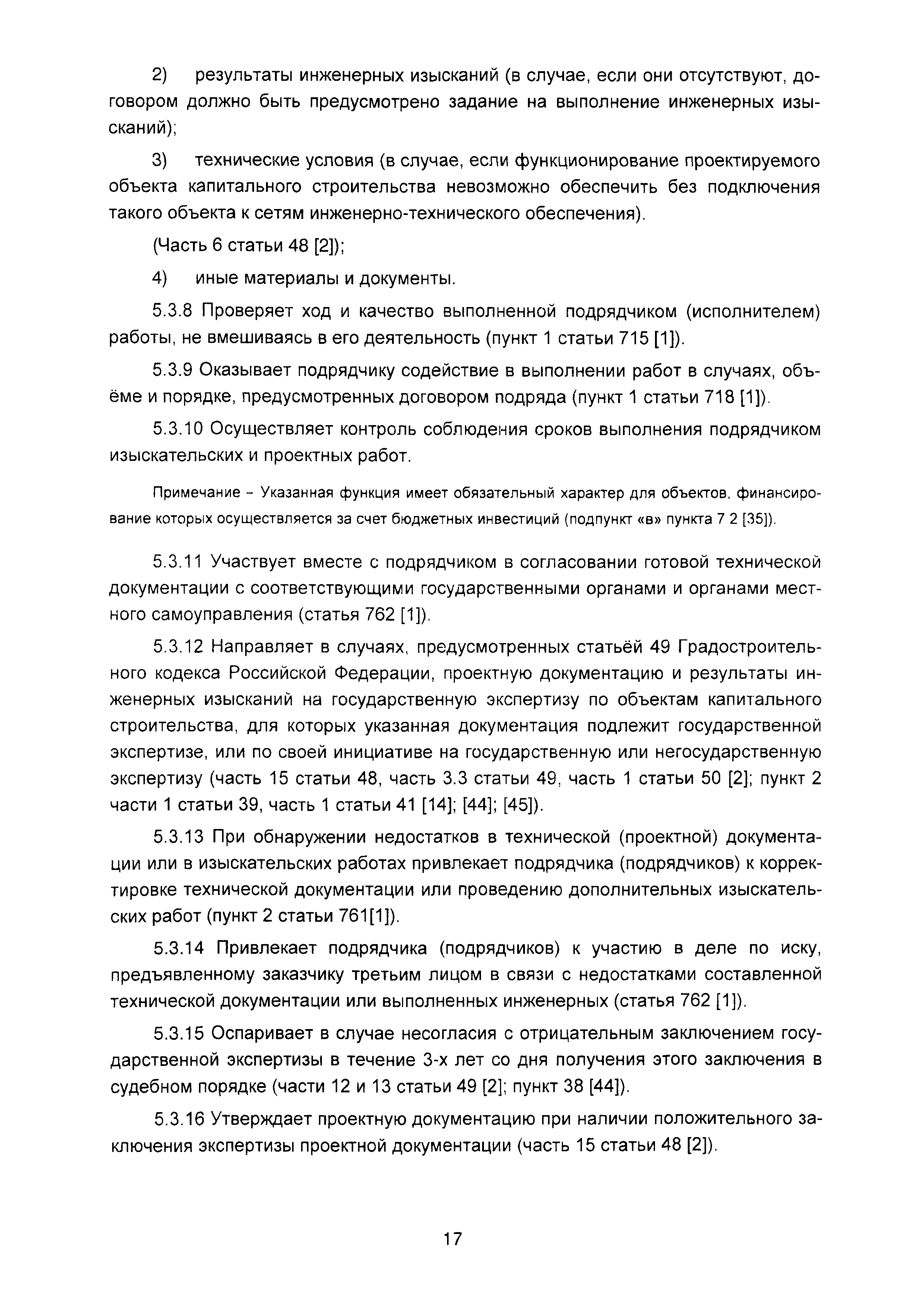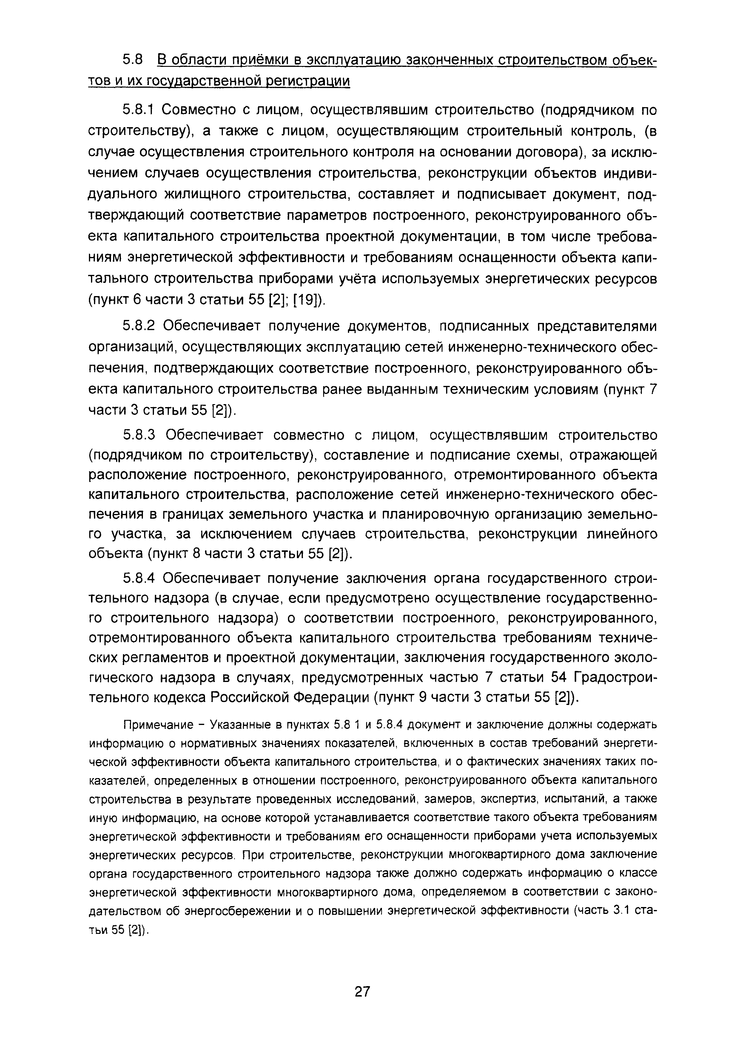 | | Нормативные ссылки: |  Постановление 812 «Об утверждении Основных положений порядка заключения и исполнения государственных контрактов (договоров подряда) на строительство объектов для федеральных государственных нужд в Российской Федерации»  Федеральный закон 169-ФЗ «Об архитектурной деятельности в Российской Федерации»  СНиП 3.01.04-87 «Приемка в эксплуатацию законченных строительством объектов. Основные положения»  ГОСТ 15467-79 «Управление качеством продукции. Основные понятия. Термины и определения»  Федеральный закон 116-ФЗ «О промышленной безопасности опасных производственных объектов»  СП 11-110-99 «Авторский надзор за строительством зданий и сооружений»  Федеральный закон 39-ФЗ «Об инвестиционной деятельности в Российской Федерации, осуществляемой в форме капитальных вложений»  Федеральный закон 126-ФЗ «О связи»  Федеральный закон 122-ФЗ «О государственной регистрации прав на недвижимое имущество и сделок с ним»  СНиП 12-03-2001 «Безопасность труда в строительстве. Часть 1. Общие требования» Кодекс «Земельный кодекс Российской Федерации» Кодекс «Кодекс Российской Федерации об административных правонарушениях»  Федеральный закон 7-ФЗ «Об охране окружающей среды»  ГОСТ Р 51872-2002 «Документация исполнительная геодезическая. Правила выполнения» Постановление 594 «О реализации Федерального закона "О поставках продукции для федеральных государственных нужд"» Постановление 361 «Об утверждении Правил особого регулирования градостроительной деятельности на территориях объектов федерального значения в г. Санкт-Петербурге» Постановление 808 «Об организации и проведении торгов по продаже находящихся в государственной или муниципальной собственности земельных участков или права на заключение договоров аренды таких земельных участков» Приказ 105 «Об утверждении Требований по предупреждению чрезвычайных ситуаций на потенциально опасных объектах и объектах жизнеобеспечения» Постановление 262 «Об утверждении Правил возмещения собственникам земельных участков, землепользователям, землевладельцам и арендаторам земельных участков убытков, причиненных временным занятием земельных участков, ограничением прав собственников земельных участков, землепользователей, землевладельцев и арендаторов земельных участков либо ухудшением качества земель в результате деятельности других лиц»  РД 06-565-03 «Методические указания о порядке продления срока службы технических устройств, зданий и сооружений с истекшим нормативным сроком эксплуатации, в горнорудной промышленности»  СП 13-102-2003 «Правила обследования несущих строительных конструкций зданий и сооружений» Постановление 921 «О государственном техническом учете и технической инвентаризации в Российской Федерации объектов капитального строительства»  Федеральный закон 60-ФЗ «О поставках продукции для федеральных государственных нужд»  Кодекс «Градостроительный кодекс Российской Федерации»  Постановление 698 «О форме разрешения на строительство и форме разрешения на ввод объекта в эксплуатацию»  Федеральный закон 214-ФЗ «Об участии в долевом строительстве многоквартирных домов и иных объектов недвижимости и о внесении изменений в некоторые законодательные акты Российской Федерации» «Правила определения и предоставления технических условий подключения объекта капитального 