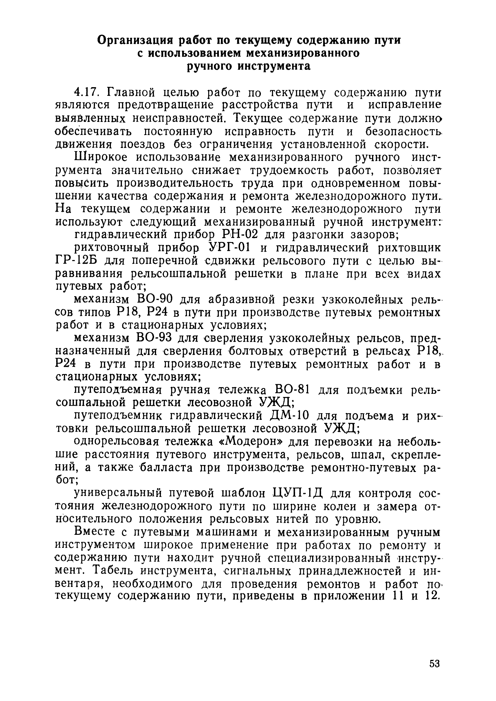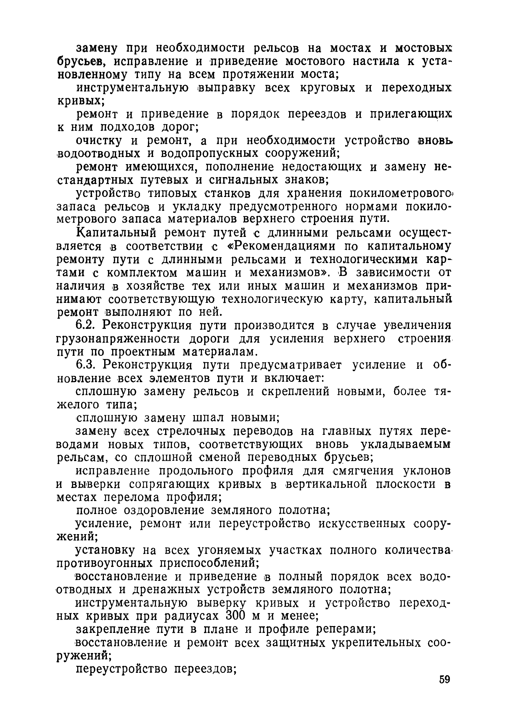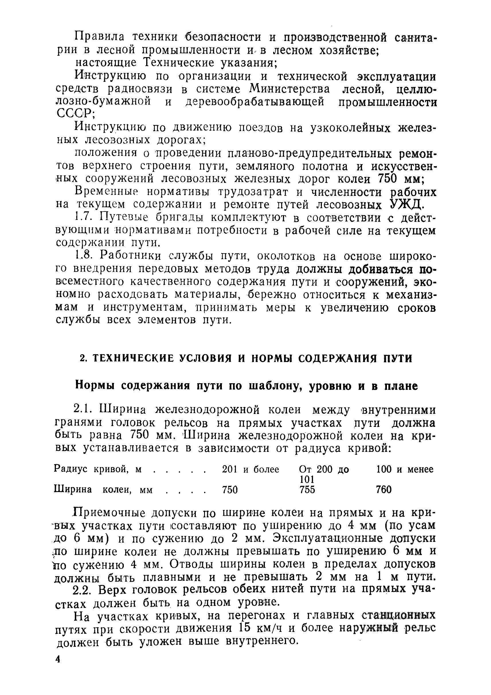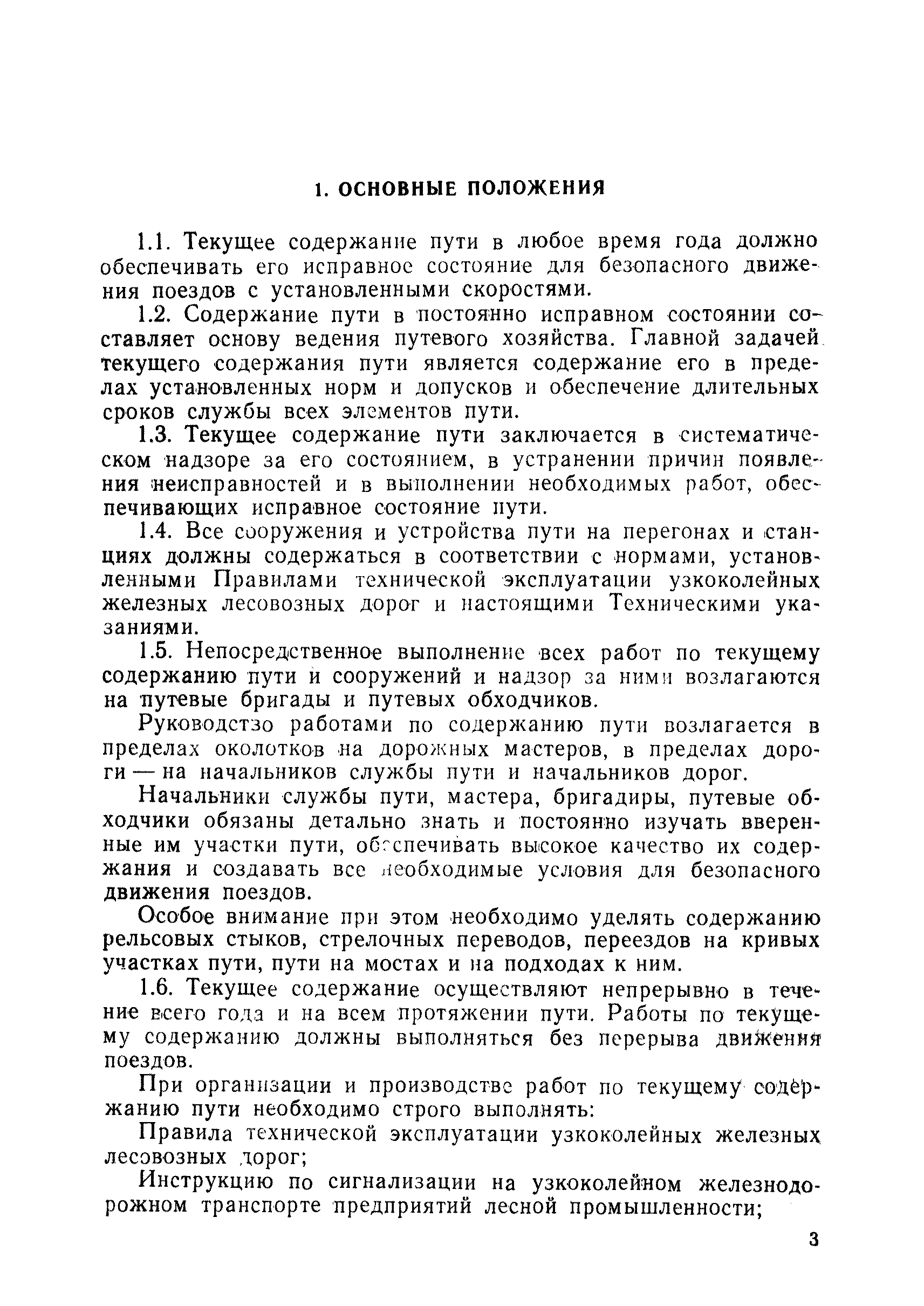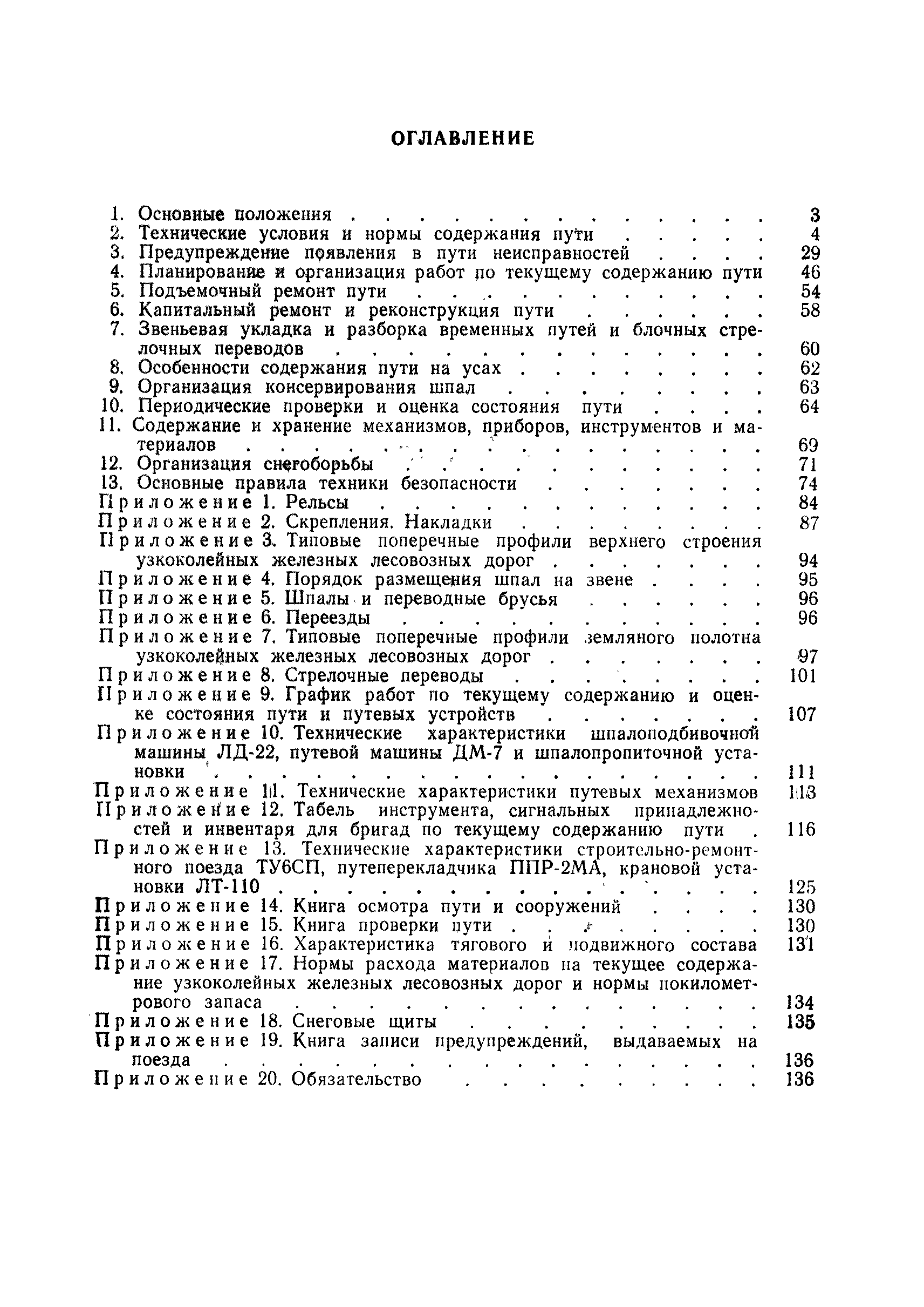 | Оглавление: | 1 Основные положения 2 Технические условия и нормы содержания пути 3 Предупреждение появления в пути неисправностей 4 Планирование и организация работ но текущему содержанию пути 5 Подъемочный ремонт пути 6 Капитальный ремонт и реконструкция пути 7 Звеньевая укладка и разборка временных путей и блочных стрелочных переводов 8 Особенности содержания пути на усах 9 Организация консервирования шпал 10 Периодические проверки и оценка состояния пути 11 Содержание и хранение механизмов, приборов, инструментов и материалов 12 Организация снегоборьбы 13 Основные правила техники безопасности Приложение 1. Рельсы Приложение 2. Скрепления. Накладки Приложение 3. Типовые поперечные профили верхнего строения узкоколейных железных лесовозных дорог Приложение 4. Порядок размещения шпал на звене Приложение 5. Шпалы и переводные брусья Приложение 6. Переезды Приложение 7. Типовые поверечные профили земляного полотна узкоколейных железных лесовозных дорог Приложение 8. Стрелочные переводы Приложение 9. График работ по текущему содержанию и оценке состояния пути и путевых устройств Приложение 10. Технические характеристики шпалоподбивочной машины ЛД-22, путевой машины ДМ-7 и шпалопропиточной установки Приложение 11. Технические характеристики путевых механизмов Приложение 12. Табель инструмента, сигнальных принадлежностей и инвентаря для бригад по текущему содержанию пути Приложение 13. Технические характеристики строительно-ремонтного поезда ТУ6СП, путеперекладчика ППР-2МА, крановой установки ЛТ-110 Приложение 14. Книга осмотра пути и сооружений Приложение 15. Книга проверки пути Приложение 16. Характеристика тягового и подвижного состава Приложение 17. Нормы расхода материалов на текущее содержание узкоколейных железных лесовозных дорог и нормы покилометрового запаса Приложение 18. Снеговые щиты Приложение 19. Книга записи предупреждений, выдаваемых на поезда Приложение 20. Обязательство |