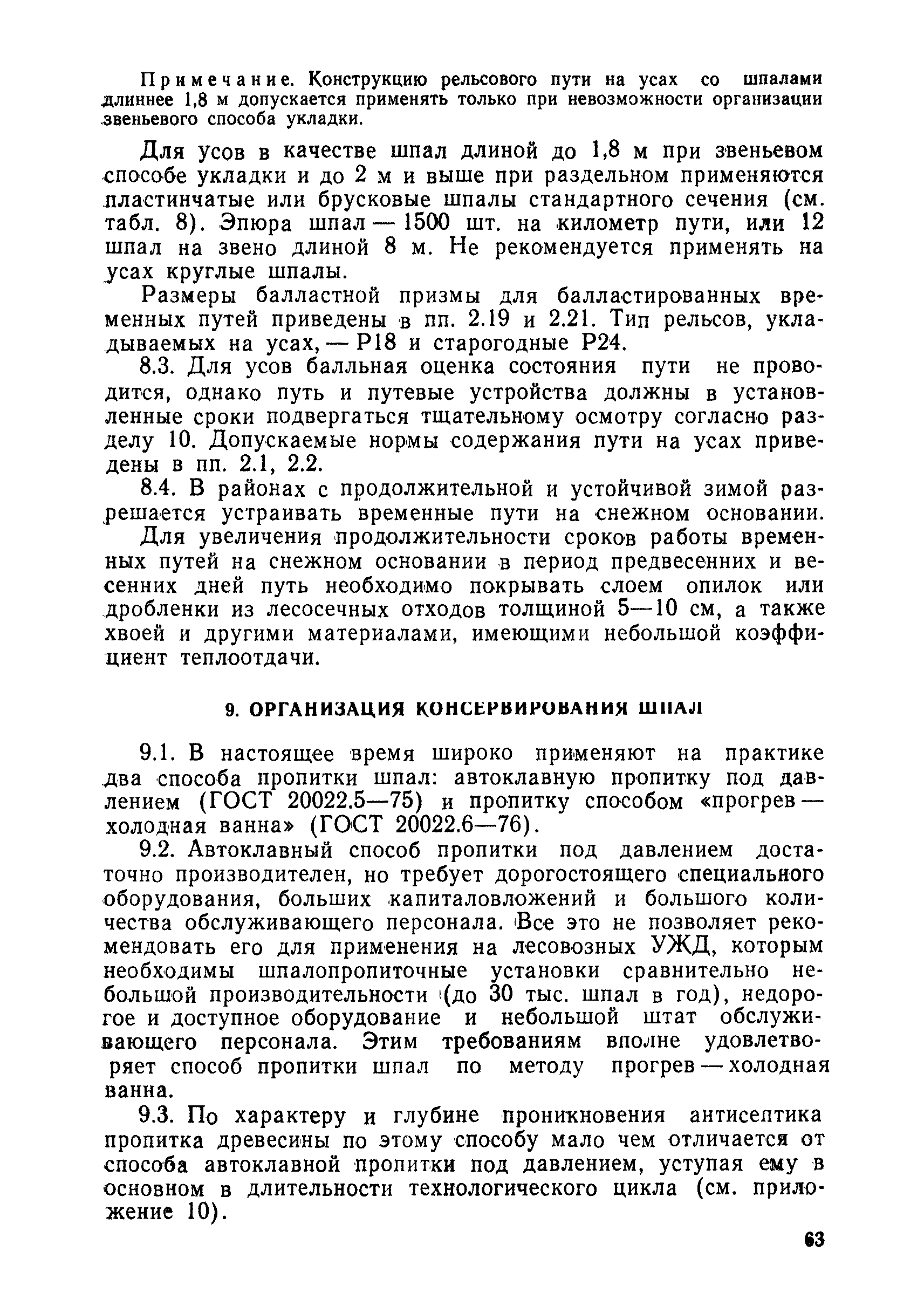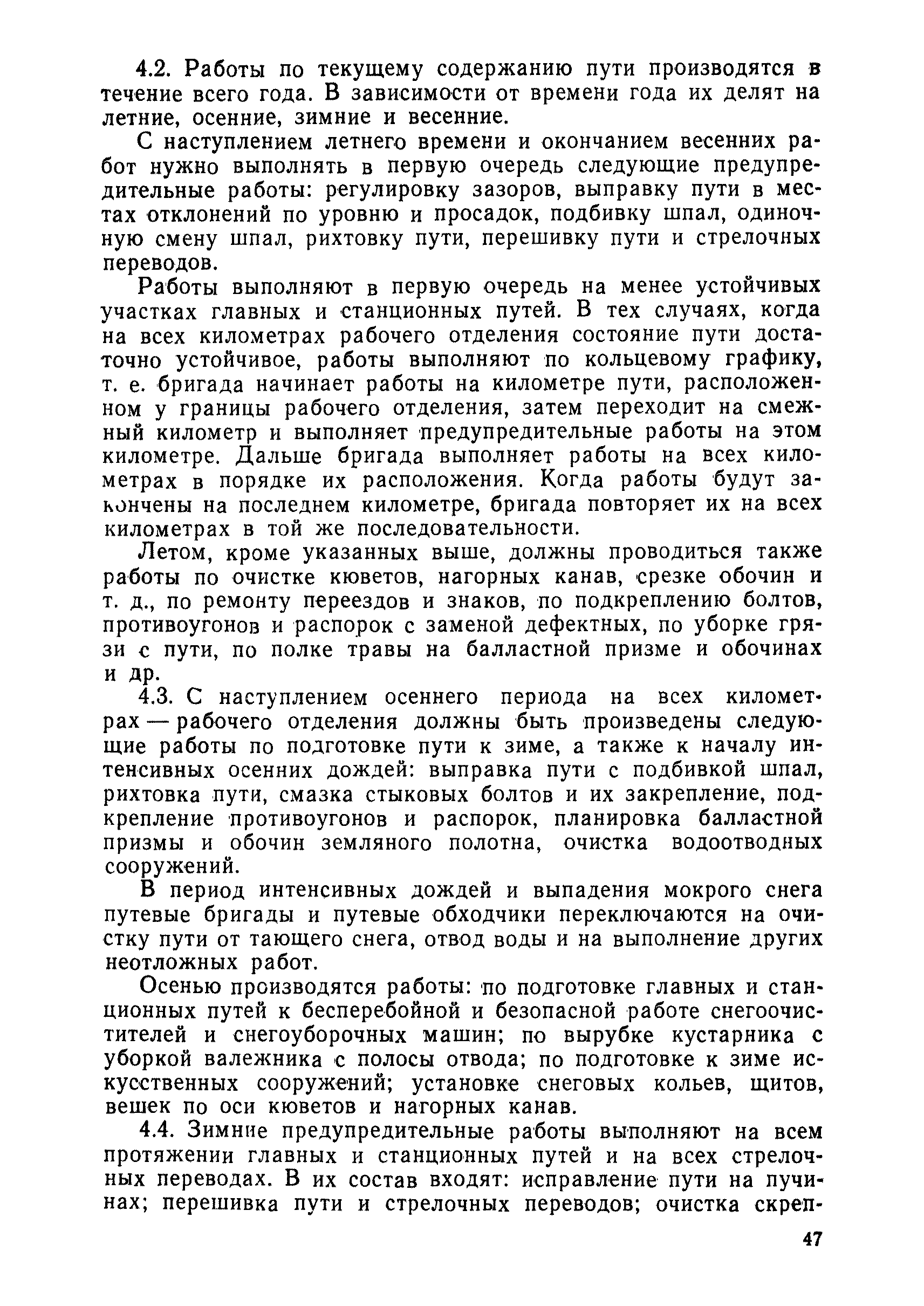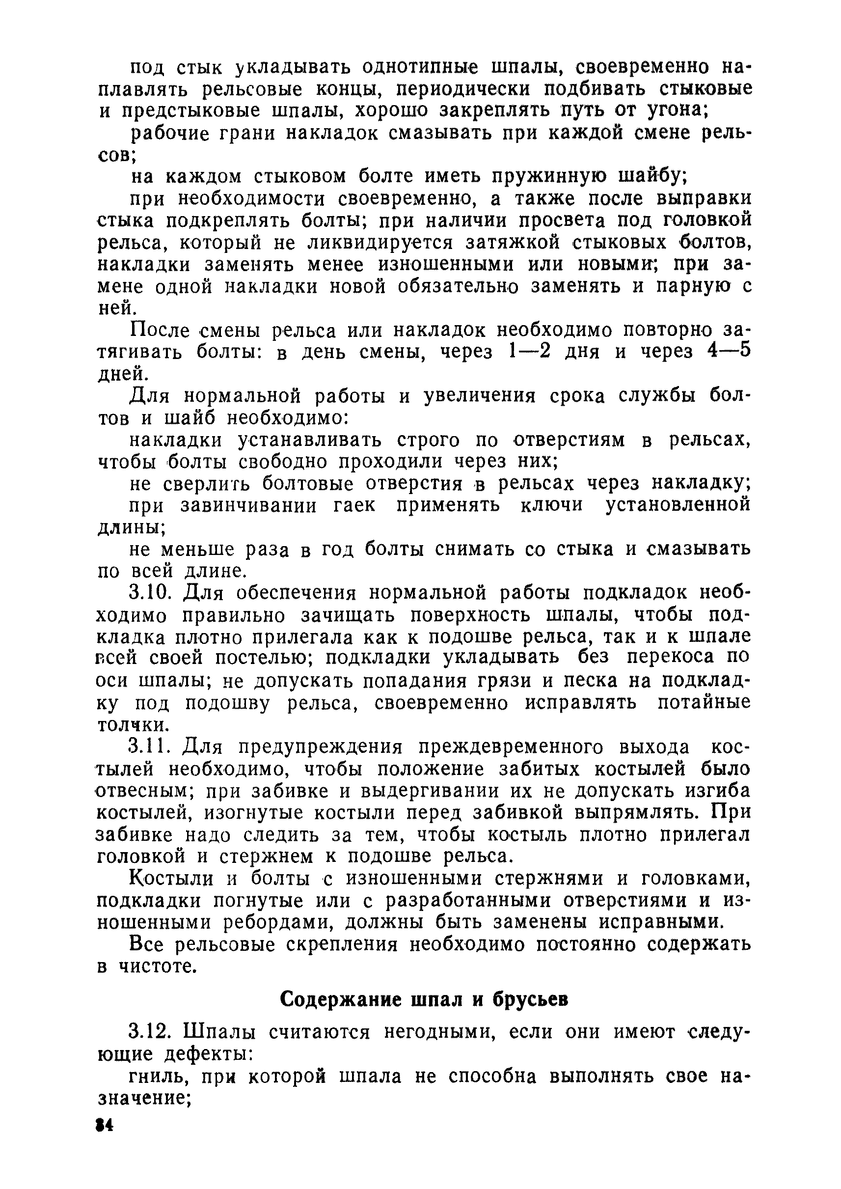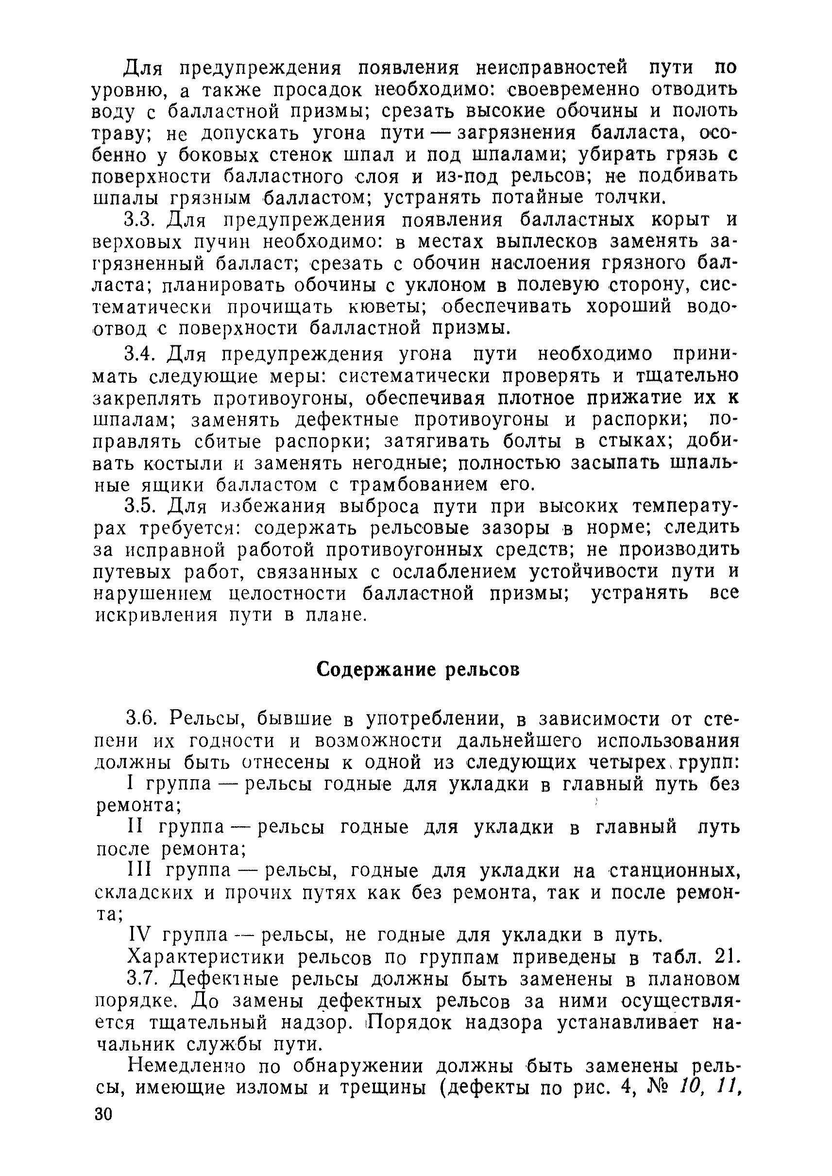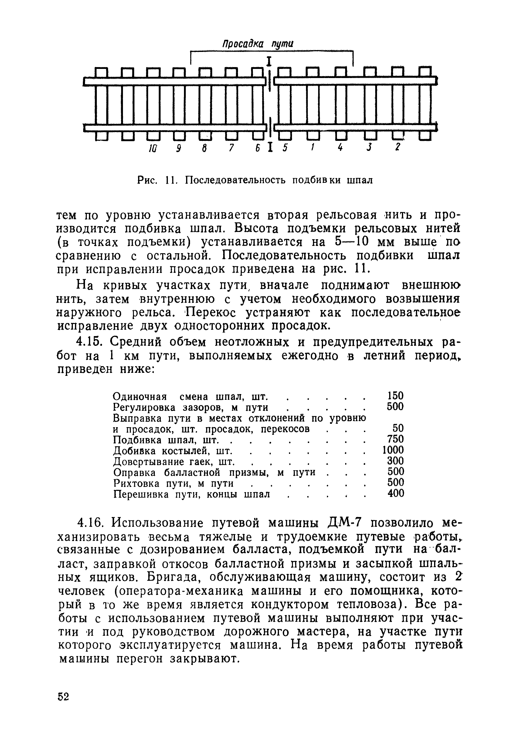| Оглавление: | 1 Основные положения 2 Технические условия и нормы содержания пути 3 Предупреждение появления в пути неисправностей 4 Планирование и организация работ но текущему содержанию пути 5 Подъемочный ремонт пути 6 Капитальный ремонт и реконструкция пути 7 Звеньевая укладка и разборка временных путей и блочных стрелочных переводов 8 Особенности содержания пути на усах 9 Организация консервирования шпал 10 Периодические проверки и оценка состояния пути 11 Содержание и хранение механизмов, приборов, инструментов и материалов 12 Организация снегоборьбы 13 Основные правила техники безопасности Приложение 1. Рельсы Приложение 2. Скрепления. Накладки Приложение 3. Типовые поперечные профили верхнего строения узкоколейных железных лесовозных дорог Приложение 4. Порядок размещения шпал на звене Приложение 5. Шпалы и переводные брусья Приложение 6. Переезды Приложение 7. Типовые поверечные профили земляного полотна узкоколейных железных лесовозных дорог Приложение 8. Стрелочные переводы Приложение 9. График работ по текущему содержанию и оценке состояния пути и путевых устройств Приложение 10. Технические характеристики шпалоподбивочной машины ЛД-22, путевой машины ДМ-7 и шпалопропиточной установки Приложение 11. Технические характеристики путевых механизмов Приложение 12. Табель инструмента, сигнальных принадлежностей и инвентаря для бригад по текущему содержанию пути Приложение 13. Технические характеристики строительно-ремонтного поезда ТУ6СП, путеперекладчика ППР-2МА, крановой установки ЛТ-110 Приложение 14. Книга осмотра пути и сооружений Приложение 15. Книга проверки пути Приложение 16. Характеристика тягового и подвижного состава Приложение 17. Нормы расхода материалов на текущее содержание узкоколейных железных лесовозных дорог и нормы покилометрового запаса Приложение 18. Снеговые щиты Приложение 19. Книга записи предупреждений, выдаваемых на поезда Приложение 20. Обязательство |