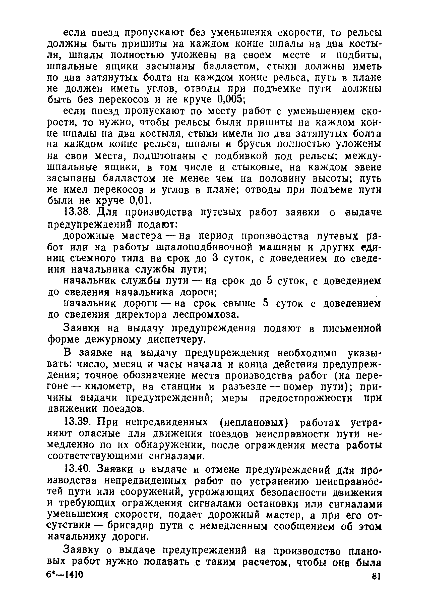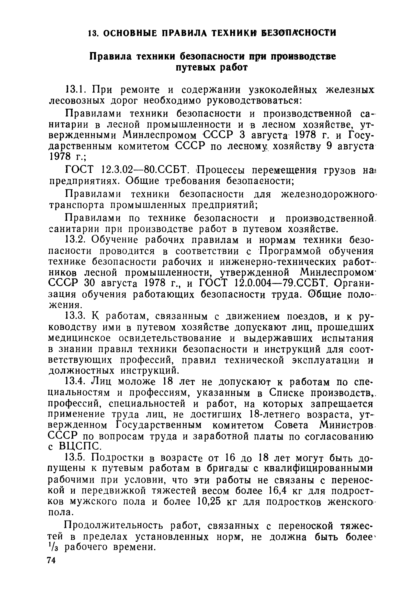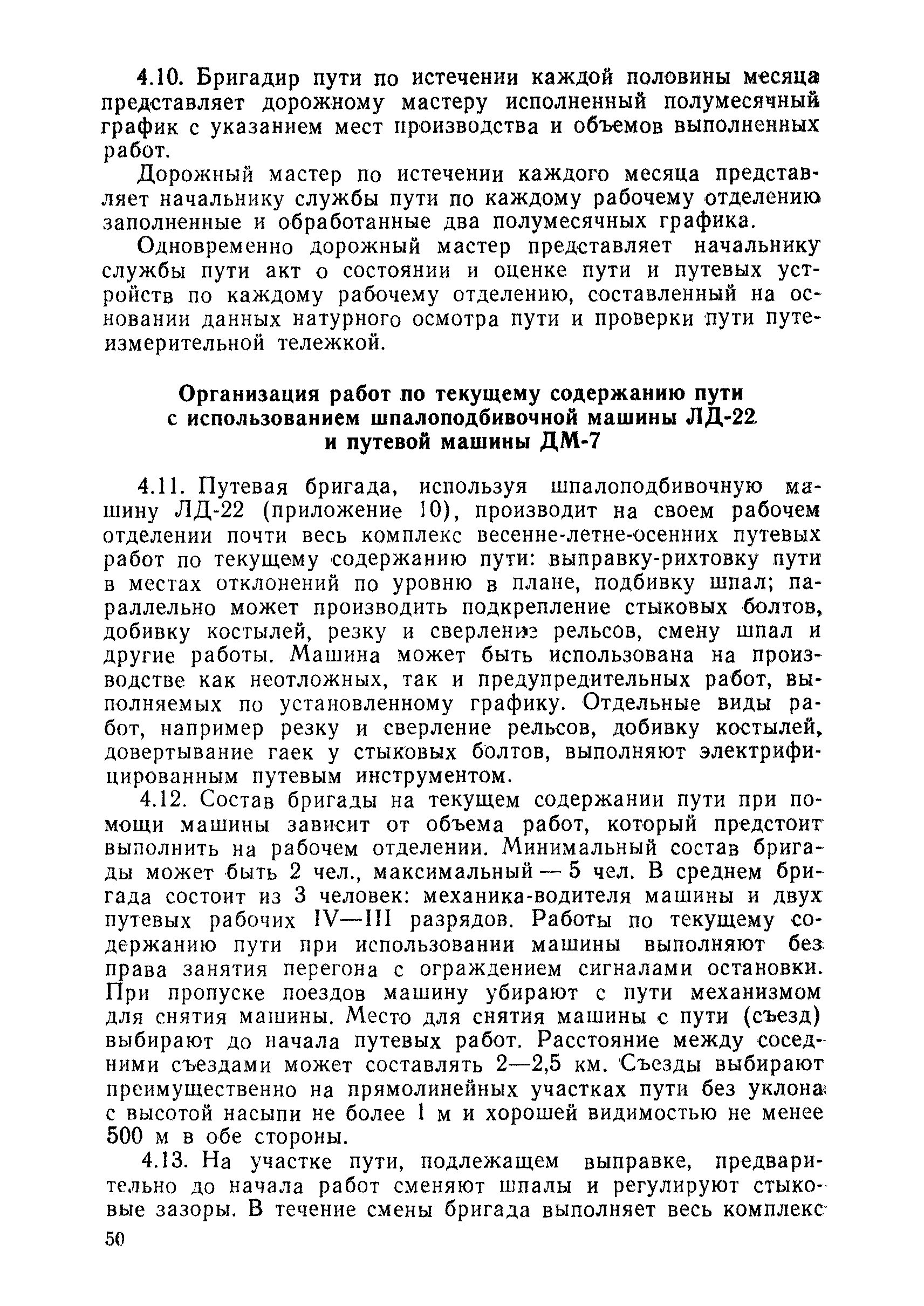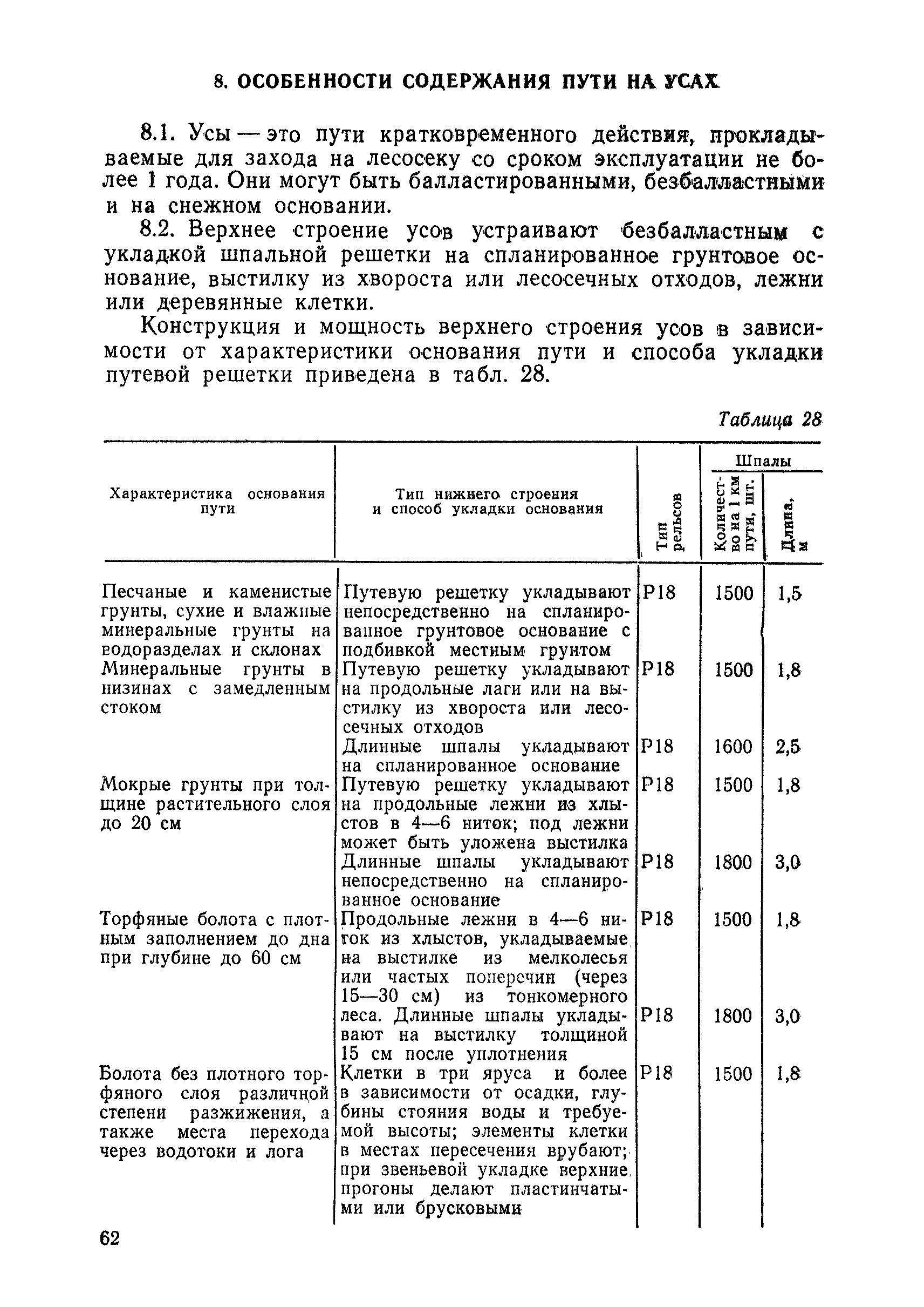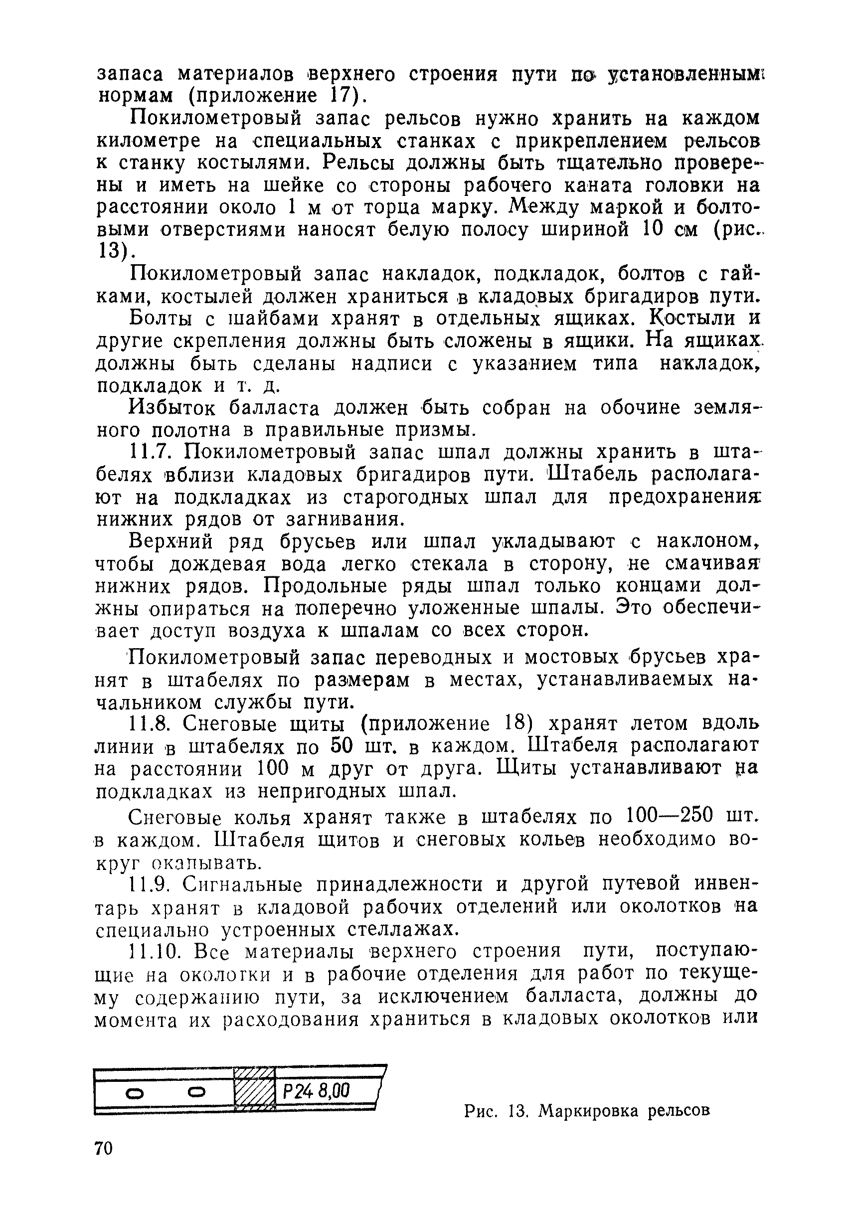 | Оглавление: | 1 Основные положения 2 Технические условия и нормы содержания пути 3 Предупреждение появления в пути неисправностей 4 Планирование и организация работ но текущему содержанию пути 5 Подъемочный ремонт пути 6 Капитальный ремонт и реконструкция пути 7 Звеньевая укладка и разборка временных путей и блочных стрелочных переводов 8 Особенности содержания пути на усах 9 Организация консервирования шпал 10 Периодические проверки и оценка состояния пути 11 Содержание и хранение механизмов, приборов, инструментов и материалов 12 Организация снегоборьбы 13 Основные правила техники безопасности Приложение 1. Рельсы Приложение 2. Скрепления. Накладки Приложение 3. Типовые поперечные профили верхнего строения узкоколейных железных лесовозных дорог Приложение 4. Порядок размещения шпал на звене Приложение 5. Шпалы и переводные брусья Приложение 6. Переезды Приложение 7. Типовые поверечные профили земляного полотна узкоколейных железных лесовозных дорог Приложение 8. Стрелочные переводы Приложение 9. График работ по текущему содержанию и оценке состояния пути и путевых устройств Приложение 10. Технические характеристики шпалоподбивочной машины ЛД-22, путевой машины ДМ-7 и шпалопропиточной установки Приложение 11. Технические характеристики путевых механизмов Приложение 12. Табель инструмента, сигнальных принадлежностей и инвентаря для бригад по текущему содержанию пути Приложение 13. Технические характеристики строительно-ремонтного поезда ТУ6СП, путеперекладчика ППР-2МА, крановой установки ЛТ-110 Приложение 14. Книга осмотра пути и сооружений Приложение 15. Книга проверки пути Приложение 16. Характеристика тягового и подвижного состава Приложение 17. Нормы расхода материалов на текущее содержание узкоколейных железных лесовозных дорог и нормы покилометрового запаса Приложение 18. Снеговые щиты Приложение 19. Книга записи предупреждений, выдаваемых на поезда Приложение 20. Обязательство |