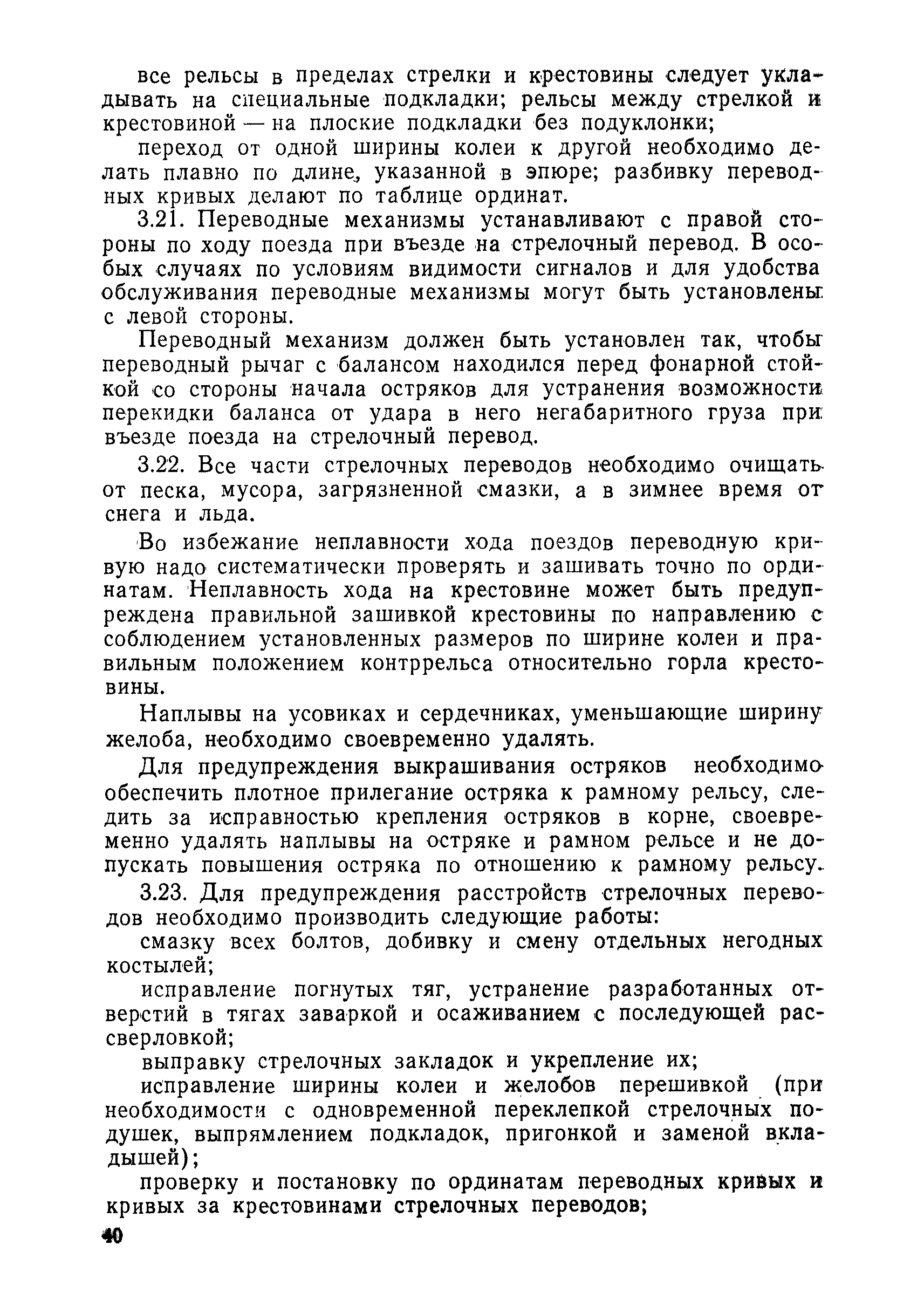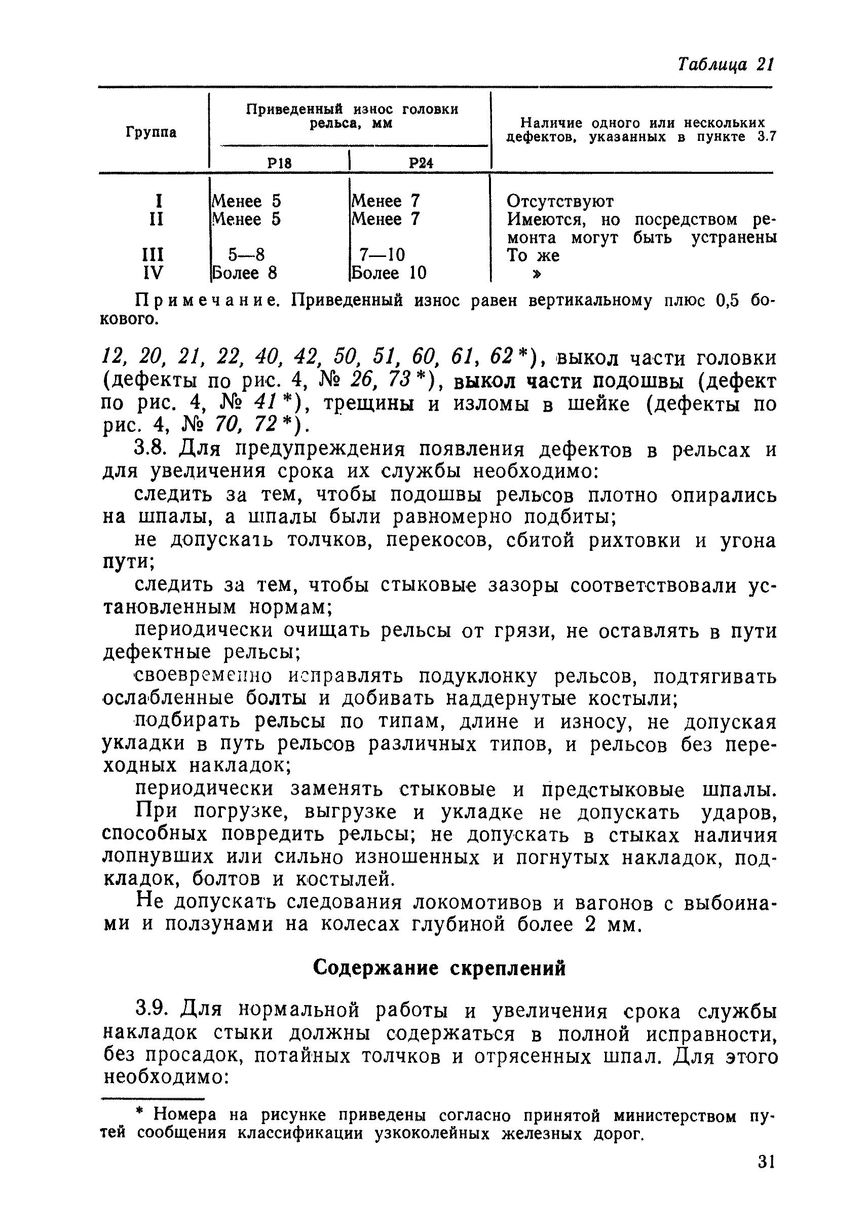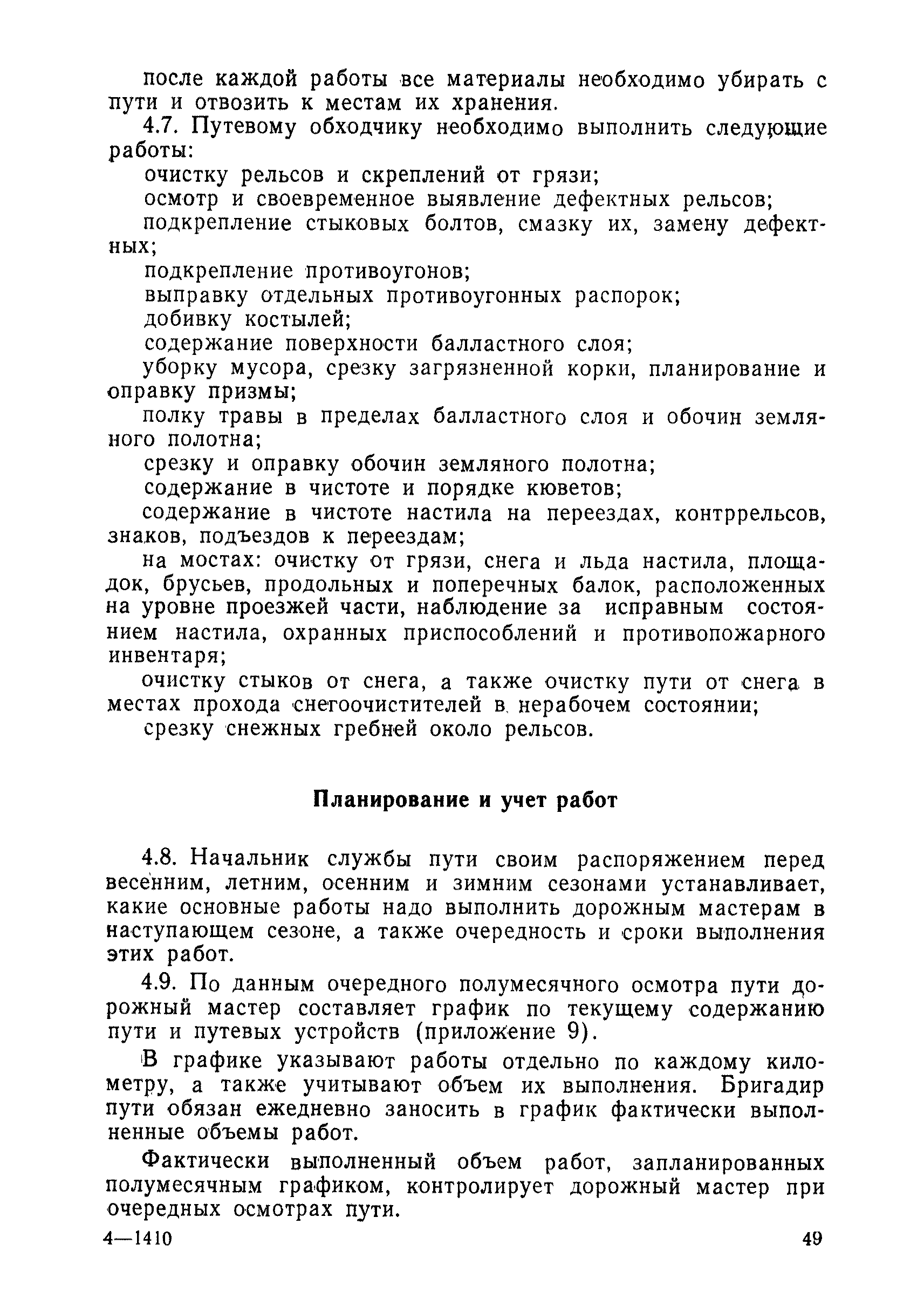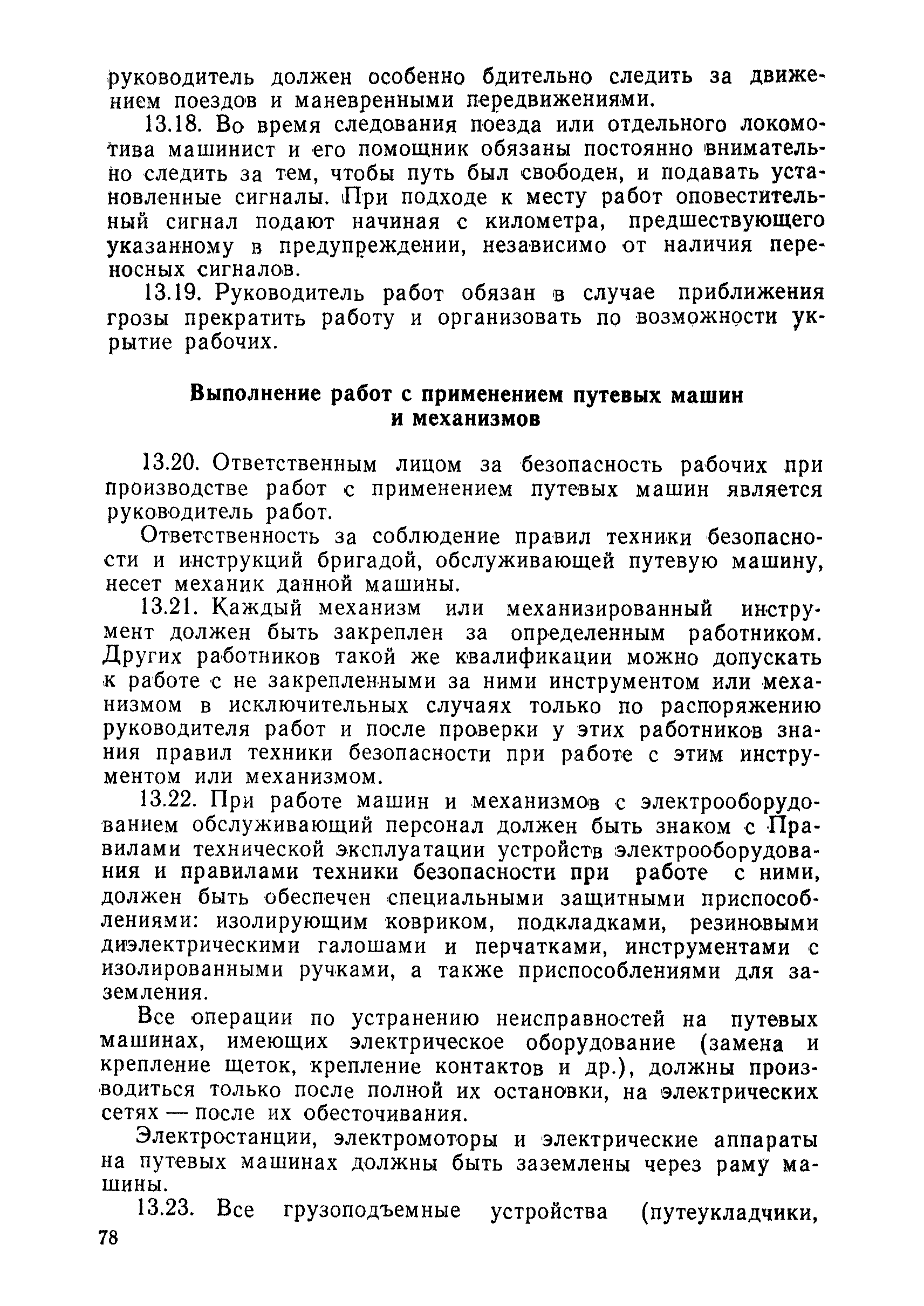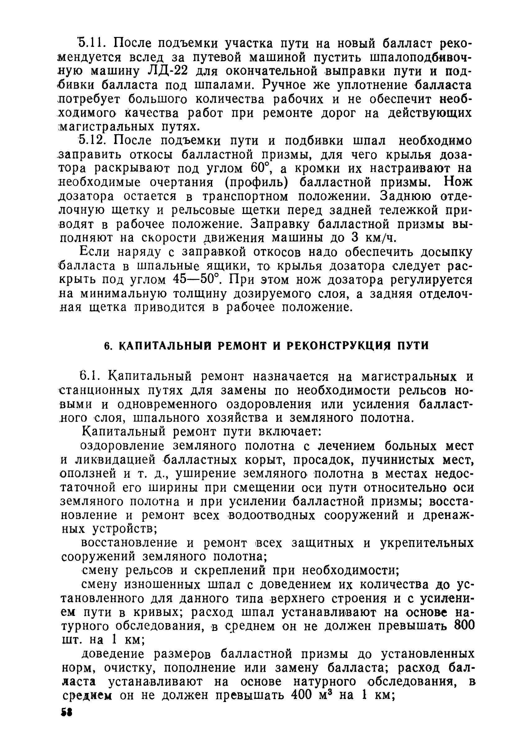 | Оглавление: | 1 Основные положения 2 Технические условия и нормы содержания пути 3 Предупреждение появления в пути неисправностей 4 Планирование и организация работ но текущему содержанию пути 5 Подъемочный ремонт пути 6 Капитальный ремонт и реконструкция пути 7 Звеньевая укладка и разборка временных путей и блочных стрелочных переводов 8 Особенности содержания пути на усах 9 Организация консервирования шпал 10 Периодические проверки и оценка состояния пути 11 Содержание и хранение механизмов, приборов, инструментов и материалов 12 Организация снегоборьбы 13 Основные правила техники безопасности Приложение 1. Рельсы Приложение 2. Скрепления. Накладки Приложение 3. Типовые поперечные профили верхнего строения узкоколейных железных лесовозных дорог Приложение 4. Порядок размещения шпал на звене Приложение 5. Шпалы и переводные брусья Приложение 6. Переезды Приложение 7. Типовые поверечные профили земляного полотна узкоколейных железных лесовозных дорог Приложение 8. Стрелочные переводы Приложение 9. График работ по текущему содержанию и оценке состояния пути и путевых устройств Приложение 10. Технические характеристики шпалоподбивочной машины ЛД-22, путевой машины ДМ-7 и шпалопропиточной установки Приложение 11. Технические характеристики путевых механизмов Приложение 12. Табель инструмента, сигнальных принадлежностей и инвентаря для бригад по текущему содержанию пути Приложение 13. Технические характеристики строительно-ремонтного поезда ТУ6СП, путеперекладчика ППР-2МА, крановой установки ЛТ-110 Приложение 14. Книга осмотра пути и сооружений Приложение 15. Книга проверки пути Приложение 16. Характеристика тягового и подвижного состава Приложение 17. Нормы расхода материалов на текущее содержание узкоколейных железных лесовозных дорог и нормы покилометрового запаса Приложение 18. Снеговые щиты Приложение 19. Книга записи предупреждений, выдаваемых на поезда Приложение 20. Обязательство |
