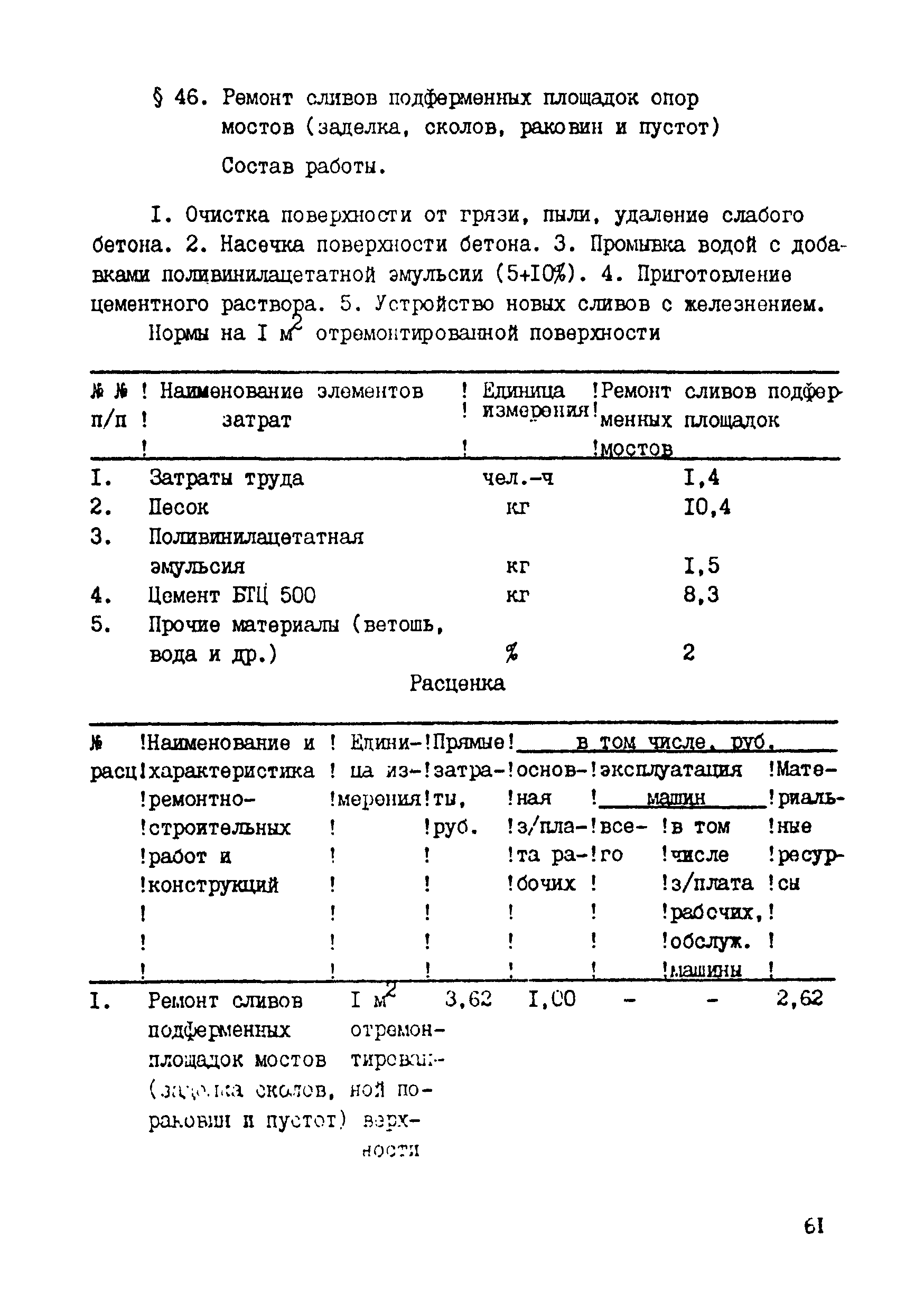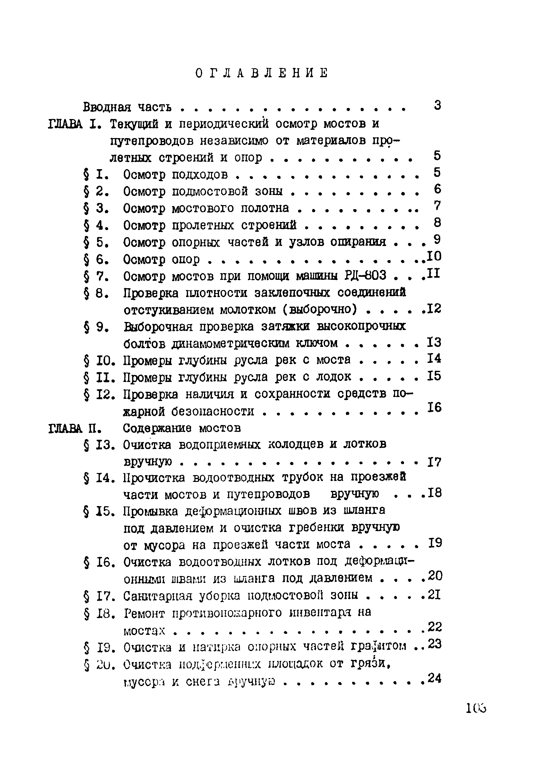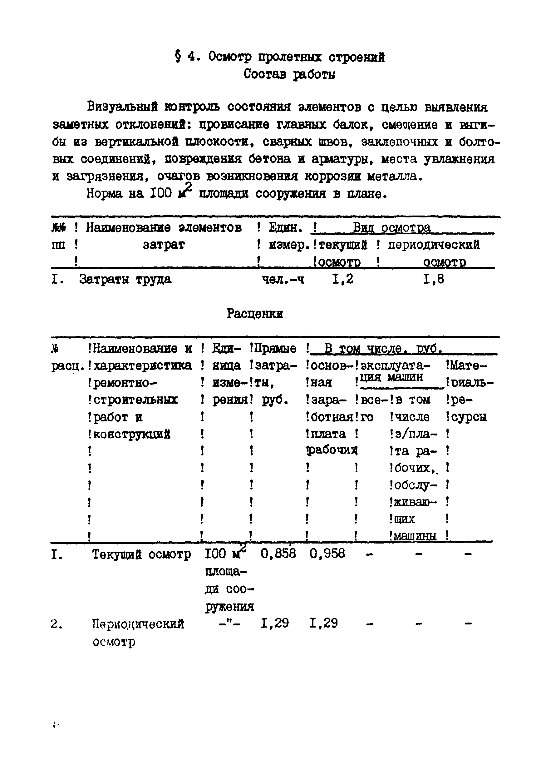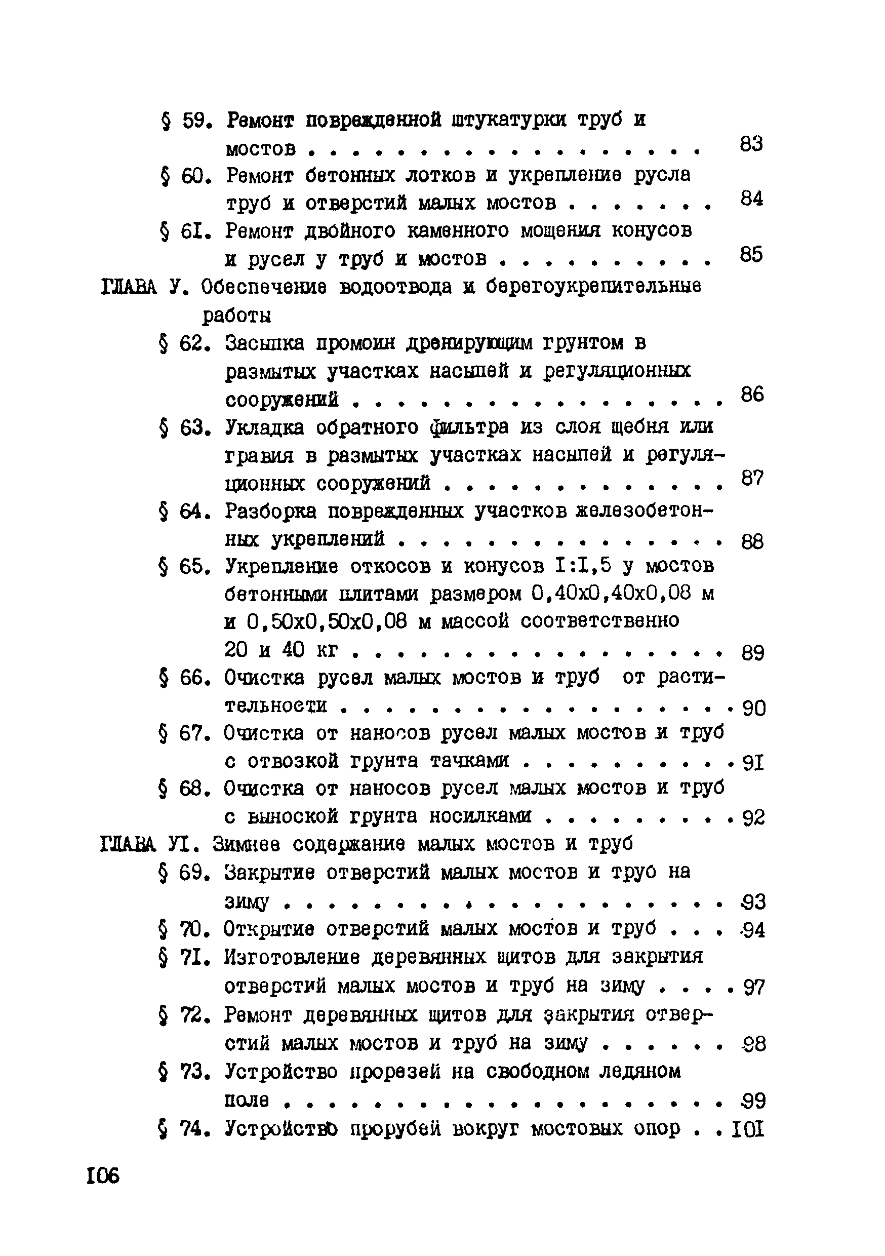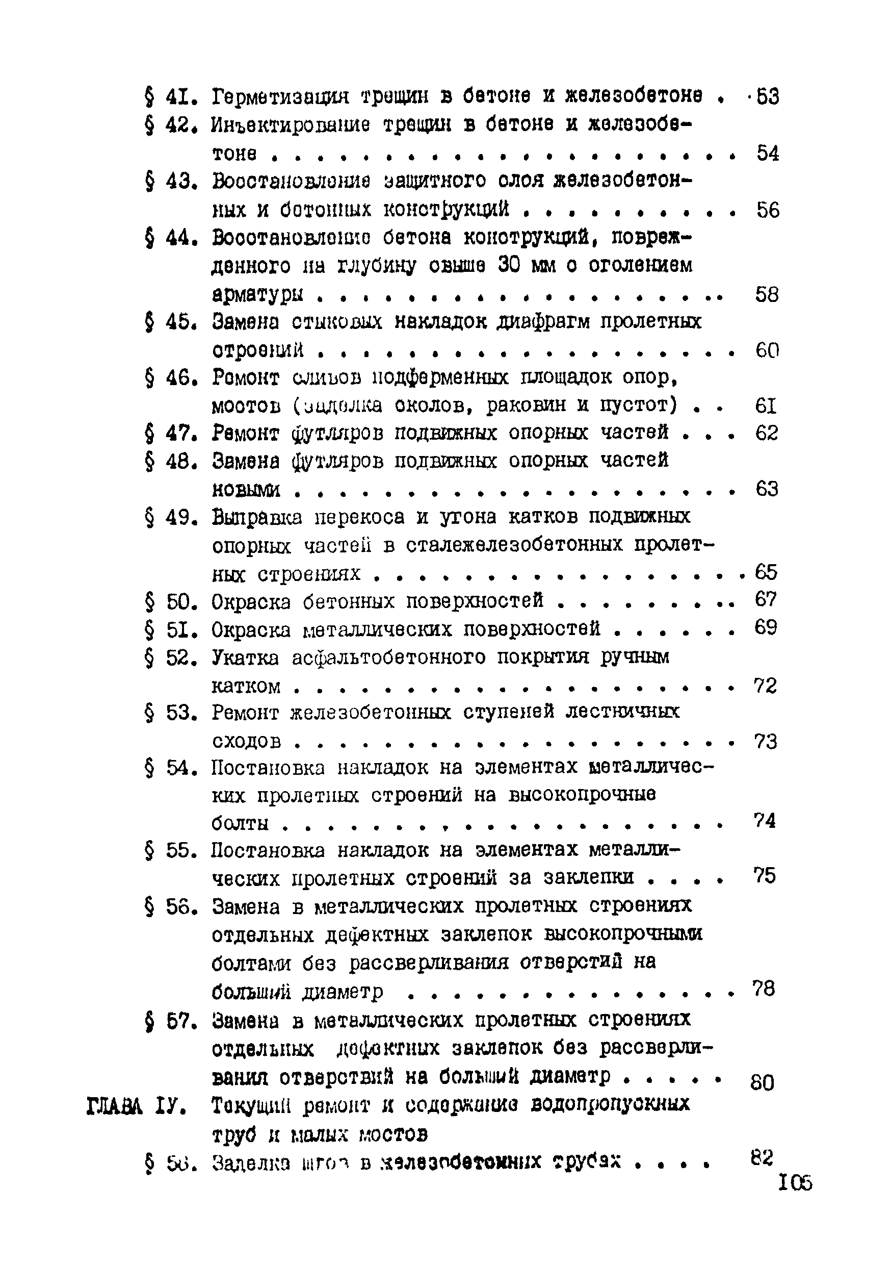 | Оглавление: | Вводная часть Глава I. Текущий и периодический осмотр мостов и путепроводов независимо от материалов пролетных строений и опор 1. Осмотр подходов 2. Осмотр подмостовой зоны 3. Осмотр мостового полотна 4. Осмотр пролетных строений 5. Осмотр опорных частей и узлов опирания 6. Осмотр опор 7. Осмотр мостов при помощи машины РД-803 8. Проверка плотности заклепочных соединений отстукиванием молотком (выборочно) 9. Выборочная проверка затяжка высокопрочных болтов динамометрическим ключом 10 Промеры глубины русла рек с моста 11 Промеры глубины русла рек с лодок 12. Проверка наличия и сохранности средств пожарной безопасности Глава II. Содержание мостов 13. Очистка водоприемных колодцев и лотков вручную 14. Прочистка водоотводных трубок на проезжей части мостов и путепроводов вручную 15. Промывка деформационных швов из шланга под давлением и очистка гребенки вручную от мусора на проезжей части моста 16. Очистка водоотводных лотков под деформационными швами из шланга под давлением 17. Санитарная уборка подмостовой зоны 18. Ремонт противопожарного инвентаря на мостах 19. Очистка и натирка опорных частей графитом 20. Очистка подферменных площадок от грязи, мусора и снега вручную 21. Очистка элементов моста ниже проезжей части от грязи, мусора и снега вручную 22. 0чистка лестничных сходов мостов вручную Глава III. Ремонт мостов 23. Ремонт металлических перильных ограждений 24. Снятие сборных железобетонных перильных ограждений из отдельных элементов 25. Устройство ограждений из профильного металла 26. Снятие поврежденного и установка нового ограждения смотровых устройств 27. Окраска сборного металлического перильного ограждения 28. Разборка дефектного бордюрного ограждения 29. Устранение мелких наплывов, волн и сдвигов на асфальтобетонном покрытии 30. Ремонт водоотводных трубок 31. Заделка проломов плит проезжей части 32. Замена поврежденных тротуарных блоков 33. Установка элементов деформационного шва 34. Заливка деформационного шва битумной мастикой при ремонте деформационных швов закрытого типа 35. Ремонт деформационных швов открытого типа со скользящим листом 36. Ремонт водоотводного лотка под деформационным швом открытого типа со скользящим листом 37. Замена дефектных чугунных решеток при ремонте водоотводных устройств 38. Снятие дефектных и установка новых железобетонных лотков при ремонте водосбросных устройств 39. Разборка старых и монтаж новых каменных водоприемных колодцев при ремонте водосбросных устройств 40. Ремонт бетонных водоприемных колодцев 41. Герметизация трещин в бетоне и железобетоне 42. Инъектирование трещин в бетоне и железобетоне 43. Восстановление защитного слоя железобетонных и бетонных конструкций 44. Восстановление бетона конструкций, поврежденного на глубину свыше 30 л с оголением арматуры 45. Замена стыковых накладок диафрагм пролетных строений 46. Ремонт сливов под ферменных площадок опор, мостов (заделка околов, раковин и пустот) 47. Ремонт футляров подвижных опорных частей 48. Замена футляров подвижных опорных частей 49. Выправка перекоса и угона катков подвижных опорных частей в сталежелезобетонных пролетных строениях 50. Окраска бетонных поверхностей 51. Окраска металлических поверхностей 52. Укатка асфальтобетонного покрытия ручным катком 53. Ремонт железобетонных ступеней лестничных сходов 54. Постановка нак