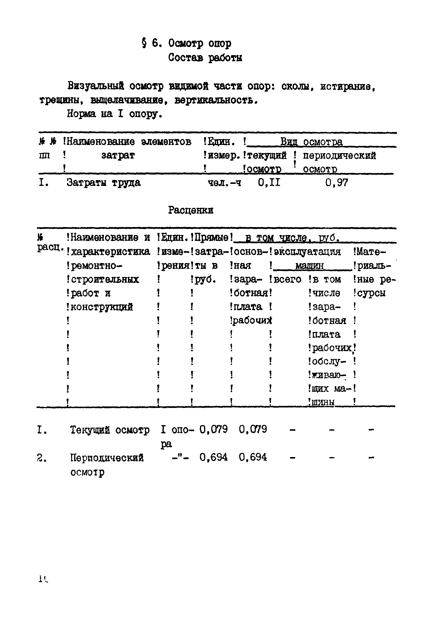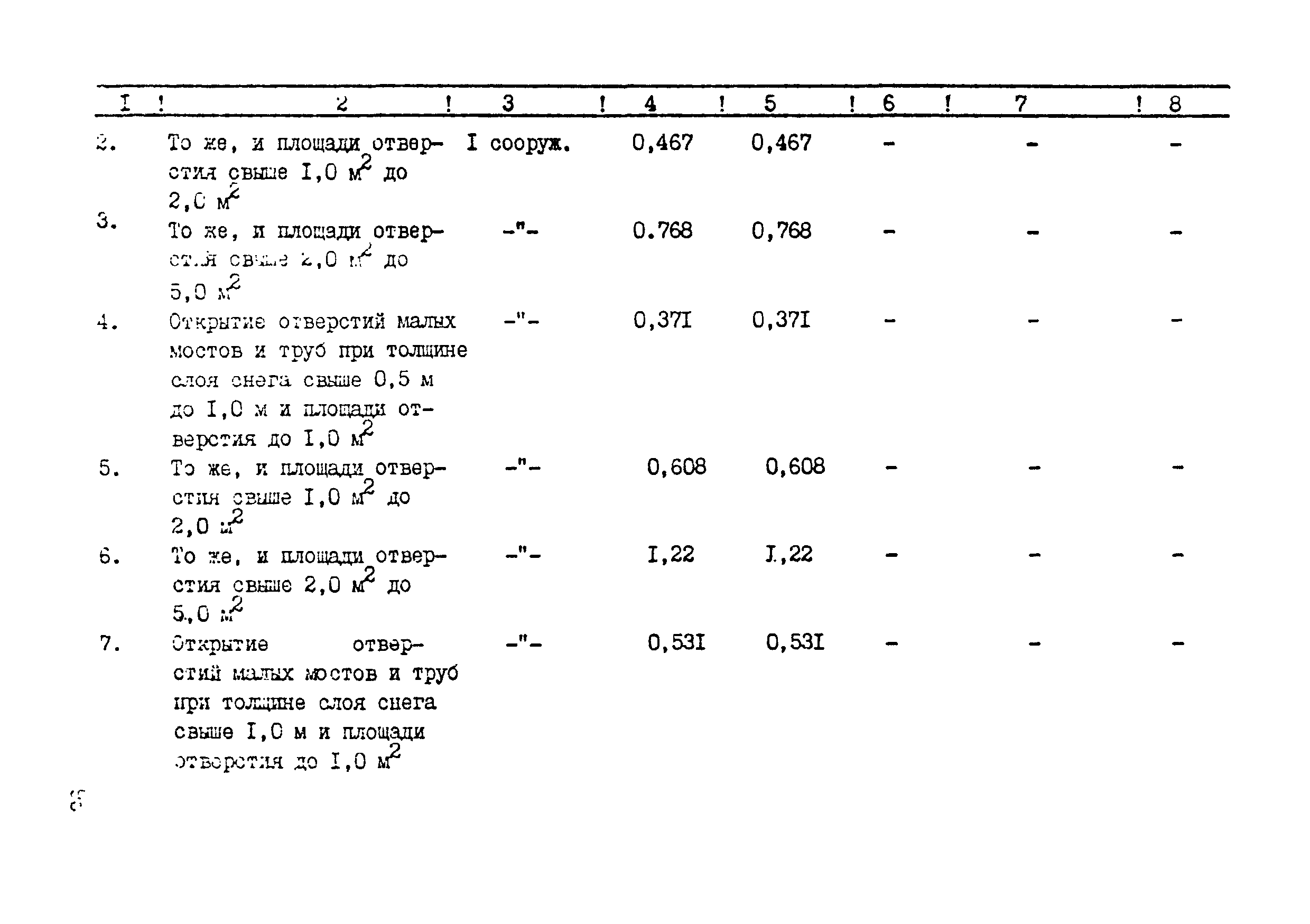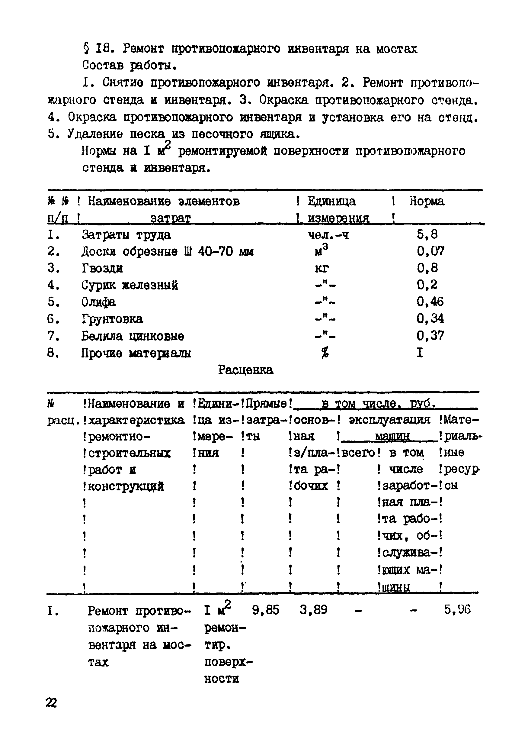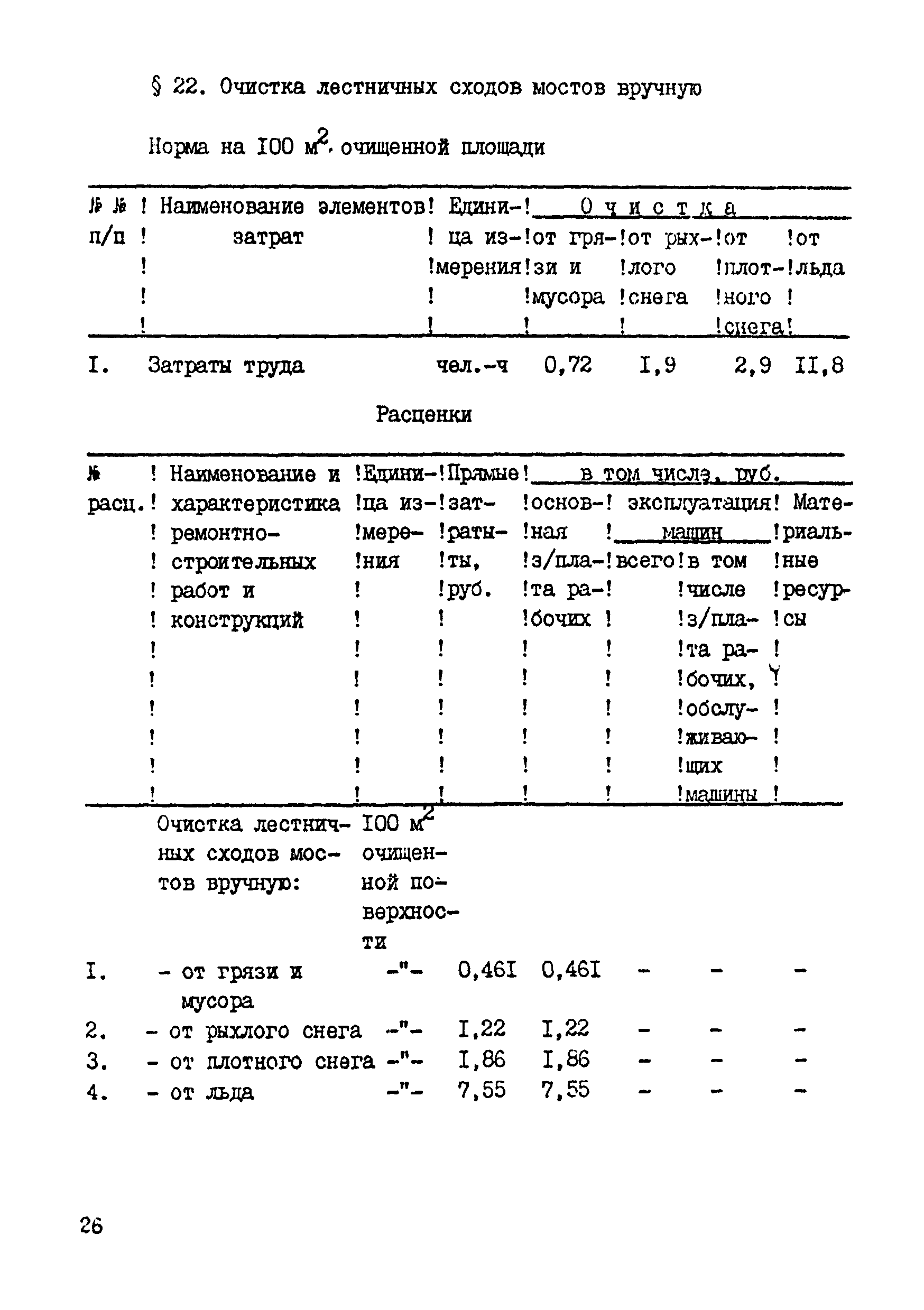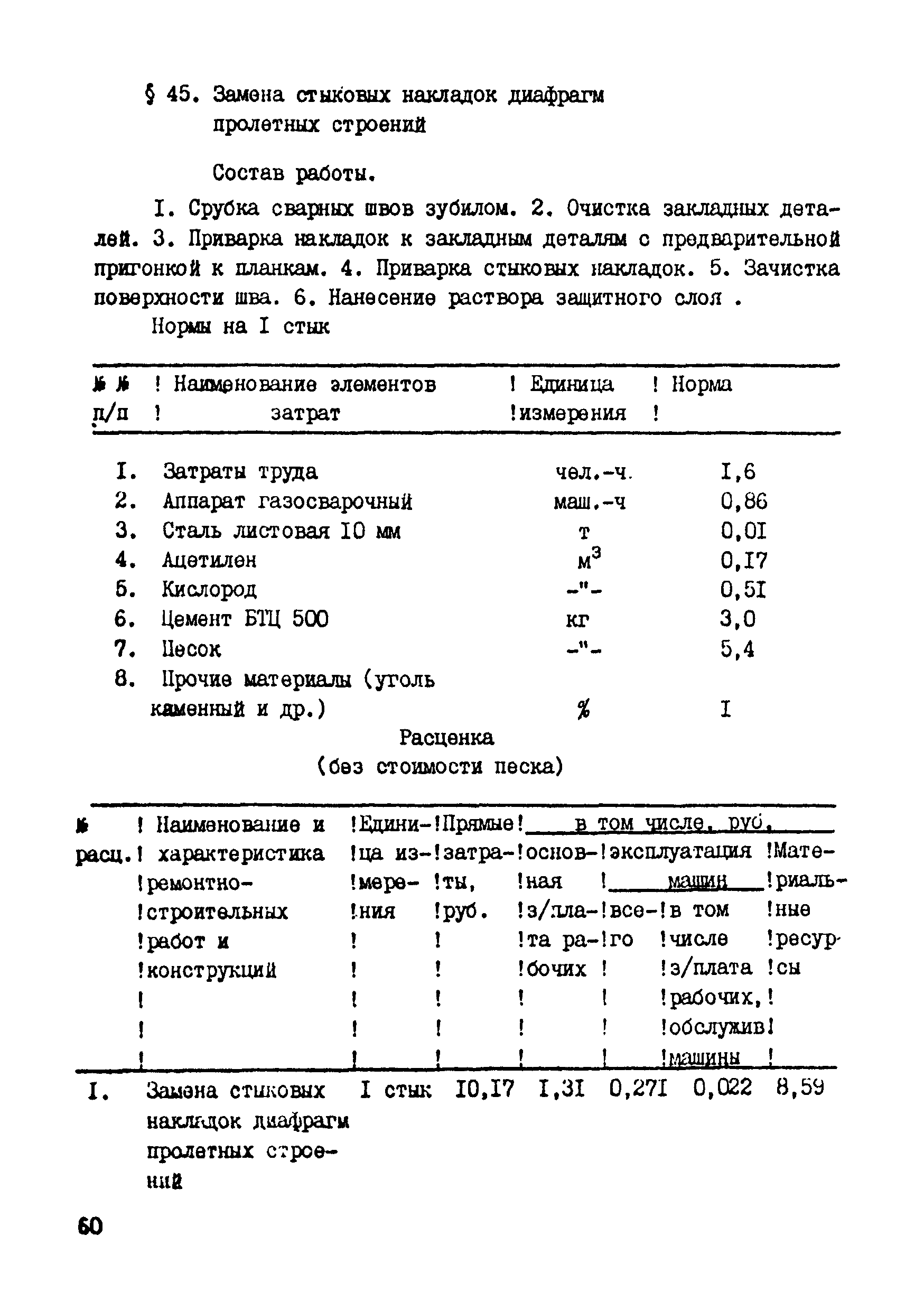 | Оглавление: | Вводная часть Глава I. Текущий и периодический осмотр мостов и путепроводов независимо от материалов пролетных строений и опор 1. Осмотр подходов 2. Осмотр подмостовой зоны 3. Осмотр мостового полотна 4. Осмотр пролетных строений 5. Осмотр опорных частей и узлов опирания 6. Осмотр опор 7. Осмотр мостов при помощи машины РД-803 8. Проверка плотности заклепочных соединений отстукиванием молотком (выборочно) 9. Выборочная проверка затяжка высокопрочных болтов динамометрическим ключом 10 Промеры глубины русла рек с моста 11 Промеры глубины русла рек с лодок 12. Проверка наличия и сохранности средств пожарной безопасности Глава II. Содержание мостов 13. Очистка водоприемных колодцев и лотков вручную 14. Прочистка водоотводных трубок на проезжей части мостов и путепроводов вручную 15. Промывка деформационных швов из шланга под давлением и очистка гребенки вручную от мусора на проезжей части моста 16. Очистка водоотводных лотков под деформационными швами из шланга под давлением 17. Санитарная уборка подмостовой зоны 18. Ремонт противопожарного инвентаря на мостах 19. Очистка и натирка опорных частей графитом 20. Очистка подферменных площадок от грязи, мусора и снега вручную 21. Очистка элементов моста ниже проезжей части от грязи, мусора и снега вручную 22. 0чистка лестничных сходов мостов вручную Глава III. Ремонт мостов 23. Ремонт металлических перильных ограждений 24. Снятие сборных железобетонных перильных ограждений из отдельных элементов 25. Устройство ограждений из профильного металла 26. Снятие поврежденного и установка нового ограждения смотровых устройств 27. Окраска сборного металлического перильного ограждения 28. Разборка дефектного бордюрного ограждения 29. Устранение мелких наплывов, волн и сдвигов на асфальтобетонном покрытии 30. Ремонт водоотводных трубок 31. Заделка проломов плит проезжей части 32. Замена поврежденных тротуарных блоков 33. Установка элементов деформационного шва 34. Заливка деформационного шва битумной мастикой при ремонте деформационных швов закрытого типа 35. Ремонт деформационных швов открытого типа со скользящим листом 36. Ремонт водоотводного лотка под деформационным швом открытого типа со скользящим листом 37. Замена дефектных чугунных решеток при ремонте водоотводных устройств 38. Снятие дефектных и установка новых железобетонных лотков при ремонте водосбросных устройств 39. Разборка старых и монтаж новых каменных водоприемных колодцев при ремонте водосбросных устройств 40. Ремонт бетонных водоприемных колодцев 41. Герметизация трещин в бетоне и железобетоне 42. Инъектирование трещин в бетоне и железобетоне 43. Восстановление защитного слоя железобетонных и бетонных конструкций 44. Восстановление бетона конструкций, поврежденного на глубину свыше 30 л с оголением арматуры 45. Замена стыковых накладок диафрагм пролетных строений 46. Ремонт сливов под ферменных площадок опор, мостов (заделка околов, раковин и пустот) 47. Ремонт футляров подвижных опорных частей 48. Замена футляров подвижных опорных частей 49. Выправка перекоса и угона катков подвижных опорных частей в сталежелезобетонных пролетных строениях 50. Окраска бетонных поверхностей 51. Окраска металлических поверхностей 52. Укатка асфальтобетонного покрытия ручным катком 53. Ремонт железобетонных ступеней лестничных сходов 54. Постановка нак