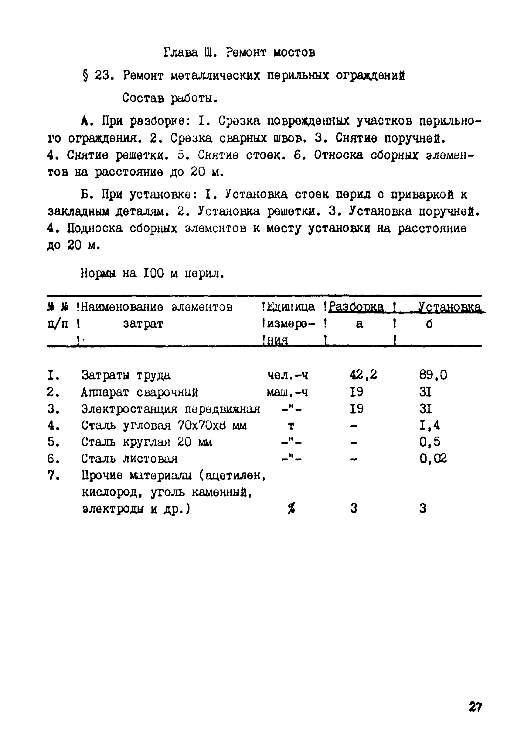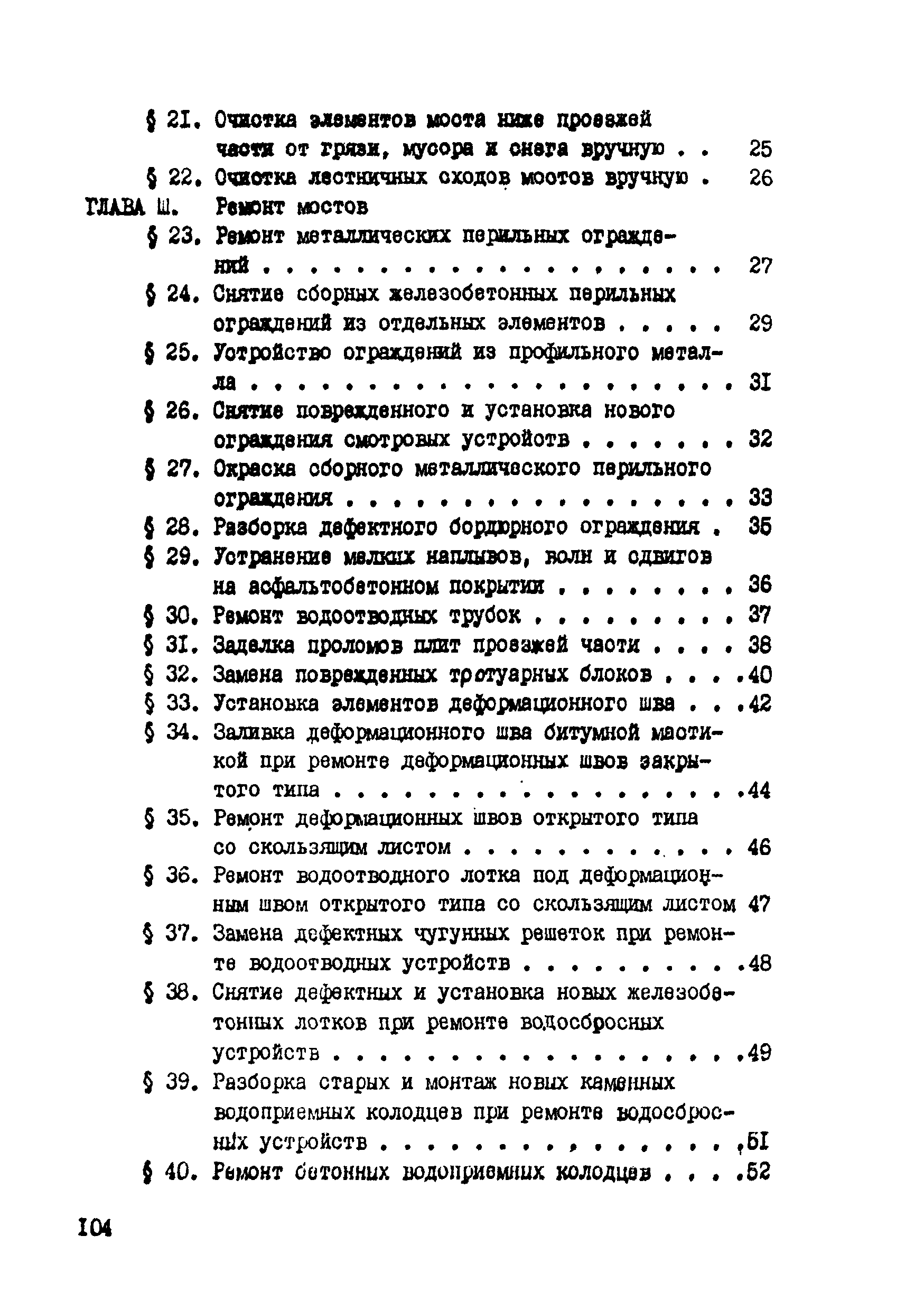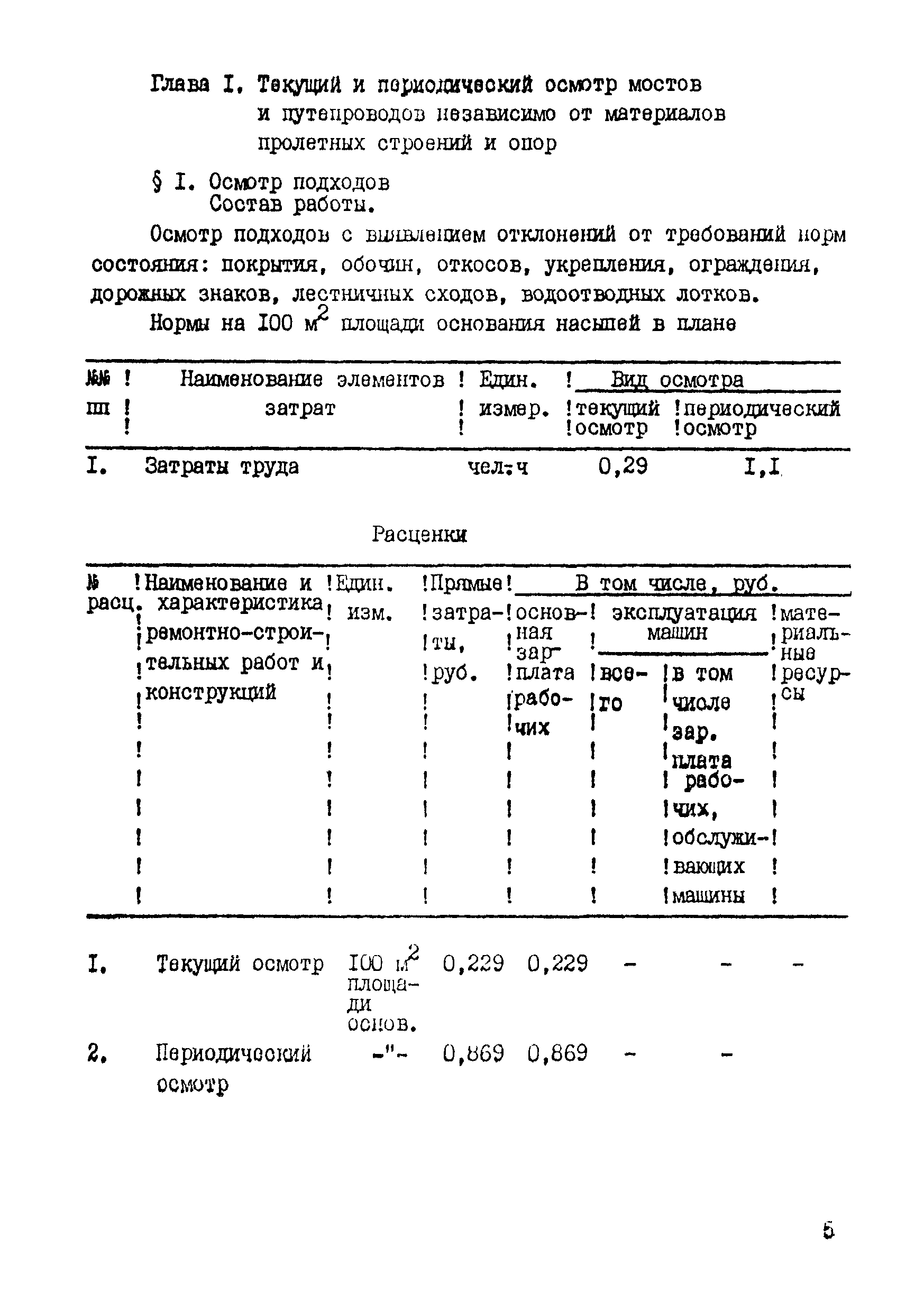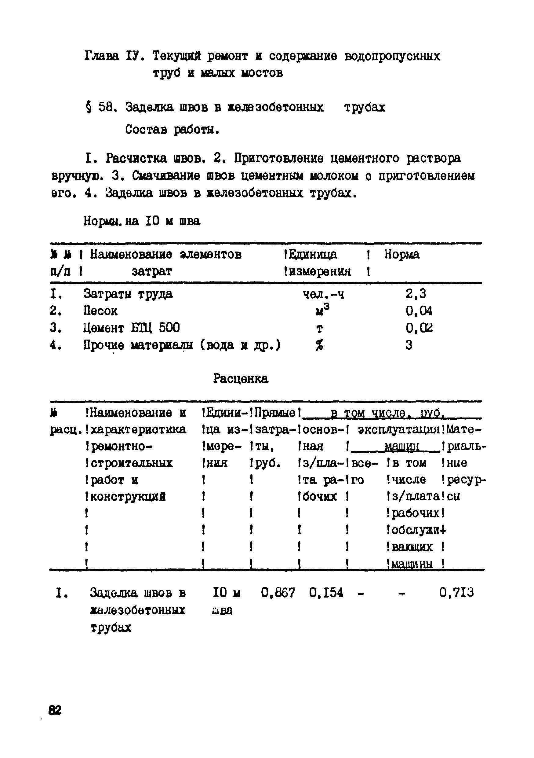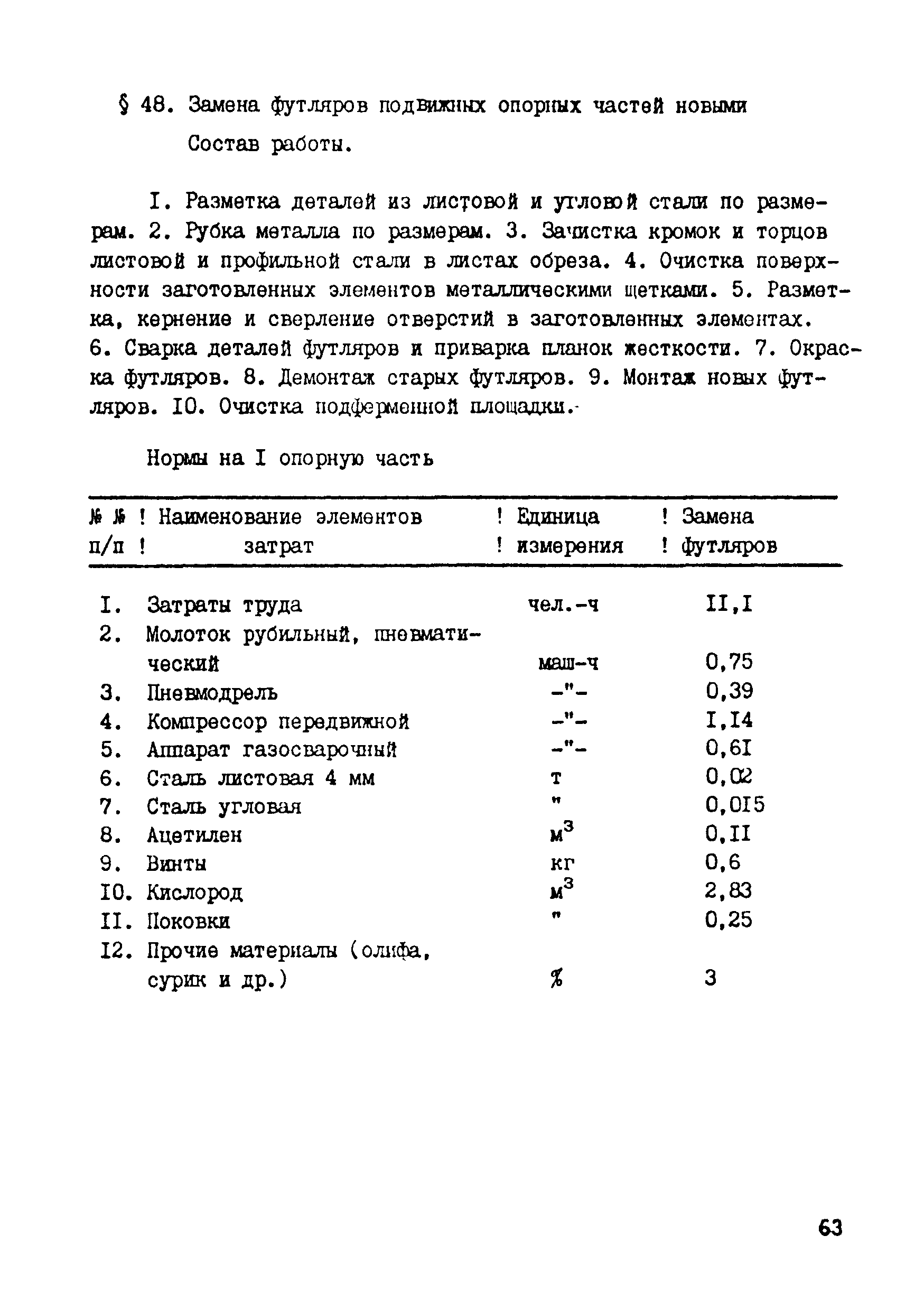 | Оглавление: | Вводная часть Глава I. Текущий и периодический осмотр мостов и путепроводов независимо от материалов пролетных строений и опор 1. Осмотр подходов 2. Осмотр подмостовой зоны 3. Осмотр мостового полотна 4. Осмотр пролетных строений 5. Осмотр опорных частей и узлов опирания 6. Осмотр опор 7. Осмотр мостов при помощи машины РД-803 8. Проверка плотности заклепочных соединений отстукиванием молотком (выборочно) 9. Выборочная проверка затяжка высокопрочных болтов динамометрическим ключом 10 Промеры глубины русла рек с моста 11 Промеры глубины русла рек с лодок 12. Проверка наличия и сохранности средств пожарной безопасности Глава II. Содержание мостов 13. Очистка водоприемных колодцев и лотков вручную 14. Прочистка водоотводных трубок на проезжей части мостов и путепроводов вручную 15. Промывка деформационных швов из шланга под давлением и очистка гребенки вручную от мусора на проезжей части моста 16. Очистка водоотводных лотков под деформационными швами из шланга под давлением 17. Санитарная уборка подмостовой зоны 18. Ремонт противопожарного инвентаря на мостах 19. Очистка и натирка опорных частей графитом 20. Очистка подферменных площадок от грязи, мусора и снега вручную 21. Очистка элементов моста ниже проезжей части от грязи, мусора и снега вручную 22. 0чистка лестничных сходов мостов вручную Глава III. Ремонт мостов 23. Ремонт металлических перильных ограждений 24. Снятие сборных железобетонных перильных ограждений из отдельных элементов 25. Устройство ограждений из профильного металла 26. Снятие поврежденного и установка нового ограждения смотровых устройств 27. Окраска сборного металлического перильного ограждения 28. Разборка дефектного бордюрного ограждения 29. Устранение мелких наплывов, волн и сдвигов на асфальтобетонном покрытии 30. Ремонт водоотводных трубок 31. Заделка проломов плит проезжей части 32. Замена поврежденных тротуарных блоков 33. Установка элементов деформационного шва 34. Заливка деформационного шва битумной мастикой при ремонте деформационных швов закрытого типа 35. Ремонт деформационных швов открытого типа со скользящим листом 36. Ремонт водоотводного лотка под деформационным швом открытого типа со скользящим листом 37. Замена дефектных чугунных решеток при ремонте водоотводных устройств 38. Снятие дефектных и установка новых железобетонных лотков при ремонте водосбросных устройств 39. Разборка старых и монтаж новых каменных водоприемных колодцев при ремонте водосбросных устройств 40. Ремонт бетонных водоприемных колодцев 41. Герметизация трещин в бетоне и железобетоне 42. Инъектирование трещин в бетоне и железобетоне 43. Восстановление защитного слоя железобетонных и бетонных конструкций 44. Восстановление бетона конструкций, поврежденного на глубину свыше 30 л с оголением арматуры 45. Замена стыковых накладок диафрагм пролетных строений 46. Ремонт сливов под ферменных площадок опор, мостов (заделка околов, раковин и пустот) 47. Ремонт футляров подвижных опорных частей 48. Замена футляров подвижных опорных частей 49. Выправка перекоса и угона катков подвижных опорных частей в сталежелезобетонных пролетных строениях 50. Окраска бетонных поверхностей 51. Окраска металлических поверхностей 52. Укатка асфальтобетонного покрытия ручным катком 53. Ремонт железобетонных ступеней лестничных сходов 54. Постановка нак