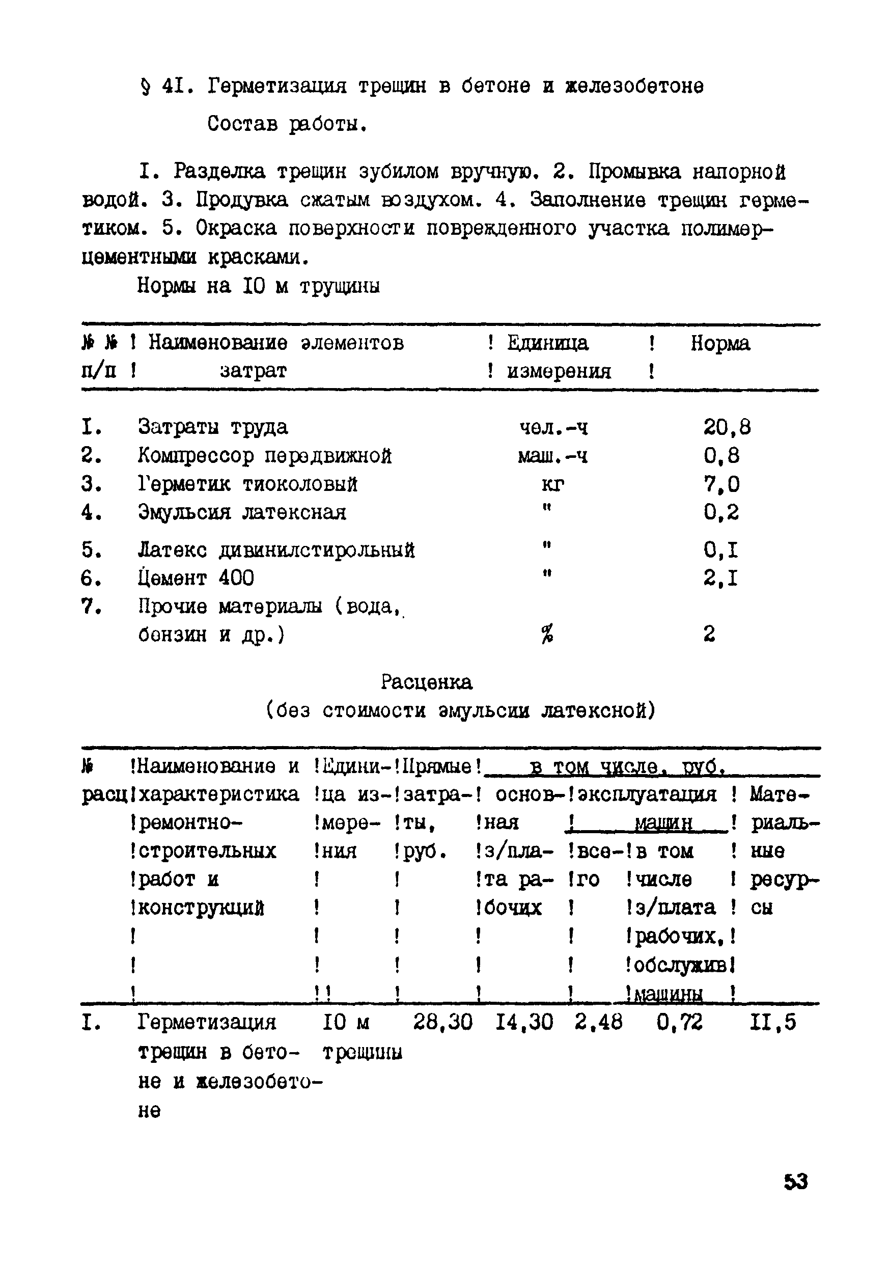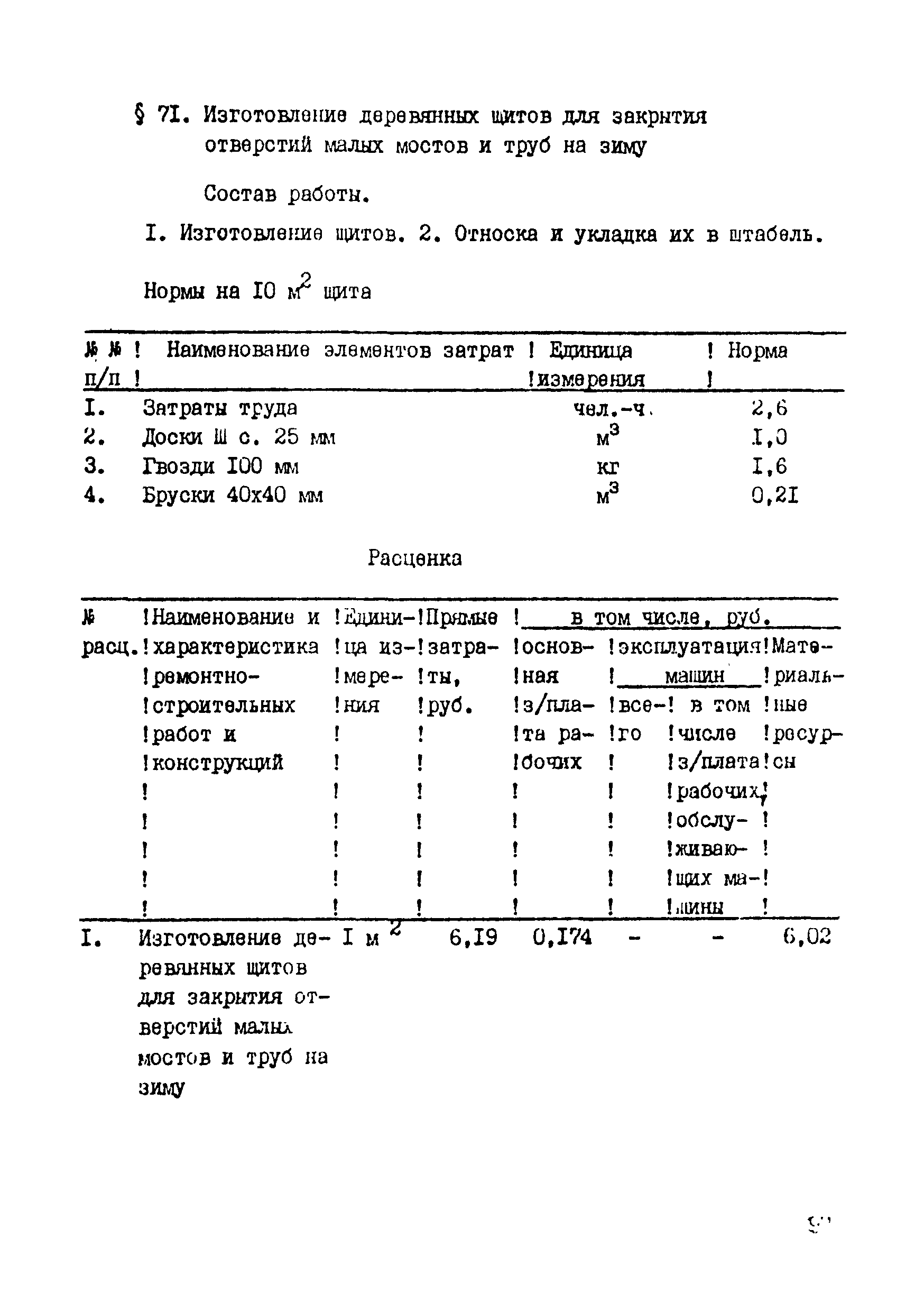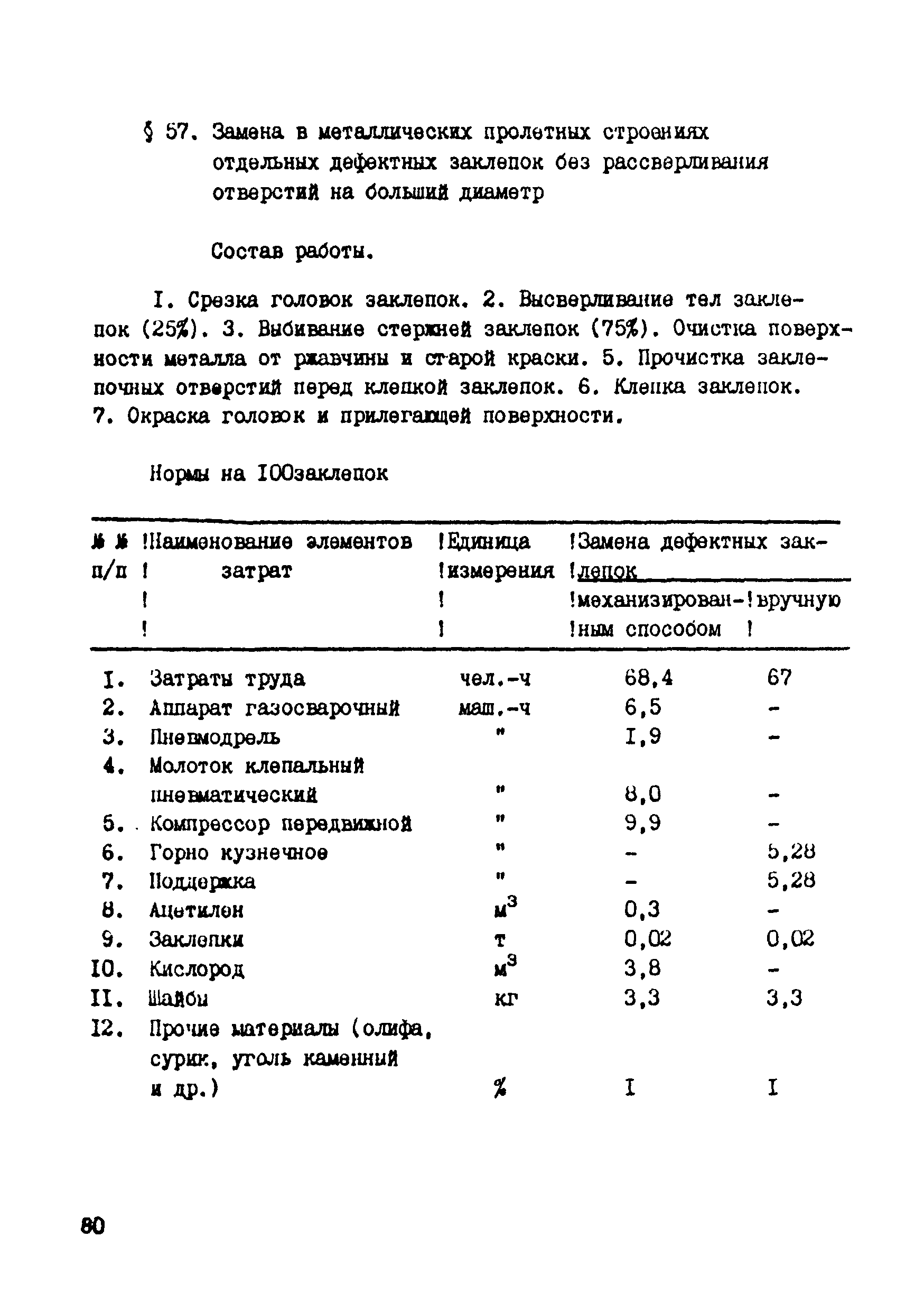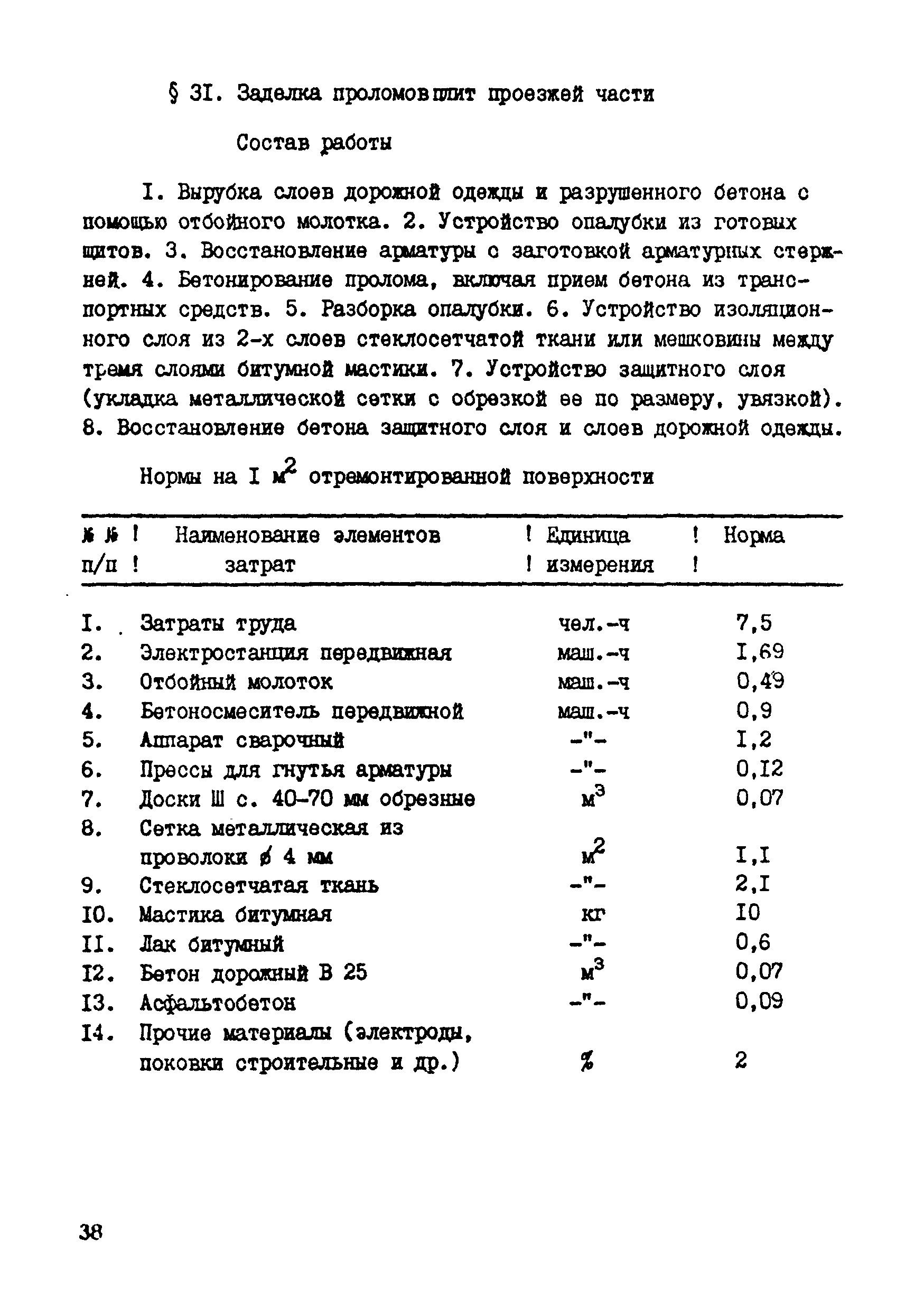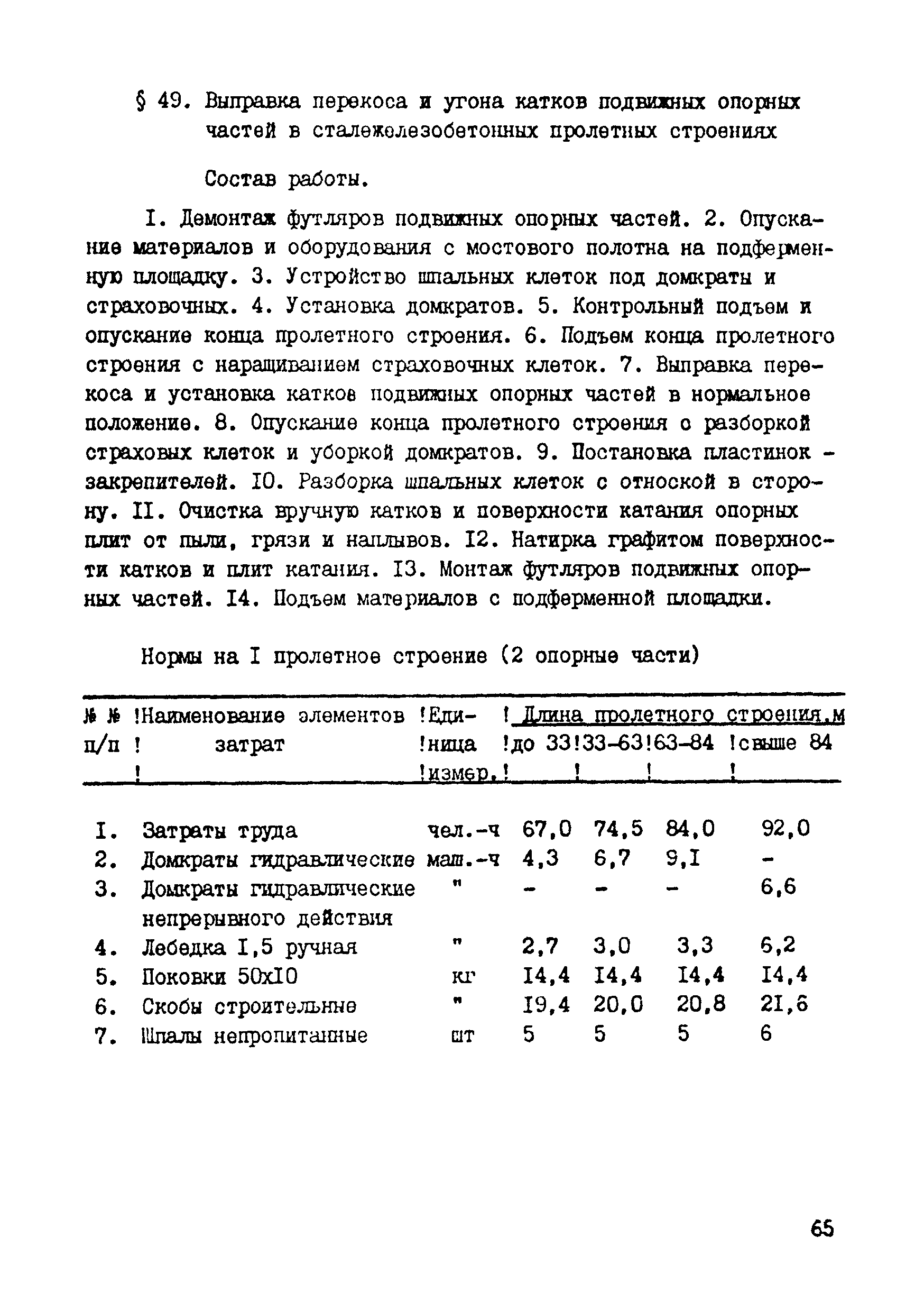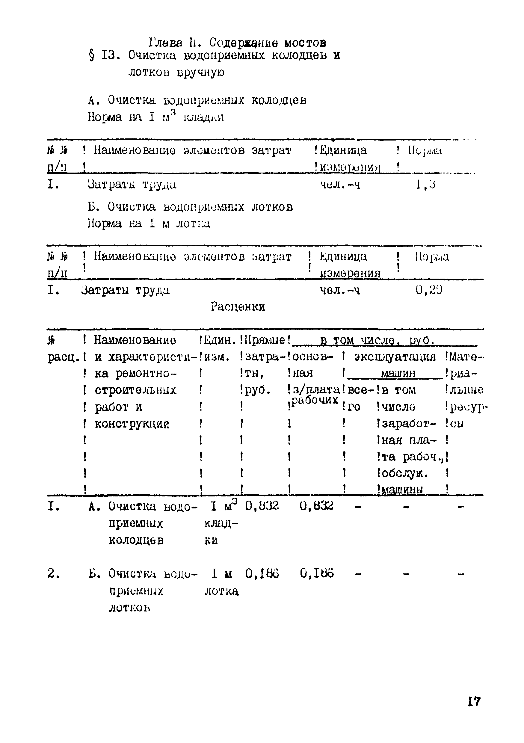 | Оглавление: | Вводная часть Глава I. Текущий и периодический осмотр мостов и путепроводов независимо от материалов пролетных строений и опор 1. Осмотр подходов 2. Осмотр подмостовой зоны 3. Осмотр мостового полотна 4. Осмотр пролетных строений 5. Осмотр опорных частей и узлов опирания 6. Осмотр опор 7. Осмотр мостов при помощи машины РД-803 8. Проверка плотности заклепочных соединений отстукиванием молотком (выборочно) 9. Выборочная проверка затяжка высокопрочных болтов динамометрическим ключом 10 Промеры глубины русла рек с моста 11 Промеры глубины русла рек с лодок 12. Проверка наличия и сохранности средств пожарной безопасности Глава II. Содержание мостов 13. Очистка водоприемных колодцев и лотков вручную 14. Прочистка водоотводных трубок на проезжей части мостов и путепроводов вручную 15. Промывка деформационных швов из шланга под давлением и очистка гребенки вручную от мусора на проезжей части моста 16. Очистка водоотводных лотков под деформационными швами из шланга под давлением 17. Санитарная уборка подмостовой зоны 18. Ремонт противопожарного инвентаря на мостах 19. Очистка и натирка опорных частей графитом 20. Очистка подферменных площадок от грязи, мусора и снега вручную 21. Очистка элементов моста ниже проезжей части от грязи, мусора и снега вручную 22. 0чистка лестничных сходов мостов вручную Глава III. Ремонт мостов 23. Ремонт металлических перильных ограждений 24. Снятие сборных железобетонных перильных ограждений из отдельных элементов 25. Устройство ограждений из профильного металла 26. Снятие поврежденного и установка нового ограждения смотровых устройств 27. Окраска сборного металлического перильного ограждения 28. Разборка дефектного бордюрного ограждения 29. Устранение мелких наплывов, волн и сдвигов на асфальтобетонном покрытии 30. Ремонт водоотводных трубок 31. Заделка проломов плит проезжей части 32. Замена поврежденных тротуарных блоков 33. Установка элементов деформационного шва 34. Заливка деформационного шва битумной мастикой при ремонте деформационных швов закрытого типа 35. Ремонт деформационных швов открытого типа со скользящим листом 36. Ремонт водоотводного лотка под деформационным швом открытого типа со скользящим листом 37. Замена дефектных чугунных решеток при ремонте водоотводных устройств 38. Снятие дефектных и установка новых железобетонных лотков при ремонте водосбросных устройств 39. Разборка старых и монтаж новых каменных водоприемных колодцев при ремонте водосбросных устройств 40. Ремонт бетонных водоприемных колодцев 41. Герметизация трещин в бетоне и железобетоне 42. Инъектирование трещин в бетоне и железобетоне 43. Восстановление защитного слоя железобетонных и бетонных конструкций 44. Восстановление бетона конструкций, поврежденного на глубину свыше 30 л с оголением арматуры 45. Замена стыковых накладок диафрагм пролетных строений 46. Ремонт сливов под ферменных площадок опор, мостов (заделка околов, раковин и пустот) 47. Ремонт футляров подвижных опорных частей 48. Замена футляров подвижных опорных частей 49. Выправка перекоса и угона катков подвижных опорных частей в сталежелезобетонных пролетных строениях 50. Окраска бетонных поверхностей 51. Окраска металлических поверхностей 52. Укатка асфальтобетонного покрытия ручным катком 53. Ремонт железобетонных ступеней лестничных сходов 54. Постановка нак