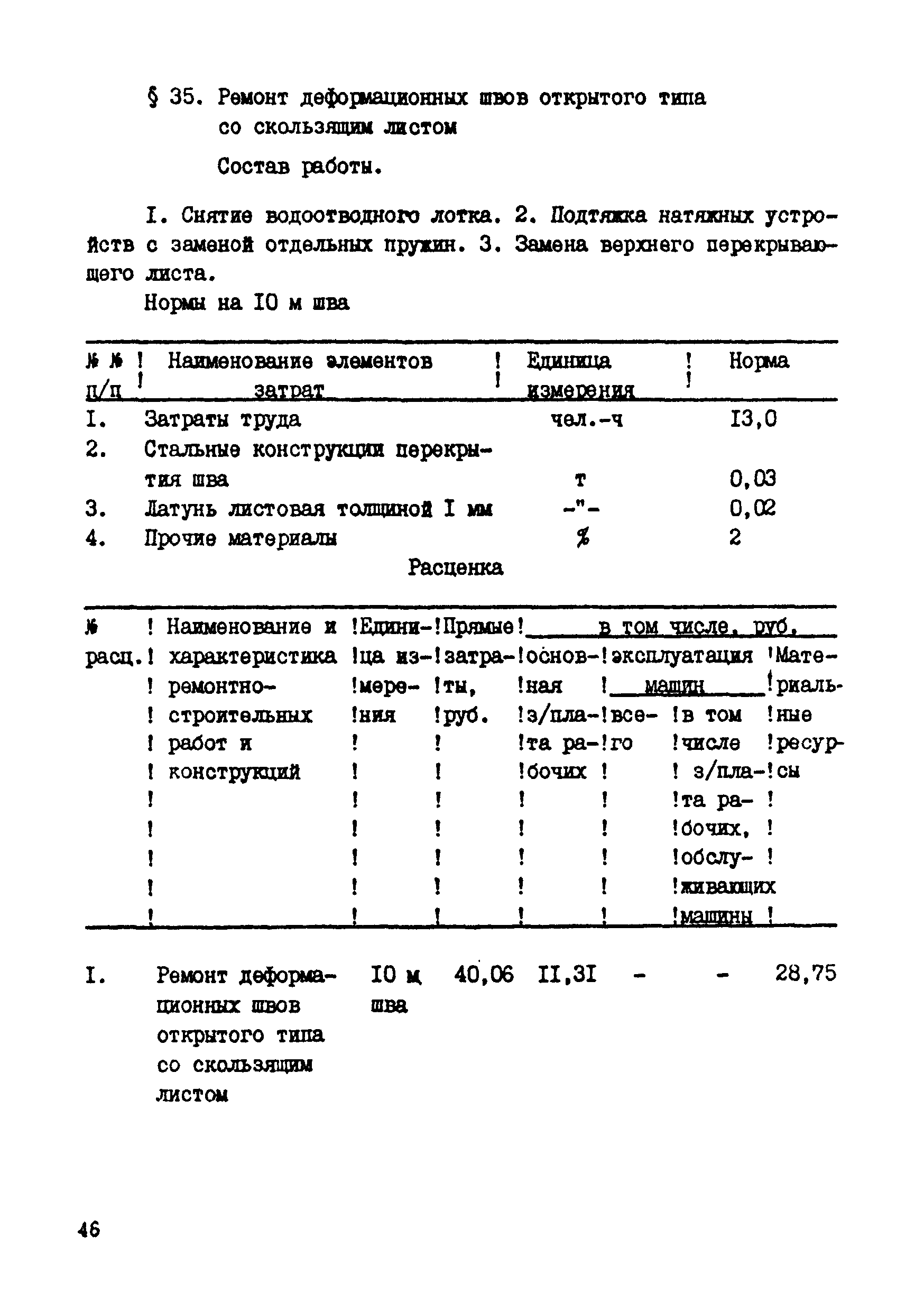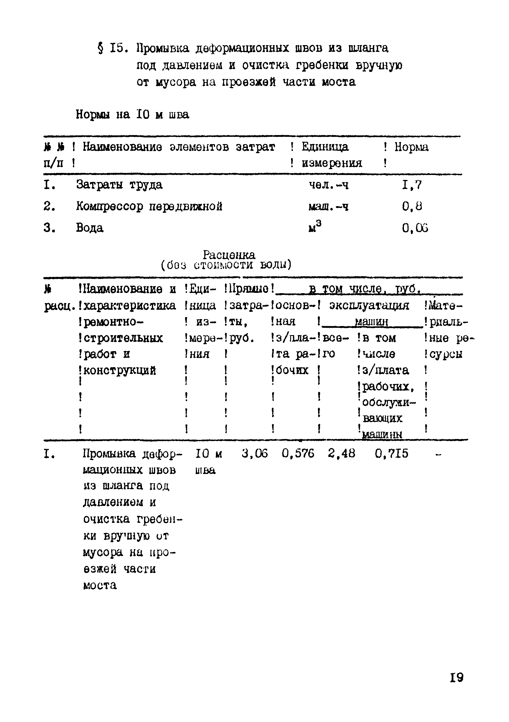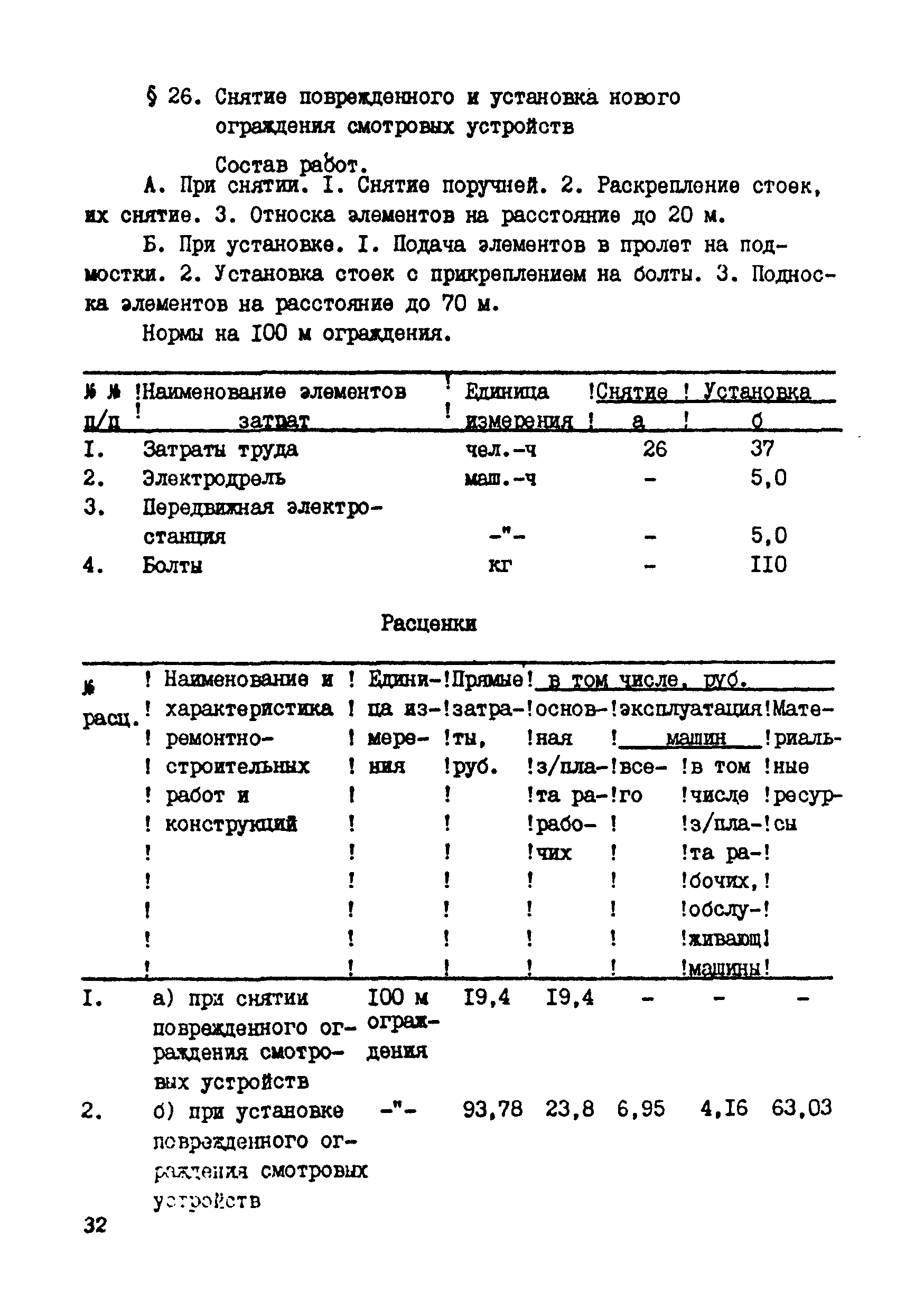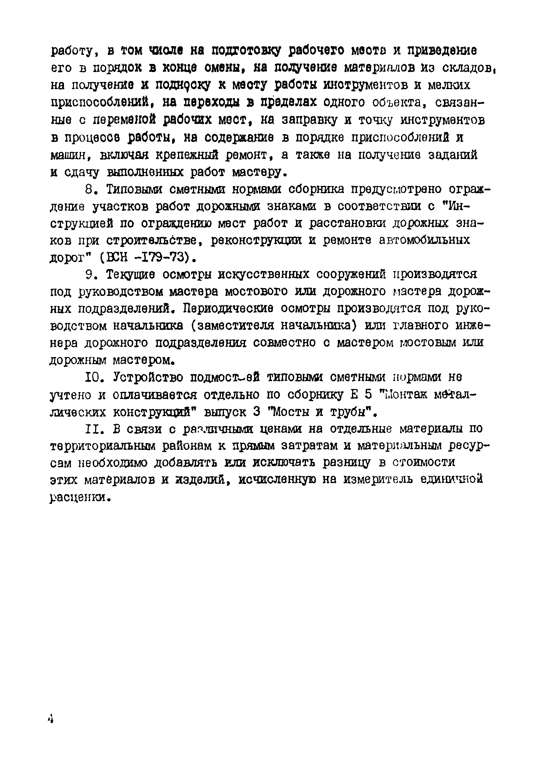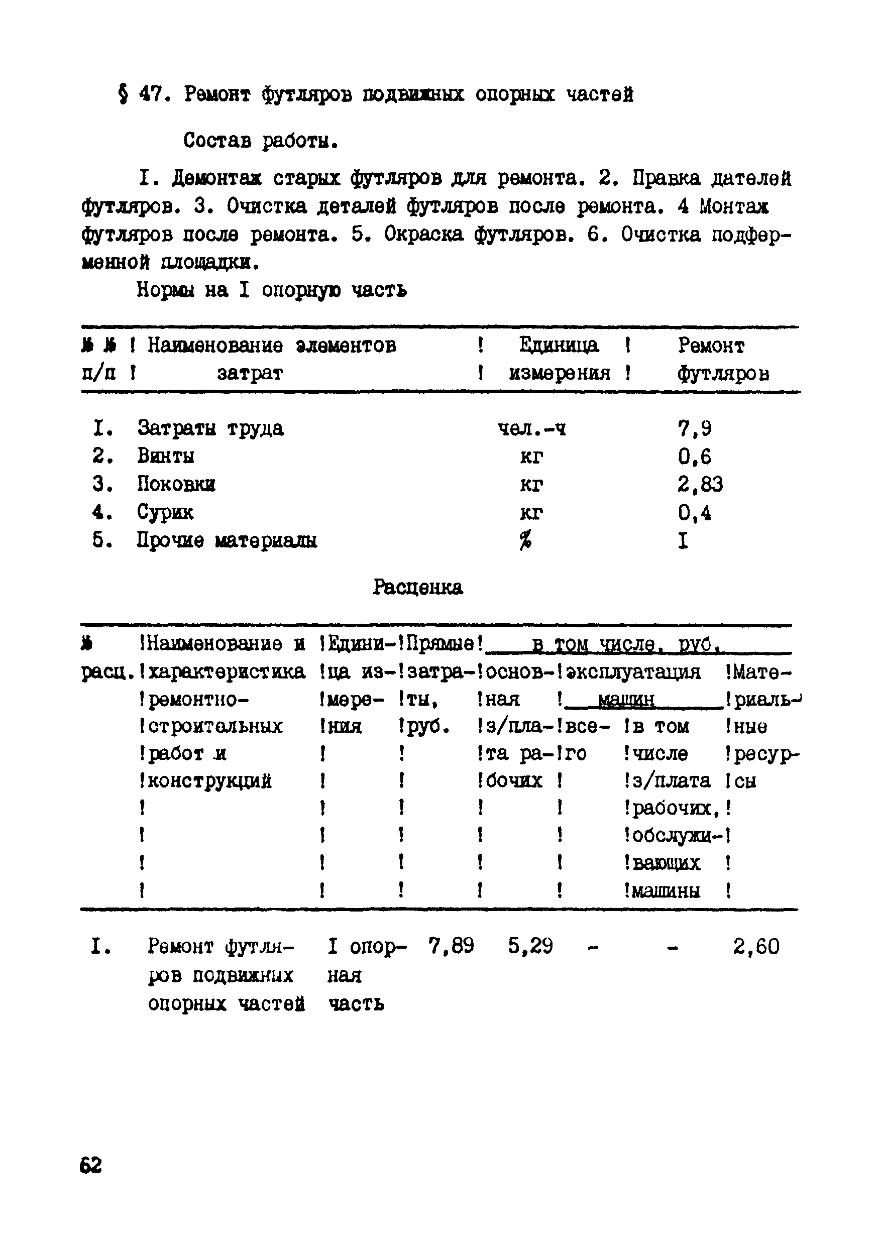 | Оглавление: | Вводная часть Глава I. Текущий и периодический осмотр мостов и путепроводов независимо от материалов пролетных строений и опор 1. Осмотр подходов 2. Осмотр подмостовой зоны 3. Осмотр мостового полотна 4. Осмотр пролетных строений 5. Осмотр опорных частей и узлов опирания 6. Осмотр опор 7. Осмотр мостов при помощи машины РД-803 8. Проверка плотности заклепочных соединений отстукиванием молотком (выборочно) 9. Выборочная проверка затяжка высокопрочных болтов динамометрическим ключом 10 Промеры глубины русла рек с моста 11 Промеры глубины русла рек с лодок 12. Проверка наличия и сохранности средств пожарной безопасности Глава II. Содержание мостов 13. Очистка водоприемных колодцев и лотков вручную 14. Прочистка водоотводных трубок на проезжей части мостов и путепроводов вручную 15. Промывка деформационных швов из шланга под давлением и очистка гребенки вручную от мусора на проезжей части моста 16. Очистка водоотводных лотков под деформационными швами из шланга под давлением 17. Санитарная уборка подмостовой зоны 18. Ремонт противопожарного инвентаря на мостах 19. Очистка и натирка опорных частей графитом 20. Очистка подферменных площадок от грязи, мусора и снега вручную 21. Очистка элементов моста ниже проезжей части от грязи, мусора и снега вручную 22. 0чистка лестничных сходов мостов вручную Глава III. Ремонт мостов 23. Ремонт металлических перильных ограждений 24. Снятие сборных железобетонных перильных ограждений из отдельных элементов 25. Устройство ограждений из профильного металла 26. Снятие поврежденного и установка нового ограждения смотровых устройств 27. Окраска сборного металлического перильного ограждения 28. Разборка дефектного бордюрного ограждения 29. Устранение мелких наплывов, волн и сдвигов на асфальтобетонном покрытии 30. Ремонт водоотводных трубок 31. Заделка проломов плит проезжей части 32. Замена поврежденных тротуарных блоков 33. Установка элементов деформационного шва 34. Заливка деформационного шва битумной мастикой при ремонте деформационных швов закрытого типа 35. Ремонт деформационных швов открытого типа со скользящим листом 36. Ремонт водоотводного лотка под деформационным швом открытого типа со скользящим листом 37. Замена дефектных чугунных решеток при ремонте водоотводных устройств 38. Снятие дефектных и установка новых железобетонных лотков при ремонте водосбросных устройств 39. Разборка старых и монтаж новых каменных водоприемных колодцев при ремонте водосбросных устройств 40. Ремонт бетонных водоприемных колодцев 41. Герметизация трещин в бетоне и железобетоне 42. Инъектирование трещин в бетоне и железобетоне 43. Восстановление защитного слоя железобетонных и бетонных конструкций 44. Восстановление бетона конструкций, поврежденного на глубину свыше 30 л с оголением арматуры 45. Замена стыковых накладок диафрагм пролетных строений 46. Ремонт сливов под ферменных площадок опор, мостов (заделка околов, раковин и пустот) 47. Ремонт футляров подвижных опорных частей 48. Замена футляров подвижных опорных частей 49. Выправка перекоса и угона катков подвижных опорных частей в сталежелезобетонных пролетных строениях 50. Окраска бетонных поверхностей 51. Окраска металлических поверхностей 52. Укатка асфальтобетонного покрытия ручным катком 53. Ремонт железобетонных ступеней лестничных сходов 54. Постановка нак