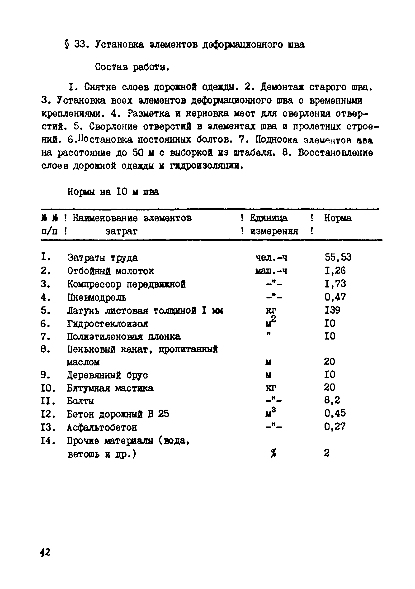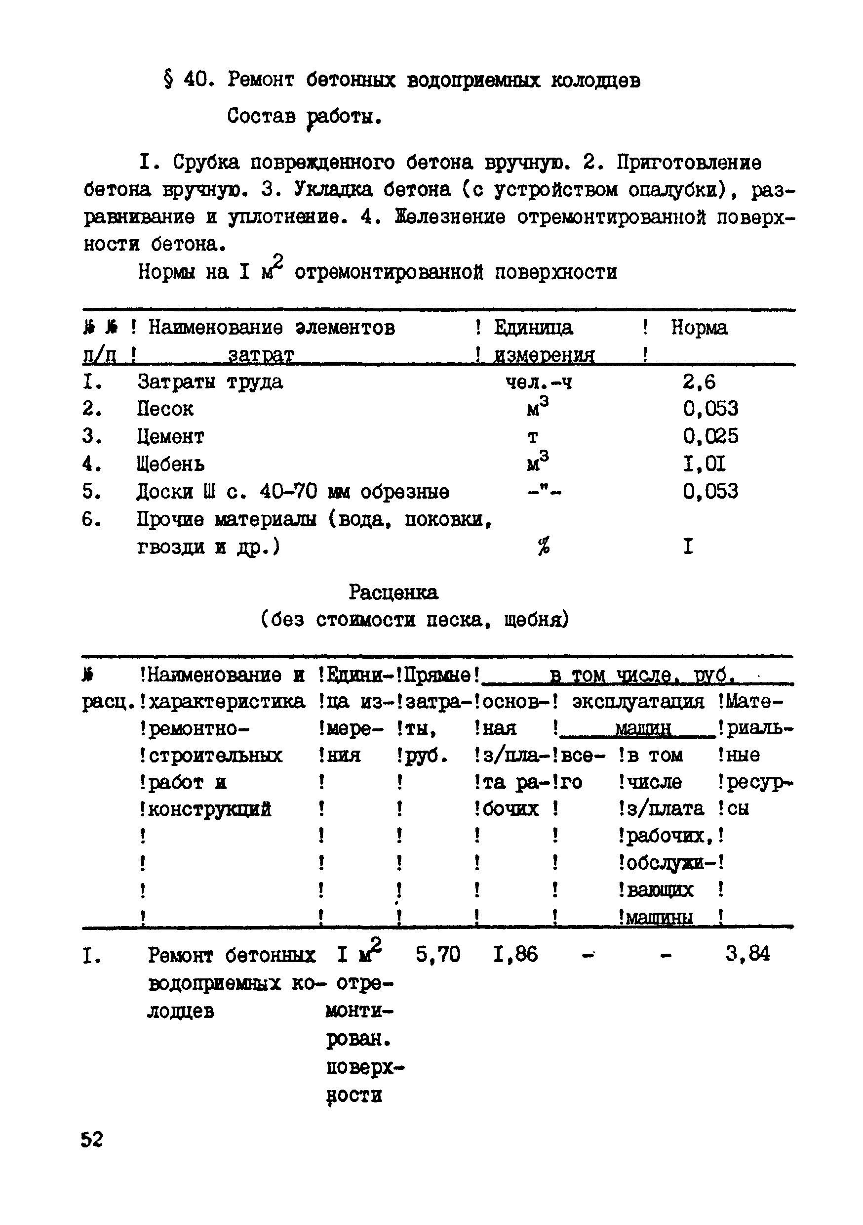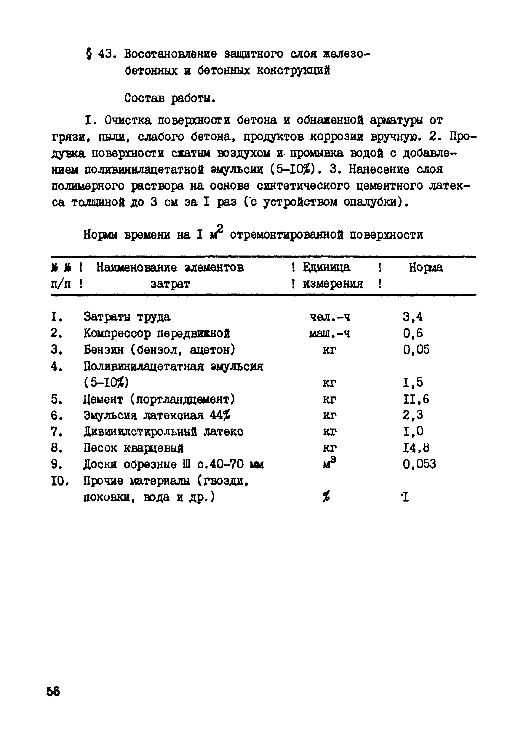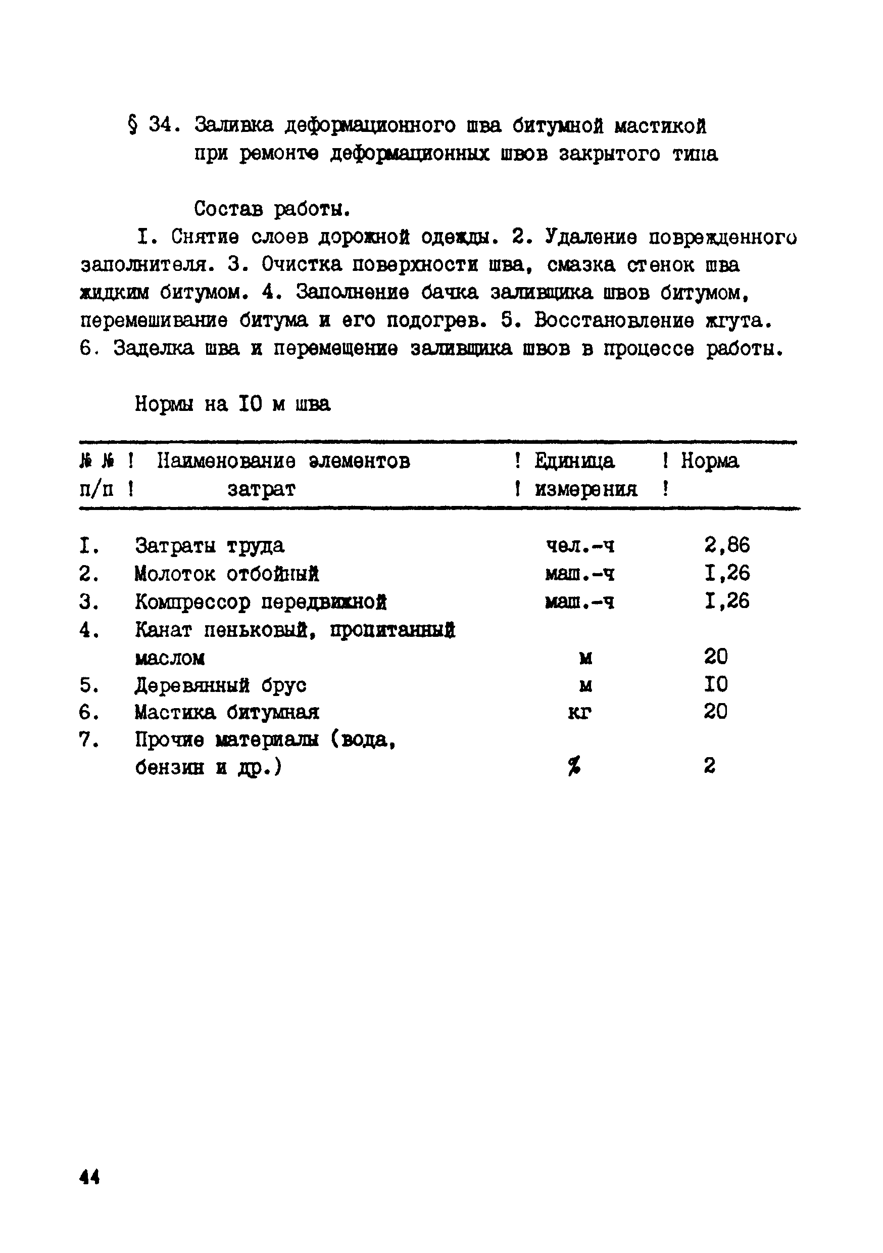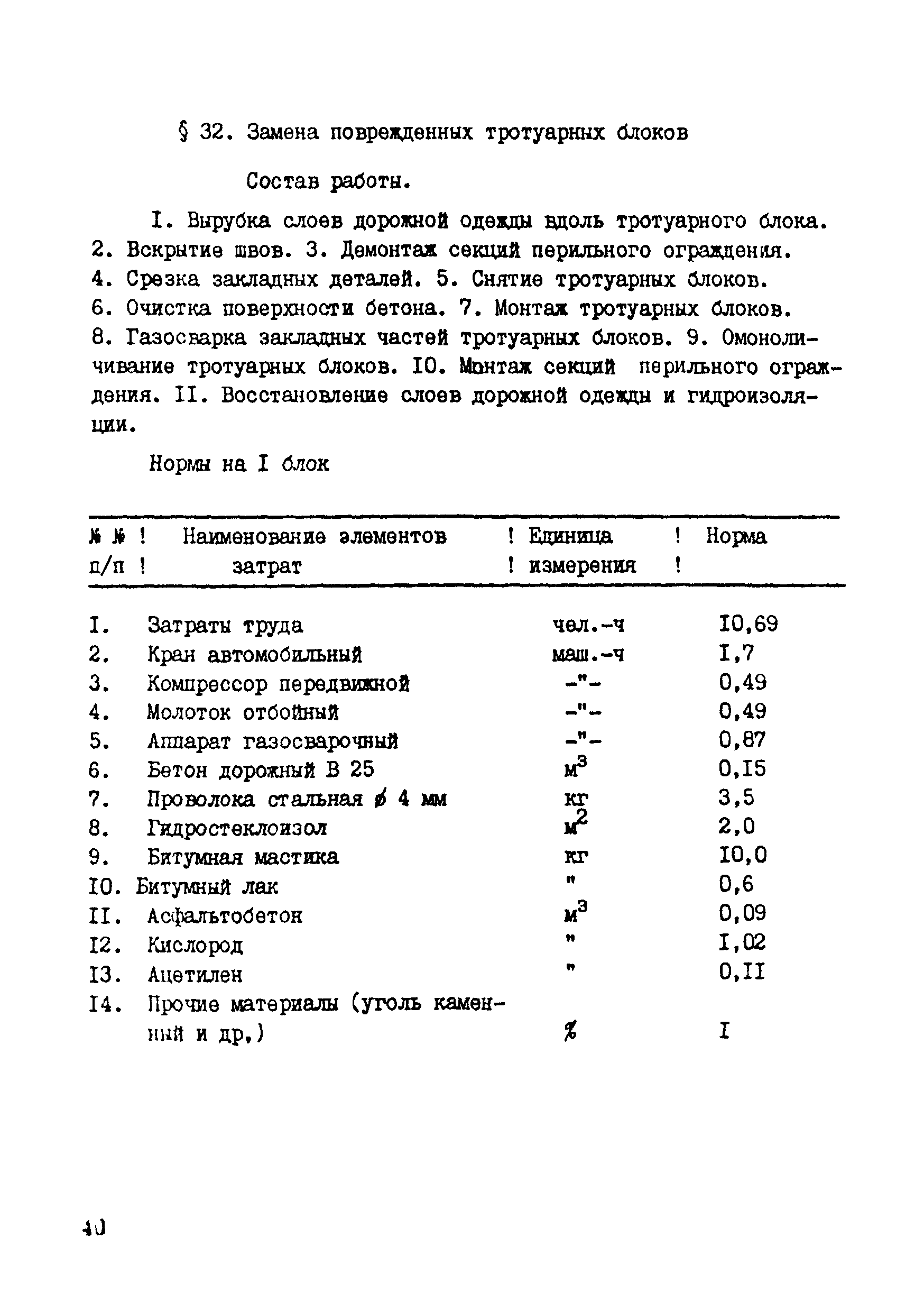 | Оглавление: | Вводная часть Глава I. Текущий и периодический осмотр мостов и путепроводов независимо от материалов пролетных строений и опор 1. Осмотр подходов 2. Осмотр подмостовой зоны 3. Осмотр мостового полотна 4. Осмотр пролетных строений 5. Осмотр опорных частей и узлов опирания 6. Осмотр опор 7. Осмотр мостов при помощи машины РД-803 8. Проверка плотности заклепочных соединений отстукиванием молотком (выборочно) 9. Выборочная проверка затяжка высокопрочных болтов динамометрическим ключом 10 Промеры глубины русла рек с моста 11 Промеры глубины русла рек с лодок 12. Проверка наличия и сохранности средств пожарной безопасности Глава II. Содержание мостов 13. Очистка водоприемных колодцев и лотков вручную 14. Прочистка водоотводных трубок на проезжей части мостов и путепроводов вручную 15. Промывка деформационных швов из шланга под давлением и очистка гребенки вручную от мусора на проезжей части моста 16. Очистка водоотводных лотков под деформационными швами из шланга под давлением 17. Санитарная уборка подмостовой зоны 18. Ремонт противопожарного инвентаря на мостах 19. Очистка и натирка опорных частей графитом 20. Очистка подферменных площадок от грязи, мусора и снега вручную 21. Очистка элементов моста ниже проезжей части от грязи, мусора и снега вручную 22. 0чистка лестничных сходов мостов вручную Глава III. Ремонт мостов 23. Ремонт металлических перильных ограждений 24. Снятие сборных железобетонных перильных ограждений из отдельных элементов 25. Устройство ограждений из профильного металла 26. Снятие поврежденного и установка нового ограждения смотровых устройств 27. Окраска сборного металлического перильного ограждения 28. Разборка дефектного бордюрного ограждения 29. Устранение мелких наплывов, волн и сдвигов на асфальтобетонном покрытии 30. Ремонт водоотводных трубок 31. Заделка проломов плит проезжей части 32. Замена поврежденных тротуарных блоков 33. Установка элементов деформационного шва 34. Заливка деформационного шва битумной мастикой при ремонте деформационных швов закрытого типа 35. Ремонт деформационных швов открытого типа со скользящим листом 36. Ремонт водоотводного лотка под деформационным швом открытого типа со скользящим листом 37. Замена дефектных чугунных решеток при ремонте водоотводных устройств 38. Снятие дефектных и установка новых железобетонных лотков при ремонте водосбросных устройств 39. Разборка старых и монтаж новых каменных водоприемных колодцев при ремонте водосбросных устройств 40. Ремонт бетонных водоприемных колодцев 41. Герметизация трещин в бетоне и железобетоне 42. Инъектирование трещин в бетоне и железобетоне 43. Восстановление защитного слоя железобетонных и бетонных конструкций 44. Восстановление бетона конструкций, поврежденного на глубину свыше 30 л с оголением арматуры 45. Замена стыковых накладок диафрагм пролетных строений 46. Ремонт сливов под ферменных площадок опор, мостов (заделка околов, раковин и пустот) 47. Ремонт футляров подвижных опорных частей 48. Замена футляров подвижных опорных частей 49. Выправка перекоса и угона катков подвижных опорных частей в сталежелезобетонных пролетных строениях 50. Окраска бетонных поверхностей 51. Окраска металлических поверхностей 52. Укатка асфальтобетонного покрытия ручным катком 53. Ремонт железобетонных ступеней лестничных сходов 54. Постановка нак