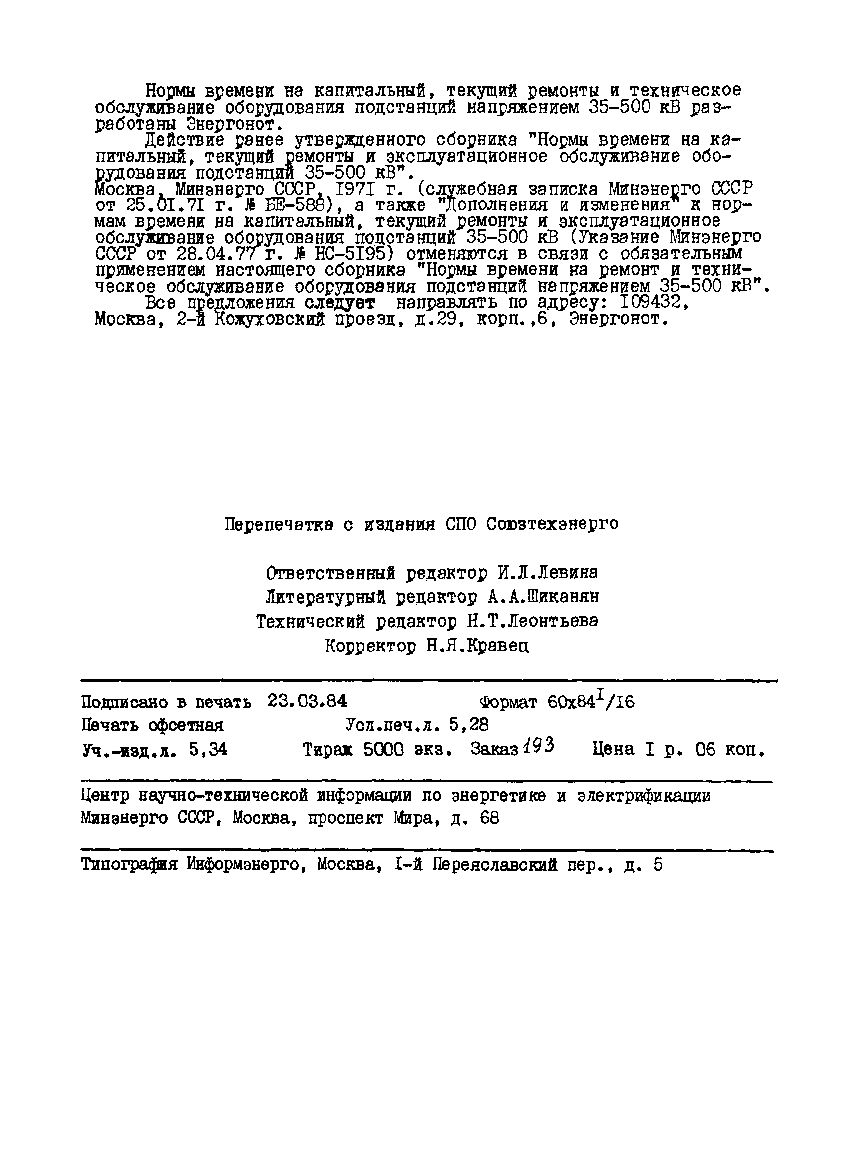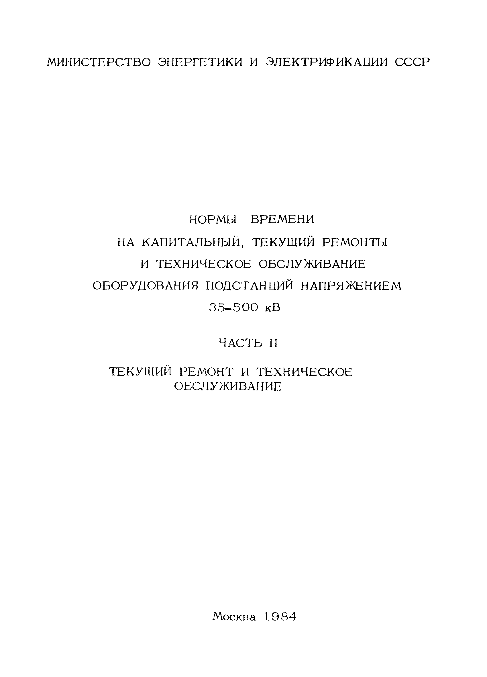 - «Нормы времени на капитальный, текущий ремонты и эксплуатационное обслуживание оборудований подстанций 35 - 500 кВ» (Утверждены Минэнерго СССР, служебная записка от 25.01.71 № БЕ-588)