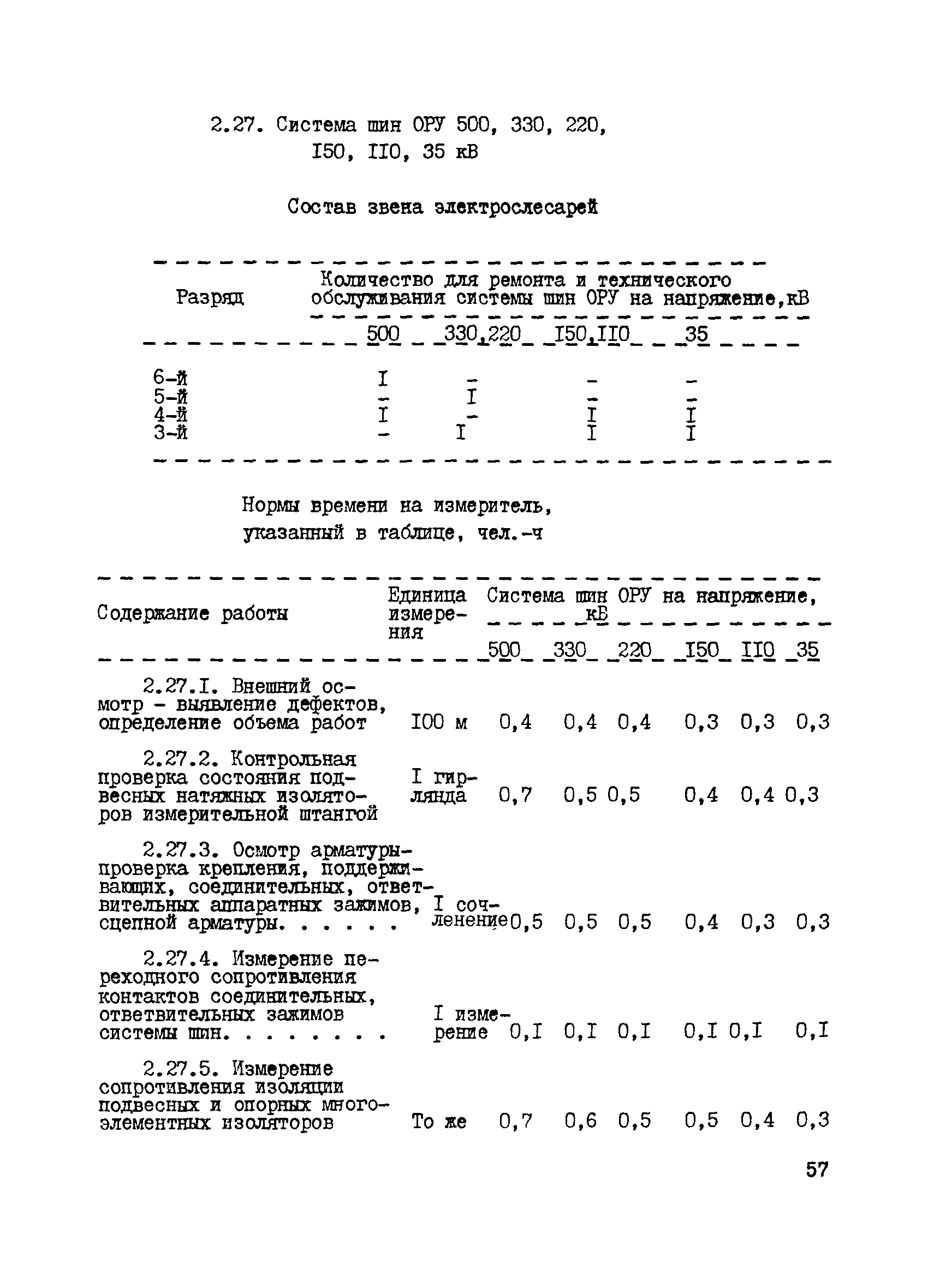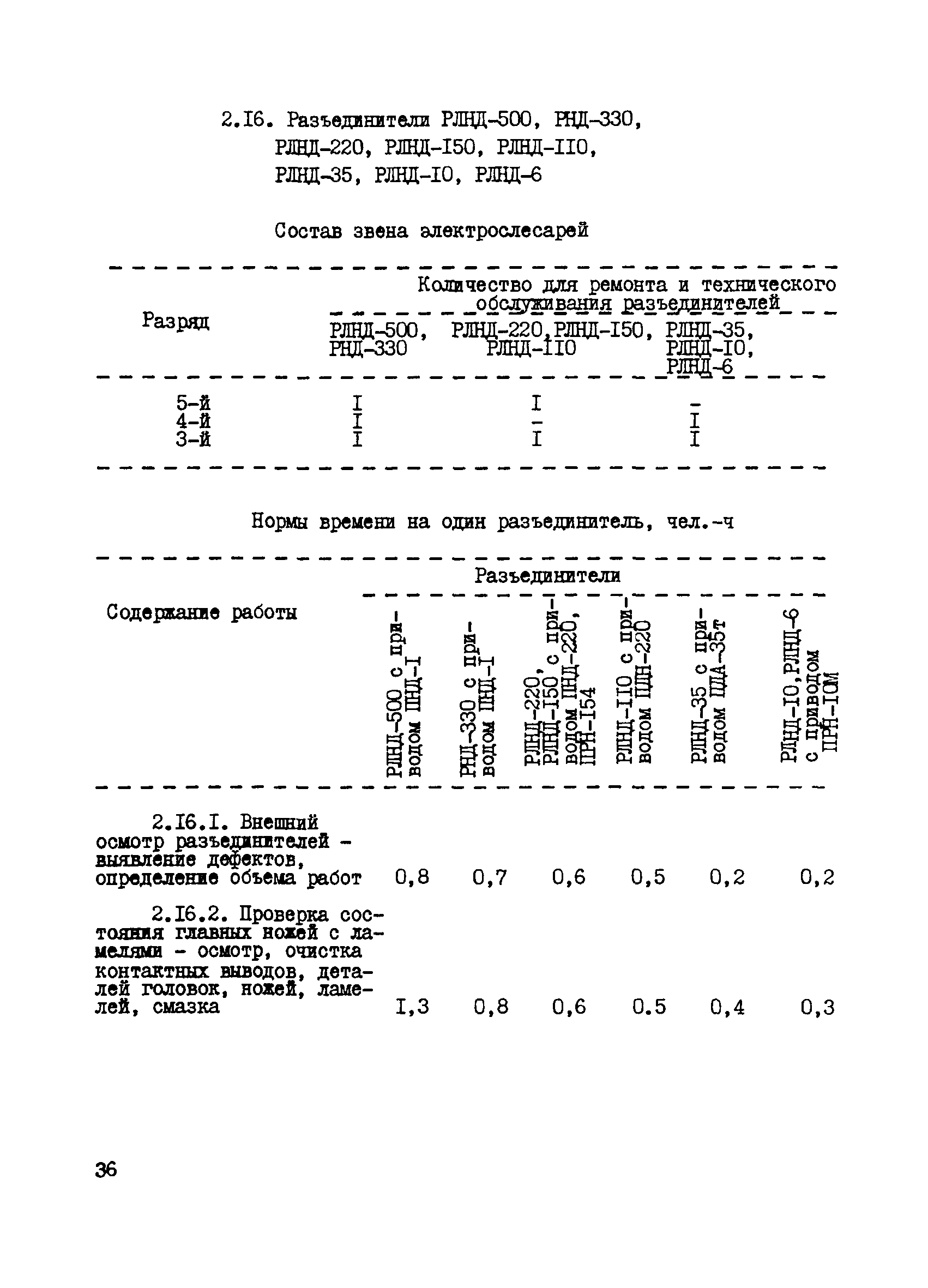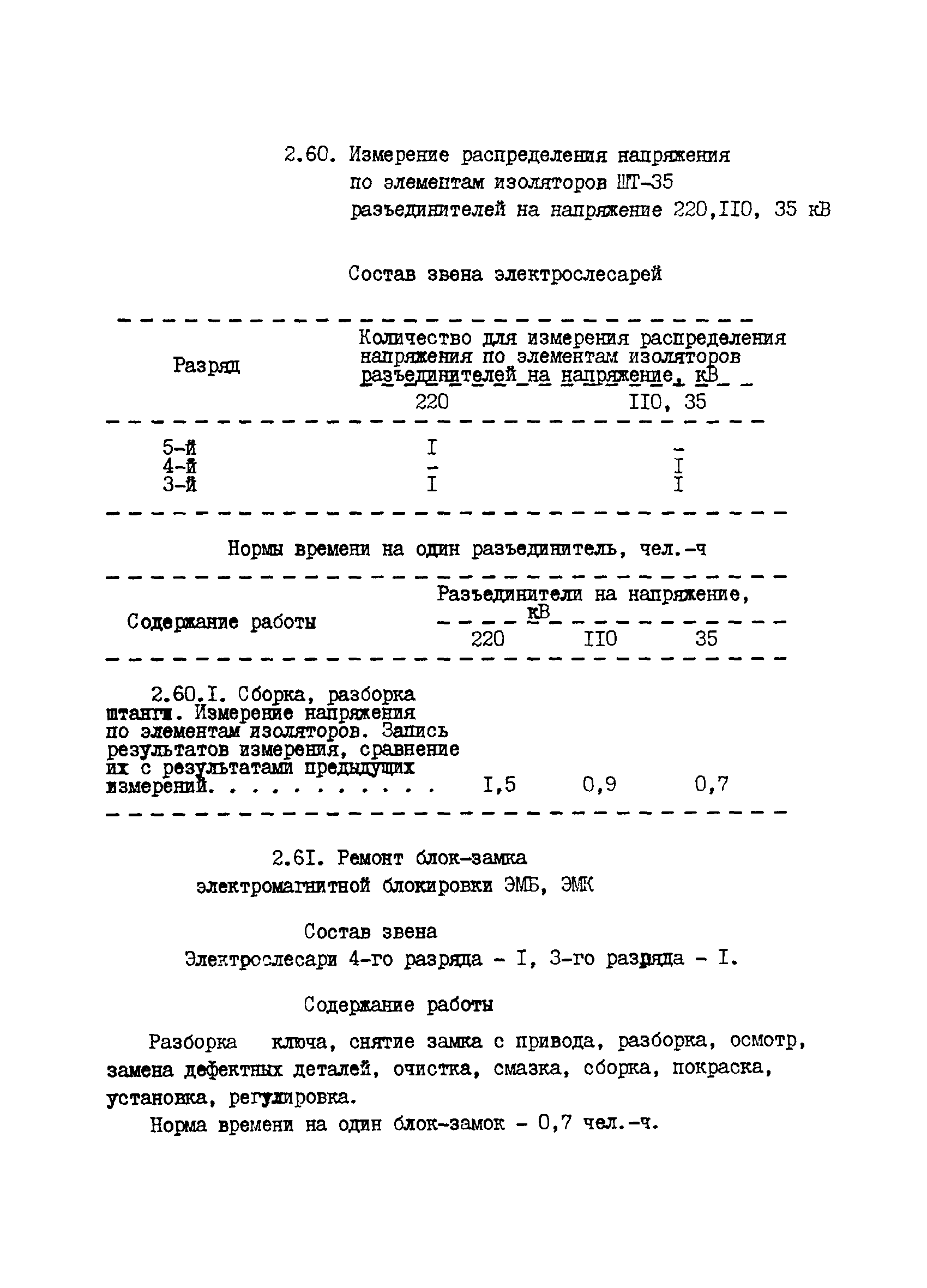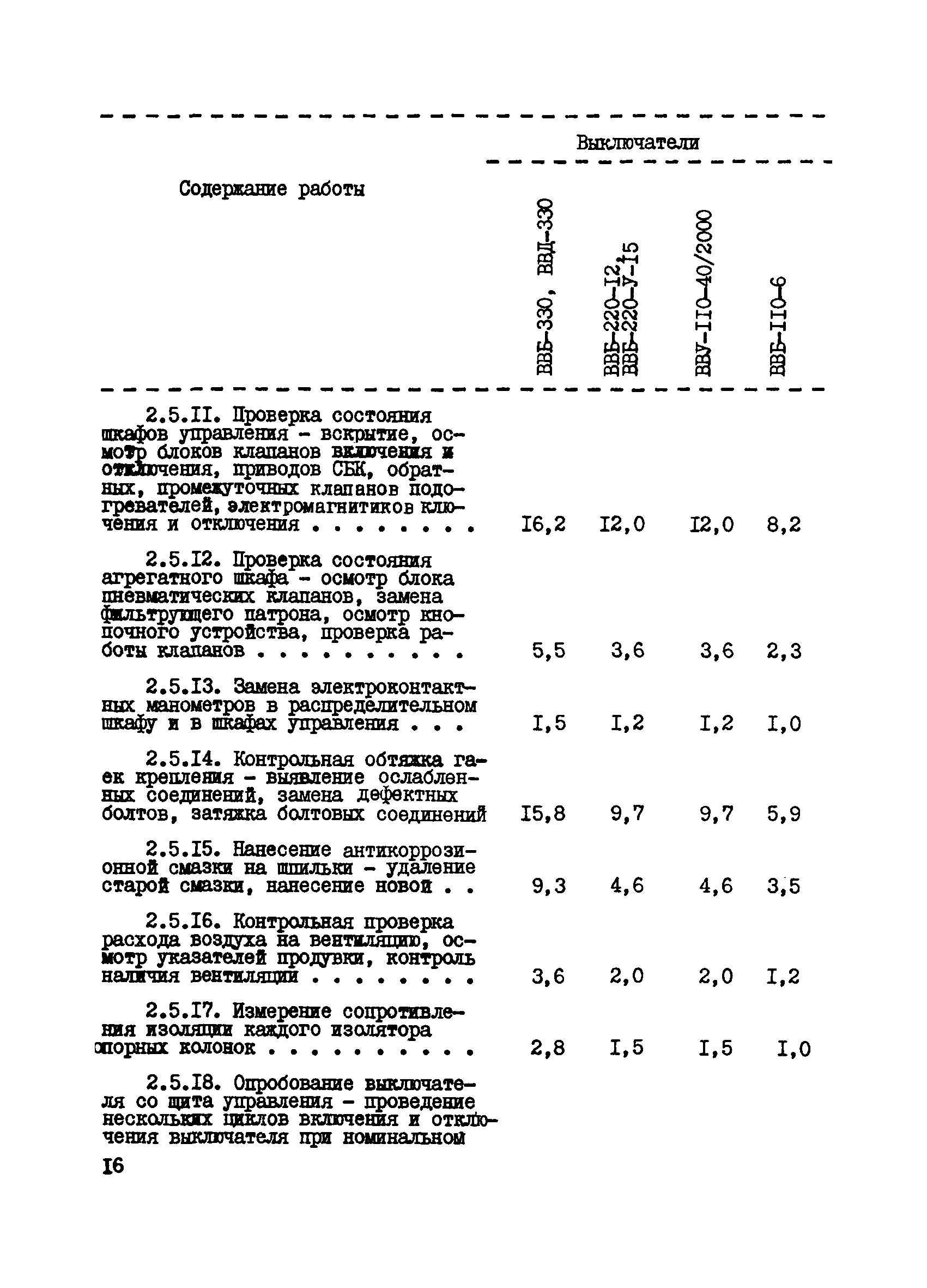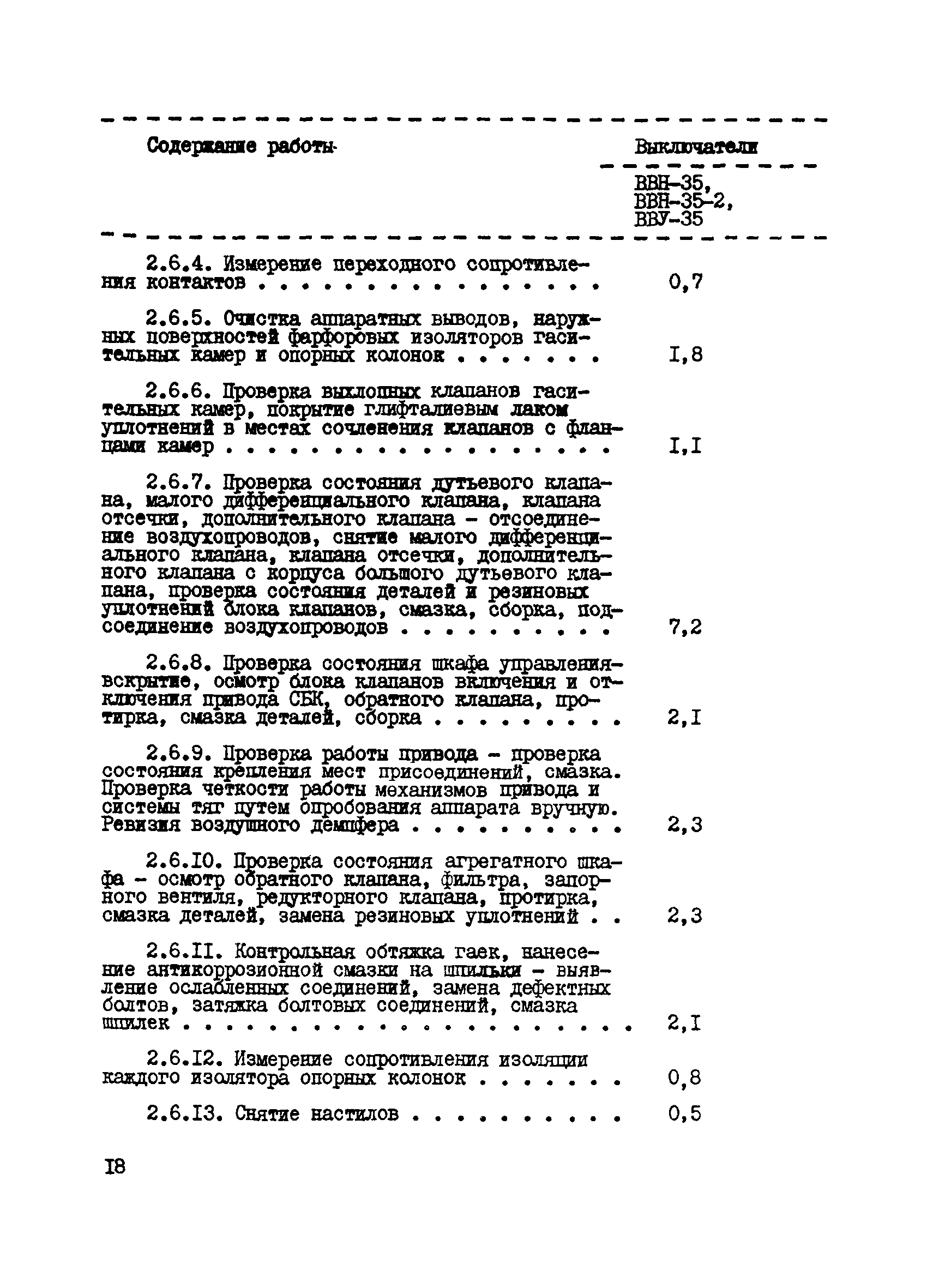 Нормы времени на капитальный, текущий ремонты и техническое обслуживание оборудования подстанций напряжением 35 - 500 кВ. Часть II. Текущий ремонт и техническое обслуживание| Статус: | справочные материалы, мп, тпр | | Название рус.: | Нормы времени на капитальный, текущий ремонты и техническое обслуживание оборудования подстанций напряжением 35 - 500 кВ. Часть II. Текущий ремонт и техническое обслуживание | | Дата добавления в базу: | 01.09.2013 | | Дата актуализации: | 01.01.2021 | | Область применения: | Нормы применяются при капитальном, ткущем ремонтах и техническом обслуживании оборудования подстанций напряжением 35 - 500 кВ. | | Оглавление: | 2. Текущий ремонт и техническое обслуживание 2.1 Синхронные компенсаторы с водородным охлаждением КСВ-100. КСВ-75, КСВ-50, КСВ-37,5 2.2 Синхронные компенсаторы с воздушным охлаждением КС-30, КС-15, КС-10, КС -7,5 2.3 Воздушные выключатели с воздухонаполненным отделителем ВВ-500, ВВ-500Б, ВВ-330, ВВН-330-15, ВВН-220-15, ВВН-220-10, ВВН-154-8, ВВН-110-6, ВВШ-154В, ВВШ-110 2.4 Воздушные выключатели ВВН-220/1000-7000, ВВН-220/2000-7000, ВВ-220, ВВН-154/800-4000, ВН-40001, ВВ-2503, ВВН-110/800-4000 2.5 Воздушные выключатели ВВБ-330, ВВД-330, ВВБ-220-12. ВВБ-220-У-15, ВВУ-110-40/2000 2.6 Воздушные выключатели ВВН-35, ВВН-35-2, ВВУ-35 2.7 Воздушные выключатели ВВ-15-6000. ВВ-15-5500, ВВ-15-600 2.8 Масляные выключатели МКП-220, У-220, У-220М, МКП-180, МКП-160, МКП-110, МКП-110М, У-110 2.9 Масляные выключатели ВМК-110, ВМК-35 2.10 Масляные выключатели МГ-110 2.11 Масляные выключатели МКП-35, ВМ-35, ВМД-35, С-35, ВТД-35 2.12 Масляные выключатели ВМП-35П, ВМПЭ-35, ВМП-10, ВМП-10П, ВМП-10К, ВМПП-10, ВМГ-133. ВМГ-10, ВММ-10, ВГ-10, МГГ-10 2.13 Электромагнитные выключатели ВЭМ-6-2000/40-125, ВЭМ-6-3200/40-125 2.14 Масляные выключатели ВМ-23. ВМ-22, ВМ-16, ВМ-14, ВМ-10, ВМБ-10, ВМП-16, ВМП-14 2.15 Разъединители РОНЗ-I-500, РОНЗ-I-330, РОНЗ-I-220 2.16 Разъединители РЛНД-500, РНД-330. РЛНД-220, РЛНД-150, РЛНД-110, РЛНД-35, РЛНД-100, РДНД-6 2.17 Разъединители РЛНЗ-220, РЛНЗ-150, РЛН-110, РЛН-35. РЛН-10, РЛН-6 2.18 Шинный разъединитель РВК-10/3000 одного присоединения 2.19 Отделители ОД-220М. ОД-150М, ОД-110М, ОДЗ-110М, ОД-35, ОДЗ-35 2.20 Короткозамыкатели КЗ-220М, КЗ-150М, КЗ-110М, КЗ-35 2.21 Трансформаторы напряжения НКФ-500, НКФ-330, НКФ-220, НКФ-150, НКФ-110, ЗНОМ-35, НОМ-10, НОМ-6 2.22 Трансформаторы тока ТФКНД-500, ТФКН-330, ТРН-330, ТФНД-220, ТФНД-150, ТФНД-110, ТФНД-35, ТПФЛ-10 2.23 Компрессоры ВШ-3/40, ВКУ-60/40 2.24 Разрядники РВМК-500, РВМГ-500, РВМК-330, РВМГ-330, РВМГ-154, РВС-330, РВС-220, РВС-154, РВС-110. РВС-35, РВП-10, РВП-6 2.25 Высокочастотные заградители ВЗ-2000-1,2, ВЗ-1000-0,6, ВЗ-600-0,25 2.26 Система шин ЗРУ-6-10 кВ 2.27 Система шин ОРУ-500, 330, 220, 150, 110, 25 кВ 2.28 Конденсаторы связи СМР-166/3-0,014, СМР-133/3-0.0186, СМР-110/3-0,0064, СМР-66/3-0,0044, СММ-20.3-0,107 2.29 Аккумуляторные батареи СК-16. СК-12, СК-10, СК-8, СК-6, СК-3, СК22, СК-1 2.30 Сухой реактор РБ-10 (600А) 2.31 Масляный токоограничивающий реактор РТДТ-35-1000-10 наружной установки 2.32 Ремонт двигателей -генераторов 2.33 Проверка состояния магнитных пускателей ПА-522 (на месте установки) 2.34 Осмотр и очистка кабельных каналов 2.35 Ремонт воздухосборников 2.36 Проверка состояния воздухопроводной сети 2.37. Восстановление надписей 2.38 Ремонт панели щита постоянного и переменного тока 2.39 Ремонт дистиллятора АА-1 2.40 Ремонт фильтр-пресса ФП-2/3000 2.41 Ремонт центрифуги СМ-1,5 (на месте установки) 2.42 Ремонт предохранителей ПК-6(7,5 А), ПК-10 (20А) 2.43 Ремонт стреляющего предохранителя ПСН-35 2.44 Проверка состояния противопожарного инвентаря 2.45 Замена баллонов с углекислым газом 2.46 Измерение распределения напряжения по элементам изоляторов ИШД-35 и ШТ-35 (штангой) 2.47 Ремонт переносных заземлений для устро