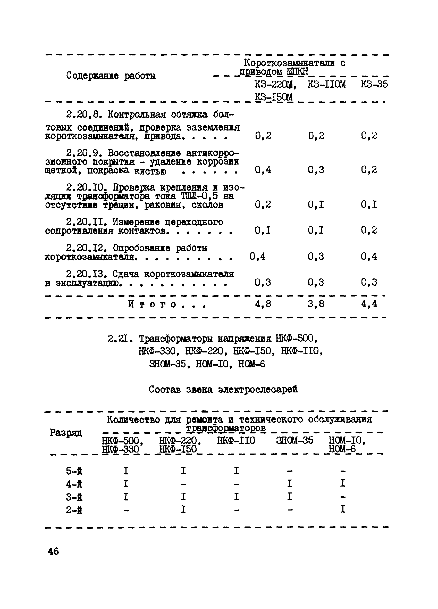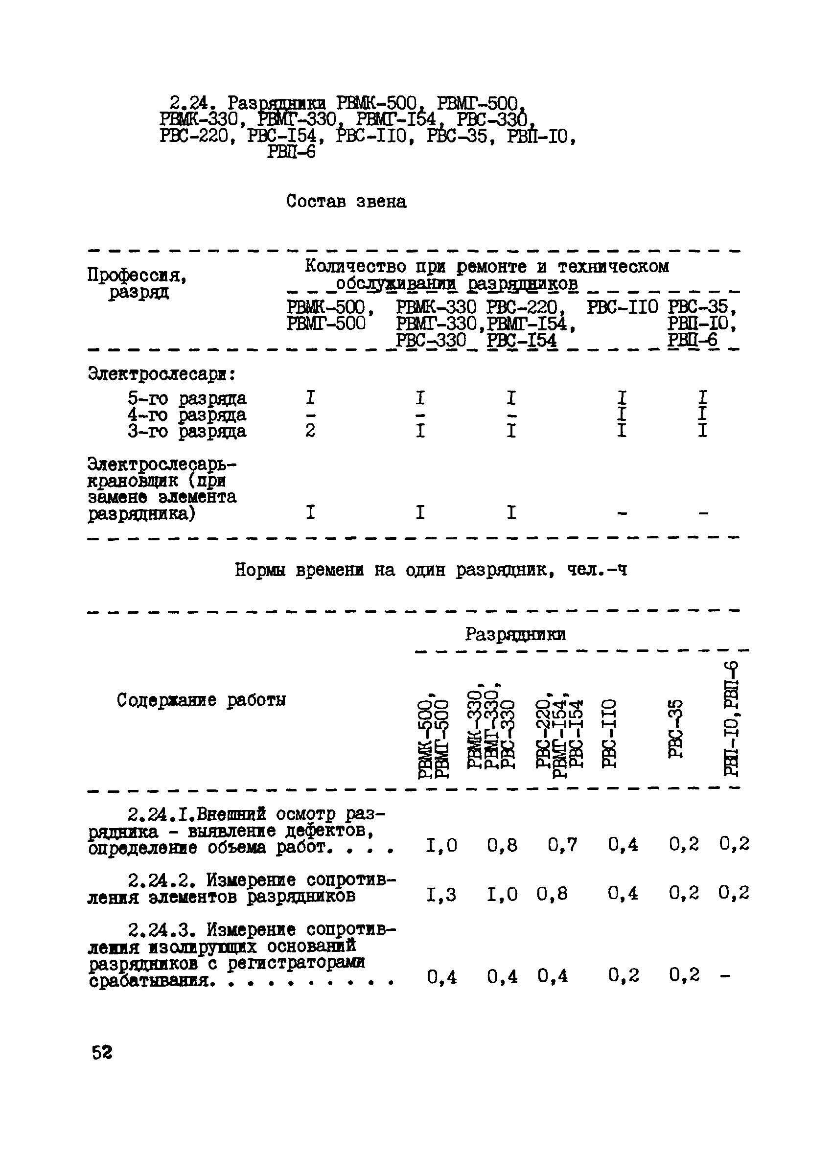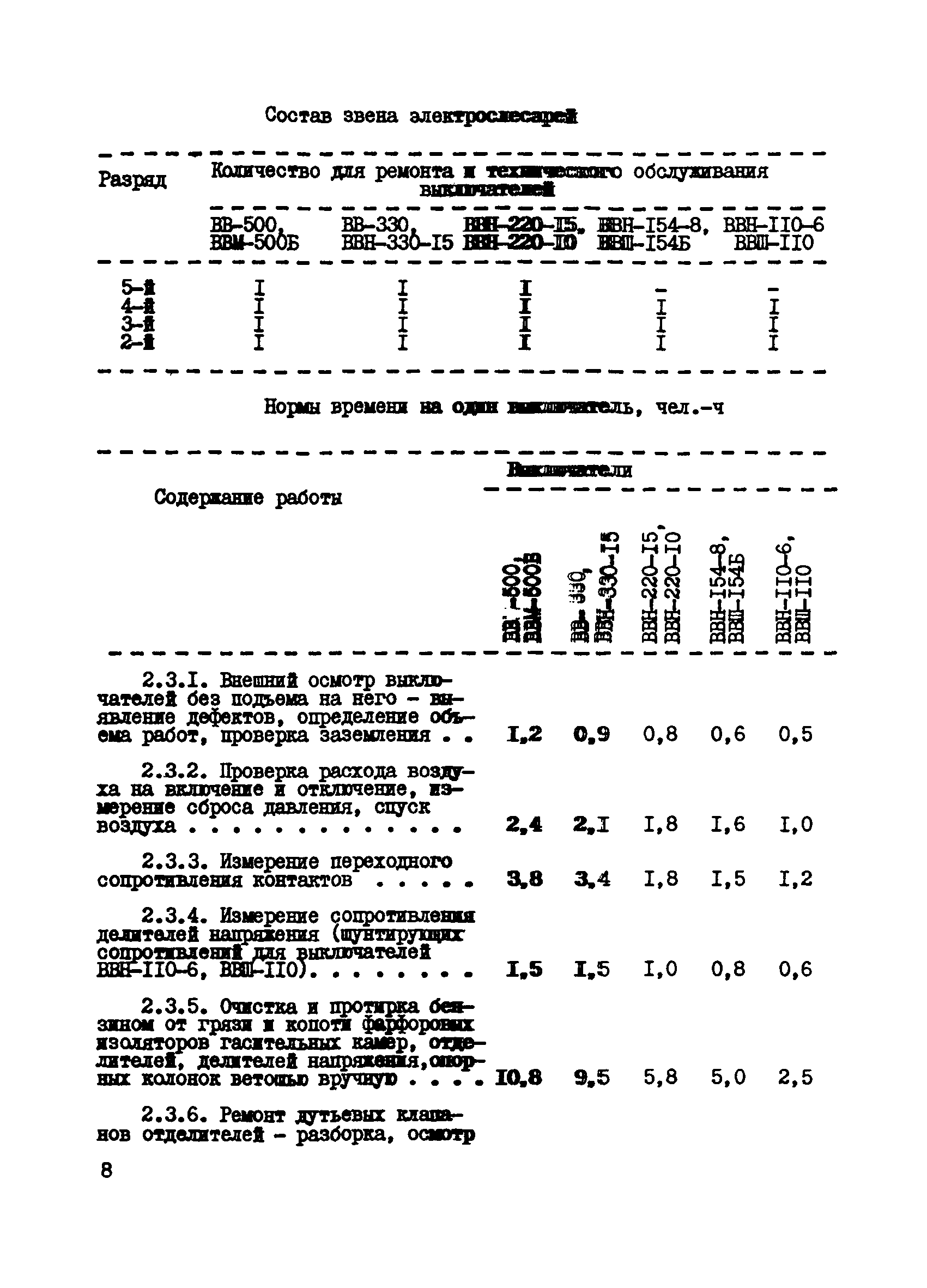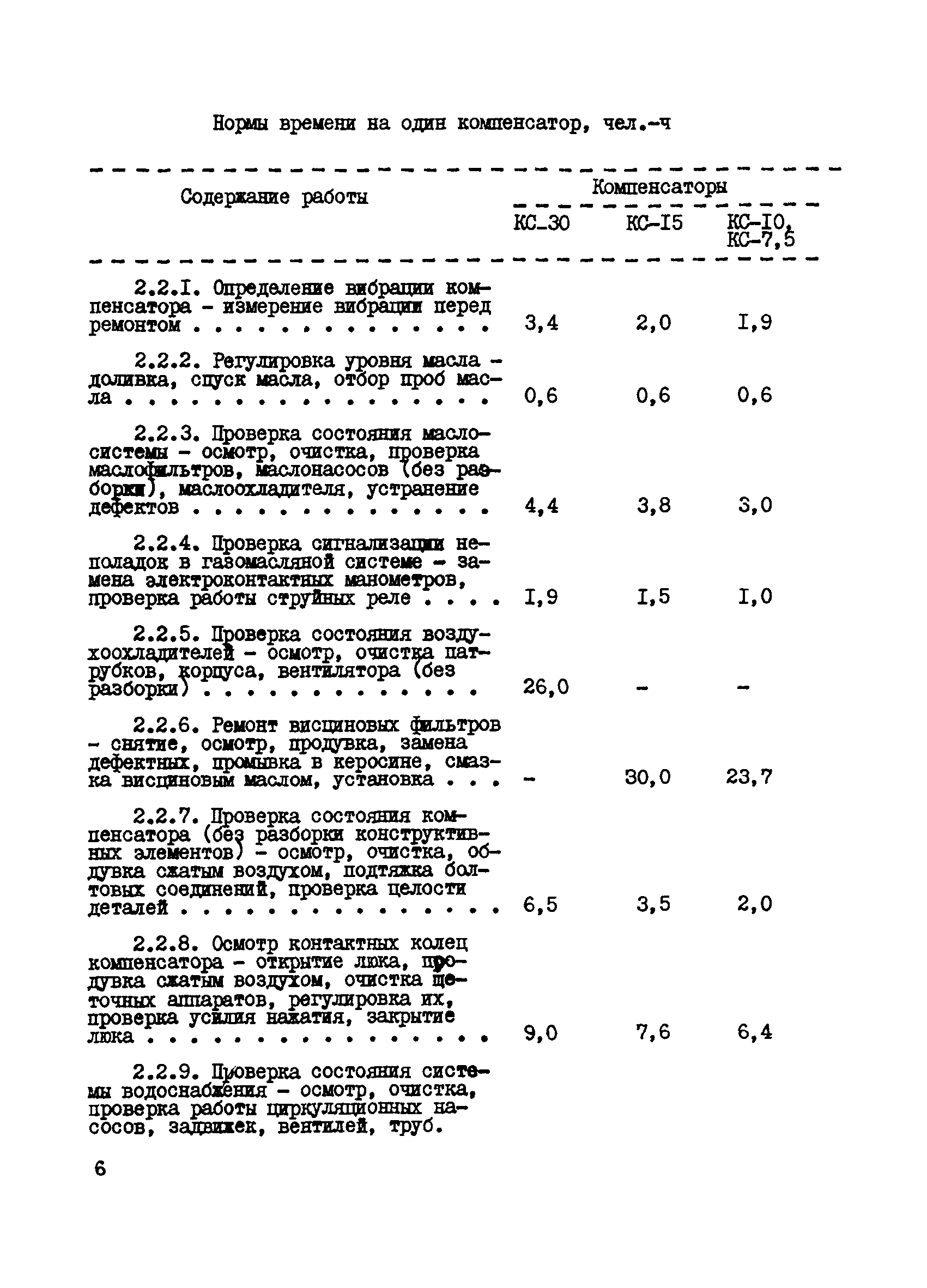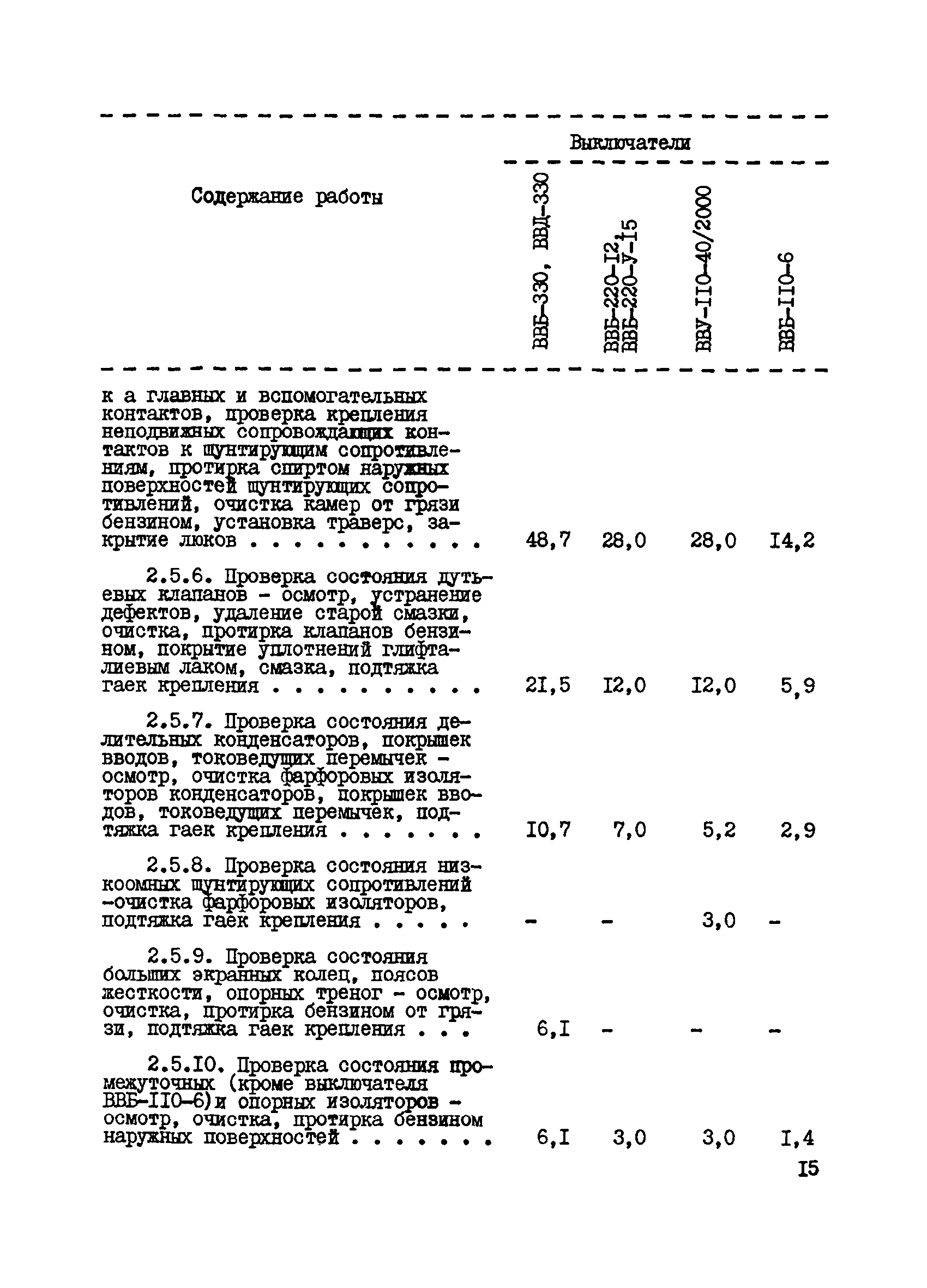 Нормы времени на капитальный, текущий ремонты и техническое обслуживание оборудования подстанций напряжением 35 - 500 кВ. Часть II. Текущий ремонт и техническое обслуживание| Статус: | справочные материалы, мп, тпр | | Название рус.: | Нормы времени на капитальный, текущий ремонты и техническое обслуживание оборудования подстанций напряжением 35 - 500 кВ. Часть II. Текущий ремонт и техническое обслуживание | | Дата добавления в базу: | 01.09.2013 | | Дата актуализации: | 01.01.2021 | | Область применения: | Нормы применяются при капитальном, ткущем ремонтах и техническом обслуживании оборудования подстанций напряжением 35 - 500 кВ. | | Оглавление: | 2. Текущий ремонт и техническое обслуживание 2.1 Синхронные компенсаторы с водородным охлаждением КСВ-100. КСВ-75, КСВ-50, КСВ-37,5 2.2 Синхронные компенсаторы с воздушным охлаждением КС-30, КС-15, КС-10, КС -7,5 2.3 Воздушные выключатели с воздухонаполненным отделителем ВВ-500, ВВ-500Б, ВВ-330, ВВН-330-15, ВВН-220-15, ВВН-220-10, ВВН-154-8, ВВН-110-6, ВВШ-154В, ВВШ-110 2.4 Воздушные выключатели ВВН-220/1000-7000, ВВН-220/2000-7000, ВВ-220, ВВН-154/800-4000, ВН-40001, ВВ-2503, ВВН-110/800-4000 2.5 Воздушные выключатели ВВБ-330, ВВД-330, ВВБ-220-12. ВВБ-220-У-15, ВВУ-110-40/2000 2.6 Воздушные выключатели ВВН-35, ВВН-35-2, ВВУ-35 2.7 Воздушные выключатели ВВ-15-6000. ВВ-15-5500, ВВ-15-600 2.8 Масляные выключатели МКП-220, У-220, У-220М, МКП-180, МКП-160, МКП-110, МКП-110М, У-110 2.9 Масляные выключатели ВМК-110, ВМК-35 2.10 Масляные выключатели МГ-110 2.11 Масляные выключатели МКП-35, ВМ-35, ВМД-35, С-35, ВТД-35 2.12 Масляные выключатели ВМП-35П, ВМПЭ-35, ВМП-10, ВМП-10П, ВМП-10К, ВМПП-10, ВМГ-133. ВМГ-10, ВММ-10, ВГ-10, МГГ-10 2.13 Электромагнитные выключатели ВЭМ-6-2000/40-125, ВЭМ-6-3200/40-125 2.14 Масляные выключатели ВМ-23. ВМ-22, ВМ-16, ВМ-14, ВМ-10, ВМБ-10, ВМП-16, ВМП-14 2.15 Разъединители РОНЗ-I-500, РОНЗ-I-330, РОНЗ-I-220 2.16 Разъединители РЛНД-500, РНД-330. РЛНД-220, РЛНД-150, РЛНД-110, РЛНД-35, РЛНД-100, РДНД-6 2.17 Разъединители РЛНЗ-220, РЛНЗ-150, РЛН-110, РЛН-35. РЛН-10, РЛН-6 2.18 Шинный разъединитель РВК-10/3000 одного присоединения 2.19 Отделители ОД-220М. ОД-150М, ОД-110М, ОДЗ-110М, ОД-35, ОДЗ-35 2.20 Короткозамыкатели КЗ-220М, КЗ-150М, КЗ-110М, КЗ-35 2.21 Трансформаторы напряжения НКФ-500, НКФ-330, НКФ-220, НКФ-150, НКФ-110, ЗНОМ-35, НОМ-10, НОМ-6 2.22 Трансформаторы тока ТФКНД-500, ТФКН-330, ТРН-330, ТФНД-220, ТФНД-150, ТФНД-110, ТФНД-35, ТПФЛ-10 2.23 Компрессоры ВШ-3/40, ВКУ-60/40 2.24 Разрядники РВМК-500, РВМГ-500, РВМК-330, РВМГ-330, РВМГ-154, РВС-330, РВС-220, РВС-154, РВС-110. РВС-35, РВП-10, РВП-6 2.25 Высокочастотные заградители ВЗ-2000-1,2, ВЗ-1000-0,6, ВЗ-600-0,25 2.26 Система шин ЗРУ-6-10 кВ 2.27 Система шин ОРУ-500, 330, 220, 150, 110, 25 кВ 2.28 Конденсаторы связи СМР-166/3-0,014, СМР-133/3-0.0186, СМР-110/3-0,0064, СМР-66/3-0,0044, СММ-20.3-0,107 2.29 Аккумуляторные батареи СК-16. СК-12, СК-10, СК-8, СК-6, СК-3, СК22, СК-1 2.30 Сухой реактор РБ-10 (600А) 2.31 Масляный токоограничивающий реактор РТДТ-35-1000-10 наружной установки 2.32 Ремонт двигателей -генераторов 2.33 Проверка состояния магнитных пускателей ПА-522 (на месте установки) 2.34 Осмотр и очистка кабельных каналов 2.35 Ремонт воздухосборников 2.36 Проверка состояния воздухопроводной сети 2.37. Восстановление надписей 2.38 Ремонт панели щита постоянного и переменного тока 2.39 Ремонт дистиллятора АА-1 2.40 Ремонт фильтр-пресса ФП-2/3000 2.41 Ремонт центрифуги СМ-1,5 (на месте установки) 2.42 Ремонт предохранителей ПК-6(7,5 А), ПК-10 (20А) 2.43 Ремонт стреляющего предохранителя ПСН-35 2.44 Проверка состояния противопожарного инвентаря 2.45 Замена баллонов с углекислым газом 2.46 Измерение распределения напряжения по элементам изоляторов ИШД-35 и ШТ-35 (штангой) 2.47 Ремонт переносных заземлений для устро
