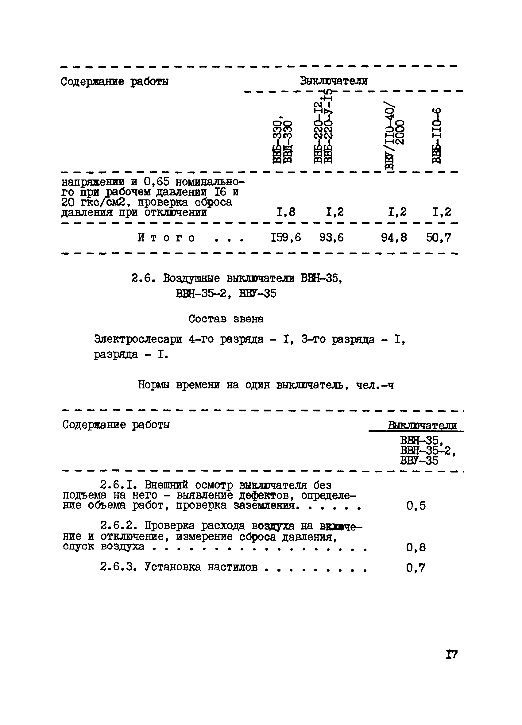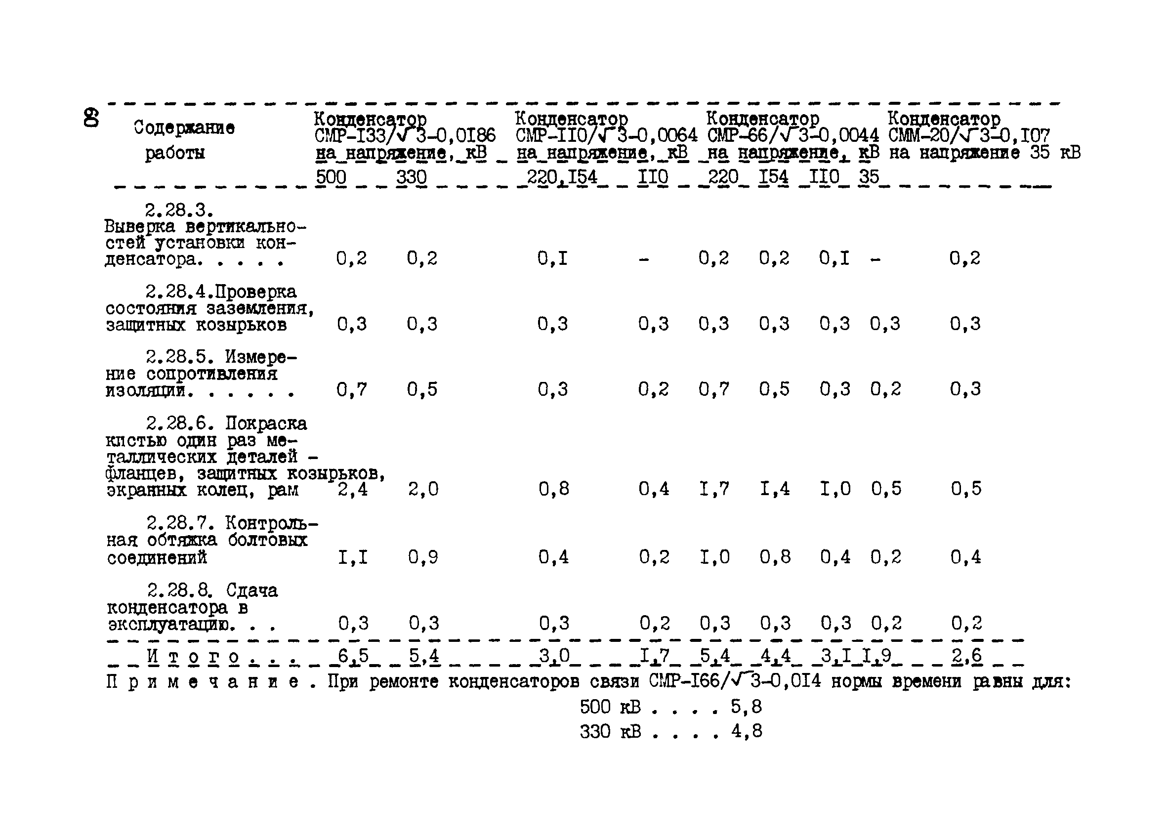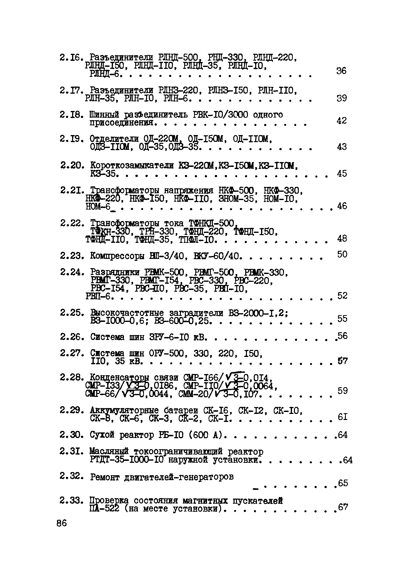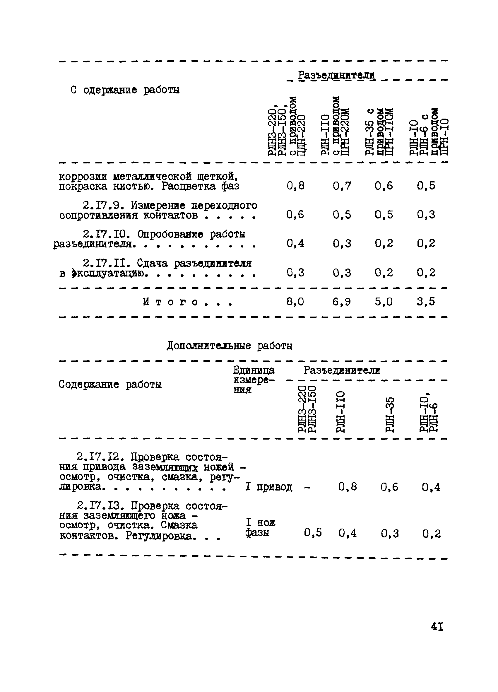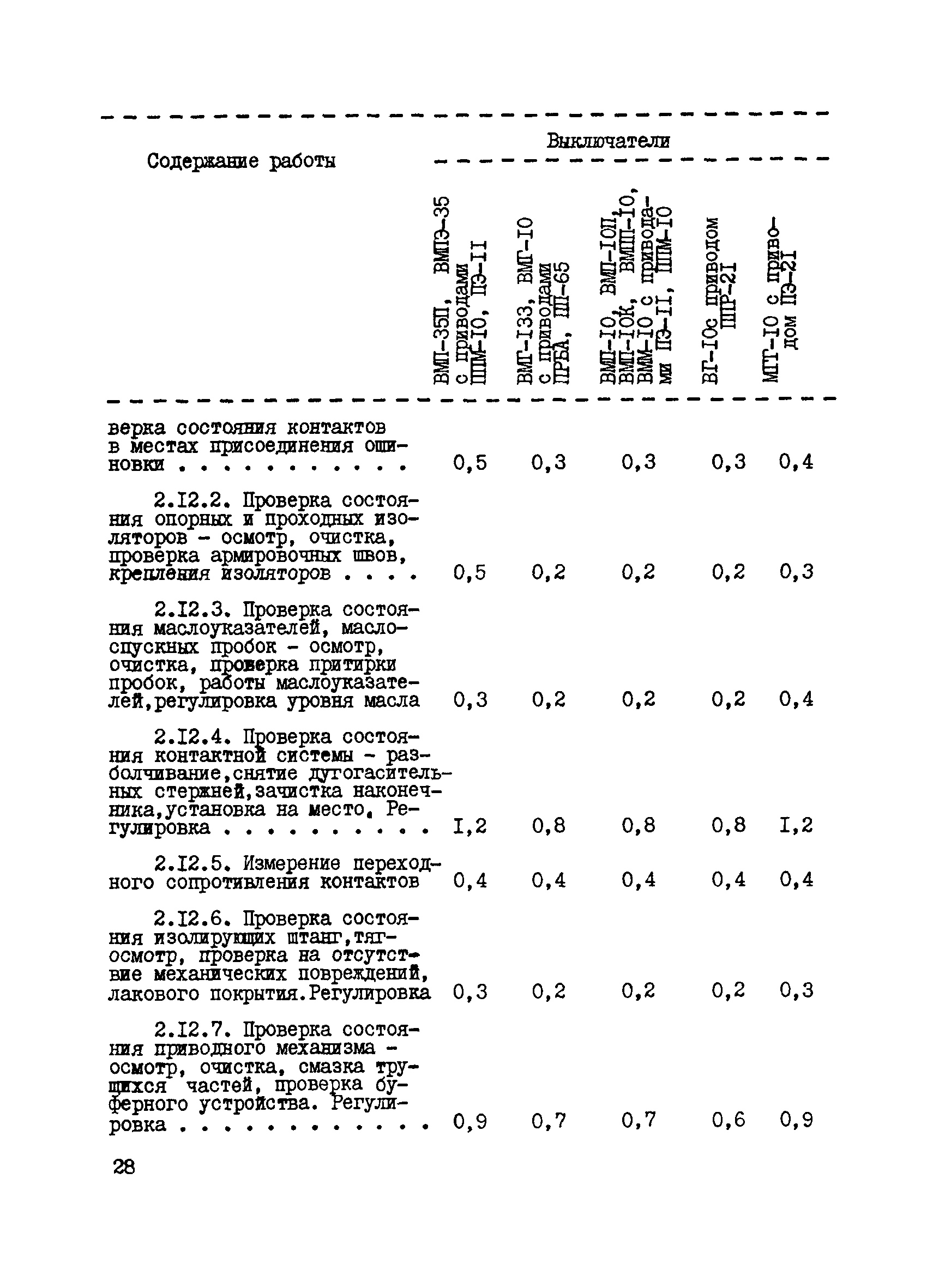 Нормы времени на капитальный, текущий ремонты и техническое обслуживание оборудования подстанций напряжением 35 - 500 кВ. Часть II. Текущий ремонт и техническое обслуживание| Статус: | справочные материалы, мп, тпр | | Название рус.: | Нормы времени на капитальный, текущий ремонты и техническое обслуживание оборудования подстанций напряжением 35 - 500 кВ. Часть II. Текущий ремонт и техническое обслуживание | | Дата добавления в базу: | 01.09.2013 | | Дата актуализации: | 01.01.2021 | | Область применения: | Нормы применяются при капитальном, ткущем ремонтах и техническом обслуживании оборудования подстанций напряжением 35 - 500 кВ. | | Оглавление: | 2. Текущий ремонт и техническое обслуживание 2.1 Синхронные компенсаторы с водородным охлаждением КСВ-100. КСВ-75, КСВ-50, КСВ-37,5 2.2 Синхронные компенсаторы с воздушным охлаждением КС-30, КС-15, КС-10, КС -7,5 2.3 Воздушные выключатели с воздухонаполненным отделителем ВВ-500, ВВ-500Б, ВВ-330, ВВН-330-15, ВВН-220-15, ВВН-220-10, ВВН-154-8, ВВН-110-6, ВВШ-154В, ВВШ-110 2.4 Воздушные выключатели ВВН-220/1000-7000, ВВН-220/2000-7000, ВВ-220, ВВН-154/800-4000, ВН-40001, ВВ-2503, ВВН-110/800-4000 2.5 Воздушные выключатели ВВБ-330, ВВД-330, ВВБ-220-12. ВВБ-220-У-15, ВВУ-110-40/2000 2.6 Воздушные выключатели ВВН-35, ВВН-35-2, ВВУ-35 2.7 Воздушные выключатели ВВ-15-6000. ВВ-15-5500, ВВ-15-600 2.8 Масляные выключатели МКП-220, У-220, У-220М, МКП-180, МКП-160, МКП-110, МКП-110М, У-110 2.9 Масляные выключатели ВМК-110, ВМК-35 2.10 Масляные выключатели МГ-110 2.11 Масляные выключатели МКП-35, ВМ-35, ВМД-35, С-35, ВТД-35 2.12 Масляные выключатели ВМП-35П, ВМПЭ-35, ВМП-10, ВМП-10П, ВМП-10К, ВМПП-10, ВМГ-133. ВМГ-10, ВММ-10, ВГ-10, МГГ-10 2.13 Электромагнитные выключатели ВЭМ-6-2000/40-125, ВЭМ-6-3200/40-125 2.14 Масляные выключатели ВМ-23. ВМ-22, ВМ-16, ВМ-14, ВМ-10, ВМБ-10, ВМП-16, ВМП-14 2.15 Разъединители РОНЗ-I-500, РОНЗ-I-330, РОНЗ-I-220 2.16 Разъединители РЛНД-500, РНД-330. РЛНД-220, РЛНД-150, РЛНД-110, РЛНД-35, РЛНД-100, РДНД-6 2.17 Разъединители РЛНЗ-220, РЛНЗ-150, РЛН-110, РЛН-35. РЛН-10, РЛН-6 2.18 Шинный разъединитель РВК-10/3000 одного присоединения 2.19 Отделители ОД-220М. ОД-150М, ОД-110М, ОДЗ-110М, ОД-35, ОДЗ-35 2.20 Короткозамыкатели КЗ-220М, КЗ-150М, КЗ-110М, КЗ-35 2.21 Трансформаторы напряжения НКФ-500, НКФ-330, НКФ-220, НКФ-150, НКФ-110, ЗНОМ-35, НОМ-10, НОМ-6 2.22 Трансформаторы тока ТФКНД-500, ТФКН-330, ТРН-330, ТФНД-220, ТФНД-150, ТФНД-110, ТФНД-35, ТПФЛ-10 2.23 Компрессоры ВШ-3/40, ВКУ-60/40 2.24 Разрядники РВМК-500, РВМГ-500, РВМК-330, РВМГ-330, РВМГ-154, РВС-330, РВС-220, РВС-154, РВС-110. РВС-35, РВП-10, РВП-6 2.25 Высокочастотные заградители ВЗ-2000-1,2, ВЗ-1000-0,6, ВЗ-600-0,25 2.26 Система шин ЗРУ-6-10 кВ 2.27 Система шин ОРУ-500, 330, 220, 150, 110, 25 кВ 2.28 Конденсаторы связи СМР-166/3-0,014, СМР-133/3-0.0186, СМР-110/3-0,0064, СМР-66/3-0,0044, СММ-20.3-0,107 2.29 Аккумуляторные батареи СК-16. СК-12, СК-10, СК-8, СК-6, СК-3, СК22, СК-1 2.30 Сухой реактор РБ-10 (600А) 2.31 Масляный токоограничивающий реактор РТДТ-35-1000-10 наружной установки 2.32 Ремонт двигателей -генераторов 2.33 Проверка состояния магнитных пускателей ПА-522 (на месте установки) 2.34 Осмотр и очистка кабельных каналов 2.35 Ремонт воздухосборников 2.36 Проверка состояния воздухопроводной сети 2.37. Восстановление надписей 2.38 Ремонт панели щита постоянного и переменного тока 2.39 Ремонт дистиллятора АА-1 2.40 Ремонт фильтр-пресса ФП-2/3000 2.41 Ремонт центрифуги СМ-1,5 (на месте установки) 2.42 Ремонт предохранителей ПК-6(7,5 А), ПК-10 (20А) 2.43 Ремонт стреляющего предохранителя ПСН-35 2.44 Проверка состояния противопожарного инвентаря 2.45 Замена баллонов с углекислым газом 2.46 Измерение распределения напряжения по элементам изоляторов ИШД-35 и ШТ-35 (штангой) 2.47 Ремонт переносных заземлений для устро