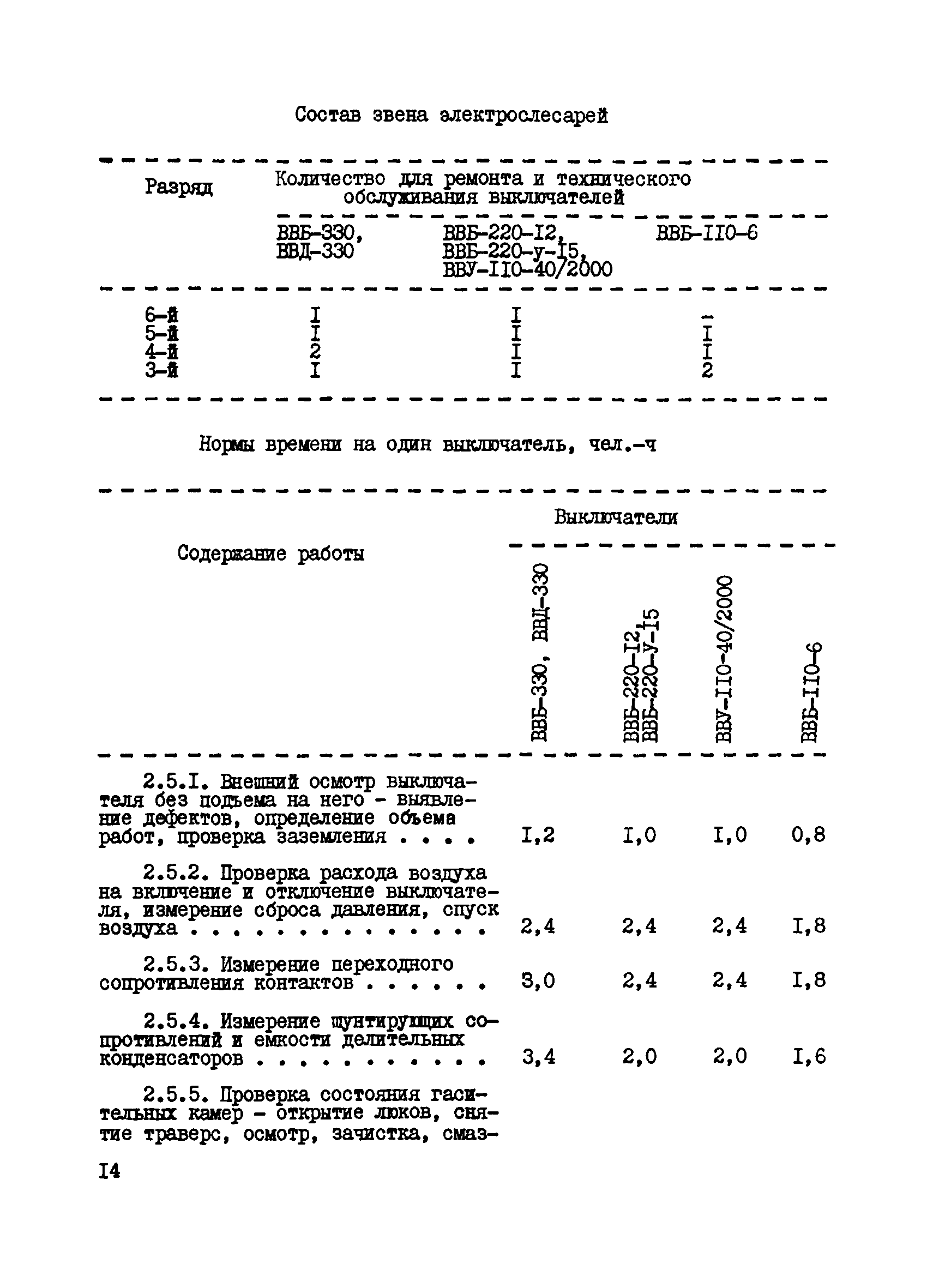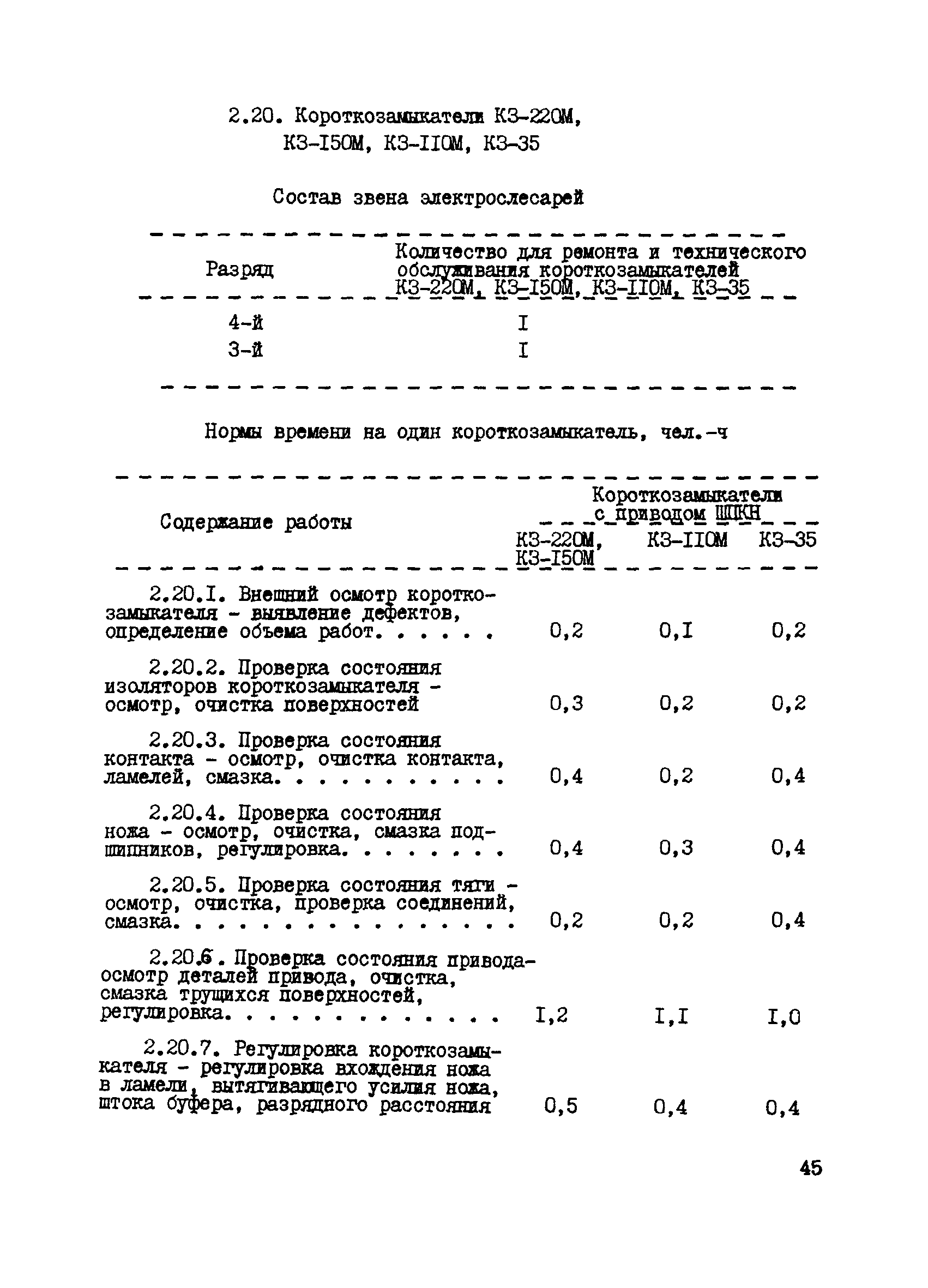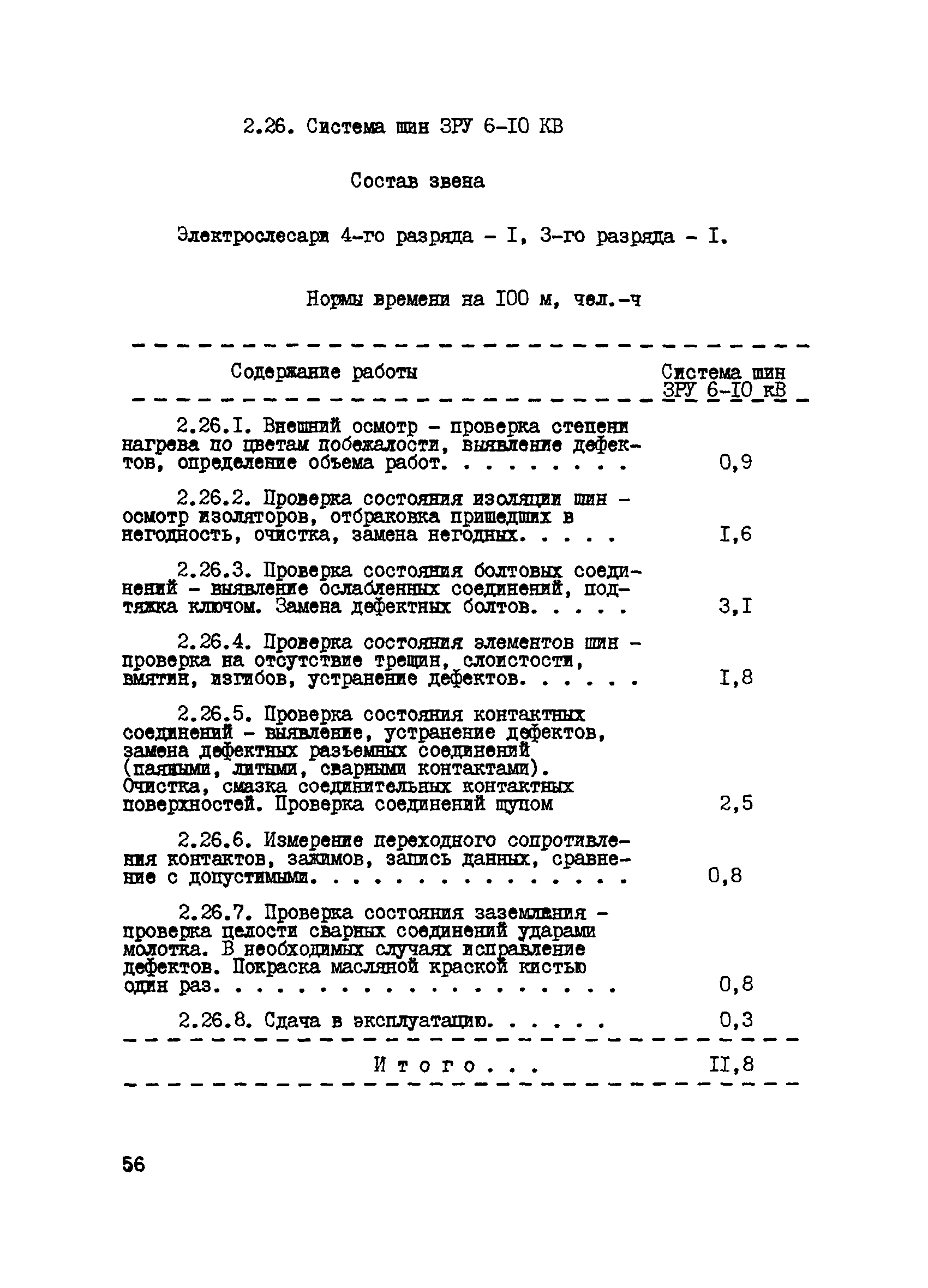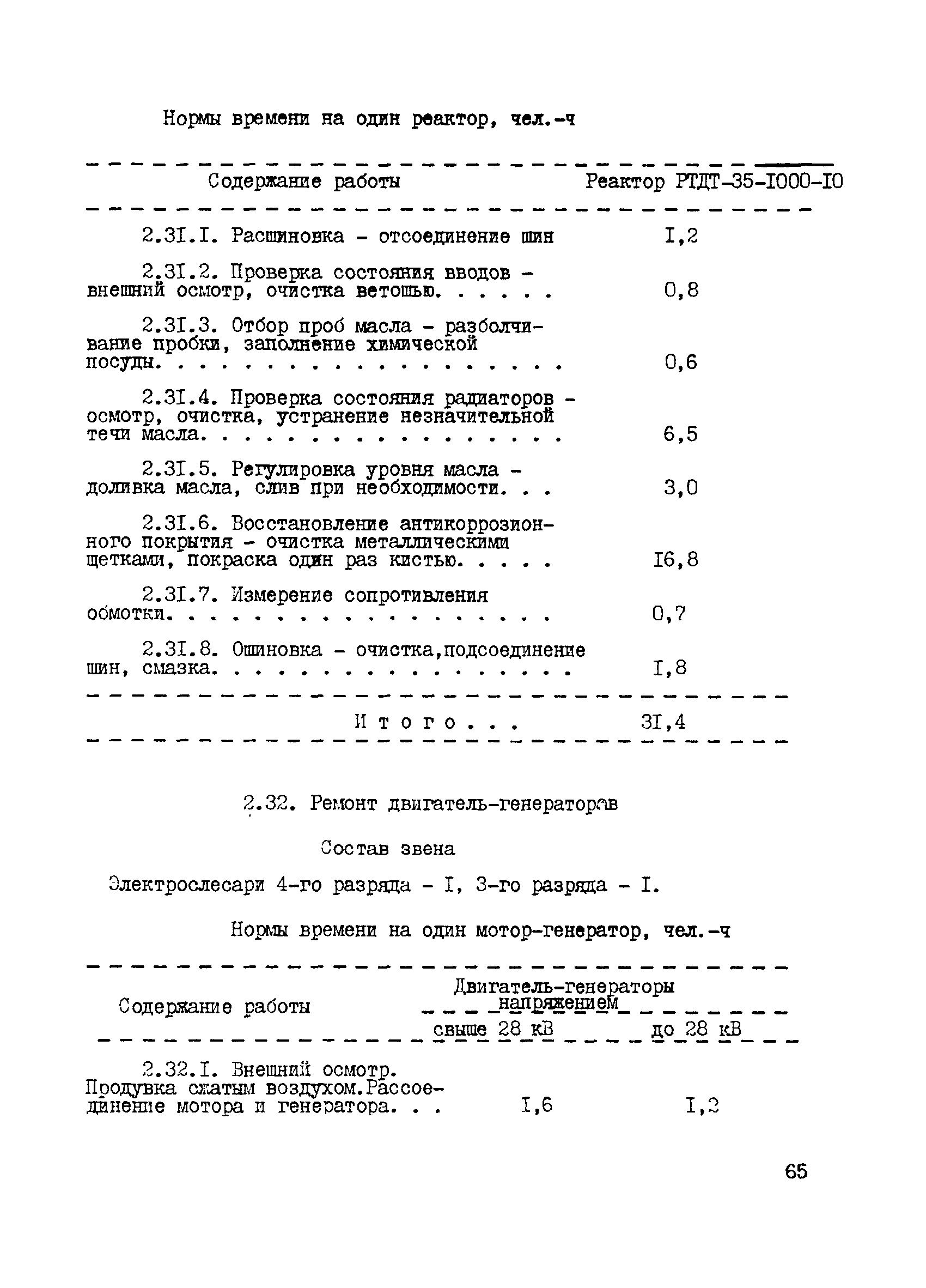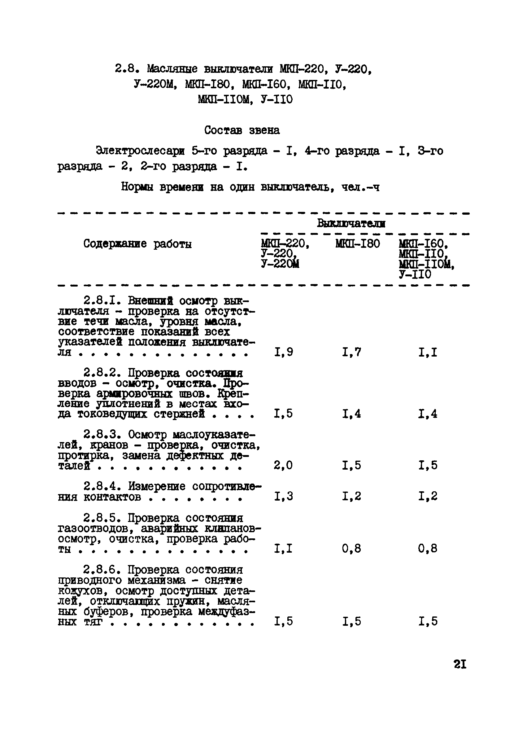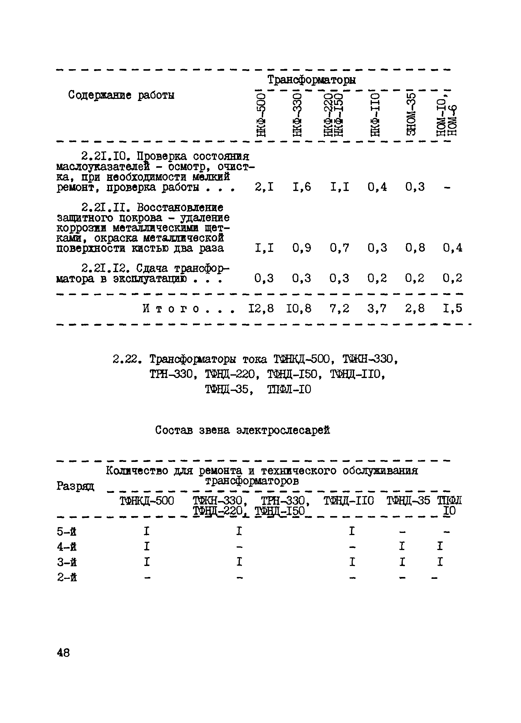 Нормы времени на капитальный, текущий ремонты и техническое обслуживание оборудования подстанций напряжением 35 - 500 кВ. Часть II. Текущий ремонт и техническое обслуживание| Статус: | справочные материалы, мп, тпр | | Название рус.: | Нормы времени на капитальный, текущий ремонты и техническое обслуживание оборудования подстанций напряжением 35 - 500 кВ. Часть II. Текущий ремонт и техническое обслуживание | | Дата добавления в базу: | 01.09.2013 | | Дата актуализации: | 01.01.2021 | | Область применения: | Нормы применяются при капитальном, ткущем ремонтах и техническом обслуживании оборудования подстанций напряжением 35 - 500 кВ. | | Оглавление: | 2. Текущий ремонт и техническое обслуживание 2.1 Синхронные компенсаторы с водородным охлаждением КСВ-100. КСВ-75, КСВ-50, КСВ-37,5 2.2 Синхронные компенсаторы с воздушным охлаждением КС-30, КС-15, КС-10, КС -7,5 2.3 Воздушные выключатели с воздухонаполненным отделителем ВВ-500, ВВ-500Б, ВВ-330, ВВН-330-15, ВВН-220-15, ВВН-220-10, ВВН-154-8, ВВН-110-6, ВВШ-154В, ВВШ-110 2.4 Воздушные выключатели ВВН-220/1000-7000, ВВН-220/2000-7000, ВВ-220, ВВН-154/800-4000, ВН-40001, ВВ-2503, ВВН-110/800-4000 2.5 Воздушные выключатели ВВБ-330, ВВД-330, ВВБ-220-12. ВВБ-220-У-15, ВВУ-110-40/2000 2.6 Воздушные выключатели ВВН-35, ВВН-35-2, ВВУ-35 2.7 Воздушные выключатели ВВ-15-6000. ВВ-15-5500, ВВ-15-600 2.8 Масляные выключатели МКП-220, У-220, У-220М, МКП-180, МКП-160, МКП-110, МКП-110М, У-110 2.9 Масляные выключатели ВМК-110, ВМК-35 2.10 Масляные выключатели МГ-110 2.11 Масляные выключатели МКП-35, ВМ-35, ВМД-35, С-35, ВТД-35 2.12 Масляные выключатели ВМП-35П, ВМПЭ-35, ВМП-10, ВМП-10П, ВМП-10К, ВМПП-10, ВМГ-133. ВМГ-10, ВММ-10, ВГ-10, МГГ-10 2.13 Электромагнитные выключатели ВЭМ-6-2000/40-125, ВЭМ-6-3200/40-125 2.14 Масляные выключатели ВМ-23. ВМ-22, ВМ-16, ВМ-14, ВМ-10, ВМБ-10, ВМП-16, ВМП-14 2.15 Разъединители РОНЗ-I-500, РОНЗ-I-330, РОНЗ-I-220 2.16 Разъединители РЛНД-500, РНД-330. РЛНД-220, РЛНД-150, РЛНД-110, РЛНД-35, РЛНД-100, РДНД-6 2.17 Разъединители РЛНЗ-220, РЛНЗ-150, РЛН-110, РЛН-35. РЛН-10, РЛН-6 2.18 Шинный разъединитель РВК-10/3000 одного присоединения 2.19 Отделители ОД-220М. ОД-150М, ОД-110М, ОДЗ-110М, ОД-35, ОДЗ-35 2.20 Короткозамыкатели КЗ-220М, КЗ-150М, КЗ-110М, КЗ-35 2.21 Трансформаторы напряжения НКФ-500, НКФ-330, НКФ-220, НКФ-150, НКФ-110, ЗНОМ-35, НОМ-10, НОМ-6 2.22 Трансформаторы тока ТФКНД-500, ТФКН-330, ТРН-330, ТФНД-220, ТФНД-150, ТФНД-110, ТФНД-35, ТПФЛ-10 2.23 Компрессоры ВШ-3/40, ВКУ-60/40 2.24 Разрядники РВМК-500, РВМГ-500, РВМК-330, РВМГ-330, РВМГ-154, РВС-330, РВС-220, РВС-154, РВС-110. РВС-35, РВП-10, РВП-6 2.25 Высокочастотные заградители ВЗ-2000-1,2, ВЗ-1000-0,6, ВЗ-600-0,25 2.26 Система шин ЗРУ-6-10 кВ 2.27 Система шин ОРУ-500, 330, 220, 150, 110, 25 кВ 2.28 Конденсаторы связи СМР-166/3-0,014, СМР-133/3-0.0186, СМР-110/3-0,0064, СМР-66/3-0,0044, СММ-20.3-0,107 2.29 Аккумуляторные батареи СК-16. СК-12, СК-10, СК-8, СК-6, СК-3, СК22, СК-1 2.30 Сухой реактор РБ-10 (600А) 2.31 Масляный токоограничивающий реактор РТДТ-35-1000-10 наружной установки 2.32 Ремонт двигателей -генераторов 2.33 Проверка состояния магнитных пускателей ПА-522 (на месте установки) 2.34 Осмотр и очистка кабельных каналов 2.35 Ремонт воздухосборников 2.36 Проверка состояния воздухопроводной сети 2.37. Восстановление надписей 2.38 Ремонт панели щита постоянного и переменного тока 2.39 Ремонт дистиллятора АА-1 2.40 Ремонт фильтр-пресса ФП-2/3000 2.41 Ремонт центрифуги СМ-1,5 (на месте установки) 2.42 Ремонт предохранителей ПК-6(7,5 А), ПК-10 (20А) 2.43 Ремонт стреляющего предохранителя ПСН-35 2.44 Проверка состояния противопожарного инвентаря 2.45 Замена баллонов с углекислым газом 2.46 Измерение распределения напряжения по элементам изоляторов ИШД-35 и ШТ-35 (штангой) 2.47 Ремонт переносных заземлений для устро