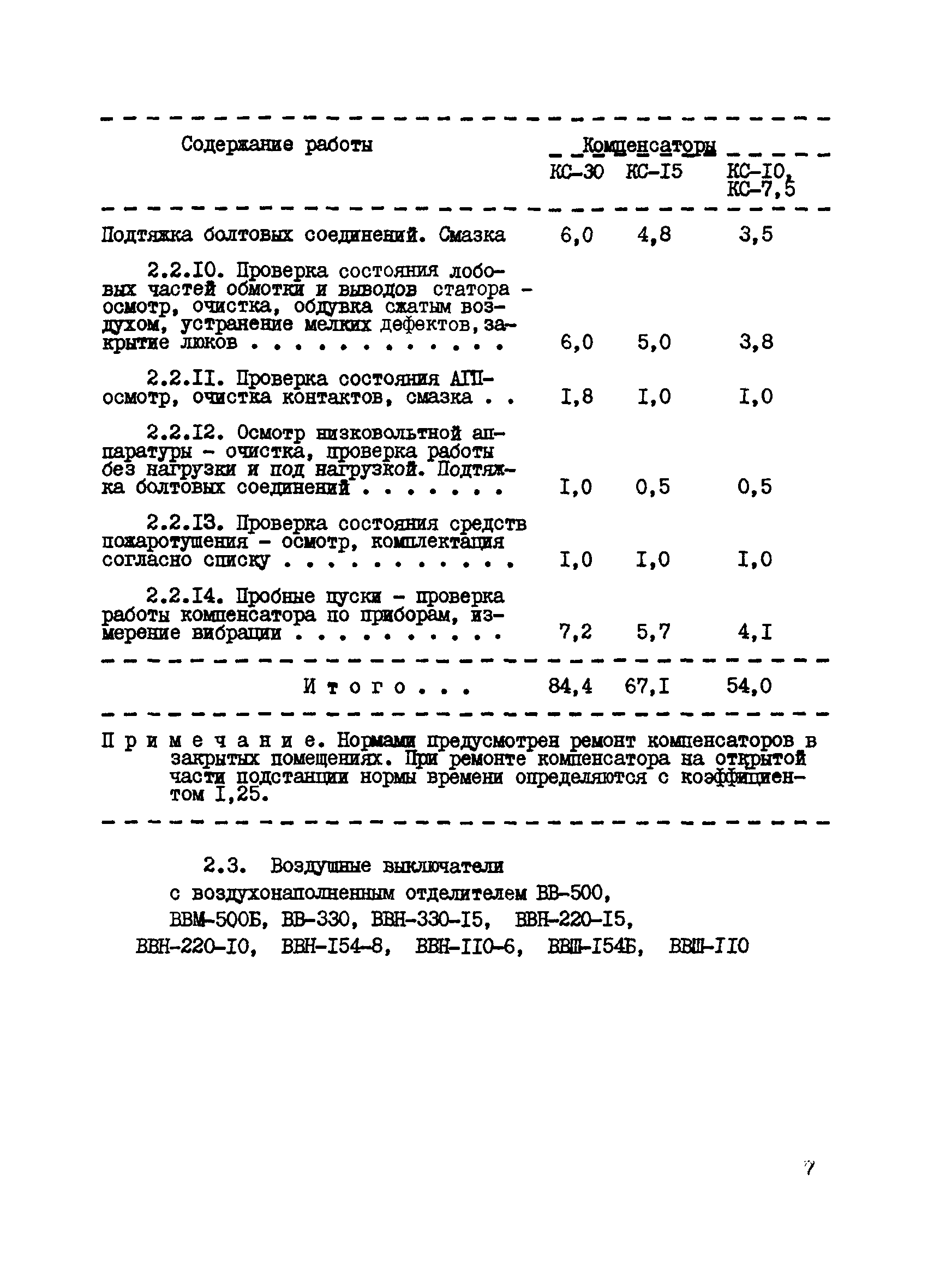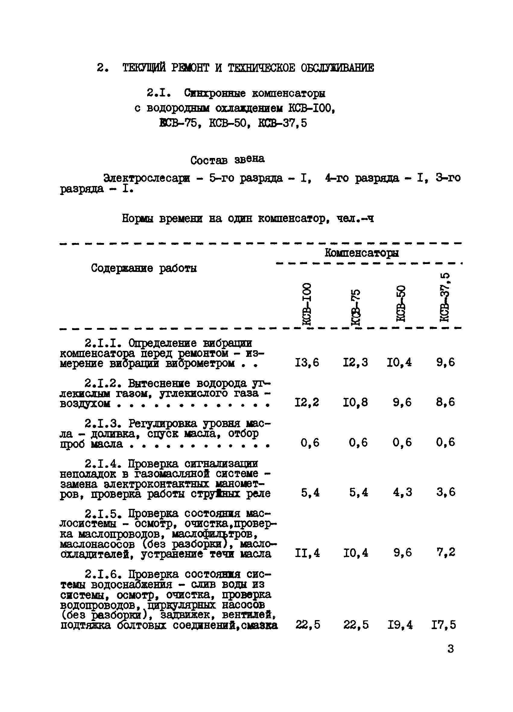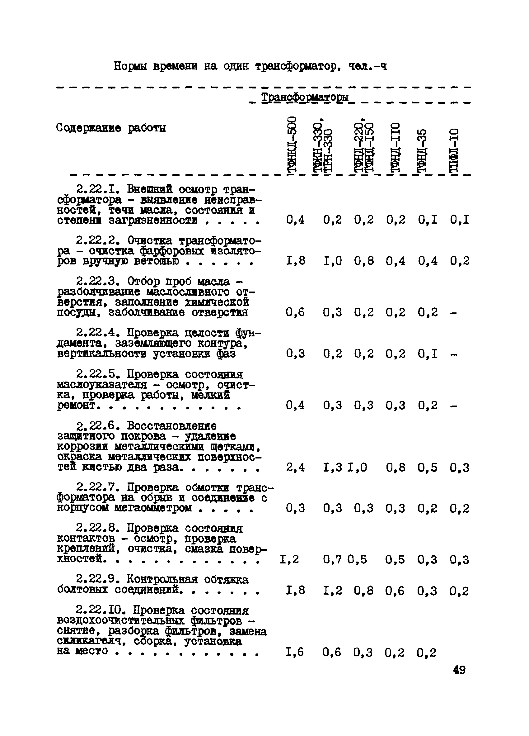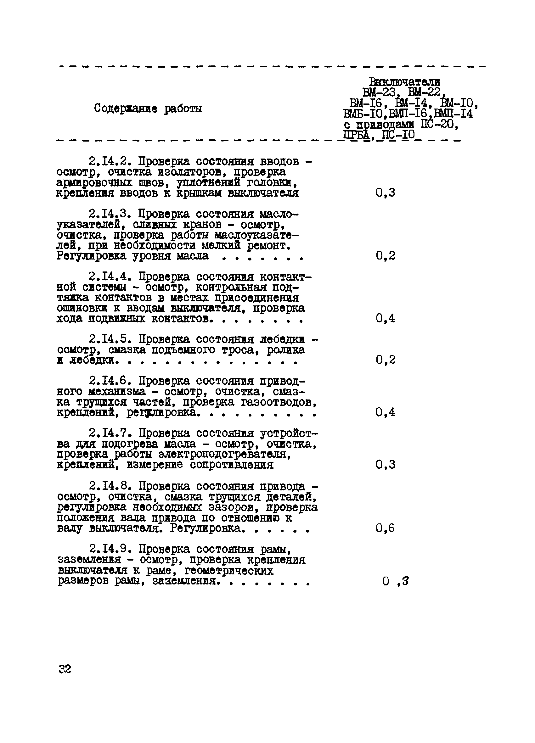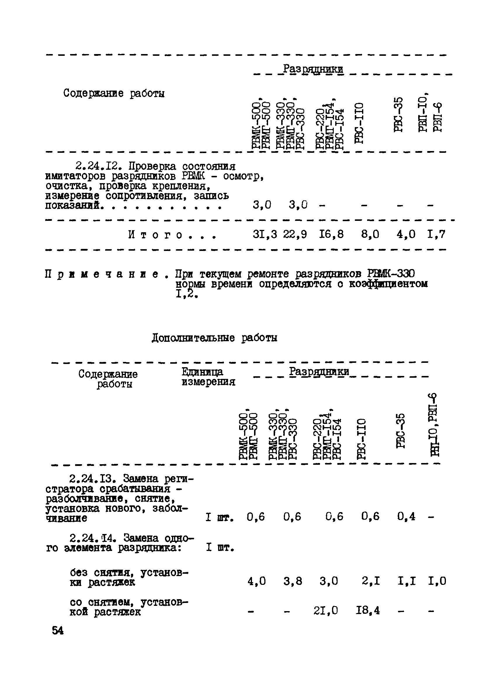 Нормы времени на капитальный, текущий ремонты и техническое обслуживание оборудования подстанций напряжением 35 - 500 кВ. Часть II. Текущий ремонт и техническое обслуживание| Статус: | справочные материалы, мп, тпр | | Название рус.: | Нормы времени на капитальный, текущий ремонты и техническое обслуживание оборудования подстанций напряжением 35 - 500 кВ. Часть II. Текущий ремонт и техническое обслуживание | | Дата добавления в базу: | 01.09.2013 | | Дата актуализации: | 01.01.2021 | | Область применения: | Нормы применяются при капитальном, ткущем ремонтах и техническом обслуживании оборудования подстанций напряжением 35 - 500 кВ. | | Оглавление: | 2. Текущий ремонт и техническое обслуживание 2.1 Синхронные компенсаторы с водородным охлаждением КСВ-100. КСВ-75, КСВ-50, КСВ-37,5 2.2 Синхронные компенсаторы с воздушным охлаждением КС-30, КС-15, КС-10, КС -7,5 2.3 Воздушные выключатели с воздухонаполненным отделителем ВВ-500, ВВ-500Б, ВВ-330, ВВН-330-15, ВВН-220-15, ВВН-220-10, ВВН-154-8, ВВН-110-6, ВВШ-154В, ВВШ-110 2.4 Воздушные выключатели ВВН-220/1000-7000, ВВН-220/2000-7000, ВВ-220, ВВН-154/800-4000, ВН-40001, ВВ-2503, ВВН-110/800-4000 2.5 Воздушные выключатели ВВБ-330, ВВД-330, ВВБ-220-12. ВВБ-220-У-15, ВВУ-110-40/2000 2.6 Воздушные выключатели ВВН-35, ВВН-35-2, ВВУ-35 2.7 Воздушные выключатели ВВ-15-6000. ВВ-15-5500, ВВ-15-600 2.8 Масляные выключатели МКП-220, У-220, У-220М, МКП-180, МКП-160, МКП-110, МКП-110М, У-110 2.9 Масляные выключатели ВМК-110, ВМК-35 2.10 Масляные выключатели МГ-110 2.11 Масляные выключатели МКП-35, ВМ-35, ВМД-35, С-35, ВТД-35 2.12 Масляные выключатели ВМП-35П, ВМПЭ-35, ВМП-10, ВМП-10П, ВМП-10К, ВМПП-10, ВМГ-133. ВМГ-10, ВММ-10, ВГ-10, МГГ-10 2.13 Электромагнитные выключатели ВЭМ-6-2000/40-125, ВЭМ-6-3200/40-125 2.14 Масляные выключатели ВМ-23. ВМ-22, ВМ-16, ВМ-14, ВМ-10, ВМБ-10, ВМП-16, ВМП-14 2.15 Разъединители РОНЗ-I-500, РОНЗ-I-330, РОНЗ-I-220 2.16 Разъединители РЛНД-500, РНД-330. РЛНД-220, РЛНД-150, РЛНД-110, РЛНД-35, РЛНД-100, РДНД-6 2.17 Разъединители РЛНЗ-220, РЛНЗ-150, РЛН-110, РЛН-35. РЛН-10, РЛН-6 2.18 Шинный разъединитель РВК-10/3000 одного присоединения 2.19 Отделители ОД-220М. ОД-150М, ОД-110М, ОДЗ-110М, ОД-35, ОДЗ-35 2.20 Короткозамыкатели КЗ-220М, КЗ-150М, КЗ-110М, КЗ-35 2.21 Трансформаторы напряжения НКФ-500, НКФ-330, НКФ-220, НКФ-150, НКФ-110, ЗНОМ-35, НОМ-10, НОМ-6 2.22 Трансформаторы тока ТФКНД-500, ТФКН-330, ТРН-330, ТФНД-220, ТФНД-150, ТФНД-110, ТФНД-35, ТПФЛ-10 2.23 Компрессоры ВШ-3/40, ВКУ-60/40 2.24 Разрядники РВМК-500, РВМГ-500, РВМК-330, РВМГ-330, РВМГ-154, РВС-330, РВС-220, РВС-154, РВС-110. РВС-35, РВП-10, РВП-6 2.25 Высокочастотные заградители ВЗ-2000-1,2, ВЗ-1000-0,6, ВЗ-600-0,25 2.26 Система шин ЗРУ-6-10 кВ 2.27 Система шин ОРУ-500, 330, 220, 150, 110, 25 кВ 2.28 Конденсаторы связи СМР-166/3-0,014, СМР-133/3-0.0186, СМР-110/3-0,0064, СМР-66/3-0,0044, СММ-20.3-0,107 2.29 Аккумуляторные батареи СК-16. СК-12, СК-10, СК-8, СК-6, СК-3, СК22, СК-1 2.30 Сухой реактор РБ-10 (600А) 2.31 Масляный токоограничивающий реактор РТДТ-35-1000-10 наружной установки 2.32 Ремонт двигателей -генераторов 2.33 Проверка состояния магнитных пускателей ПА-522 (на месте установки) 2.34 Осмотр и очистка кабельных каналов 2.35 Ремонт воздухосборников 2.36 Проверка состояния воздухопроводной сети 2.37. Восстановление надписей 2.38 Ремонт панели щита постоянного и переменного тока 2.39 Ремонт дистиллятора АА-1 2.40 Ремонт фильтр-пресса ФП-2/3000 2.41 Ремонт центрифуги СМ-1,5 (на месте установки) 2.42 Ремонт предохранителей ПК-6(7,5 А), ПК-10 (20А) 2.43 Ремонт стреляющего предохранителя ПСН-35 2.44 Проверка состояния противопожарного инвентаря 2.45 Замена баллонов с углекислым газом 2.46 Измерение распределения напряжения по элементам изоляторов ИШД-35 и ШТ-35 (штангой) 2.47 Ремонт переносных заземлений для устро