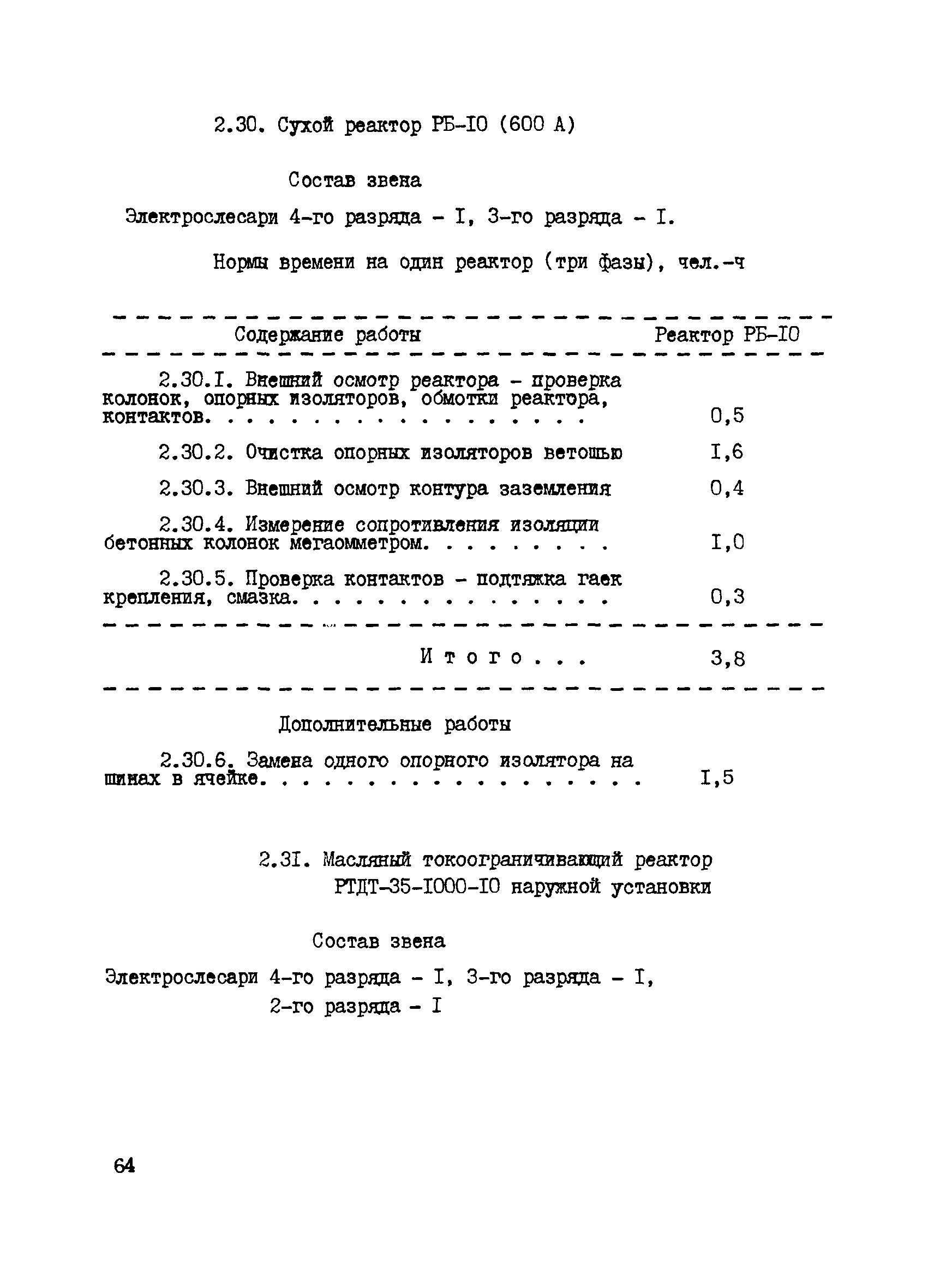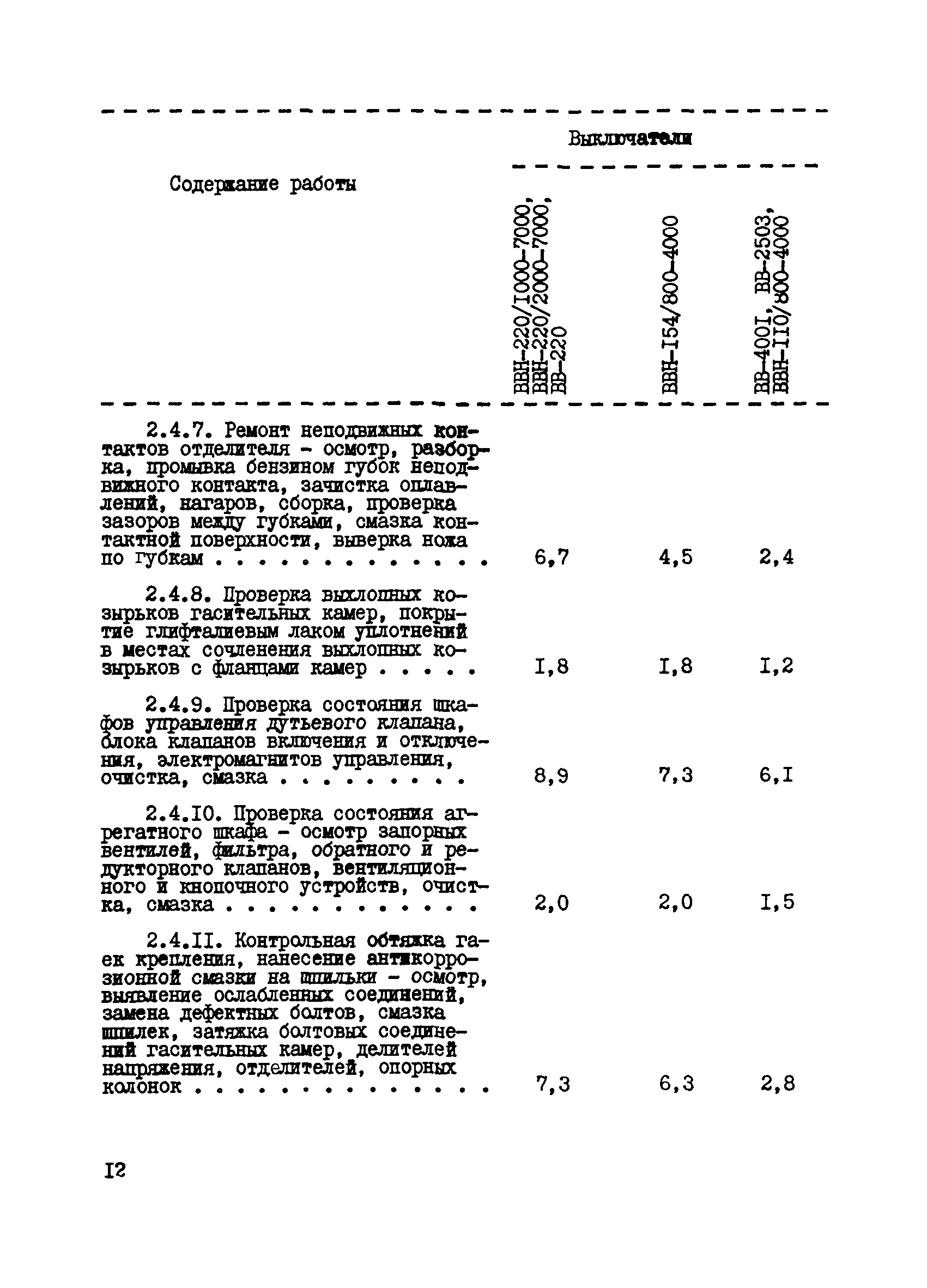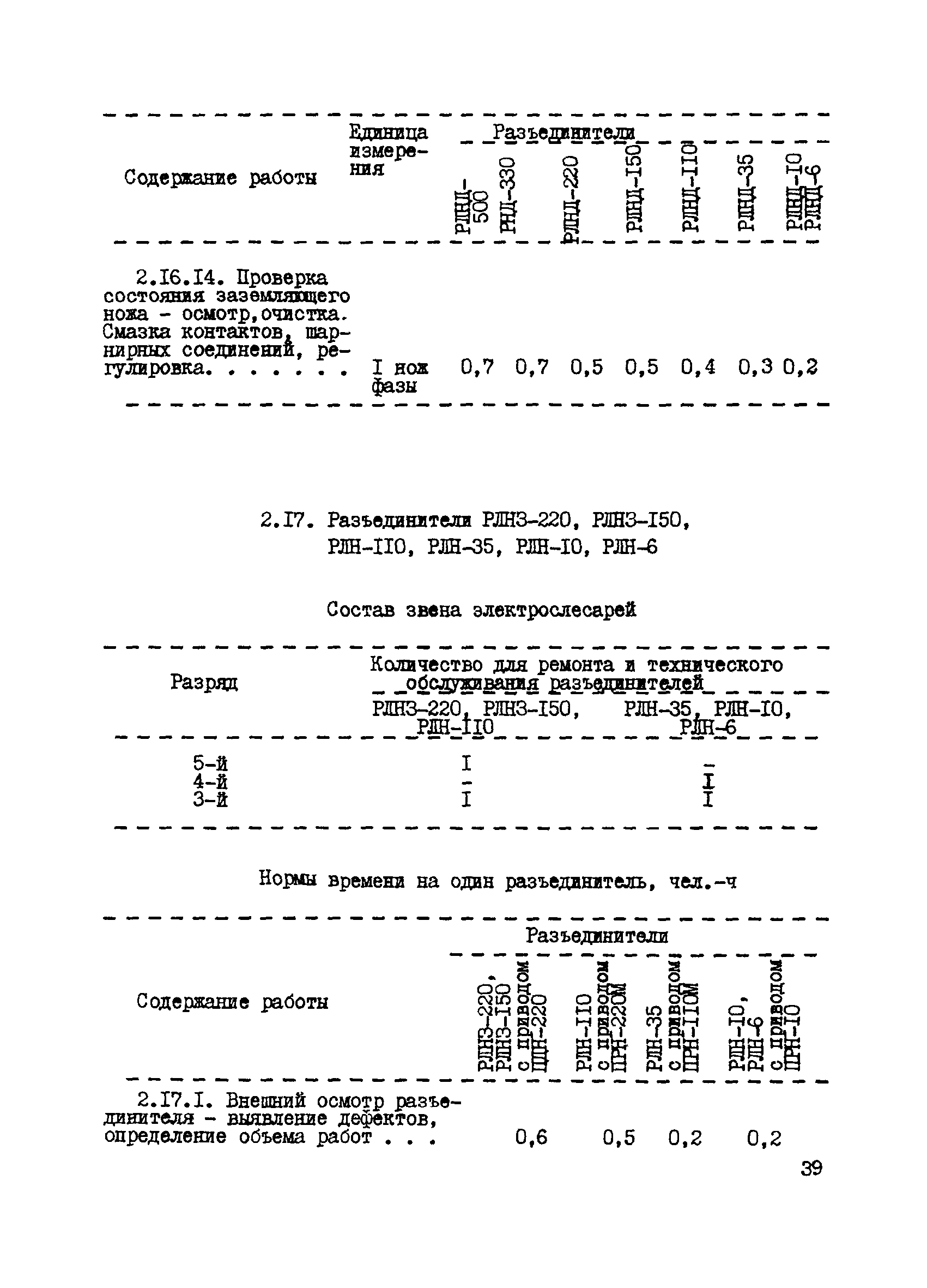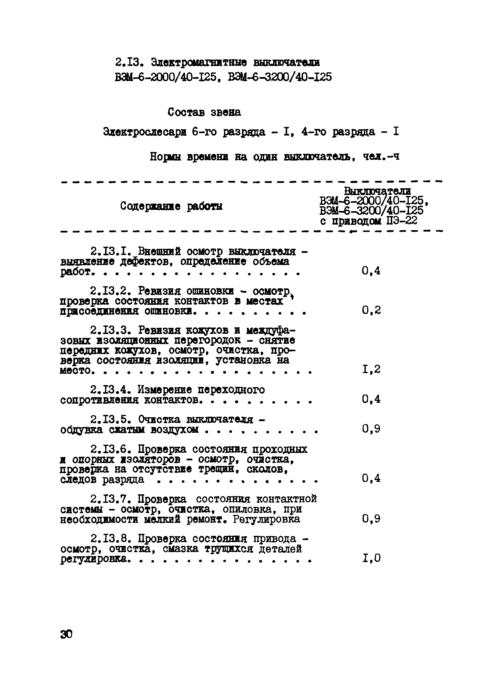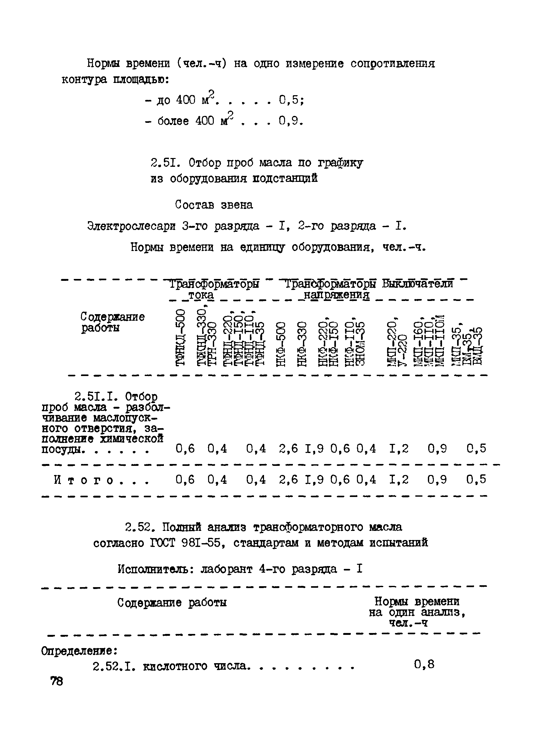 Нормы времени на капитальный, текущий ремонты и техническое обслуживание оборудования подстанций напряжением 35 - 500 кВ. Часть II. Текущий ремонт и техническое обслуживание| Статус: | справочные материалы, мп, тпр | | Название рус.: | Нормы времени на капитальный, текущий ремонты и техническое обслуживание оборудования подстанций напряжением 35 - 500 кВ. Часть II. Текущий ремонт и техническое обслуживание | | Дата добавления в базу: | 01.09.2013 | | Дата актуализации: | 01.01.2021 | | Область применения: | Нормы применяются при капитальном, ткущем ремонтах и техническом обслуживании оборудования подстанций напряжением 35 - 500 кВ. | | Оглавление: | 2. Текущий ремонт и техническое обслуживание 2.1 Синхронные компенсаторы с водородным охлаждением КСВ-100. КСВ-75, КСВ-50, КСВ-37,5 2.2 Синхронные компенсаторы с воздушным охлаждением КС-30, КС-15, КС-10, КС -7,5 2.3 Воздушные выключатели с воздухонаполненным отделителем ВВ-500, ВВ-500Б, ВВ-330, ВВН-330-15, ВВН-220-15, ВВН-220-10, ВВН-154-8, ВВН-110-6, ВВШ-154В, ВВШ-110 2.4 Воздушные выключатели ВВН-220/1000-7000, ВВН-220/2000-7000, ВВ-220, ВВН-154/800-4000, ВН-40001, ВВ-2503, ВВН-110/800-4000 2.5 Воздушные выключатели ВВБ-330, ВВД-330, ВВБ-220-12. ВВБ-220-У-15, ВВУ-110-40/2000 2.6 Воздушные выключатели ВВН-35, ВВН-35-2, ВВУ-35 2.7 Воздушные выключатели ВВ-15-6000. ВВ-15-5500, ВВ-15-600 2.8 Масляные выключатели МКП-220, У-220, У-220М, МКП-180, МКП-160, МКП-110, МКП-110М, У-110 2.9 Масляные выключатели ВМК-110, ВМК-35 2.10 Масляные выключатели МГ-110 2.11 Масляные выключатели МКП-35, ВМ-35, ВМД-35, С-35, ВТД-35 2.12 Масляные выключатели ВМП-35П, ВМПЭ-35, ВМП-10, ВМП-10П, ВМП-10К, ВМПП-10, ВМГ-133. ВМГ-10, ВММ-10, ВГ-10, МГГ-10 2.13 Электромагнитные выключатели ВЭМ-6-2000/40-125, ВЭМ-6-3200/40-125 2.14 Масляные выключатели ВМ-23. ВМ-22, ВМ-16, ВМ-14, ВМ-10, ВМБ-10, ВМП-16, ВМП-14 2.15 Разъединители РОНЗ-I-500, РОНЗ-I-330, РОНЗ-I-220 2.16 Разъединители РЛНД-500, РНД-330. РЛНД-220, РЛНД-150, РЛНД-110, РЛНД-35, РЛНД-100, РДНД-6 2.17 Разъединители РЛНЗ-220, РЛНЗ-150, РЛН-110, РЛН-35. РЛН-10, РЛН-6 2.18 Шинный разъединитель РВК-10/3000 одного присоединения 2.19 Отделители ОД-220М. ОД-150М, ОД-110М, ОДЗ-110М, ОД-35, ОДЗ-35 2.20 Короткозамыкатели КЗ-220М, КЗ-150М, КЗ-110М, КЗ-35 2.21 Трансформаторы напряжения НКФ-500, НКФ-330, НКФ-220, НКФ-150, НКФ-110, ЗНОМ-35, НОМ-10, НОМ-6 2.22 Трансформаторы тока ТФКНД-500, ТФКН-330, ТРН-330, ТФНД-220, ТФНД-150, ТФНД-110, ТФНД-35, ТПФЛ-10 2.23 Компрессоры ВШ-3/40, ВКУ-60/40 2.24 Разрядники РВМК-500, РВМГ-500, РВМК-330, РВМГ-330, РВМГ-154, РВС-330, РВС-220, РВС-154, РВС-110. РВС-35, РВП-10, РВП-6 2.25 Высокочастотные заградители ВЗ-2000-1,2, ВЗ-1000-0,6, ВЗ-600-0,25 2.26 Система шин ЗРУ-6-10 кВ 2.27 Система шин ОРУ-500, 330, 220, 150, 110, 25 кВ 2.28 Конденсаторы связи СМР-166/3-0,014, СМР-133/3-0.0186, СМР-110/3-0,0064, СМР-66/3-0,0044, СММ-20.3-0,107 2.29 Аккумуляторные батареи СК-16. СК-12, СК-10, СК-8, СК-6, СК-3, СК22, СК-1 2.30 Сухой реактор РБ-10 (600А) 2.31 Масляный токоограничивающий реактор РТДТ-35-1000-10 наружной установки 2.32 Ремонт двигателей -генераторов 2.33 Проверка состояния магнитных пускателей ПА-522 (на месте установки) 2.34 Осмотр и очистка кабельных каналов 2.35 Ремонт воздухосборников 2.36 Проверка состояния воздухопроводной сети 2.37. Восстановление надписей 2.38 Ремонт панели щита постоянного и переменного тока 2.39 Ремонт дистиллятора АА-1 2.40 Ремонт фильтр-пресса ФП-2/3000 2.41 Ремонт центрифуги СМ-1,5 (на месте установки) 2.42 Ремонт предохранителей ПК-6(7,5 А), ПК-10 (20А) 2.43 Ремонт стреляющего предохранителя ПСН-35 2.44 Проверка состояния противопожарного инвентаря 2.45 Замена баллонов с углекислым газом 2.46 Измерение распределения напряжения по элементам изоляторов ИШД-35 и ШТ-35 (штангой) 2.47 Ремонт переносных заземлений для устро