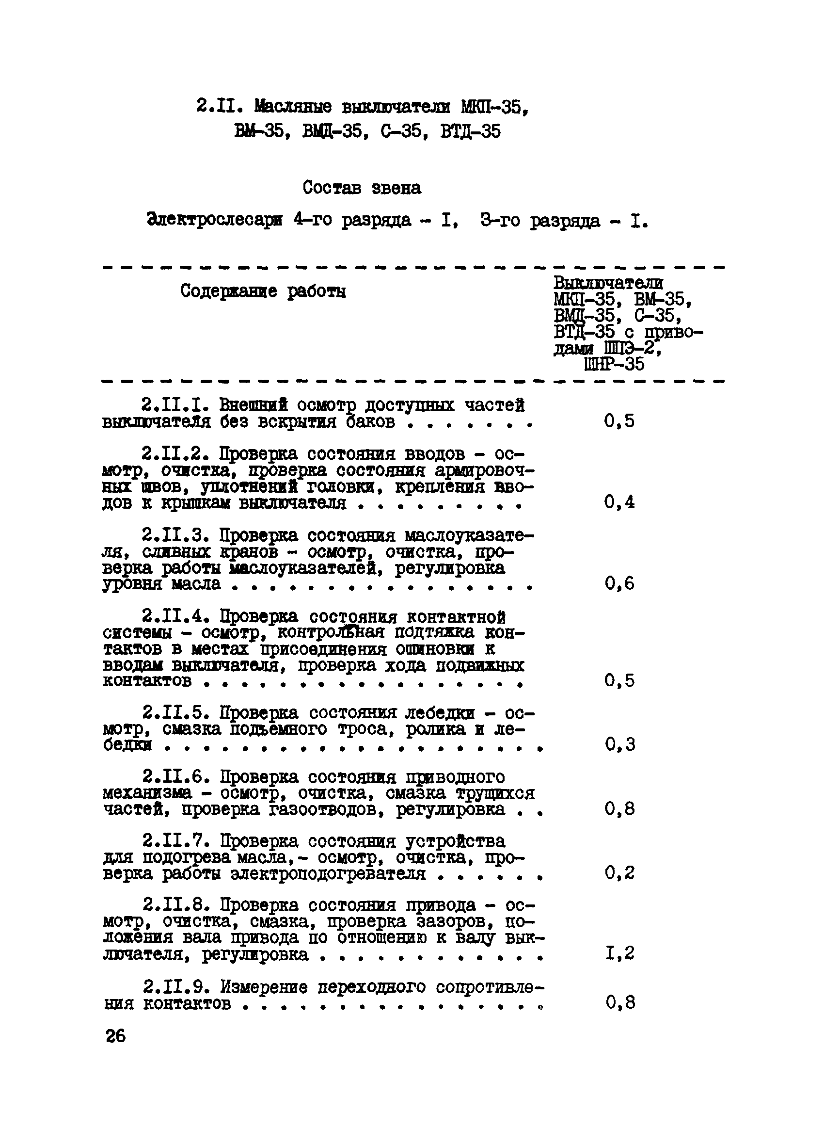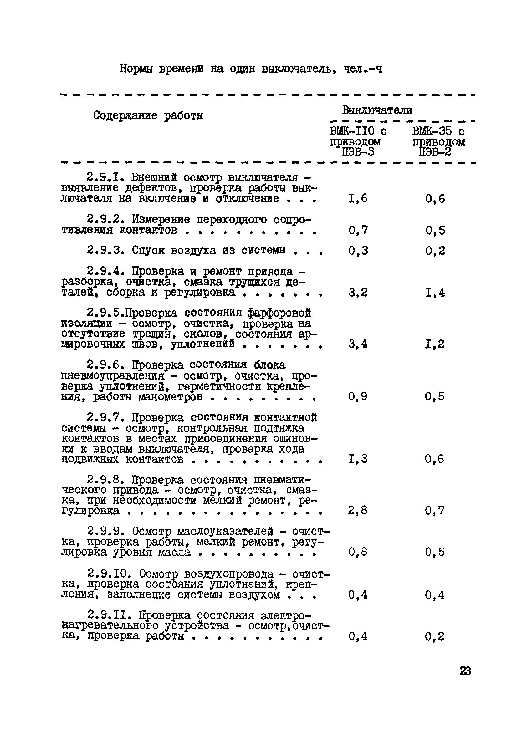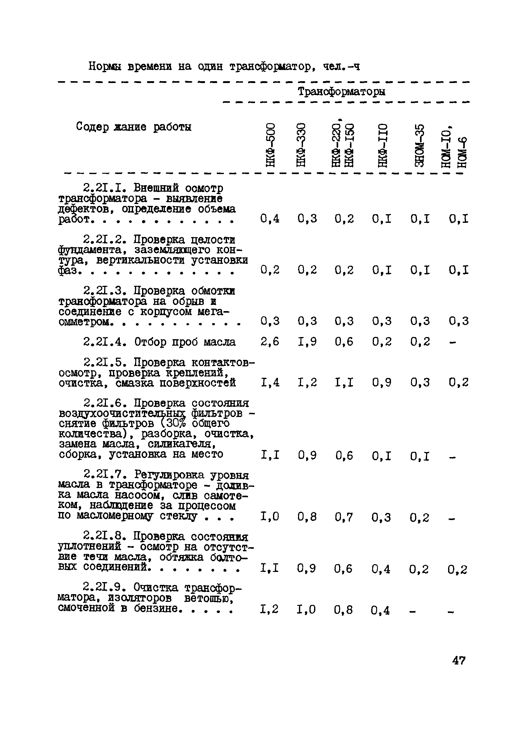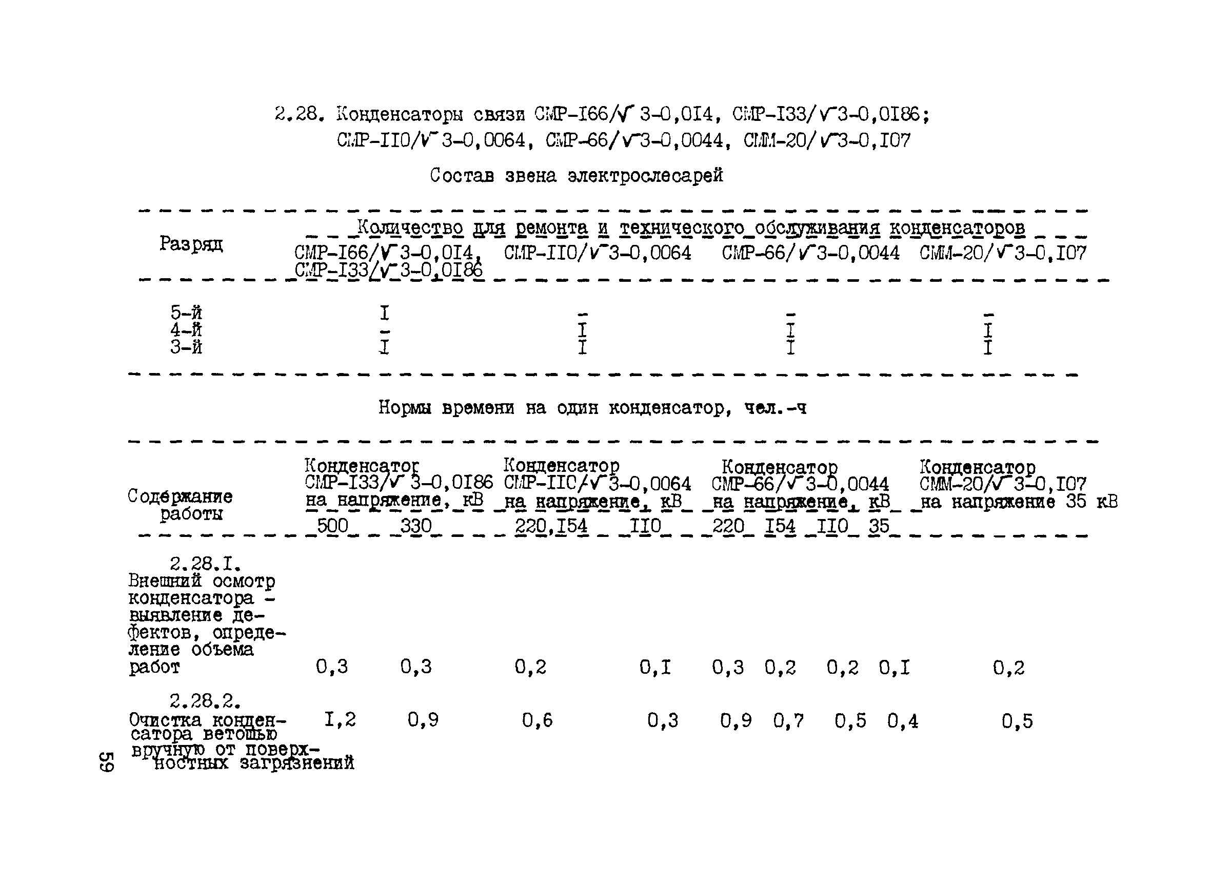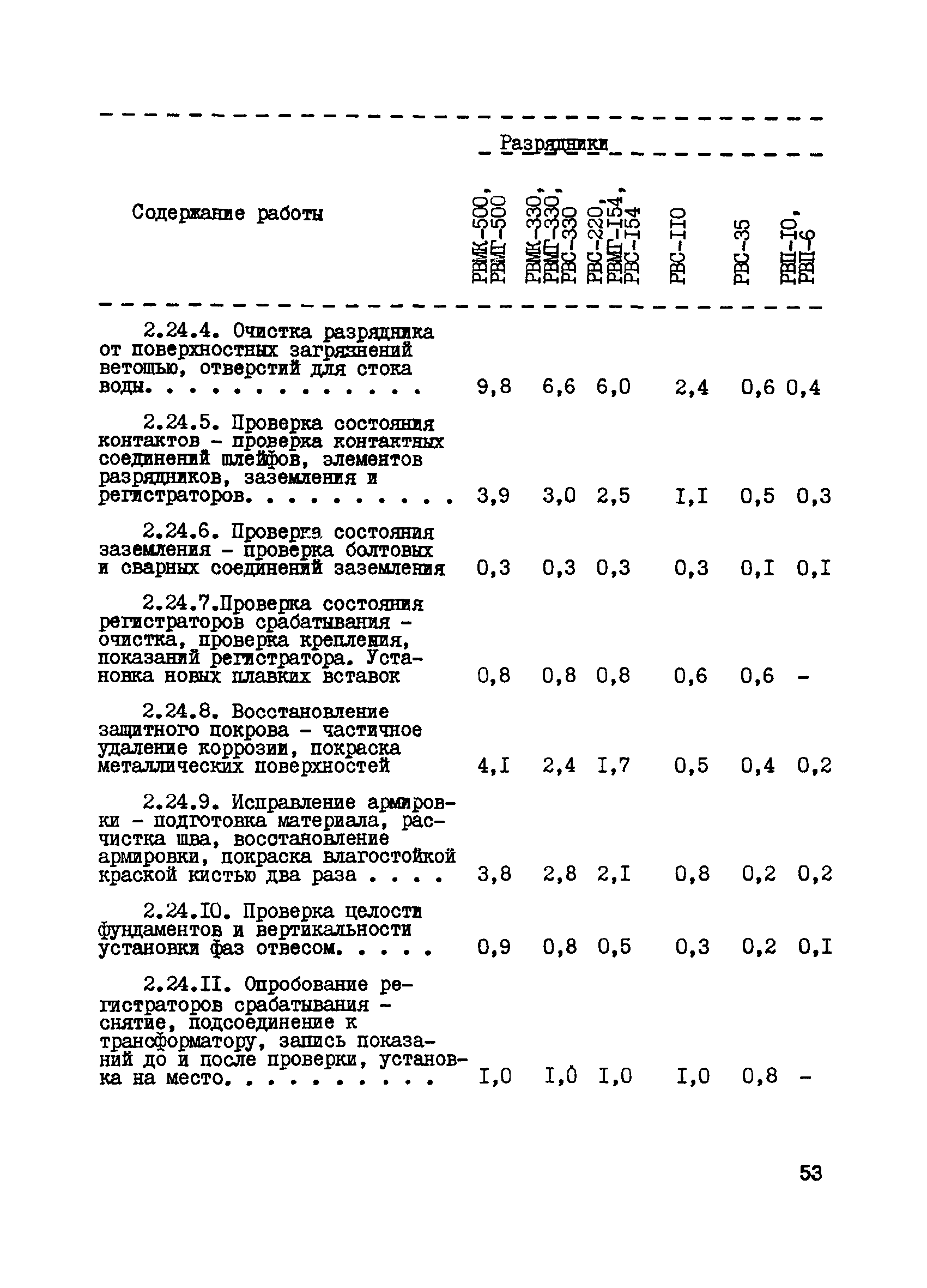 Нормы времени на капитальный, текущий ремонты и техническое обслуживание оборудования подстанций напряжением 35 - 500 кВ. Часть II. Текущий ремонт и техническое обслуживание| Статус: | справочные материалы, мп, тпр | | Название рус.: | Нормы времени на капитальный, текущий ремонты и техническое обслуживание оборудования подстанций напряжением 35 - 500 кВ. Часть II. Текущий ремонт и техническое обслуживание | | Дата добавления в базу: | 01.09.2013 | | Дата актуализации: | 01.01.2021 | | Область применения: | Нормы применяются при капитальном, ткущем ремонтах и техническом обслуживании оборудования подстанций напряжением 35 - 500 кВ. | | Оглавление: | 2. Текущий ремонт и техническое обслуживание 2.1 Синхронные компенсаторы с водородным охлаждением КСВ-100. КСВ-75, КСВ-50, КСВ-37,5 2.2 Синхронные компенсаторы с воздушным охлаждением КС-30, КС-15, КС-10, КС -7,5 2.3 Воздушные выключатели с воздухонаполненным отделителем ВВ-500, ВВ-500Б, ВВ-330, ВВН-330-15, ВВН-220-15, ВВН-220-10, ВВН-154-8, ВВН-110-6, ВВШ-154В, ВВШ-110 2.4 Воздушные выключатели ВВН-220/1000-7000, ВВН-220/2000-7000, ВВ-220, ВВН-154/800-4000, ВН-40001, ВВ-2503, ВВН-110/800-4000 2.5 Воздушные выключатели ВВБ-330, ВВД-330, ВВБ-220-12. ВВБ-220-У-15, ВВУ-110-40/2000 2.6 Воздушные выключатели ВВН-35, ВВН-35-2, ВВУ-35 2.7 Воздушные выключатели ВВ-15-6000. ВВ-15-5500, ВВ-15-600 2.8 Масляные выключатели МКП-220, У-220, У-220М, МКП-180, МКП-160, МКП-110, МКП-110М, У-110 2.9 Масляные выключатели ВМК-110, ВМК-35 2.10 Масляные выключатели МГ-110 2.11 Масляные выключатели МКП-35, ВМ-35, ВМД-35, С-35, ВТД-35 2.12 Масляные выключатели ВМП-35П, ВМПЭ-35, ВМП-10, ВМП-10П, ВМП-10К, ВМПП-10, ВМГ-133. ВМГ-10, ВММ-10, ВГ-10, МГГ-10 2.13 Электромагнитные выключатели ВЭМ-6-2000/40-125, ВЭМ-6-3200/40-125 2.14 Масляные выключатели ВМ-23. ВМ-22, ВМ-16, ВМ-14, ВМ-10, ВМБ-10, ВМП-16, ВМП-14 2.15 Разъединители РОНЗ-I-500, РОНЗ-I-330, РОНЗ-I-220 2.16 Разъединители РЛНД-500, РНД-330. РЛНД-220, РЛНД-150, РЛНД-110, РЛНД-35, РЛНД-100, РДНД-6 2.17 Разъединители РЛНЗ-220, РЛНЗ-150, РЛН-110, РЛН-35. РЛН-10, РЛН-6 2.18 Шинный разъединитель РВК-10/3000 одного присоединения 2.19 Отделители ОД-220М. ОД-150М, ОД-110М, ОДЗ-110М, ОД-35, ОДЗ-35 2.20 Короткозамыкатели КЗ-220М, КЗ-150М, КЗ-110М, КЗ-35 2.21 Трансформаторы напряжения НКФ-500, НКФ-330, НКФ-220, НКФ-150, НКФ-110, ЗНОМ-35, НОМ-10, НОМ-6 2.22 Трансформаторы тока ТФКНД-500, ТФКН-330, ТРН-330, ТФНД-220, ТФНД-150, ТФНД-110, ТФНД-35, ТПФЛ-10 2.23 Компрессоры ВШ-3/40, ВКУ-60/40 2.24 Разрядники РВМК-500, РВМГ-500, РВМК-330, РВМГ-330, РВМГ-154, РВС-330, РВС-220, РВС-154, РВС-110. РВС-35, РВП-10, РВП-6 2.25 Высокочастотные заградители ВЗ-2000-1,2, ВЗ-1000-0,6, ВЗ-600-0,25 2.26 Система шин ЗРУ-6-10 кВ 2.27 Система шин ОРУ-500, 330, 220, 150, 110, 25 кВ 2.28 Конденсаторы связи СМР-166/3-0,014, СМР-133/3-0.0186, СМР-110/3-0,0064, СМР-66/3-0,0044, СММ-20.3-0,107 2.29 Аккумуляторные батареи СК-16. СК-12, СК-10, СК-8, СК-6, СК-3, СК22, СК-1 2.30 Сухой реактор РБ-10 (600А) 2.31 Масляный токоограничивающий реактор РТДТ-35-1000-10 наружной установки 2.32 Ремонт двигателей -генераторов 2.33 Проверка состояния магнитных пускателей ПА-522 (на месте установки) 2.34 Осмотр и очистка кабельных каналов 2.35 Ремонт воздухосборников 2.36 Проверка состояния воздухопроводной сети 2.37. Восстановление надписей 2.38 Ремонт панели щита постоянного и переменного тока 2.39 Ремонт дистиллятора АА-1 2.40 Ремонт фильтр-пресса ФП-2/3000 2.41 Ремонт центрифуги СМ-1,5 (на месте установки) 2.42 Ремонт предохранителей ПК-6(7,5 А), ПК-10 (20А) 2.43 Ремонт стреляющего предохранителя ПСН-35 2.44 Проверка состояния противопожарного инвентаря 2.45 Замена баллонов с углекислым газом 2.46 Измерение распределения напряжения по элементам изоляторов ИШД-35 и ШТ-35 (штангой) 2.47 Ремонт переносных заземлений для устро