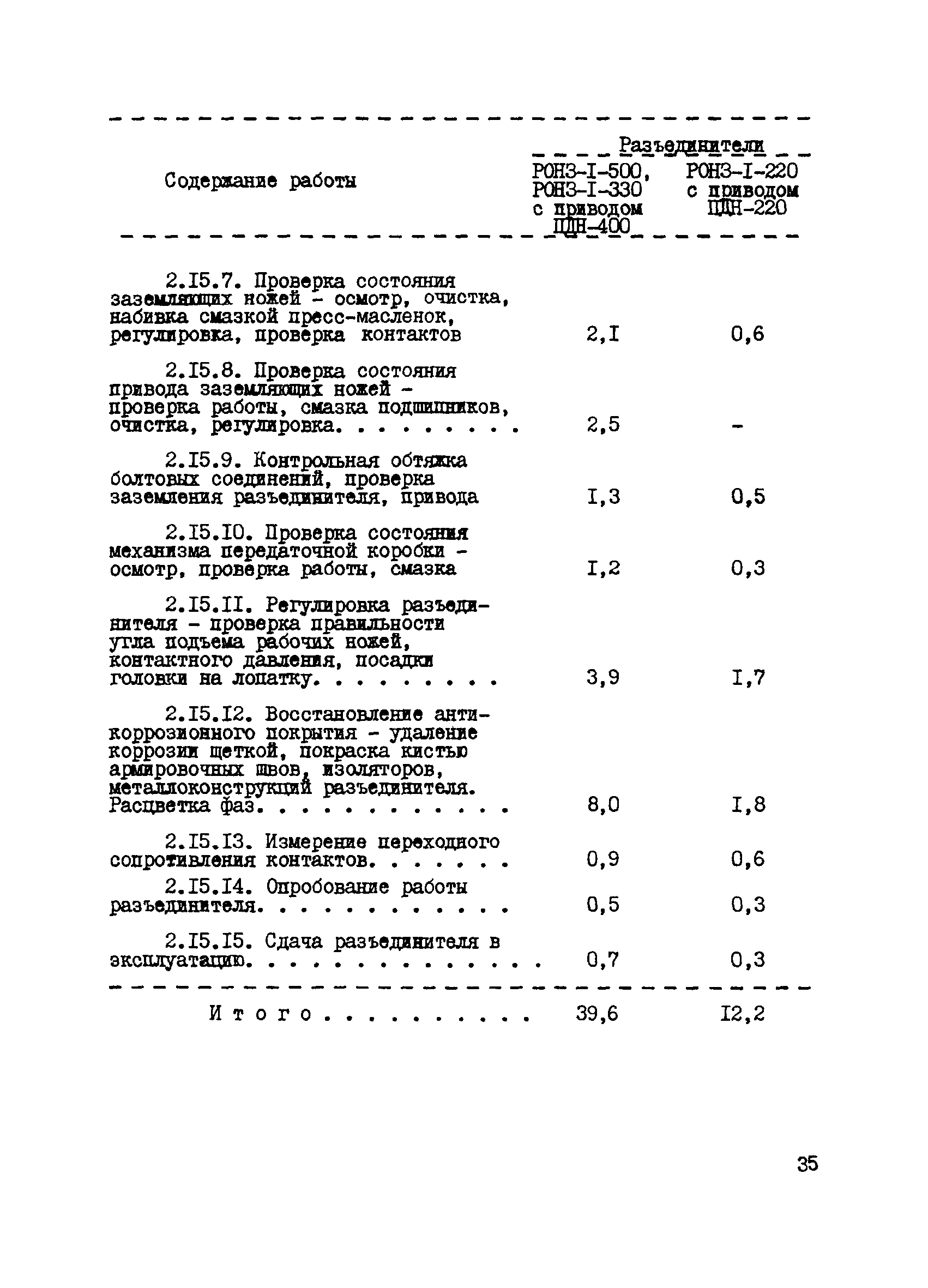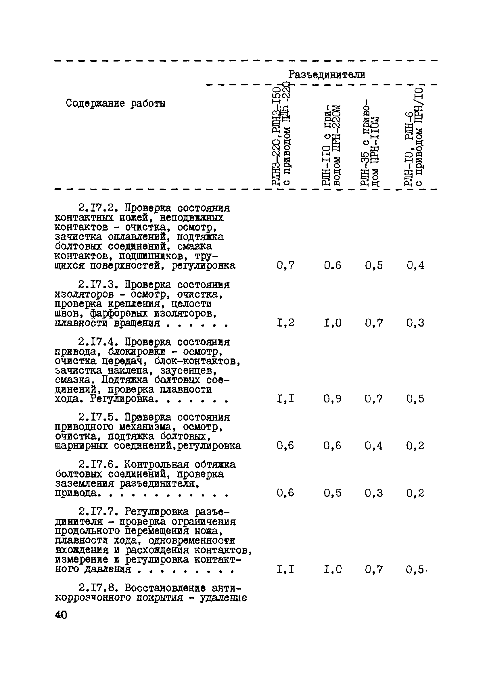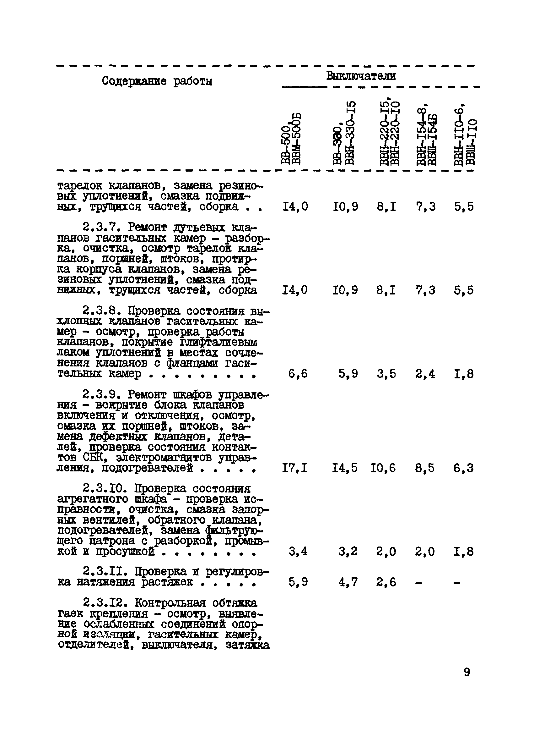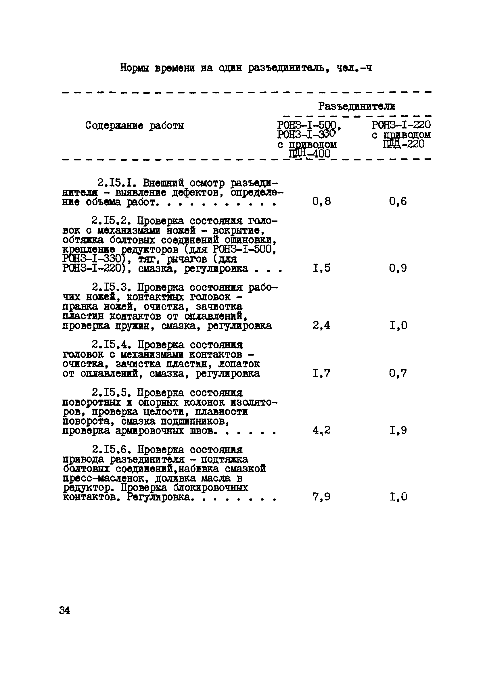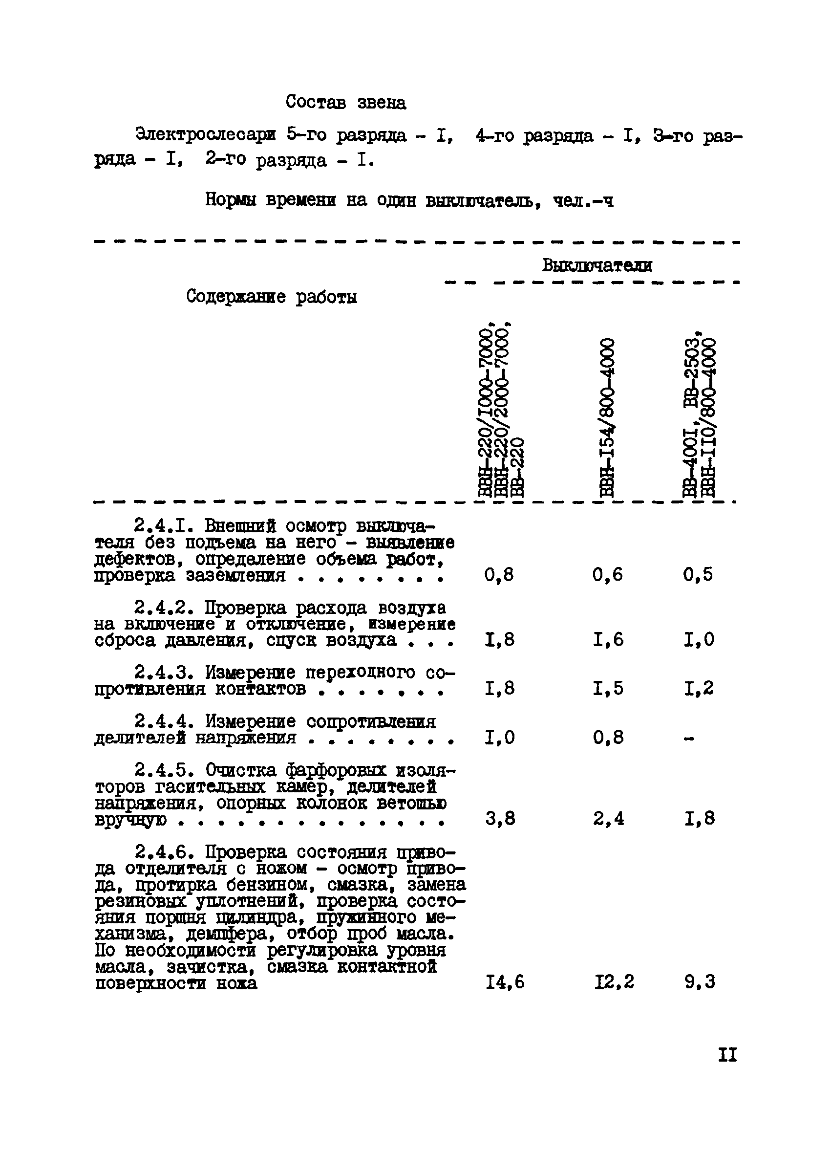 Нормы времени на капитальный, текущий ремонты и техническое обслуживание оборудования подстанций напряжением 35 - 500 кВ. Часть II. Текущий ремонт и техническое обслуживание| Статус: | справочные материалы, мп, тпр | | Название рус.: | Нормы времени на капитальный, текущий ремонты и техническое обслуживание оборудования подстанций напряжением 35 - 500 кВ. Часть II. Текущий ремонт и техническое обслуживание | | Дата добавления в базу: | 01.09.2013 | | Дата актуализации: | 01.01.2021 | | Область применения: | Нормы применяются при капитальном, ткущем ремонтах и техническом обслуживании оборудования подстанций напряжением 35 - 500 кВ. | | Оглавление: | 2. Текущий ремонт и техническое обслуживание 2.1 Синхронные компенсаторы с водородным охлаждением КСВ-100. КСВ-75, КСВ-50, КСВ-37,5 2.2 Синхронные компенсаторы с воздушным охлаждением КС-30, КС-15, КС-10, КС -7,5 2.3 Воздушные выключатели с воздухонаполненным отделителем ВВ-500, ВВ-500Б, ВВ-330, ВВН-330-15, ВВН-220-15, ВВН-220-10, ВВН-154-8, ВВН-110-6, ВВШ-154В, ВВШ-110 2.4 Воздушные выключатели ВВН-220/1000-7000, ВВН-220/2000-7000, ВВ-220, ВВН-154/800-4000, ВН-40001, ВВ-2503, ВВН-110/800-4000 2.5 Воздушные выключатели ВВБ-330, ВВД-330, ВВБ-220-12. ВВБ-220-У-15, ВВУ-110-40/2000 2.6 Воздушные выключатели ВВН-35, ВВН-35-2, ВВУ-35 2.7 Воздушные выключатели ВВ-15-6000. ВВ-15-5500, ВВ-15-600 2.8 Масляные выключатели МКП-220, У-220, У-220М, МКП-180, МКП-160, МКП-110, МКП-110М, У-110 2.9 Масляные выключатели ВМК-110, ВМК-35 2.10 Масляные выключатели МГ-110 2.11 Масляные выключатели МКП-35, ВМ-35, ВМД-35, С-35, ВТД-35 2.12 Масляные выключатели ВМП-35П, ВМПЭ-35, ВМП-10, ВМП-10П, ВМП-10К, ВМПП-10, ВМГ-133. ВМГ-10, ВММ-10, ВГ-10, МГГ-10 2.13 Электромагнитные выключатели ВЭМ-6-2000/40-125, ВЭМ-6-3200/40-125 2.14 Масляные выключатели ВМ-23. ВМ-22, ВМ-16, ВМ-14, ВМ-10, ВМБ-10, ВМП-16, ВМП-14 2.15 Разъединители РОНЗ-I-500, РОНЗ-I-330, РОНЗ-I-220 2.16 Разъединители РЛНД-500, РНД-330. РЛНД-220, РЛНД-150, РЛНД-110, РЛНД-35, РЛНД-100, РДНД-6 2.17 Разъединители РЛНЗ-220, РЛНЗ-150, РЛН-110, РЛН-35. РЛН-10, РЛН-6 2.18 Шинный разъединитель РВК-10/3000 одного присоединения 2.19 Отделители ОД-220М. ОД-150М, ОД-110М, ОДЗ-110М, ОД-35, ОДЗ-35 2.20 Короткозамыкатели КЗ-220М, КЗ-150М, КЗ-110М, КЗ-35 2.21 Трансформаторы напряжения НКФ-500, НКФ-330, НКФ-220, НКФ-150, НКФ-110, ЗНОМ-35, НОМ-10, НОМ-6 2.22 Трансформаторы тока ТФКНД-500, ТФКН-330, ТРН-330, ТФНД-220, ТФНД-150, ТФНД-110, ТФНД-35, ТПФЛ-10 2.23 Компрессоры ВШ-3/40, ВКУ-60/40 2.24 Разрядники РВМК-500, РВМГ-500, РВМК-330, РВМГ-330, РВМГ-154, РВС-330, РВС-220, РВС-154, РВС-110. РВС-35, РВП-10, РВП-6 2.25 Высокочастотные заградители ВЗ-2000-1,2, ВЗ-1000-0,6, ВЗ-600-0,25 2.26 Система шин ЗРУ-6-10 кВ 2.27 Система шин ОРУ-500, 330, 220, 150, 110, 25 кВ 2.28 Конденсаторы связи СМР-166/3-0,014, СМР-133/3-0.0186, СМР-110/3-0,0064, СМР-66/3-0,0044, СММ-20.3-0,107 2.29 Аккумуляторные батареи СК-16. СК-12, СК-10, СК-8, СК-6, СК-3, СК22, СК-1 2.30 Сухой реактор РБ-10 (600А) 2.31 Масляный токоограничивающий реактор РТДТ-35-1000-10 наружной установки 2.32 Ремонт двигателей -генераторов 2.33 Проверка состояния магнитных пускателей ПА-522 (на месте установки) 2.34 Осмотр и очистка кабельных каналов 2.35 Ремонт воздухосборников 2.36 Проверка состояния воздухопроводной сети 2.37. Восстановление надписей 2.38 Ремонт панели щита постоянного и переменного тока 2.39 Ремонт дистиллятора АА-1 2.40 Ремонт фильтр-пресса ФП-2/3000 2.41 Ремонт центрифуги СМ-1,5 (на месте установки) 2.42 Ремонт предохранителей ПК-6(7,5 А), ПК-10 (20А) 2.43 Ремонт стреляющего предохранителя ПСН-35 2.44 Проверка состояния противопожарного инвентаря 2.45 Замена баллонов с углекислым газом 2.46 Измерение распределения напряжения по элементам изоляторов ИШД-35 и ШТ-35 (штангой) 2.47 Ремонт переносных заземлений для устро