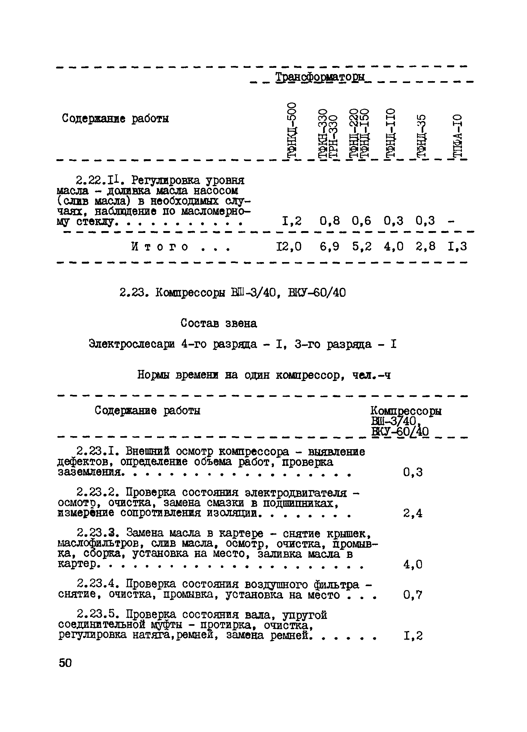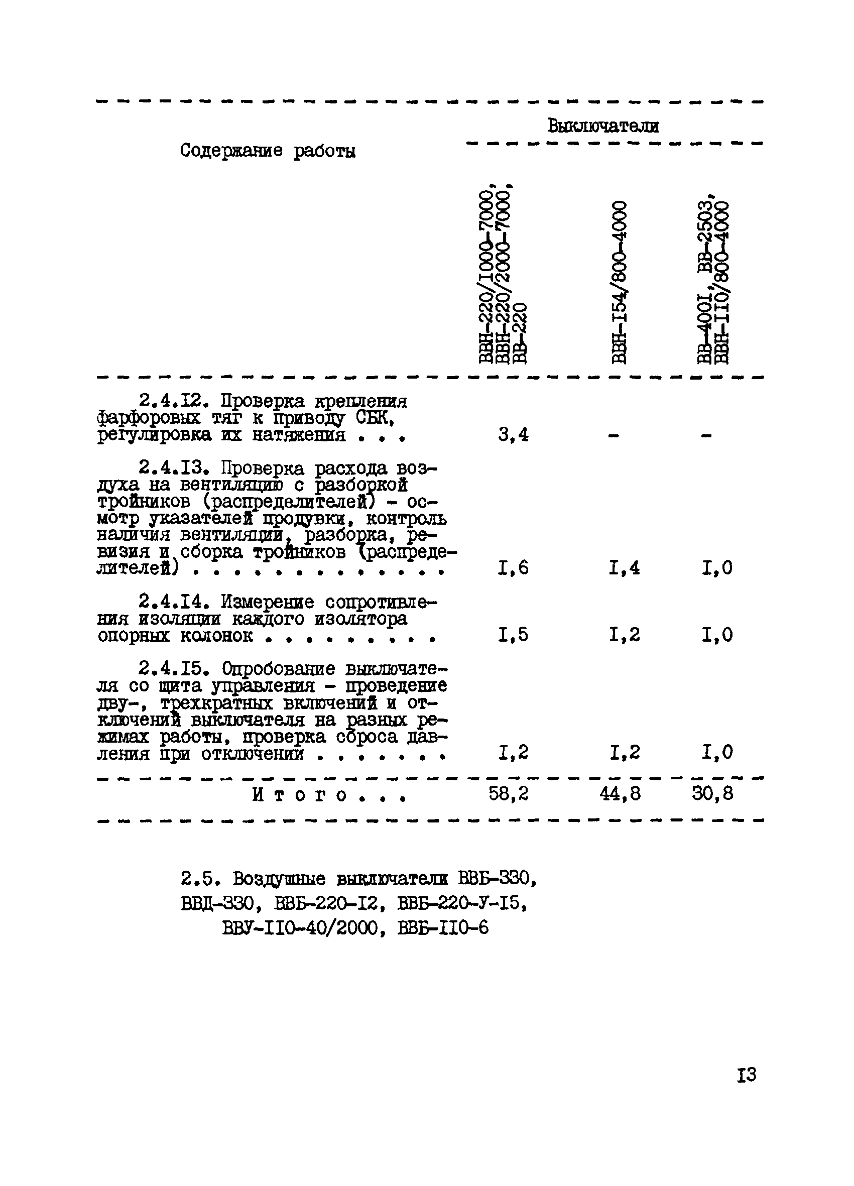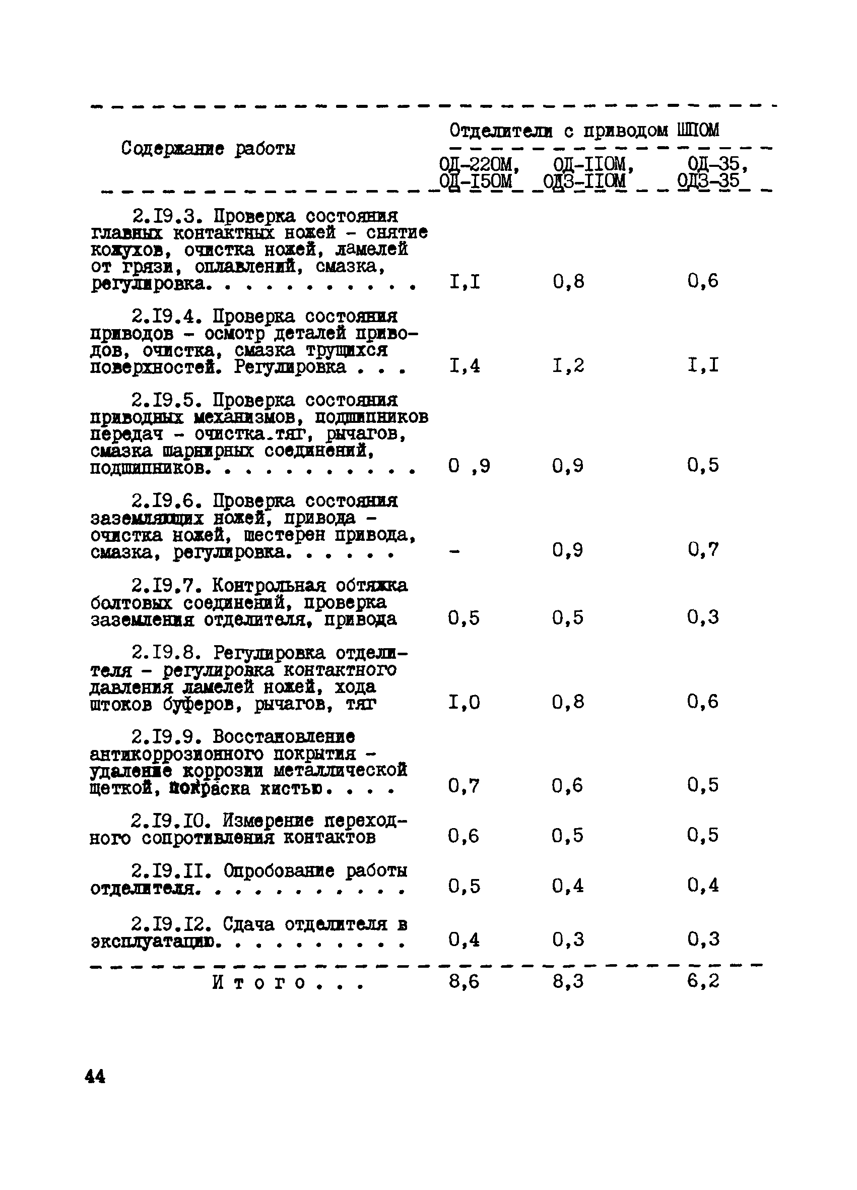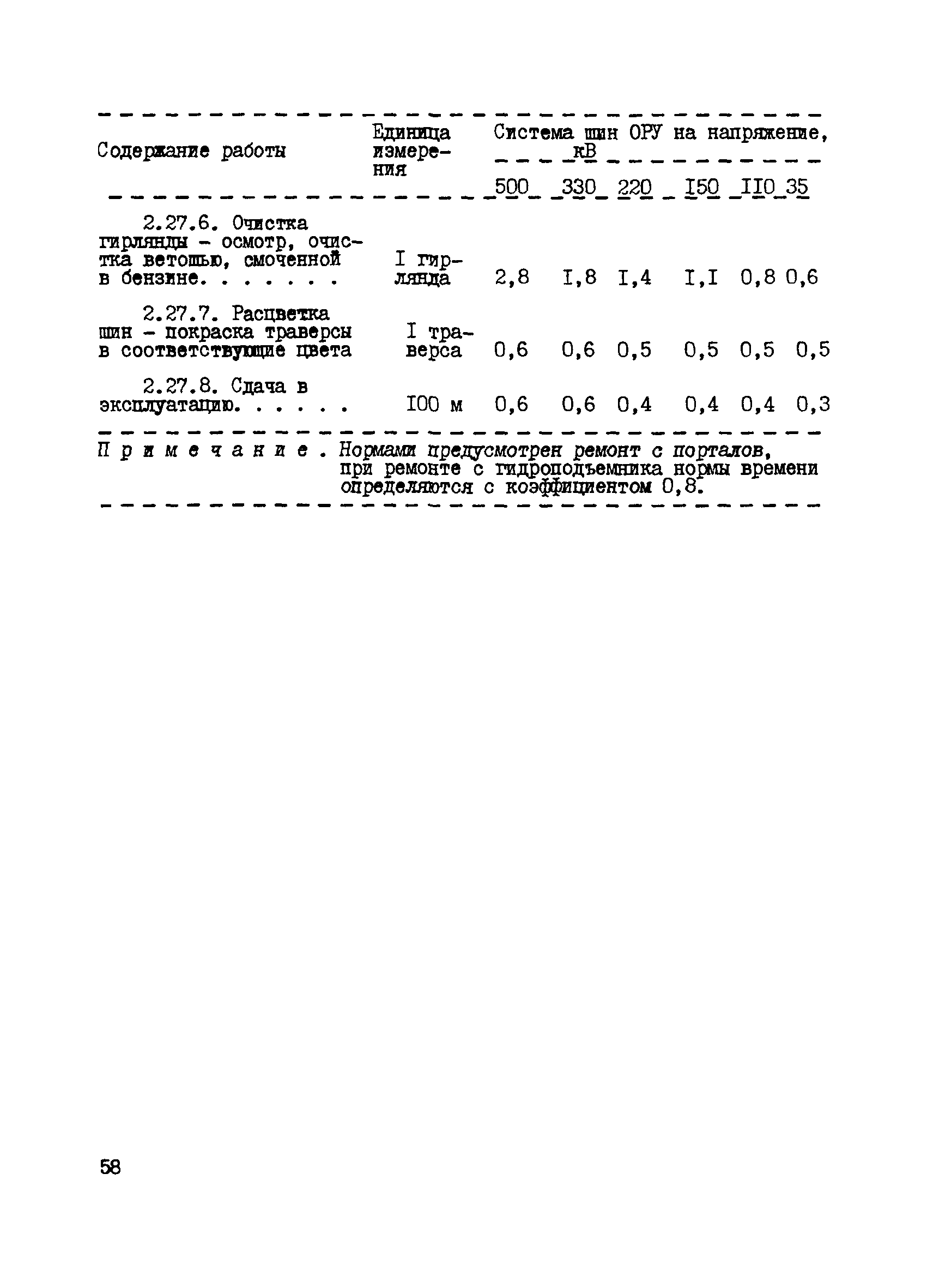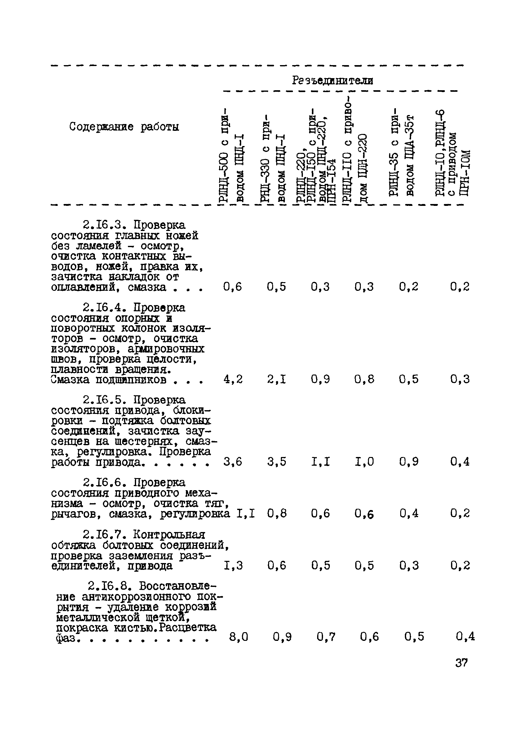 Нормы времени на капитальный, текущий ремонты и техническое обслуживание оборудования подстанций напряжением 35 - 500 кВ. Часть II. Текущий ремонт и техническое обслуживание| Статус: | справочные материалы, мп, тпр | | Название рус.: | Нормы времени на капитальный, текущий ремонты и техническое обслуживание оборудования подстанций напряжением 35 - 500 кВ. Часть II. Текущий ремонт и техническое обслуживание | | Дата добавления в базу: | 01.09.2013 | | Дата актуализации: | 01.01.2021 | | Область применения: | Нормы применяются при капитальном, ткущем ремонтах и техническом обслуживании оборудования подстанций напряжением 35 - 500 кВ. | | Оглавление: | 2. Текущий ремонт и техническое обслуживание 2.1 Синхронные компенсаторы с водородным охлаждением КСВ-100. КСВ-75, КСВ-50, КСВ-37,5 2.2 Синхронные компенсаторы с воздушным охлаждением КС-30, КС-15, КС-10, КС -7,5 2.3 Воздушные выключатели с воздухонаполненным отделителем ВВ-500, ВВ-500Б, ВВ-330, ВВН-330-15, ВВН-220-15, ВВН-220-10, ВВН-154-8, ВВН-110-6, ВВШ-154В, ВВШ-110 2.4 Воздушные выключатели ВВН-220/1000-7000, ВВН-220/2000-7000, ВВ-220, ВВН-154/800-4000, ВН-40001, ВВ-2503, ВВН-110/800-4000 2.5 Воздушные выключатели ВВБ-330, ВВД-330, ВВБ-220-12. ВВБ-220-У-15, ВВУ-110-40/2000 2.6 Воздушные выключатели ВВН-35, ВВН-35-2, ВВУ-35 2.7 Воздушные выключатели ВВ-15-6000. ВВ-15-5500, ВВ-15-600 2.8 Масляные выключатели МКП-220, У-220, У-220М, МКП-180, МКП-160, МКП-110, МКП-110М, У-110 2.9 Масляные выключатели ВМК-110, ВМК-35 2.10 Масляные выключатели МГ-110 2.11 Масляные выключатели МКП-35, ВМ-35, ВМД-35, С-35, ВТД-35 2.12 Масляные выключатели ВМП-35П, ВМПЭ-35, ВМП-10, ВМП-10П, ВМП-10К, ВМПП-10, ВМГ-133. ВМГ-10, ВММ-10, ВГ-10, МГГ-10 2.13 Электромагнитные выключатели ВЭМ-6-2000/40-125, ВЭМ-6-3200/40-125 2.14 Масляные выключатели ВМ-23. ВМ-22, ВМ-16, ВМ-14, ВМ-10, ВМБ-10, ВМП-16, ВМП-14 2.15 Разъединители РОНЗ-I-500, РОНЗ-I-330, РОНЗ-I-220 2.16 Разъединители РЛНД-500, РНД-330. РЛНД-220, РЛНД-150, РЛНД-110, РЛНД-35, РЛНД-100, РДНД-6 2.17 Разъединители РЛНЗ-220, РЛНЗ-150, РЛН-110, РЛН-35. РЛН-10, РЛН-6 2.18 Шинный разъединитель РВК-10/3000 одного присоединения 2.19 Отделители ОД-220М. ОД-150М, ОД-110М, ОДЗ-110М, ОД-35, ОДЗ-35 2.20 Короткозамыкатели КЗ-220М, КЗ-150М, КЗ-110М, КЗ-35 2.21 Трансформаторы напряжения НКФ-500, НКФ-330, НКФ-220, НКФ-150, НКФ-110, ЗНОМ-35, НОМ-10, НОМ-6 2.22 Трансформаторы тока ТФКНД-500, ТФКН-330, ТРН-330, ТФНД-220, ТФНД-150, ТФНД-110, ТФНД-35, ТПФЛ-10 2.23 Компрессоры ВШ-3/40, ВКУ-60/40 2.24 Разрядники РВМК-500, РВМГ-500, РВМК-330, РВМГ-330, РВМГ-154, РВС-330, РВС-220, РВС-154, РВС-110. РВС-35, РВП-10, РВП-6 2.25 Высокочастотные заградители ВЗ-2000-1,2, ВЗ-1000-0,6, ВЗ-600-0,25 2.26 Система шин ЗРУ-6-10 кВ 2.27 Система шин ОРУ-500, 330, 220, 150, 110, 25 кВ 2.28 Конденсаторы связи СМР-166/3-0,014, СМР-133/3-0.0186, СМР-110/3-0,0064, СМР-66/3-0,0044, СММ-20.3-0,107 2.29 Аккумуляторные батареи СК-16. СК-12, СК-10, СК-8, СК-6, СК-3, СК22, СК-1 2.30 Сухой реактор РБ-10 (600А) 2.31 Масляный токоограничивающий реактор РТДТ-35-1000-10 наружной установки 2.32 Ремонт двигателей -генераторов 2.33 Проверка состояния магнитных пускателей ПА-522 (на месте установки) 2.34 Осмотр и очистка кабельных каналов 2.35 Ремонт воздухосборников 2.36 Проверка состояния воздухопроводной сети 2.37. Восстановление надписей 2.38 Ремонт панели щита постоянного и переменного тока 2.39 Ремонт дистиллятора АА-1 2.40 Ремонт фильтр-пресса ФП-2/3000 2.41 Ремонт центрифуги СМ-1,5 (на месте установки) 2.42 Ремонт предохранителей ПК-6(7,5 А), ПК-10 (20А) 2.43 Ремонт стреляющего предохранителя ПСН-35 2.44 Проверка состояния противопожарного инвентаря 2.45 Замена баллонов с углекислым газом 2.46 Измерение распределения напряжения по элементам изоляторов ИШД-35 и ШТ-35 (штангой) 2.47 Ремонт переносных заземлений для устро