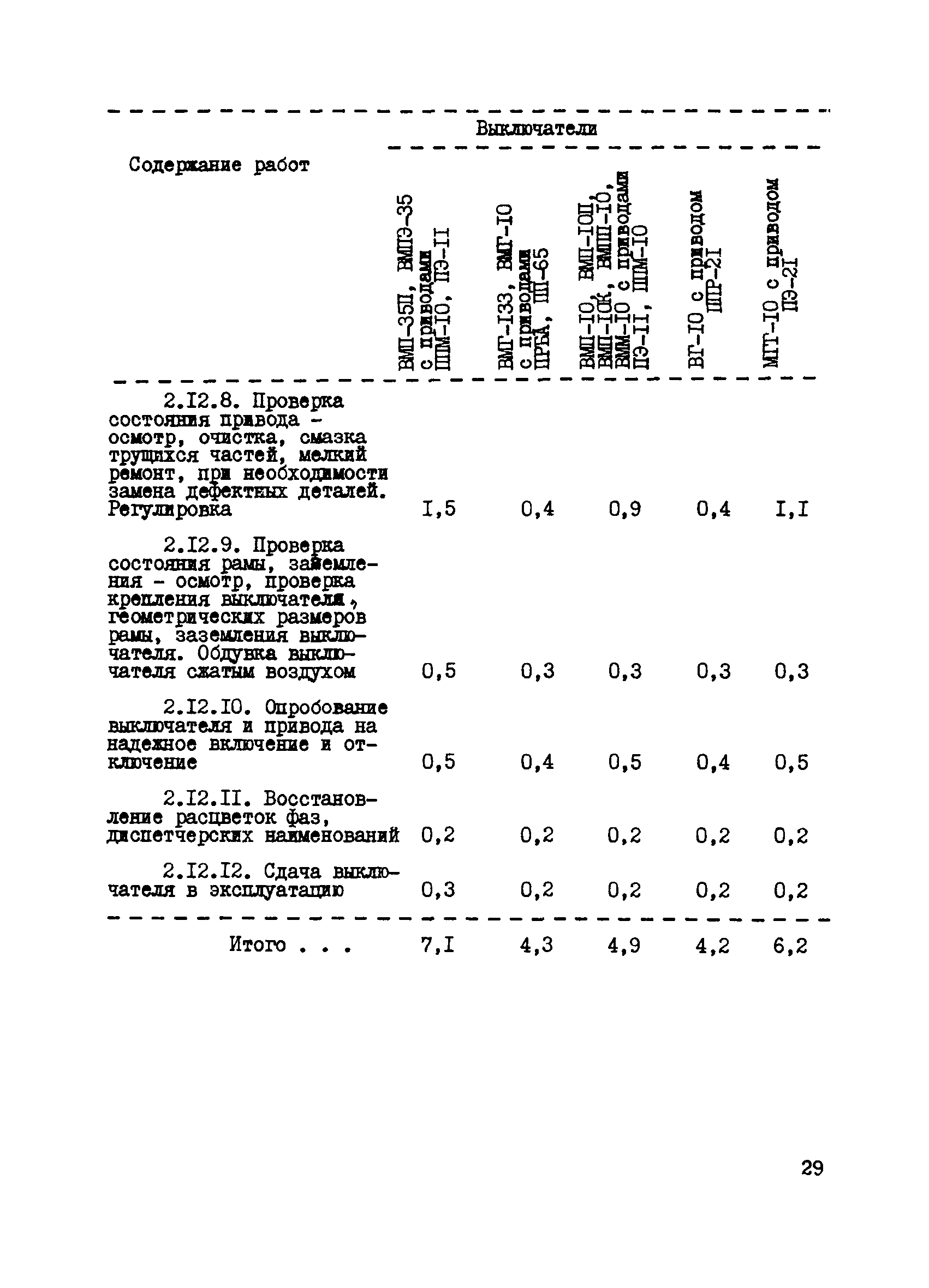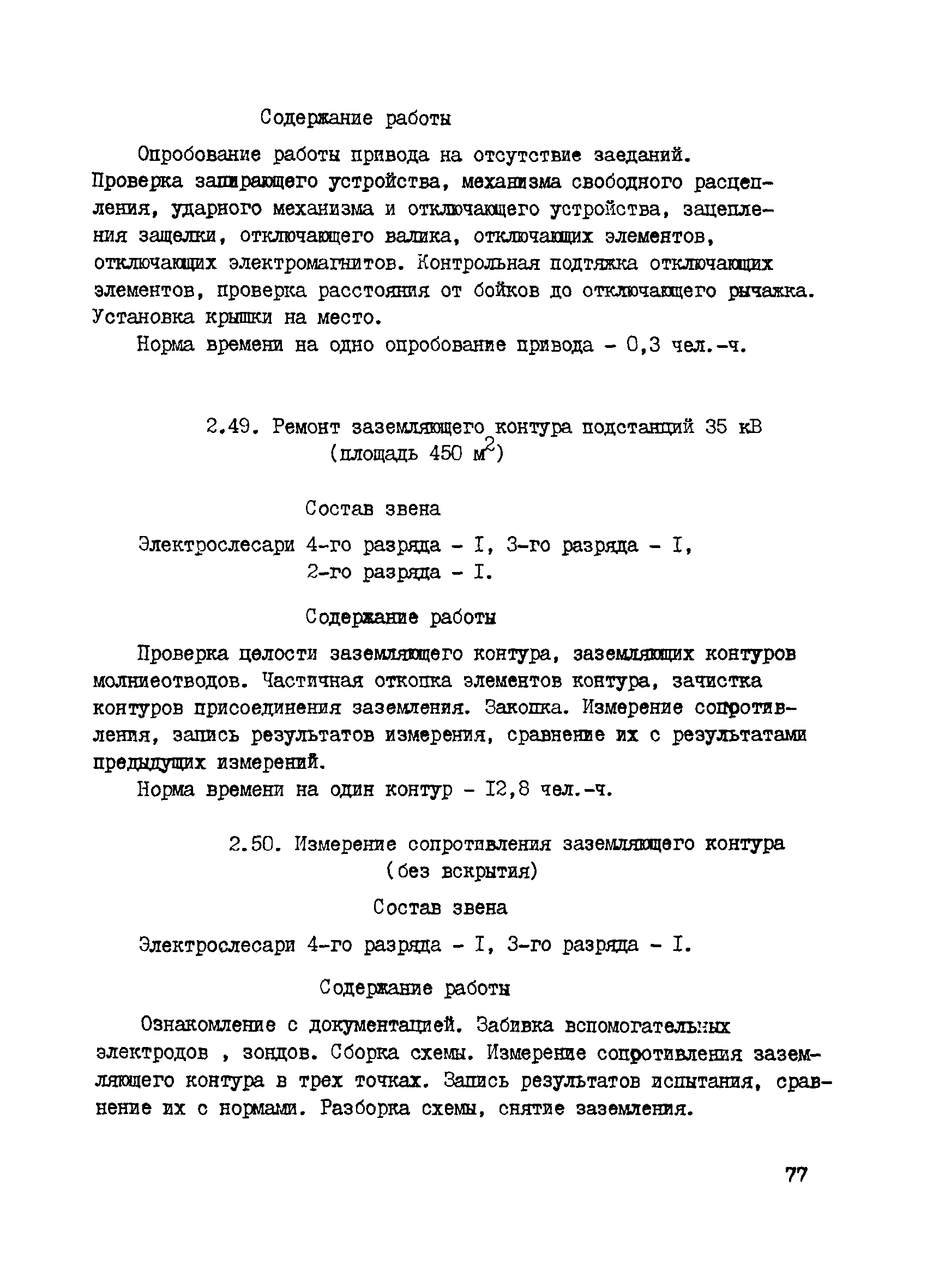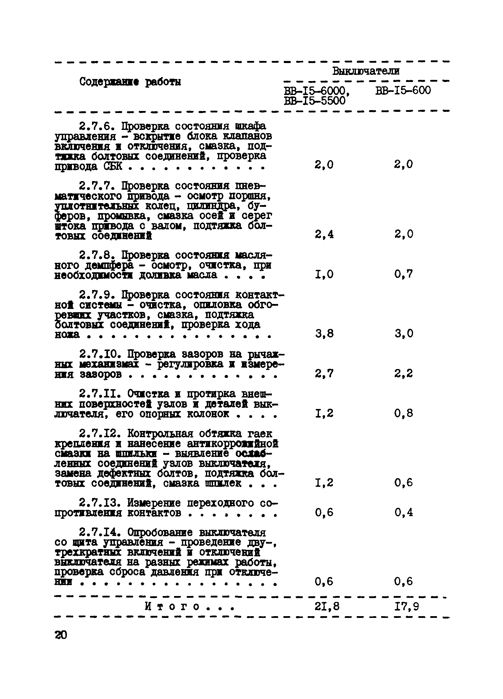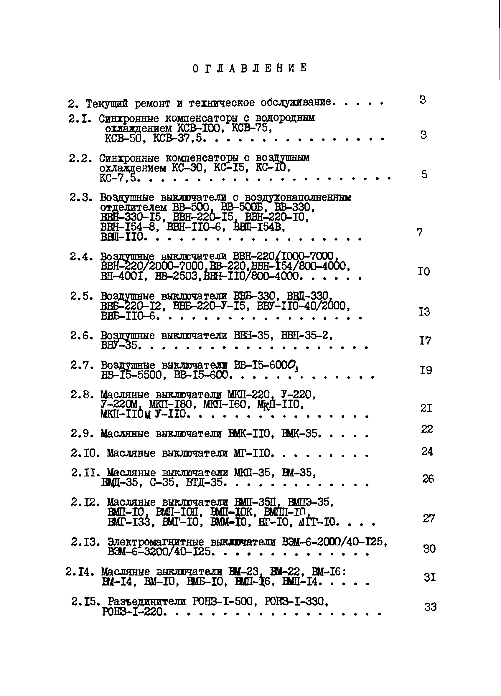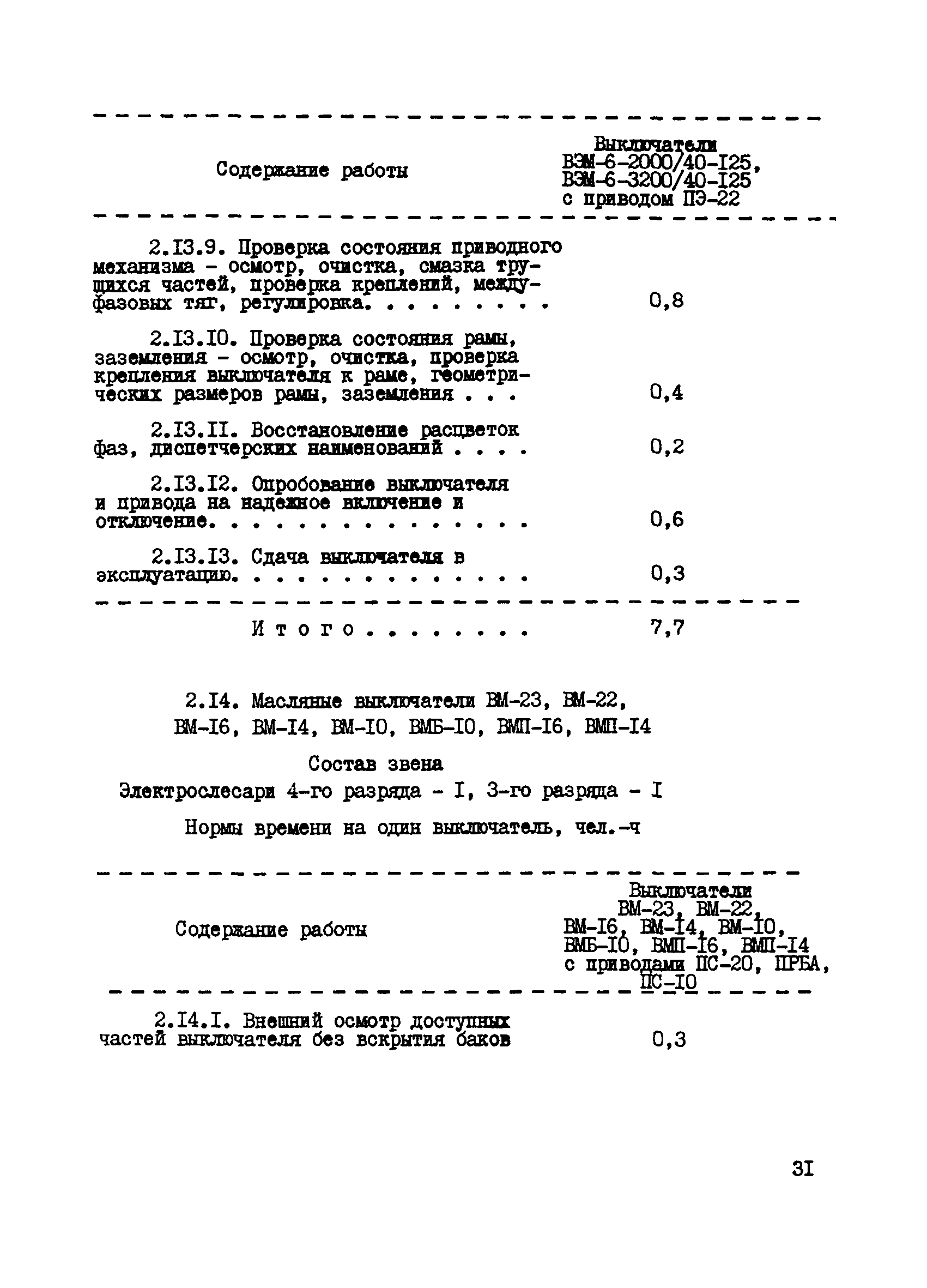 Нормы времени на капитальный, текущий ремонты и техническое обслуживание оборудования подстанций напряжением 35 - 500 кВ. Часть II. Текущий ремонт и техническое обслуживание| Статус: | справочные материалы, мп, тпр | | Название рус.: | Нормы времени на капитальный, текущий ремонты и техническое обслуживание оборудования подстанций напряжением 35 - 500 кВ. Часть II. Текущий ремонт и техническое обслуживание | | Дата добавления в базу: | 01.09.2013 | | Дата актуализации: | 01.01.2021 | | Область применения: | Нормы применяются при капитальном, ткущем ремонтах и техническом обслуживании оборудования подстанций напряжением 35 - 500 кВ. | | Оглавление: | 2. Текущий ремонт и техническое обслуживание 2.1 Синхронные компенсаторы с водородным охлаждением КСВ-100. КСВ-75, КСВ-50, КСВ-37,5 2.2 Синхронные компенсаторы с воздушным охлаждением КС-30, КС-15, КС-10, КС -7,5 2.3 Воздушные выключатели с воздухонаполненным отделителем ВВ-500, ВВ-500Б, ВВ-330, ВВН-330-15, ВВН-220-15, ВВН-220-10, ВВН-154-8, ВВН-110-6, ВВШ-154В, ВВШ-110 2.4 Воздушные выключатели ВВН-220/1000-7000, ВВН-220/2000-7000, ВВ-220, ВВН-154/800-4000, ВН-40001, ВВ-2503, ВВН-110/800-4000 2.5 Воздушные выключатели ВВБ-330, ВВД-330, ВВБ-220-12. ВВБ-220-У-15, ВВУ-110-40/2000 2.6 Воздушные выключатели ВВН-35, ВВН-35-2, ВВУ-35 2.7 Воздушные выключатели ВВ-15-6000. ВВ-15-5500, ВВ-15-600 2.8 Масляные выключатели МКП-220, У-220, У-220М, МКП-180, МКП-160, МКП-110, МКП-110М, У-110 2.9 Масляные выключатели ВМК-110, ВМК-35 2.10 Масляные выключатели МГ-110 2.11 Масляные выключатели МКП-35, ВМ-35, ВМД-35, С-35, ВТД-35 2.12 Масляные выключатели ВМП-35П, ВМПЭ-35, ВМП-10, ВМП-10П, ВМП-10К, ВМПП-10, ВМГ-133. ВМГ-10, ВММ-10, ВГ-10, МГГ-10 2.13 Электромагнитные выключатели ВЭМ-6-2000/40-125, ВЭМ-6-3200/40-125 2.14 Масляные выключатели ВМ-23. ВМ-22, ВМ-16, ВМ-14, ВМ-10, ВМБ-10, ВМП-16, ВМП-14 2.15 Разъединители РОНЗ-I-500, РОНЗ-I-330, РОНЗ-I-220 2.16 Разъединители РЛНД-500, РНД-330. РЛНД-220, РЛНД-150, РЛНД-110, РЛНД-35, РЛНД-100, РДНД-6 2.17 Разъединители РЛНЗ-220, РЛНЗ-150, РЛН-110, РЛН-35. РЛН-10, РЛН-6 2.18 Шинный разъединитель РВК-10/3000 одного присоединения 2.19 Отделители ОД-220М. ОД-150М, ОД-110М, ОДЗ-110М, ОД-35, ОДЗ-35 2.20 Короткозамыкатели КЗ-220М, КЗ-150М, КЗ-110М, КЗ-35 2.21 Трансформаторы напряжения НКФ-500, НКФ-330, НКФ-220, НКФ-150, НКФ-110, ЗНОМ-35, НОМ-10, НОМ-6 2.22 Трансформаторы тока ТФКНД-500, ТФКН-330, ТРН-330, ТФНД-220, ТФНД-150, ТФНД-110, ТФНД-35, ТПФЛ-10 2.23 Компрессоры ВШ-3/40, ВКУ-60/40 2.24 Разрядники РВМК-500, РВМГ-500, РВМК-330, РВМГ-330, РВМГ-154, РВС-330, РВС-220, РВС-154, РВС-110. РВС-35, РВП-10, РВП-6 2.25 Высокочастотные заградители ВЗ-2000-1,2, ВЗ-1000-0,6, ВЗ-600-0,25 2.26 Система шин ЗРУ-6-10 кВ 2.27 Система шин ОРУ-500, 330, 220, 150, 110, 25 кВ 2.28 Конденсаторы связи СМР-166/3-0,014, СМР-133/3-0.0186, СМР-110/3-0,0064, СМР-66/3-0,0044, СММ-20.3-0,107 2.29 Аккумуляторные батареи СК-16. СК-12, СК-10, СК-8, СК-6, СК-3, СК22, СК-1 2.30 Сухой реактор РБ-10 (600А) 2.31 Масляный токоограничивающий реактор РТДТ-35-1000-10 наружной установки 2.32 Ремонт двигателей -генераторов 2.33 Проверка состояния магнитных пускателей ПА-522 (на месте установки) 2.34 Осмотр и очистка кабельных каналов 2.35 Ремонт воздухосборников 2.36 Проверка состояния воздухопроводной сети 2.37. Восстановление надписей 2.38 Ремонт панели щита постоянного и переменного тока 2.39 Ремонт дистиллятора АА-1 2.40 Ремонт фильтр-пресса ФП-2/3000 2.41 Ремонт центрифуги СМ-1,5 (на месте установки) 2.42 Ремонт предохранителей ПК-6(7,5 А), ПК-10 (20А) 2.43 Ремонт стреляющего предохранителя ПСН-35 2.44 Проверка состояния противопожарного инвентаря 2.45 Замена баллонов с углекислым газом 2.46 Измерение распределения напряжения по элементам изоляторов ИШД-35 и ШТ-35 (штангой) 2.47 Ремонт переносных заземлений для устро