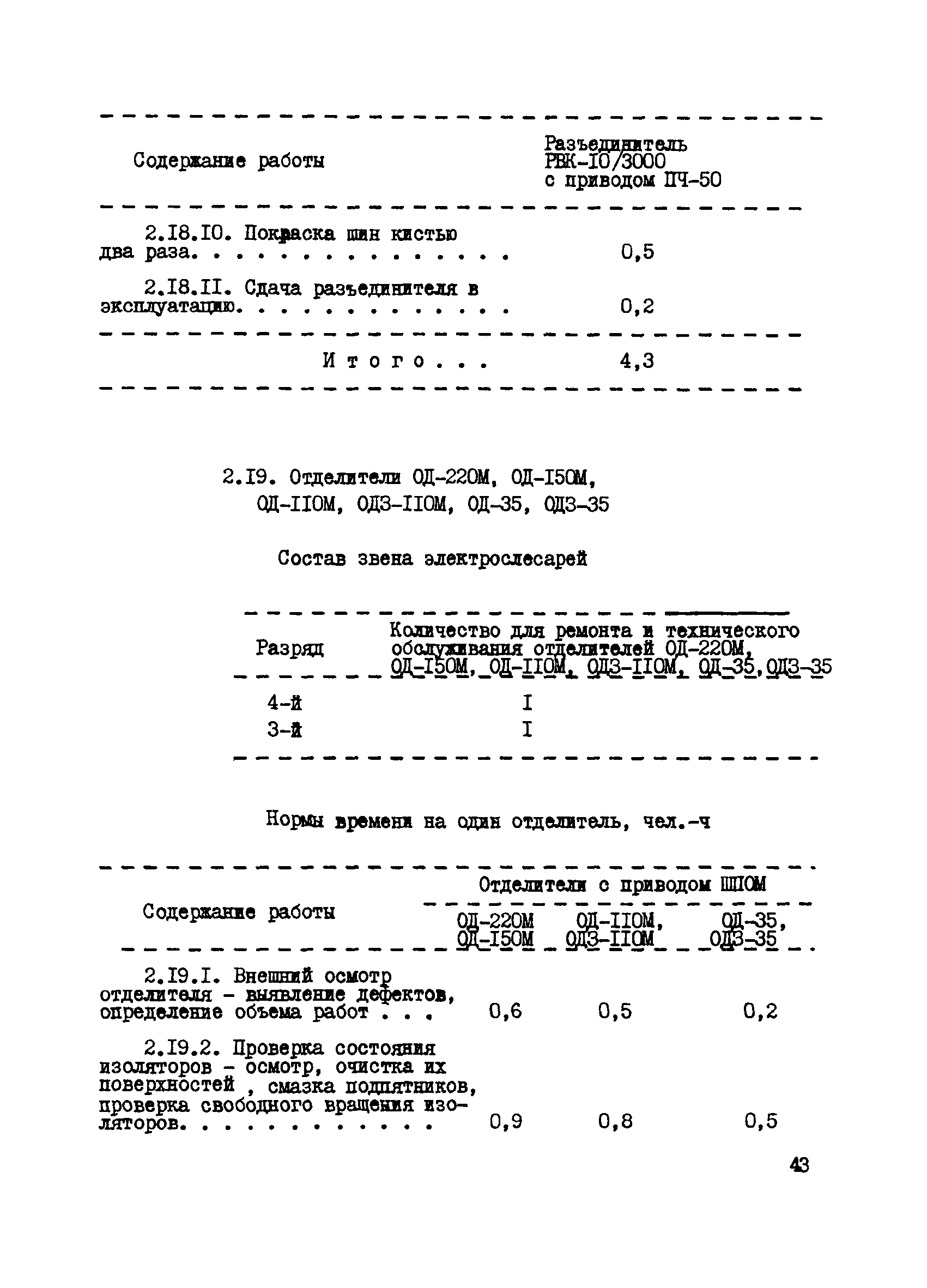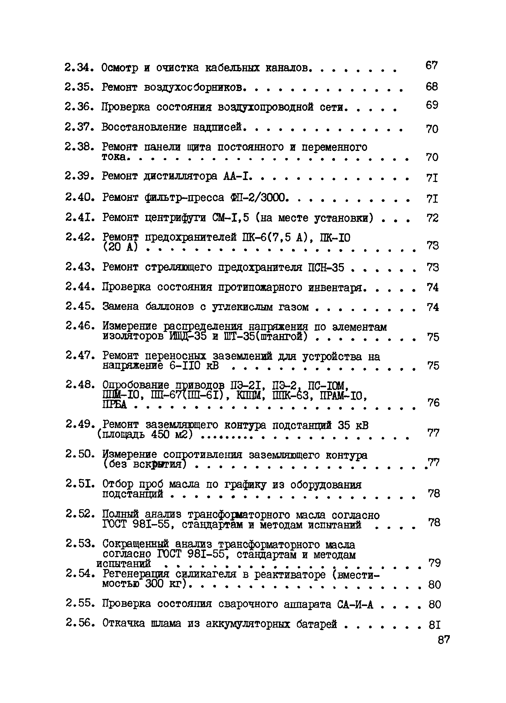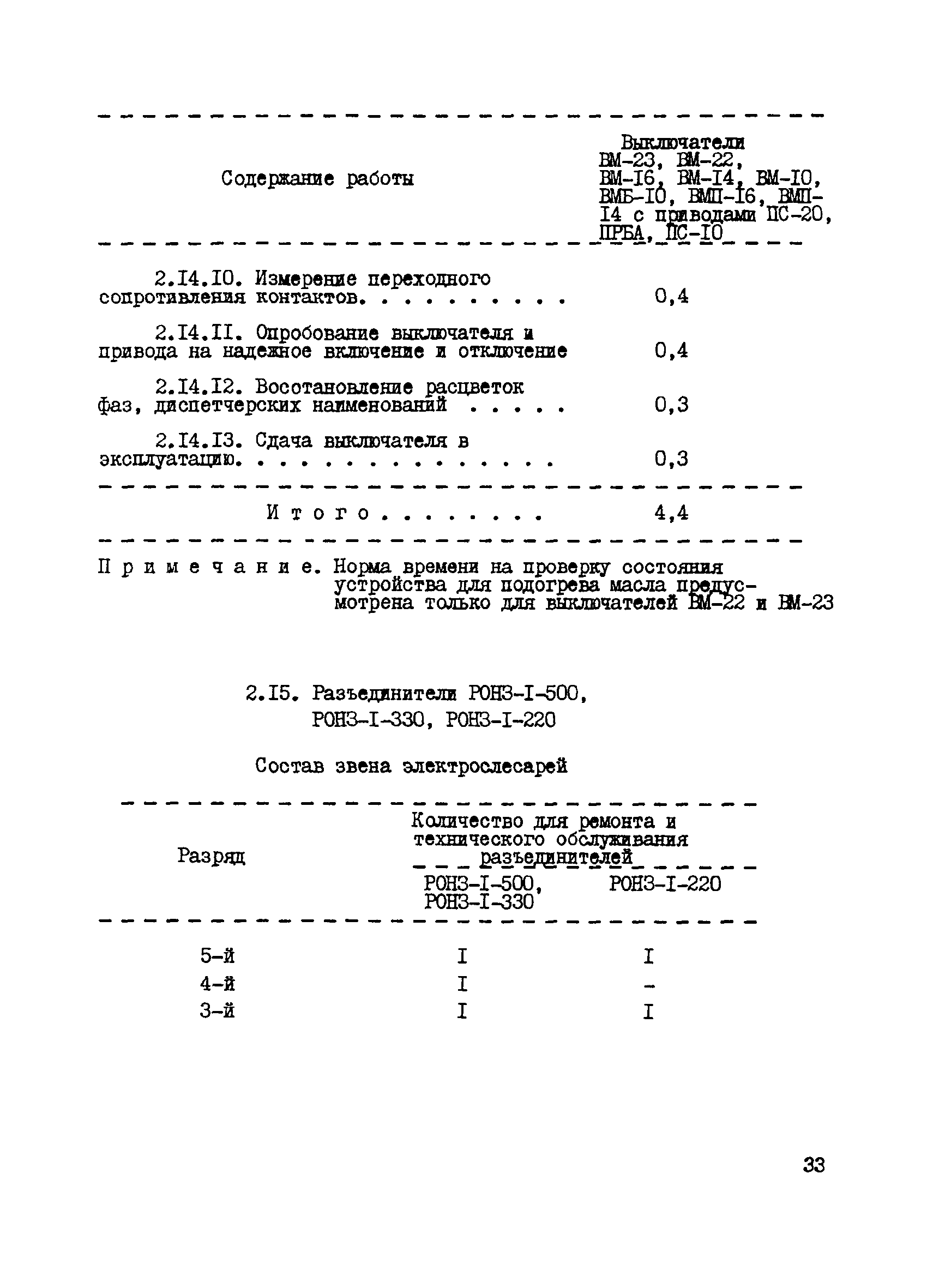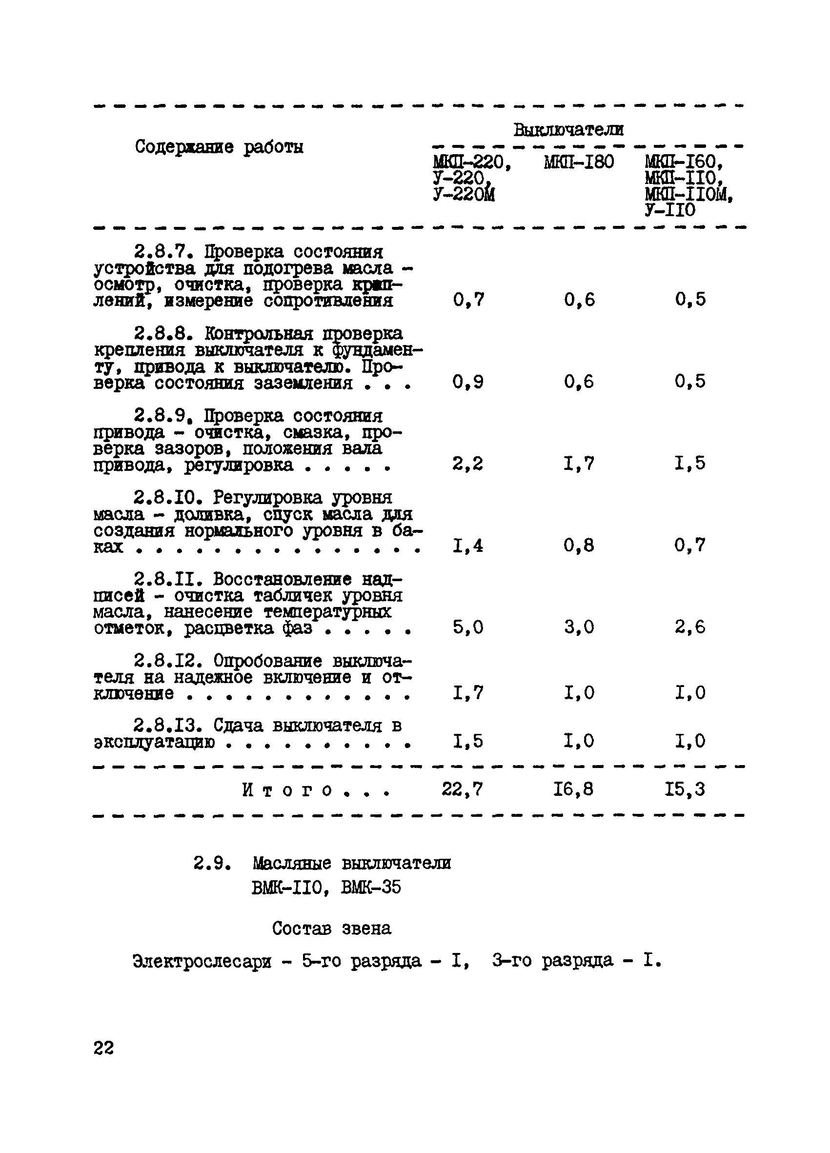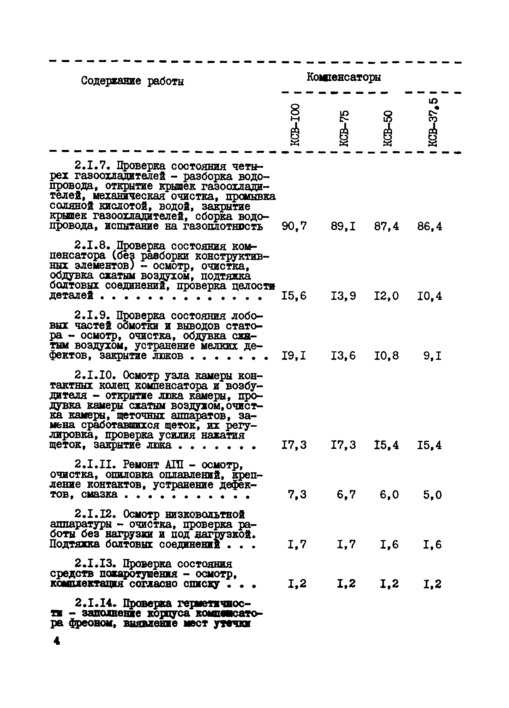 Нормы времени на капитальный, текущий ремонты и техническое обслуживание оборудования подстанций напряжением 35 - 500 кВ. Часть II. Текущий ремонт и техническое обслуживание| Статус: | справочные материалы, мп, тпр | | Название рус.: | Нормы времени на капитальный, текущий ремонты и техническое обслуживание оборудования подстанций напряжением 35 - 500 кВ. Часть II. Текущий ремонт и техническое обслуживание | | Дата добавления в базу: | 01.09.2013 | | Дата актуализации: | 01.01.2021 | | Область применения: | Нормы применяются при капитальном, ткущем ремонтах и техническом обслуживании оборудования подстанций напряжением 35 - 500 кВ. | | Оглавление: | 2. Текущий ремонт и техническое обслуживание 2.1 Синхронные компенсаторы с водородным охлаждением КСВ-100. КСВ-75, КСВ-50, КСВ-37,5 2.2 Синхронные компенсаторы с воздушным охлаждением КС-30, КС-15, КС-10, КС -7,5 2.3 Воздушные выключатели с воздухонаполненным отделителем ВВ-500, ВВ-500Б, ВВ-330, ВВН-330-15, ВВН-220-15, ВВН-220-10, ВВН-154-8, ВВН-110-6, ВВШ-154В, ВВШ-110 2.4 Воздушные выключатели ВВН-220/1000-7000, ВВН-220/2000-7000, ВВ-220, ВВН-154/800-4000, ВН-40001, ВВ-2503, ВВН-110/800-4000 2.5 Воздушные выключатели ВВБ-330, ВВД-330, ВВБ-220-12. ВВБ-220-У-15, ВВУ-110-40/2000 2.6 Воздушные выключатели ВВН-35, ВВН-35-2, ВВУ-35 2.7 Воздушные выключатели ВВ-15-6000. ВВ-15-5500, ВВ-15-600 2.8 Масляные выключатели МКП-220, У-220, У-220М, МКП-180, МКП-160, МКП-110, МКП-110М, У-110 2.9 Масляные выключатели ВМК-110, ВМК-35 2.10 Масляные выключатели МГ-110 2.11 Масляные выключатели МКП-35, ВМ-35, ВМД-35, С-35, ВТД-35 2.12 Масляные выключатели ВМП-35П, ВМПЭ-35, ВМП-10, ВМП-10П, ВМП-10К, ВМПП-10, ВМГ-133. ВМГ-10, ВММ-10, ВГ-10, МГГ-10 2.13 Электромагнитные выключатели ВЭМ-6-2000/40-125, ВЭМ-6-3200/40-125 2.14 Масляные выключатели ВМ-23. ВМ-22, ВМ-16, ВМ-14, ВМ-10, ВМБ-10, ВМП-16, ВМП-14 2.15 Разъединители РОНЗ-I-500, РОНЗ-I-330, РОНЗ-I-220 2.16 Разъединители РЛНД-500, РНД-330. РЛНД-220, РЛНД-150, РЛНД-110, РЛНД-35, РЛНД-100, РДНД-6 2.17 Разъединители РЛНЗ-220, РЛНЗ-150, РЛН-110, РЛН-35. РЛН-10, РЛН-6 2.18 Шинный разъединитель РВК-10/3000 одного присоединения 2.19 Отделители ОД-220М. ОД-150М, ОД-110М, ОДЗ-110М, ОД-35, ОДЗ-35 2.20 Короткозамыкатели КЗ-220М, КЗ-150М, КЗ-110М, КЗ-35 2.21 Трансформаторы напряжения НКФ-500, НКФ-330, НКФ-220, НКФ-150, НКФ-110, ЗНОМ-35, НОМ-10, НОМ-6 2.22 Трансформаторы тока ТФКНД-500, ТФКН-330, ТРН-330, ТФНД-220, ТФНД-150, ТФНД-110, ТФНД-35, ТПФЛ-10 2.23 Компрессоры ВШ-3/40, ВКУ-60/40 2.24 Разрядники РВМК-500, РВМГ-500, РВМК-330, РВМГ-330, РВМГ-154, РВС-330, РВС-220, РВС-154, РВС-110. РВС-35, РВП-10, РВП-6 2.25 Высокочастотные заградители ВЗ-2000-1,2, ВЗ-1000-0,6, ВЗ-600-0,25 2.26 Система шин ЗРУ-6-10 кВ 2.27 Система шин ОРУ-500, 330, 220, 150, 110, 25 кВ 2.28 Конденсаторы связи СМР-166/3-0,014, СМР-133/3-0.0186, СМР-110/3-0,0064, СМР-66/3-0,0044, СММ-20.3-0,107 2.29 Аккумуляторные батареи СК-16. СК-12, СК-10, СК-8, СК-6, СК-3, СК22, СК-1 2.30 Сухой реактор РБ-10 (600А) 2.31 Масляный токоограничивающий реактор РТДТ-35-1000-10 наружной установки 2.32 Ремонт двигателей -генераторов 2.33 Проверка состояния магнитных пускателей ПА-522 (на месте установки) 2.34 Осмотр и очистка кабельных каналов 2.35 Ремонт воздухосборников 2.36 Проверка состояния воздухопроводной сети 2.37. Восстановление надписей 2.38 Ремонт панели щита постоянного и переменного тока 2.39 Ремонт дистиллятора АА-1 2.40 Ремонт фильтр-пресса ФП-2/3000 2.41 Ремонт центрифуги СМ-1,5 (на месте установки) 2.42 Ремонт предохранителей ПК-6(7,5 А), ПК-10 (20А) 2.43 Ремонт стреляющего предохранителя ПСН-35 2.44 Проверка состояния противопожарного инвентаря 2.45 Замена баллонов с углекислым газом 2.46 Измерение распределения напряжения по элементам изоляторов ИШД-35 и ШТ-35 (штангой) 2.47 Ремонт переносных заземлений для устро