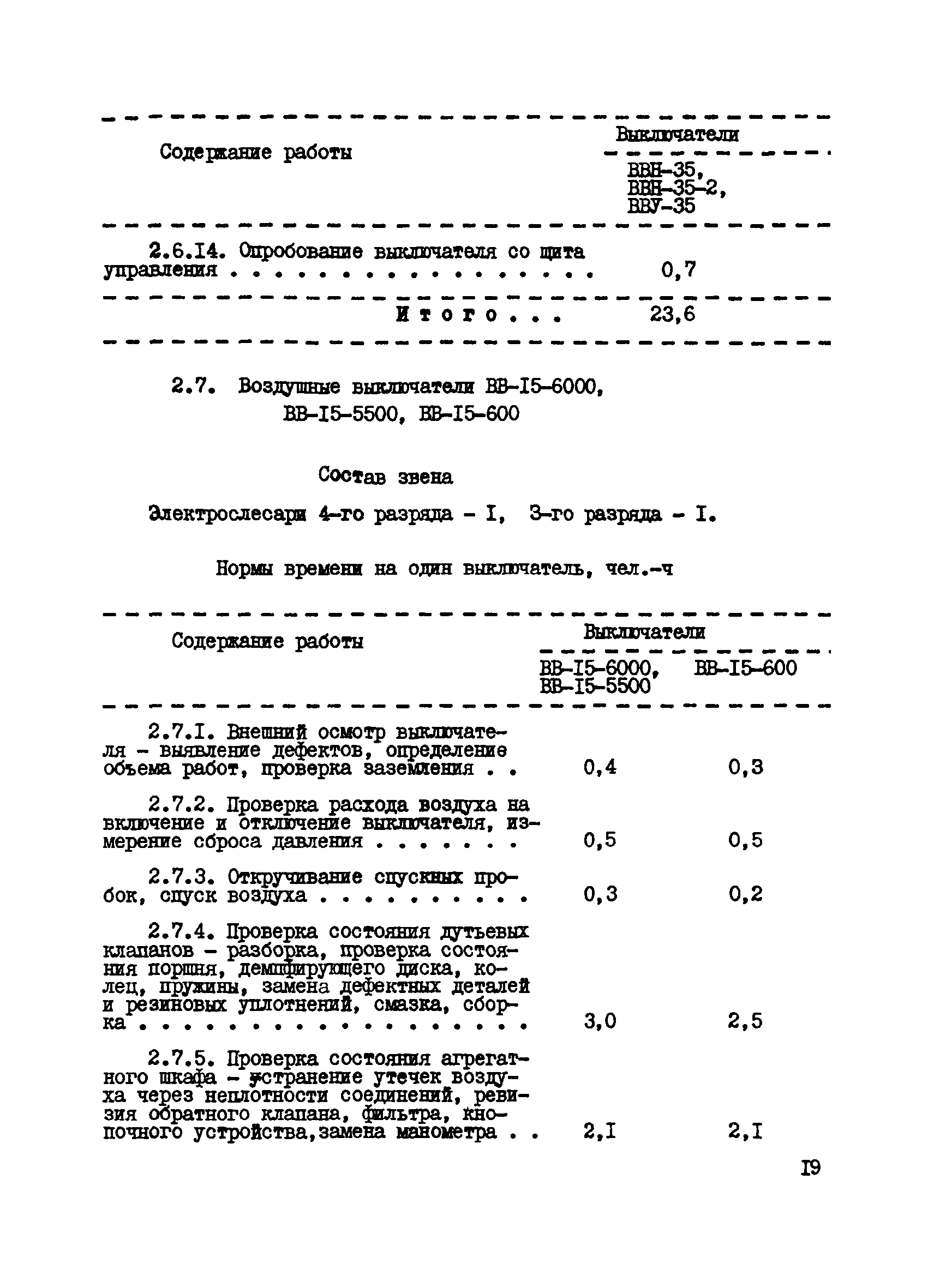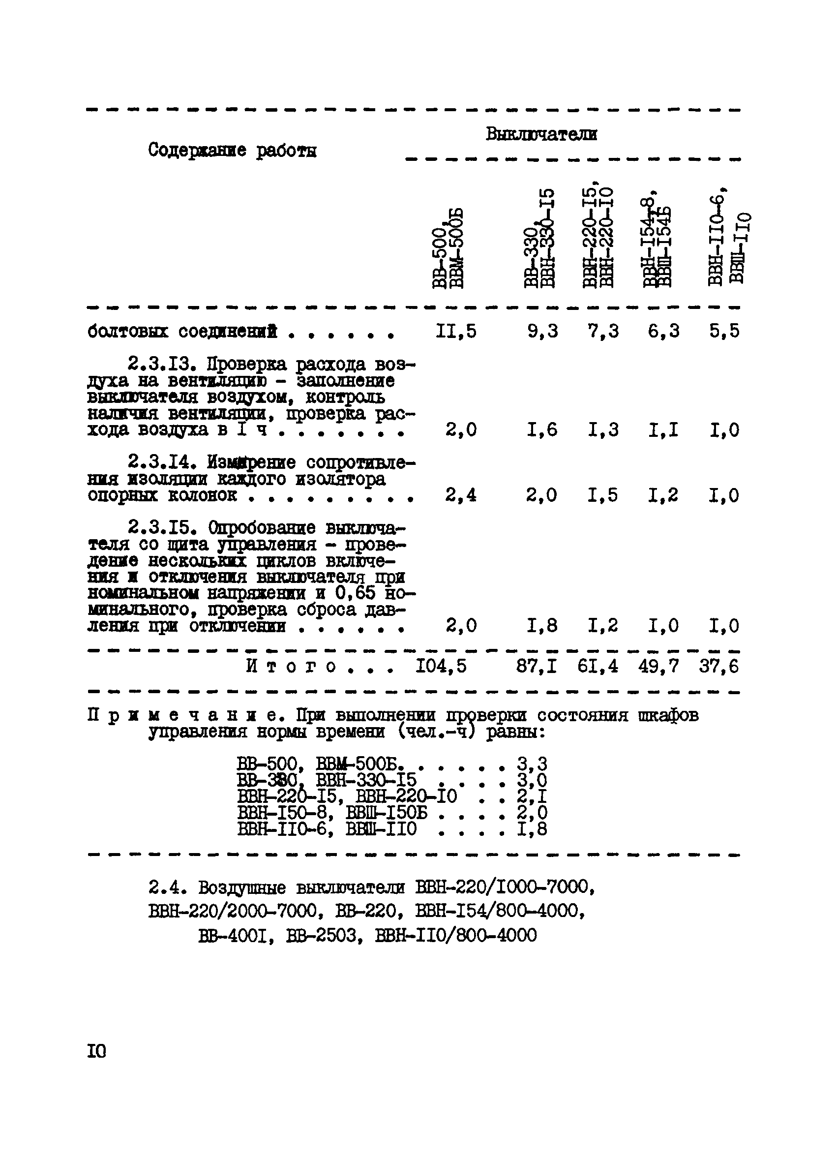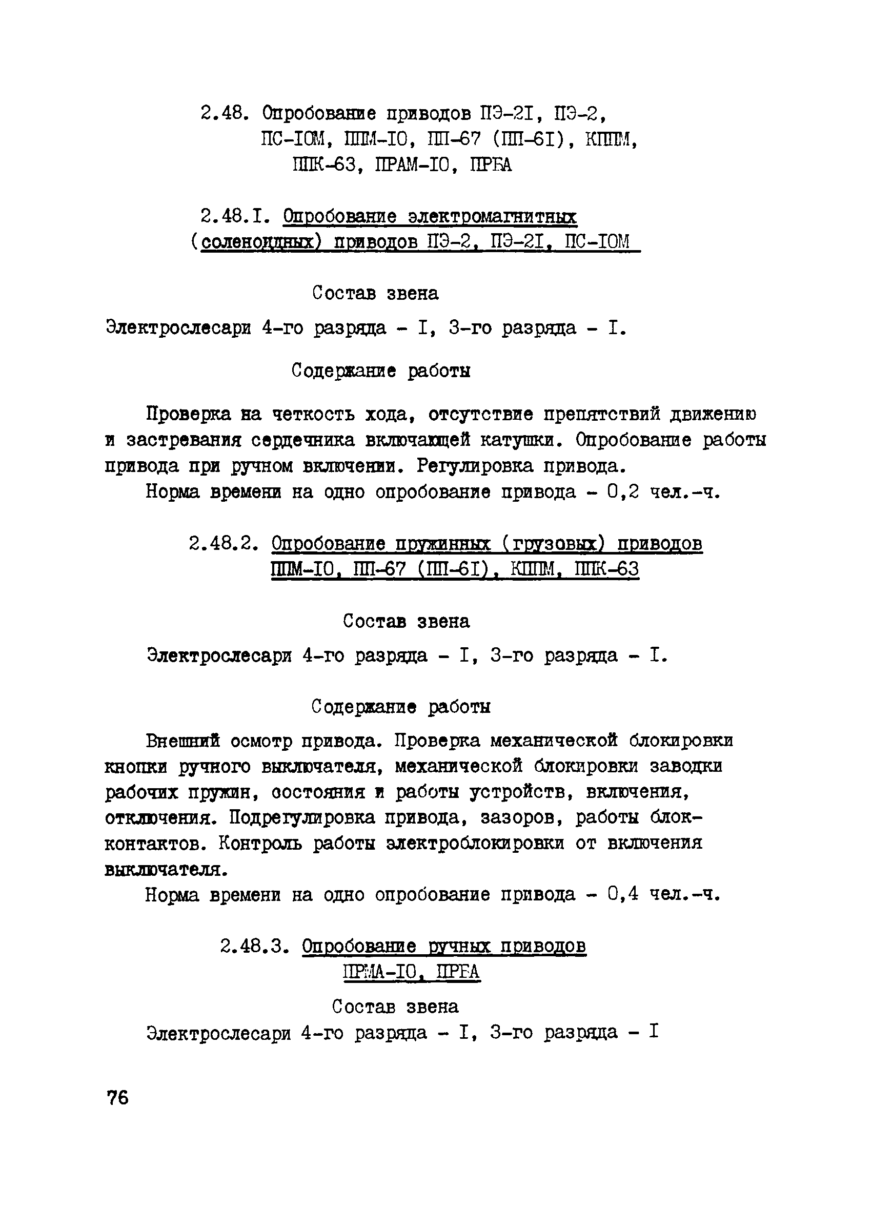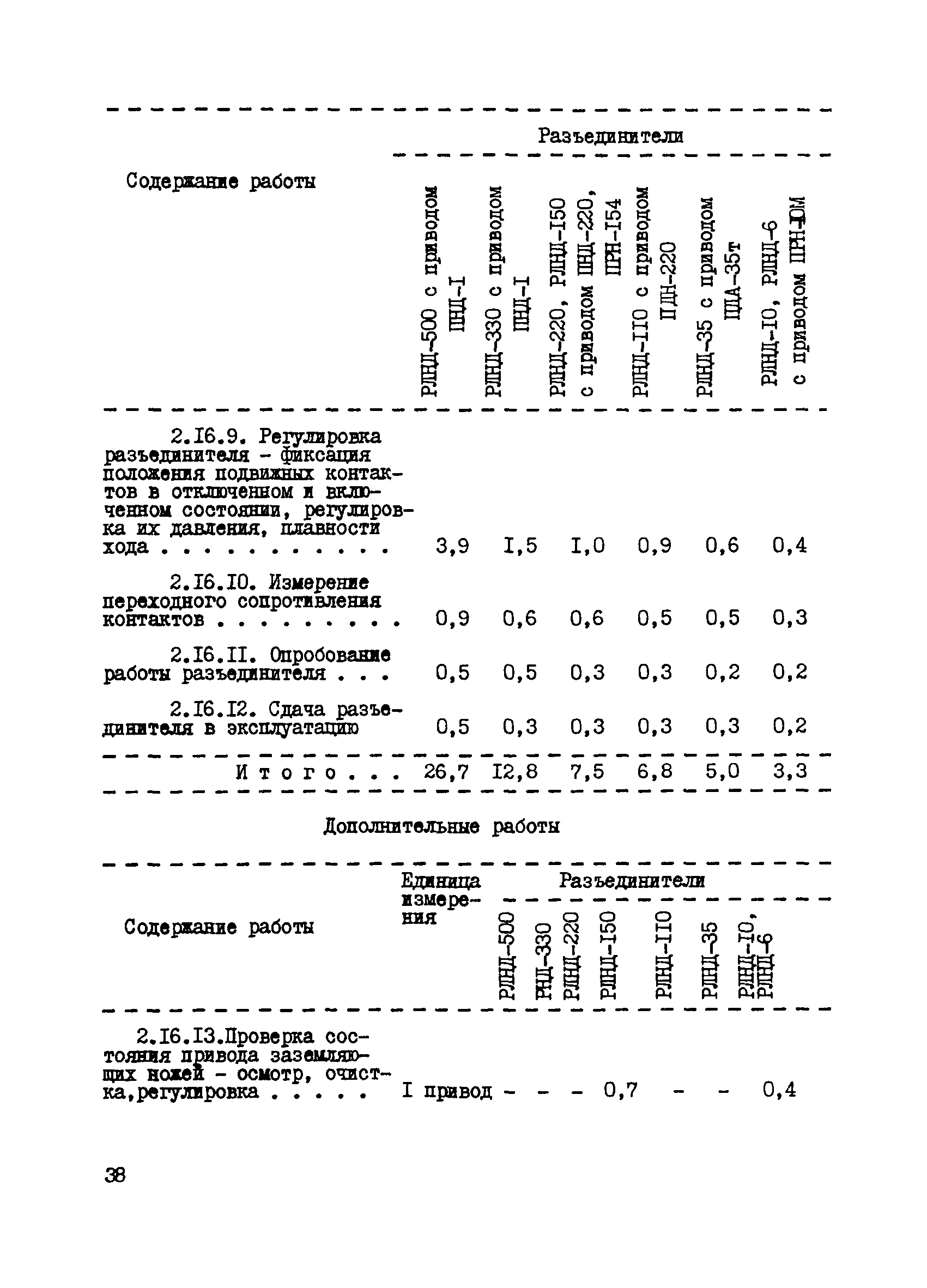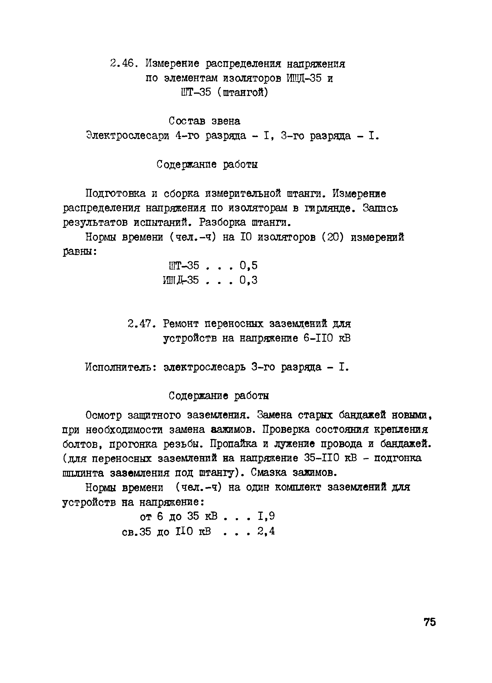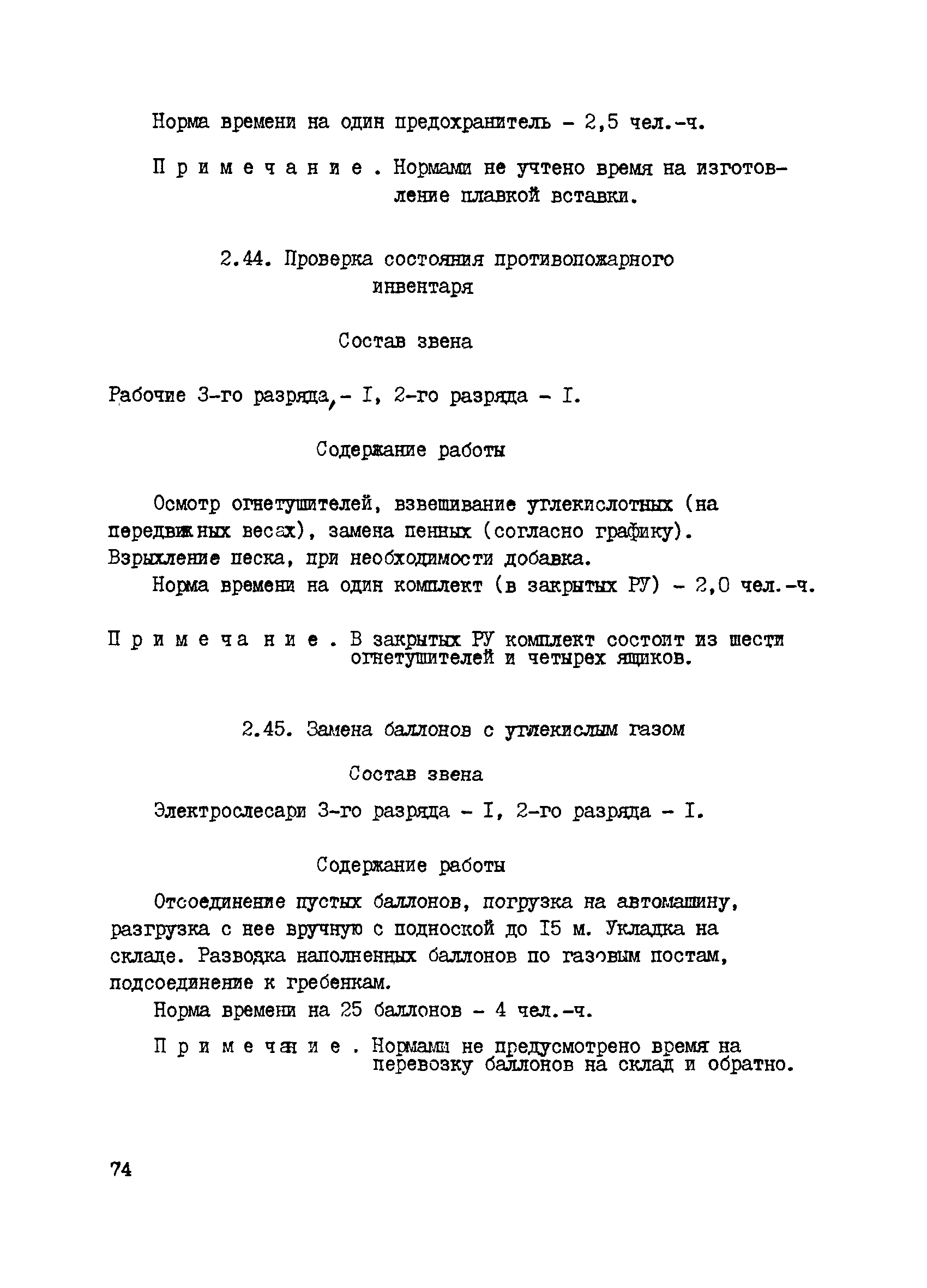 Нормы времени на капитальный, текущий ремонты и техническое обслуживание оборудования подстанций напряжением 35 - 500 кВ. Часть II. Текущий ремонт и техническое обслуживание| Статус: | справочные материалы, мп, тпр | | Название рус.: | Нормы времени на капитальный, текущий ремонты и техническое обслуживание оборудования подстанций напряжением 35 - 500 кВ. Часть II. Текущий ремонт и техническое обслуживание | | Дата добавления в базу: | 01.09.2013 | | Дата актуализации: | 01.01.2021 | | Область применения: | Нормы применяются при капитальном, ткущем ремонтах и техническом обслуживании оборудования подстанций напряжением 35 - 500 кВ. | | Оглавление: | 2. Текущий ремонт и техническое обслуживание 2.1 Синхронные компенсаторы с водородным охлаждением КСВ-100. КСВ-75, КСВ-50, КСВ-37,5 2.2 Синхронные компенсаторы с воздушным охлаждением КС-30, КС-15, КС-10, КС -7,5 2.3 Воздушные выключатели с воздухонаполненным отделителем ВВ-500, ВВ-500Б, ВВ-330, ВВН-330-15, ВВН-220-15, ВВН-220-10, ВВН-154-8, ВВН-110-6, ВВШ-154В, ВВШ-110 2.4 Воздушные выключатели ВВН-220/1000-7000, ВВН-220/2000-7000, ВВ-220, ВВН-154/800-4000, ВН-40001, ВВ-2503, ВВН-110/800-4000 2.5 Воздушные выключатели ВВБ-330, ВВД-330, ВВБ-220-12. ВВБ-220-У-15, ВВУ-110-40/2000 2.6 Воздушные выключатели ВВН-35, ВВН-35-2, ВВУ-35 2.7 Воздушные выключатели ВВ-15-6000. ВВ-15-5500, ВВ-15-600 2.8 Масляные выключатели МКП-220, У-220, У-220М, МКП-180, МКП-160, МКП-110, МКП-110М, У-110 2.9 Масляные выключатели ВМК-110, ВМК-35 2.10 Масляные выключатели МГ-110 2.11 Масляные выключатели МКП-35, ВМ-35, ВМД-35, С-35, ВТД-35 2.12 Масляные выключатели ВМП-35П, ВМПЭ-35, ВМП-10, ВМП-10П, ВМП-10К, ВМПП-10, ВМГ-133. ВМГ-10, ВММ-10, ВГ-10, МГГ-10 2.13 Электромагнитные выключатели ВЭМ-6-2000/40-125, ВЭМ-6-3200/40-125 2.14 Масляные выключатели ВМ-23. ВМ-22, ВМ-16, ВМ-14, ВМ-10, ВМБ-10, ВМП-16, ВМП-14 2.15 Разъединители РОНЗ-I-500, РОНЗ-I-330, РОНЗ-I-220 2.16 Разъединители РЛНД-500, РНД-330. РЛНД-220, РЛНД-150, РЛНД-110, РЛНД-35, РЛНД-100, РДНД-6 2.17 Разъединители РЛНЗ-220, РЛНЗ-150, РЛН-110, РЛН-35. РЛН-10, РЛН-6 2.18 Шинный разъединитель РВК-10/3000 одного присоединения 2.19 Отделители ОД-220М. ОД-150М, ОД-110М, ОДЗ-110М, ОД-35, ОДЗ-35 2.20 Короткозамыкатели КЗ-220М, КЗ-150М, КЗ-110М, КЗ-35 2.21 Трансформаторы напряжения НКФ-500, НКФ-330, НКФ-220, НКФ-150, НКФ-110, ЗНОМ-35, НОМ-10, НОМ-6 2.22 Трансформаторы тока ТФКНД-500, ТФКН-330, ТРН-330, ТФНД-220, ТФНД-150, ТФНД-110, ТФНД-35, ТПФЛ-10 2.23 Компрессоры ВШ-3/40, ВКУ-60/40 2.24 Разрядники РВМК-500, РВМГ-500, РВМК-330, РВМГ-330, РВМГ-154, РВС-330, РВС-220, РВС-154, РВС-110. РВС-35, РВП-10, РВП-6 2.25 Высокочастотные заградители ВЗ-2000-1,2, ВЗ-1000-0,6, ВЗ-600-0,25 2.26 Система шин ЗРУ-6-10 кВ 2.27 Система шин ОРУ-500, 330, 220, 150, 110, 25 кВ 2.28 Конденсаторы связи СМР-166/3-0,014, СМР-133/3-0.0186, СМР-110/3-0,0064, СМР-66/3-0,0044, СММ-20.3-0,107 2.29 Аккумуляторные батареи СК-16. СК-12, СК-10, СК-8, СК-6, СК-3, СК22, СК-1 2.30 Сухой реактор РБ-10 (600А) 2.31 Масляный токоограничивающий реактор РТДТ-35-1000-10 наружной установки 2.32 Ремонт двигателей -генераторов 2.33 Проверка состояния магнитных пускателей ПА-522 (на месте установки) 2.34 Осмотр и очистка кабельных каналов 2.35 Ремонт воздухосборников 2.36 Проверка состояния воздухопроводной сети 2.37. Восстановление надписей 2.38 Ремонт панели щита постоянного и переменного тока 2.39 Ремонт дистиллятора АА-1 2.40 Ремонт фильтр-пресса ФП-2/3000 2.41 Ремонт центрифуги СМ-1,5 (на месте установки) 2.42 Ремонт предохранителей ПК-6(7,5 А), ПК-10 (20А) 2.43 Ремонт стреляющего предохранителя ПСН-35 2.44 Проверка состояния противопожарного инвентаря 2.45 Замена баллонов с углекислым газом 2.46 Измерение распределения напряжения по элементам изоляторов ИШД-35 и ШТ-35 (штангой) 2.47 Ремонт переносных заземлений для устро