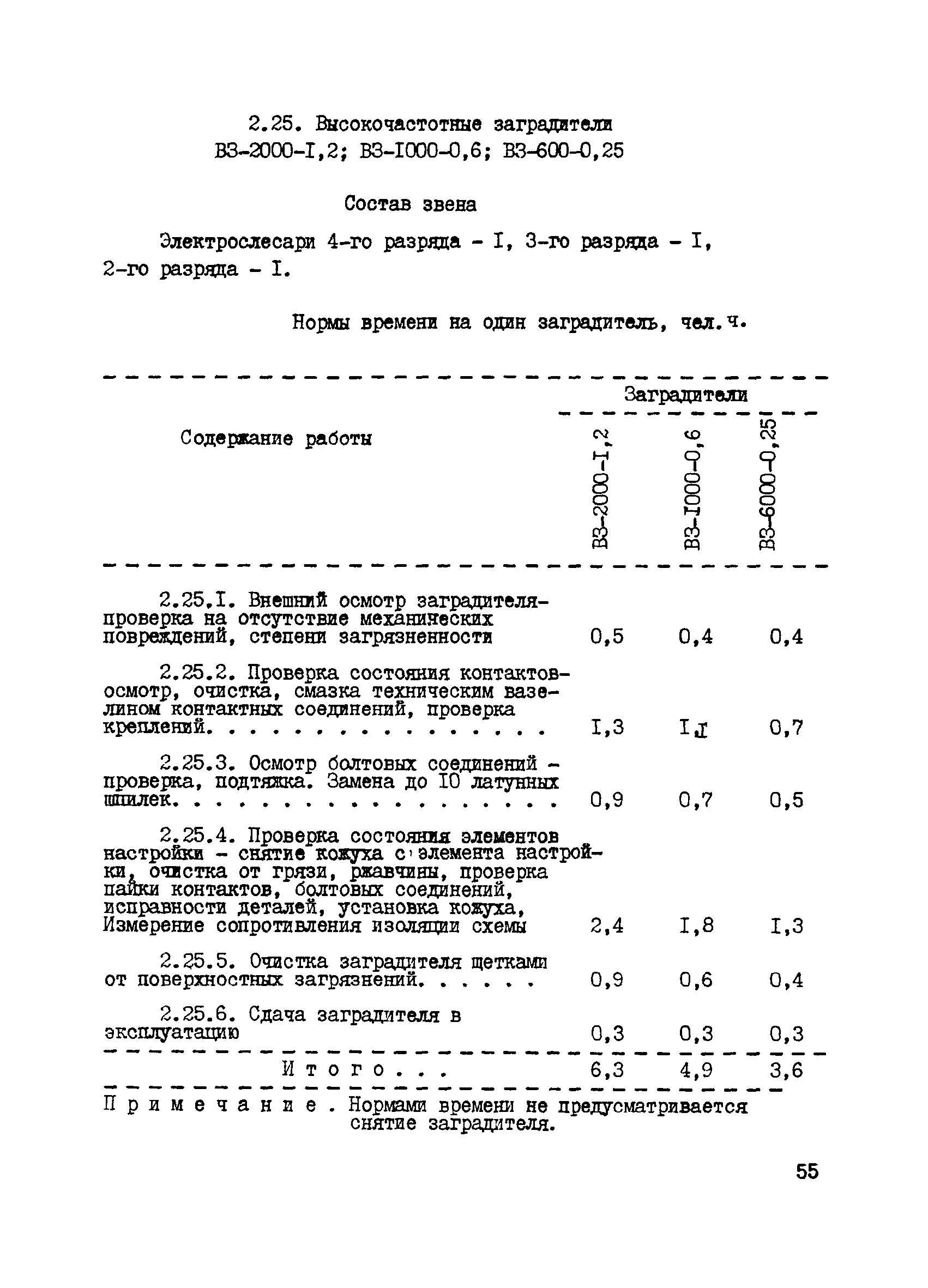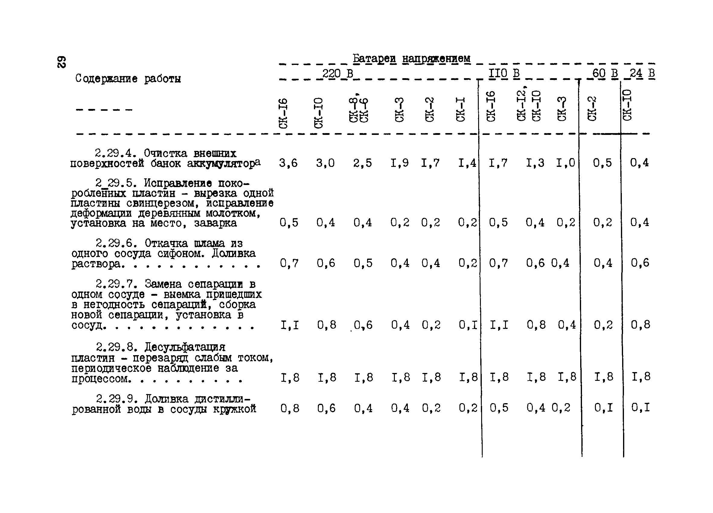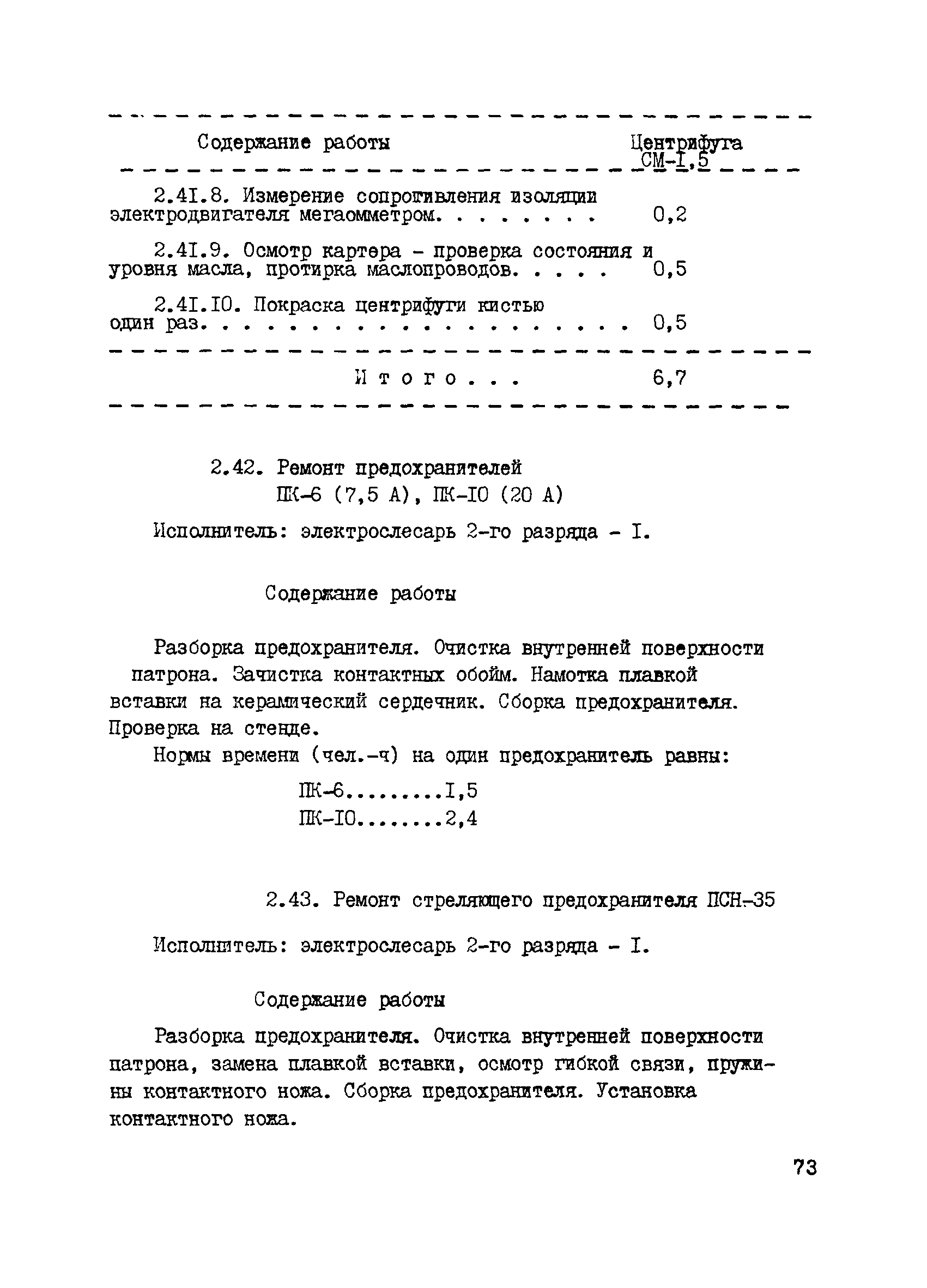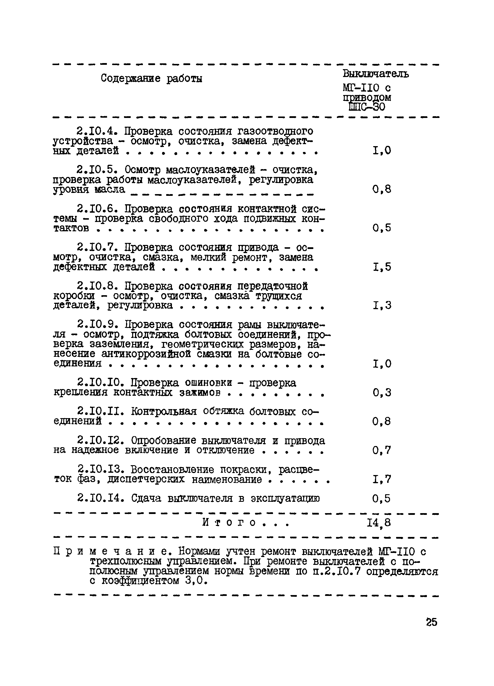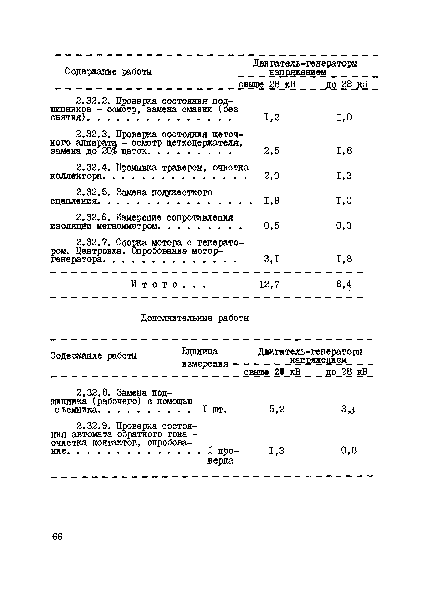 Нормы времени на капитальный, текущий ремонты и техническое обслуживание оборудования подстанций напряжением 35 - 500 кВ. Часть II. Текущий ремонт и техническое обслуживание| Статус: | справочные материалы, мп, тпр | | Название рус.: | Нормы времени на капитальный, текущий ремонты и техническое обслуживание оборудования подстанций напряжением 35 - 500 кВ. Часть II. Текущий ремонт и техническое обслуживание | | Дата добавления в базу: | 01.09.2013 | | Дата актуализации: | 01.01.2021 | | Область применения: | Нормы применяются при капитальном, ткущем ремонтах и техническом обслуживании оборудования подстанций напряжением 35 - 500 кВ. | | Оглавление: | 2. Текущий ремонт и техническое обслуживание 2.1 Синхронные компенсаторы с водородным охлаждением КСВ-100. КСВ-75, КСВ-50, КСВ-37,5 2.2 Синхронные компенсаторы с воздушным охлаждением КС-30, КС-15, КС-10, КС -7,5 2.3 Воздушные выключатели с воздухонаполненным отделителем ВВ-500, ВВ-500Б, ВВ-330, ВВН-330-15, ВВН-220-15, ВВН-220-10, ВВН-154-8, ВВН-110-6, ВВШ-154В, ВВШ-110 2.4 Воздушные выключатели ВВН-220/1000-7000, ВВН-220/2000-7000, ВВ-220, ВВН-154/800-4000, ВН-40001, ВВ-2503, ВВН-110/800-4000 2.5 Воздушные выключатели ВВБ-330, ВВД-330, ВВБ-220-12. ВВБ-220-У-15, ВВУ-110-40/2000 2.6 Воздушные выключатели ВВН-35, ВВН-35-2, ВВУ-35 2.7 Воздушные выключатели ВВ-15-6000. ВВ-15-5500, ВВ-15-600 2.8 Масляные выключатели МКП-220, У-220, У-220М, МКП-180, МКП-160, МКП-110, МКП-110М, У-110 2.9 Масляные выключатели ВМК-110, ВМК-35 2.10 Масляные выключатели МГ-110 2.11 Масляные выключатели МКП-35, ВМ-35, ВМД-35, С-35, ВТД-35 2.12 Масляные выключатели ВМП-35П, ВМПЭ-35, ВМП-10, ВМП-10П, ВМП-10К, ВМПП-10, ВМГ-133. ВМГ-10, ВММ-10, ВГ-10, МГГ-10 2.13 Электромагнитные выключатели ВЭМ-6-2000/40-125, ВЭМ-6-3200/40-125 2.14 Масляные выключатели ВМ-23. ВМ-22, ВМ-16, ВМ-14, ВМ-10, ВМБ-10, ВМП-16, ВМП-14 2.15 Разъединители РОНЗ-I-500, РОНЗ-I-330, РОНЗ-I-220 2.16 Разъединители РЛНД-500, РНД-330. РЛНД-220, РЛНД-150, РЛНД-110, РЛНД-35, РЛНД-100, РДНД-6 2.17 Разъединители РЛНЗ-220, РЛНЗ-150, РЛН-110, РЛН-35. РЛН-10, РЛН-6 2.18 Шинный разъединитель РВК-10/3000 одного присоединения 2.19 Отделители ОД-220М. ОД-150М, ОД-110М, ОДЗ-110М, ОД-35, ОДЗ-35 2.20 Короткозамыкатели КЗ-220М, КЗ-150М, КЗ-110М, КЗ-35 2.21 Трансформаторы напряжения НКФ-500, НКФ-330, НКФ-220, НКФ-150, НКФ-110, ЗНОМ-35, НОМ-10, НОМ-6 2.22 Трансформаторы тока ТФКНД-500, ТФКН-330, ТРН-330, ТФНД-220, ТФНД-150, ТФНД-110, ТФНД-35, ТПФЛ-10 2.23 Компрессоры ВШ-3/40, ВКУ-60/40 2.24 Разрядники РВМК-500, РВМГ-500, РВМК-330, РВМГ-330, РВМГ-154, РВС-330, РВС-220, РВС-154, РВС-110. РВС-35, РВП-10, РВП-6 2.25 Высокочастотные заградители ВЗ-2000-1,2, ВЗ-1000-0,6, ВЗ-600-0,25 2.26 Система шин ЗРУ-6-10 кВ 2.27 Система шин ОРУ-500, 330, 220, 150, 110, 25 кВ 2.28 Конденсаторы связи СМР-166/3-0,014, СМР-133/3-0.0186, СМР-110/3-0,0064, СМР-66/3-0,0044, СММ-20.3-0,107 2.29 Аккумуляторные батареи СК-16. СК-12, СК-10, СК-8, СК-6, СК-3, СК22, СК-1 2.30 Сухой реактор РБ-10 (600А) 2.31 Масляный токоограничивающий реактор РТДТ-35-1000-10 наружной установки 2.32 Ремонт двигателей -генераторов 2.33 Проверка состояния магнитных пускателей ПА-522 (на месте установки) 2.34 Осмотр и очистка кабельных каналов 2.35 Ремонт воздухосборников 2.36 Проверка состояния воздухопроводной сети 2.37. Восстановление надписей 2.38 Ремонт панели щита постоянного и переменного тока 2.39 Ремонт дистиллятора АА-1 2.40 Ремонт фильтр-пресса ФП-2/3000 2.41 Ремонт центрифуги СМ-1,5 (на месте установки) 2.42 Ремонт предохранителей ПК-6(7,5 А), ПК-10 (20А) 2.43 Ремонт стреляющего предохранителя ПСН-35 2.44 Проверка состояния противопожарного инвентаря 2.45 Замена баллонов с углекислым газом 2.46 Измерение распределения напряжения по элементам изоляторов ИШД-35 и ШТ-35 (штангой) 2.47 Ремонт переносных заземлений для устро