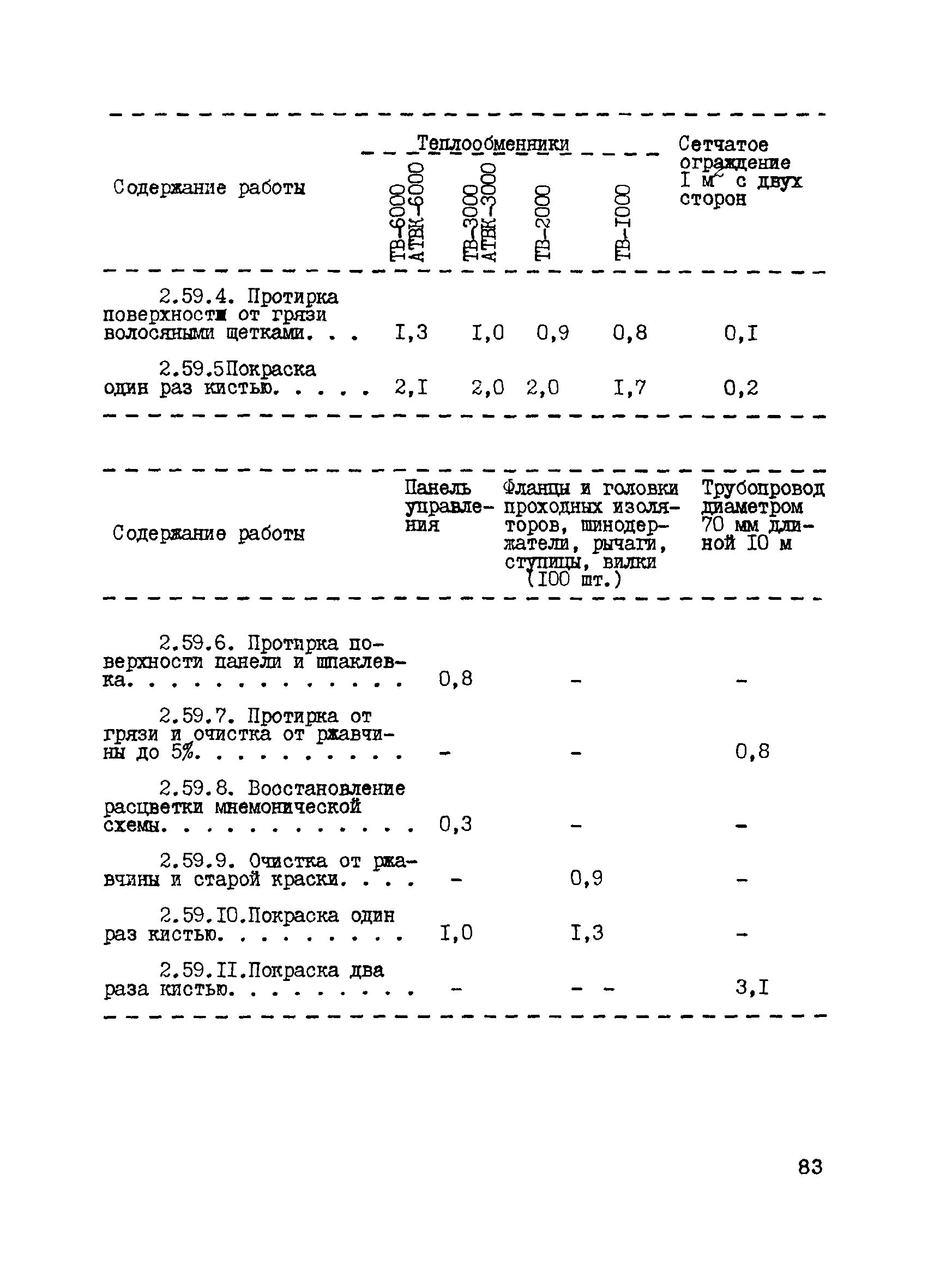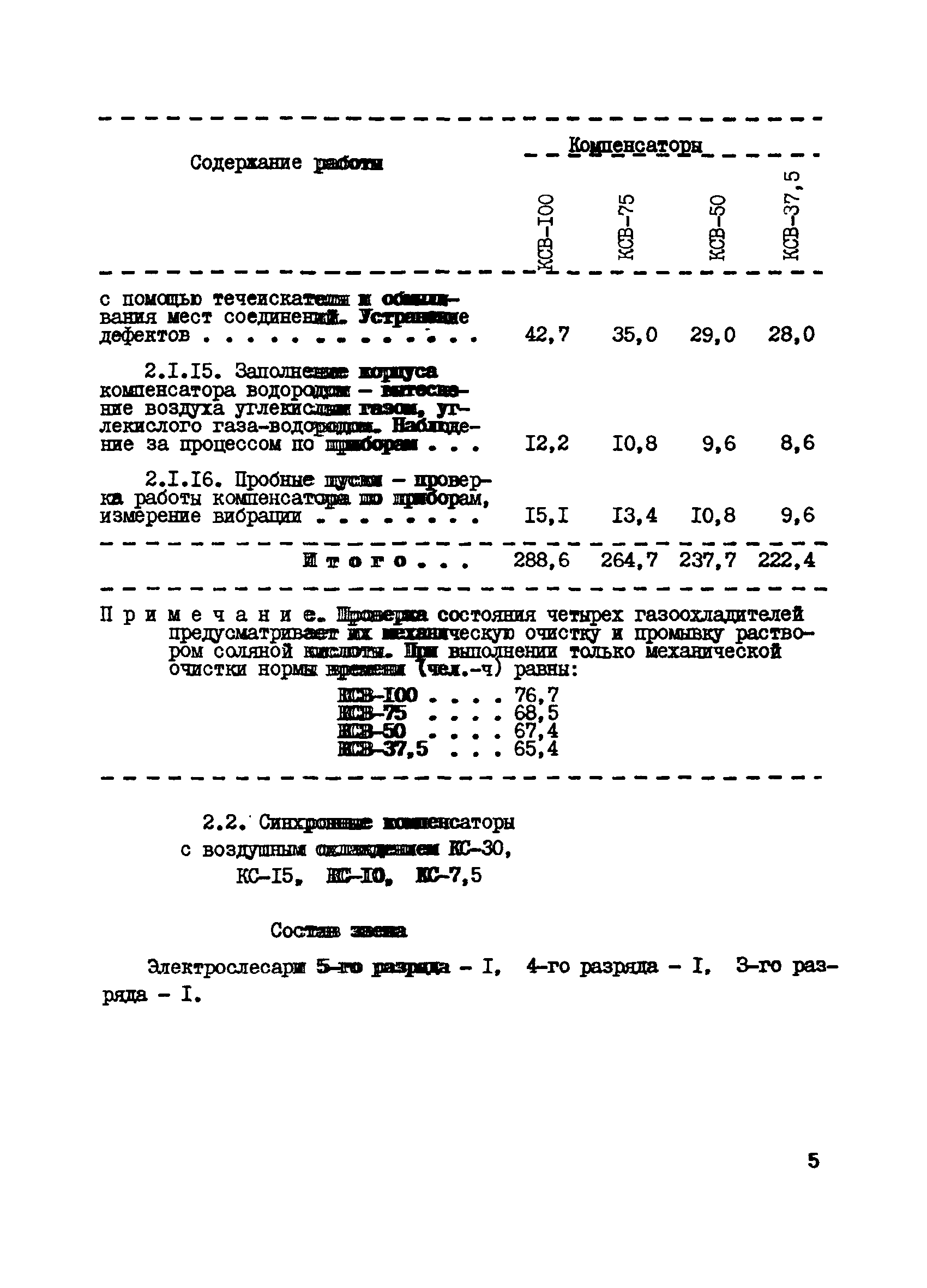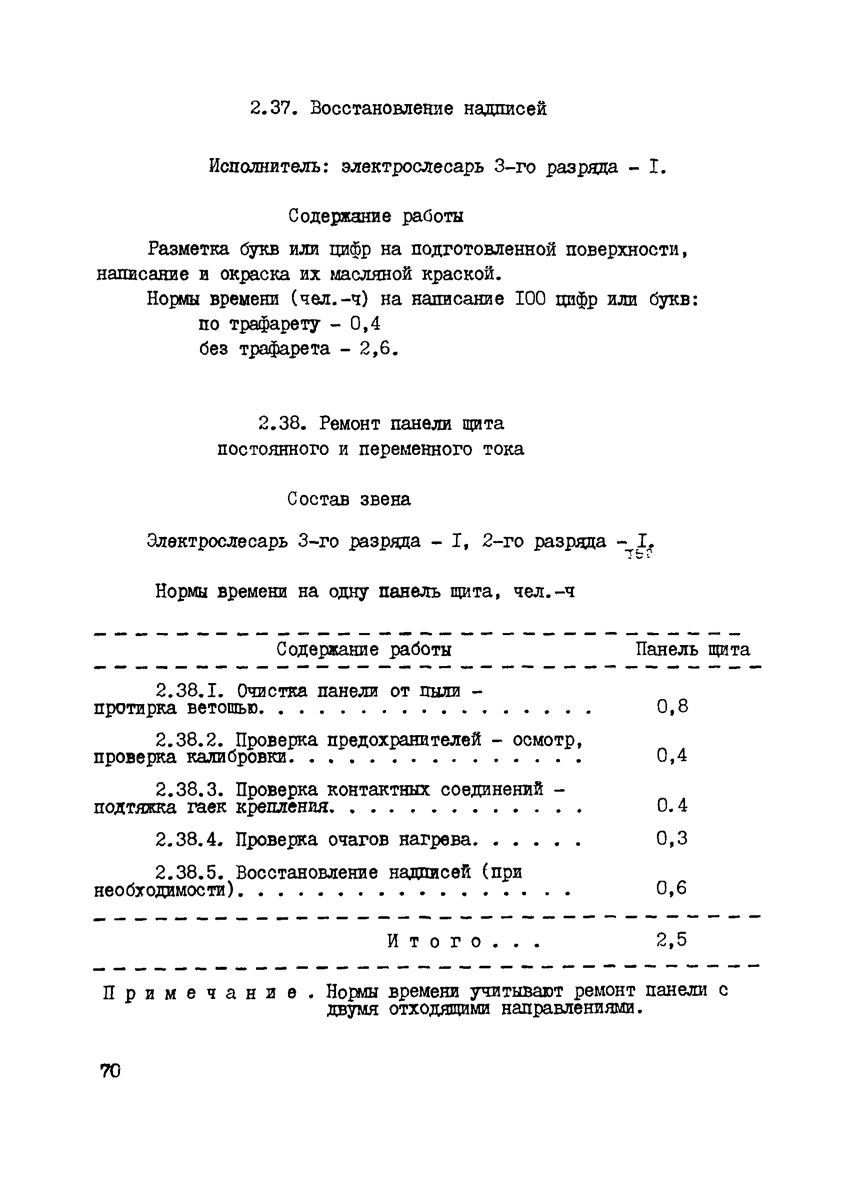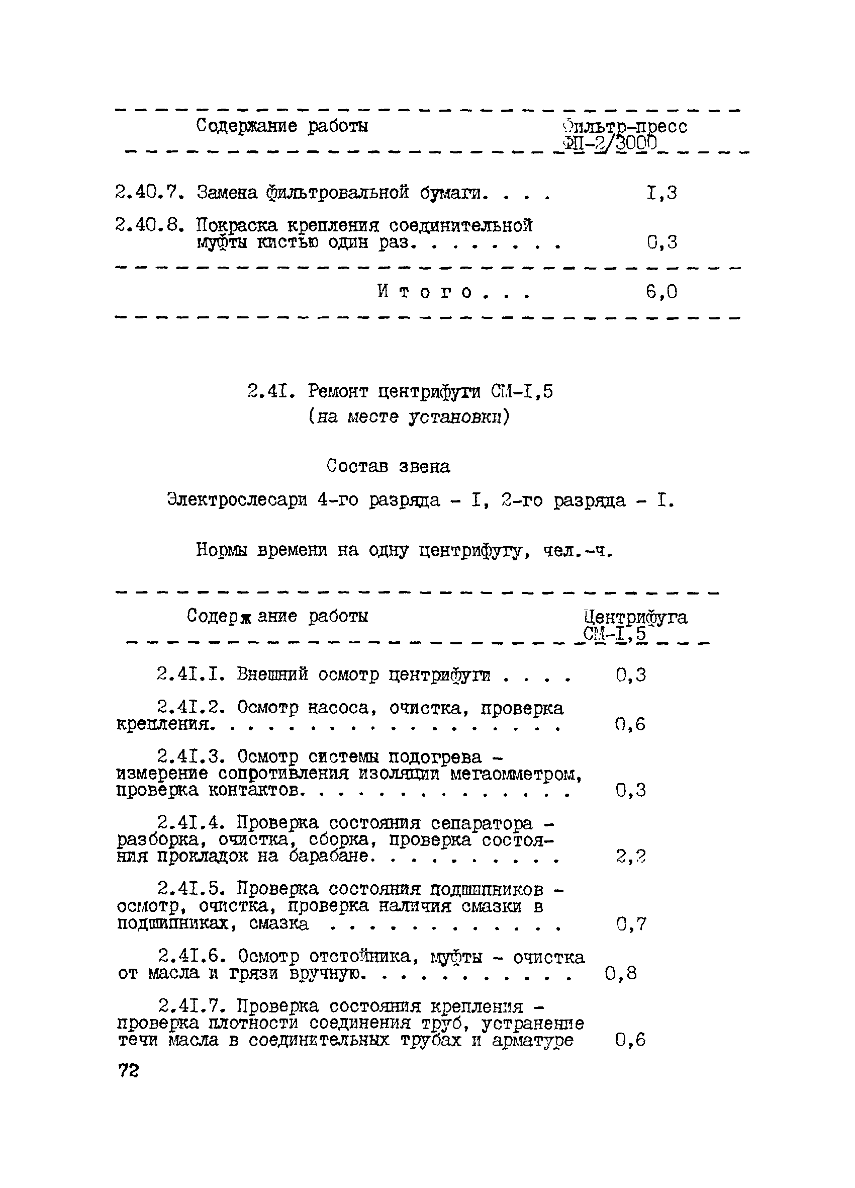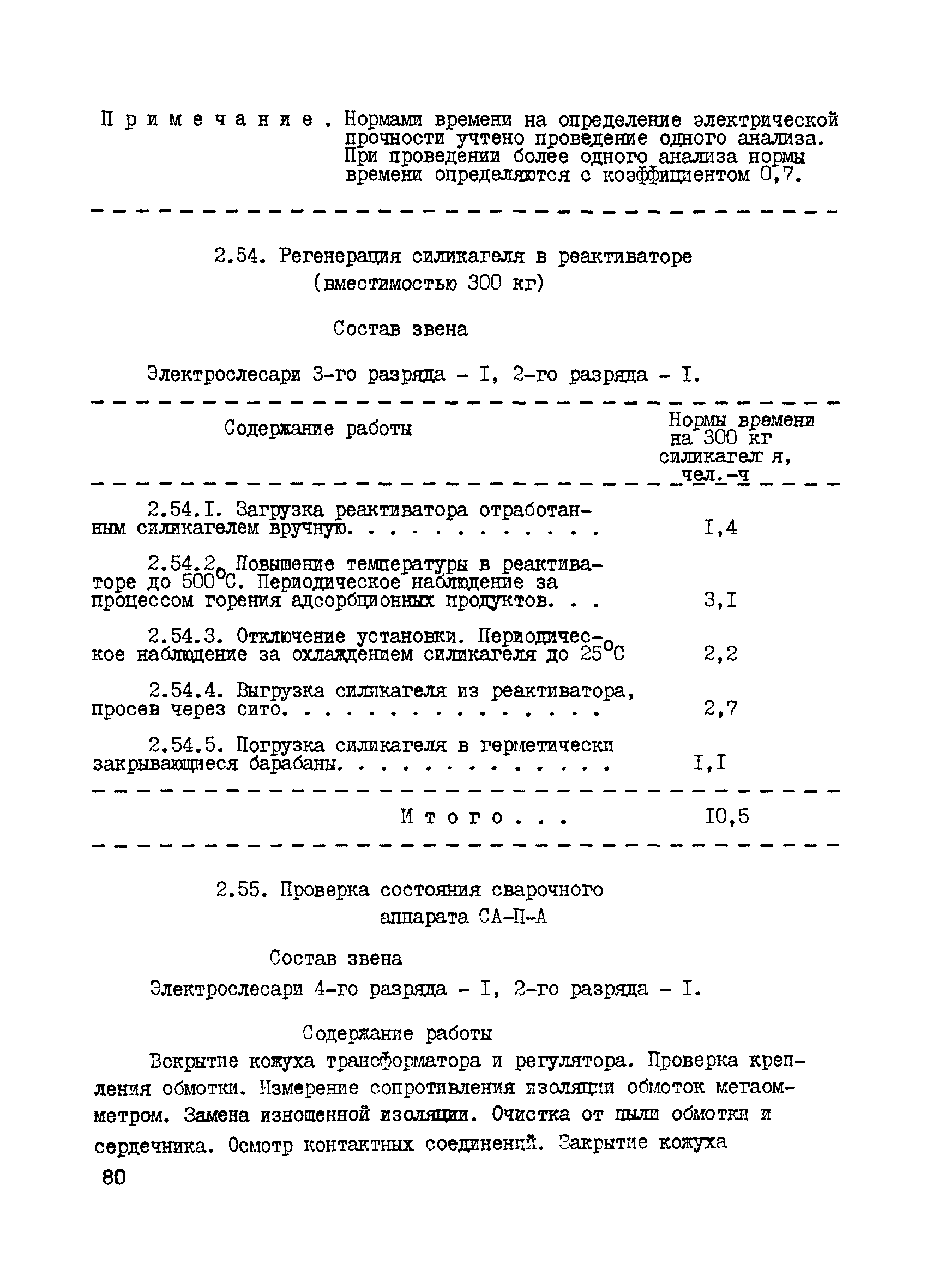 Нормы времени на капитальный, текущий ремонты и техническое обслуживание оборудования подстанций напряжением 35 - 500 кВ. Часть II. Текущий ремонт и техническое обслуживание| Статус: | справочные материалы, мп, тпр | | Название рус.: | Нормы времени на капитальный, текущий ремонты и техническое обслуживание оборудования подстанций напряжением 35 - 500 кВ. Часть II. Текущий ремонт и техническое обслуживание | | Дата добавления в базу: | 01.09.2013 | | Дата актуализации: | 01.01.2021 | | Область применения: | Нормы применяются при капитальном, ткущем ремонтах и техническом обслуживании оборудования подстанций напряжением 35 - 500 кВ. | | Оглавление: | 2. Текущий ремонт и техническое обслуживание 2.1 Синхронные компенсаторы с водородным охлаждением КСВ-100. КСВ-75, КСВ-50, КСВ-37,5 2.2 Синхронные компенсаторы с воздушным охлаждением КС-30, КС-15, КС-10, КС -7,5 2.3 Воздушные выключатели с воздухонаполненным отделителем ВВ-500, ВВ-500Б, ВВ-330, ВВН-330-15, ВВН-220-15, ВВН-220-10, ВВН-154-8, ВВН-110-6, ВВШ-154В, ВВШ-110 2.4 Воздушные выключатели ВВН-220/1000-7000, ВВН-220/2000-7000, ВВ-220, ВВН-154/800-4000, ВН-40001, ВВ-2503, ВВН-110/800-4000 2.5 Воздушные выключатели ВВБ-330, ВВД-330, ВВБ-220-12. ВВБ-220-У-15, ВВУ-110-40/2000 2.6 Воздушные выключатели ВВН-35, ВВН-35-2, ВВУ-35 2.7 Воздушные выключатели ВВ-15-6000. ВВ-15-5500, ВВ-15-600 2.8 Масляные выключатели МКП-220, У-220, У-220М, МКП-180, МКП-160, МКП-110, МКП-110М, У-110 2.9 Масляные выключатели ВМК-110, ВМК-35 2.10 Масляные выключатели МГ-110 2.11 Масляные выключатели МКП-35, ВМ-35, ВМД-35, С-35, ВТД-35 2.12 Масляные выключатели ВМП-35П, ВМПЭ-35, ВМП-10, ВМП-10П, ВМП-10К, ВМПП-10, ВМГ-133. ВМГ-10, ВММ-10, ВГ-10, МГГ-10 2.13 Электромагнитные выключатели ВЭМ-6-2000/40-125, ВЭМ-6-3200/40-125 2.14 Масляные выключатели ВМ-23. ВМ-22, ВМ-16, ВМ-14, ВМ-10, ВМБ-10, ВМП-16, ВМП-14 2.15 Разъединители РОНЗ-I-500, РОНЗ-I-330, РОНЗ-I-220 2.16 Разъединители РЛНД-500, РНД-330. РЛНД-220, РЛНД-150, РЛНД-110, РЛНД-35, РЛНД-100, РДНД-6 2.17 Разъединители РЛНЗ-220, РЛНЗ-150, РЛН-110, РЛН-35. РЛН-10, РЛН-6 2.18 Шинный разъединитель РВК-10/3000 одного присоединения 2.19 Отделители ОД-220М. ОД-150М, ОД-110М, ОДЗ-110М, ОД-35, ОДЗ-35 2.20 Короткозамыкатели КЗ-220М, КЗ-150М, КЗ-110М, КЗ-35 2.21 Трансформаторы напряжения НКФ-500, НКФ-330, НКФ-220, НКФ-150, НКФ-110, ЗНОМ-35, НОМ-10, НОМ-6 2.22 Трансформаторы тока ТФКНД-500, ТФКН-330, ТРН-330, ТФНД-220, ТФНД-150, ТФНД-110, ТФНД-35, ТПФЛ-10 2.23 Компрессоры ВШ-3/40, ВКУ-60/40 2.24 Разрядники РВМК-500, РВМГ-500, РВМК-330, РВМГ-330, РВМГ-154, РВС-330, РВС-220, РВС-154, РВС-110. РВС-35, РВП-10, РВП-6 2.25 Высокочастотные заградители ВЗ-2000-1,2, ВЗ-1000-0,6, ВЗ-600-0,25 2.26 Система шин ЗРУ-6-10 кВ 2.27 Система шин ОРУ-500, 330, 220, 150, 110, 25 кВ 2.28 Конденсаторы связи СМР-166/3-0,014, СМР-133/3-0.0186, СМР-110/3-0,0064, СМР-66/3-0,0044, СММ-20.3-0,107 2.29 Аккумуляторные батареи СК-16. СК-12, СК-10, СК-8, СК-6, СК-3, СК22, СК-1 2.30 Сухой реактор РБ-10 (600А) 2.31 Масляный токоограничивающий реактор РТДТ-35-1000-10 наружной установки 2.32 Ремонт двигателей -генераторов 2.33 Проверка состояния магнитных пускателей ПА-522 (на месте установки) 2.34 Осмотр и очистка кабельных каналов 2.35 Ремонт воздухосборников 2.36 Проверка состояния воздухопроводной сети 2.37. Восстановление надписей 2.38 Ремонт панели щита постоянного и переменного тока 2.39 Ремонт дистиллятора АА-1 2.40 Ремонт фильтр-пресса ФП-2/3000 2.41 Ремонт центрифуги СМ-1,5 (на месте установки) 2.42 Ремонт предохранителей ПК-6(7,5 А), ПК-10 (20А) 2.43 Ремонт стреляющего предохранителя ПСН-35 2.44 Проверка состояния противопожарного инвентаря 2.45 Замена баллонов с углекислым газом 2.46 Измерение распределения напряжения по элементам изоляторов ИШД-35 и ШТ-35 (штангой) 2.47 Ремонт переносных заземлений для устро