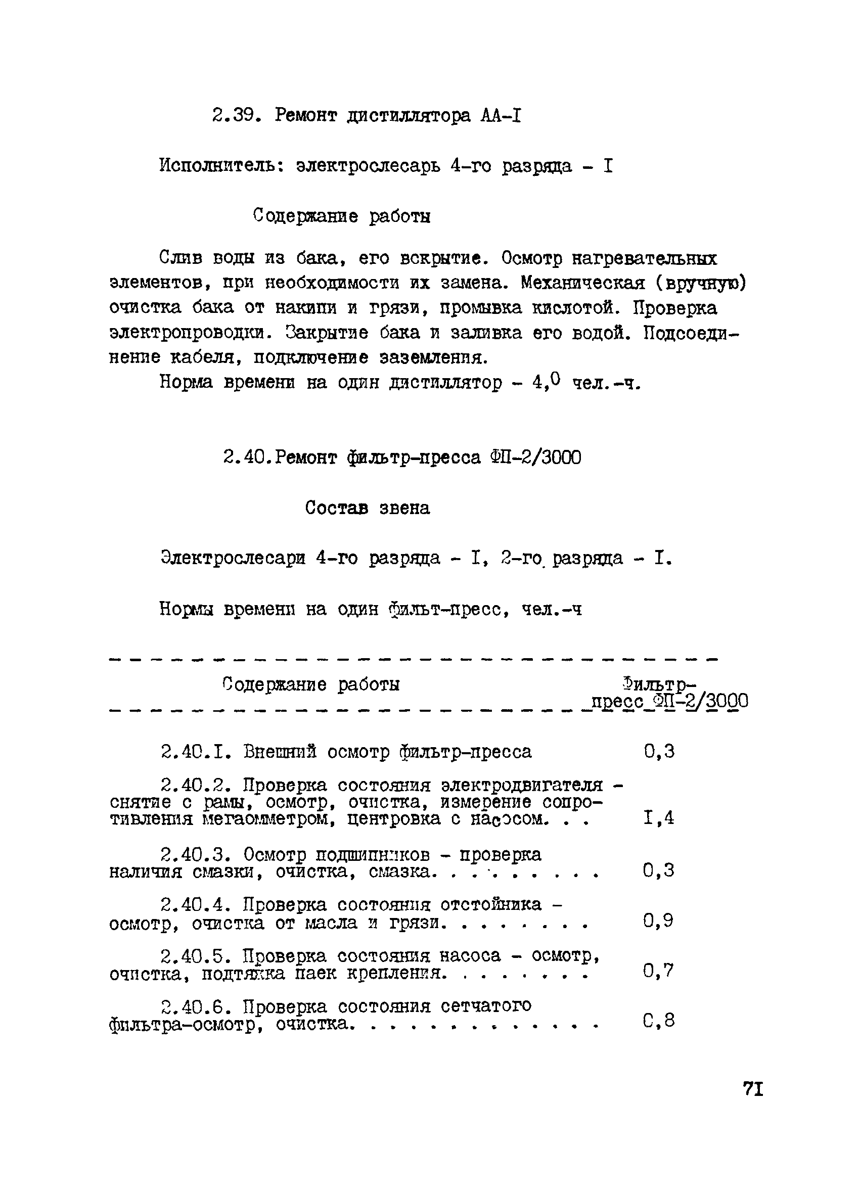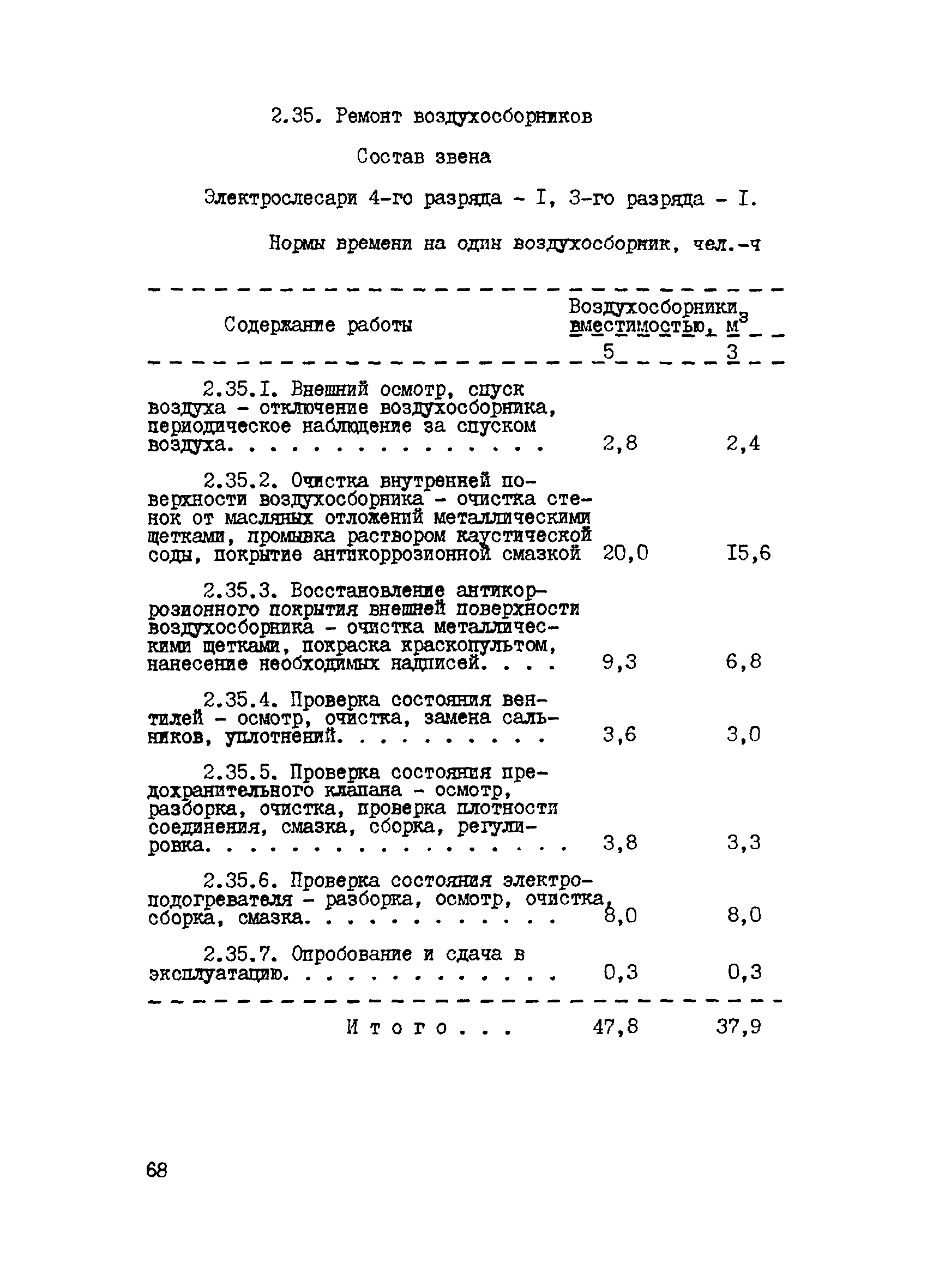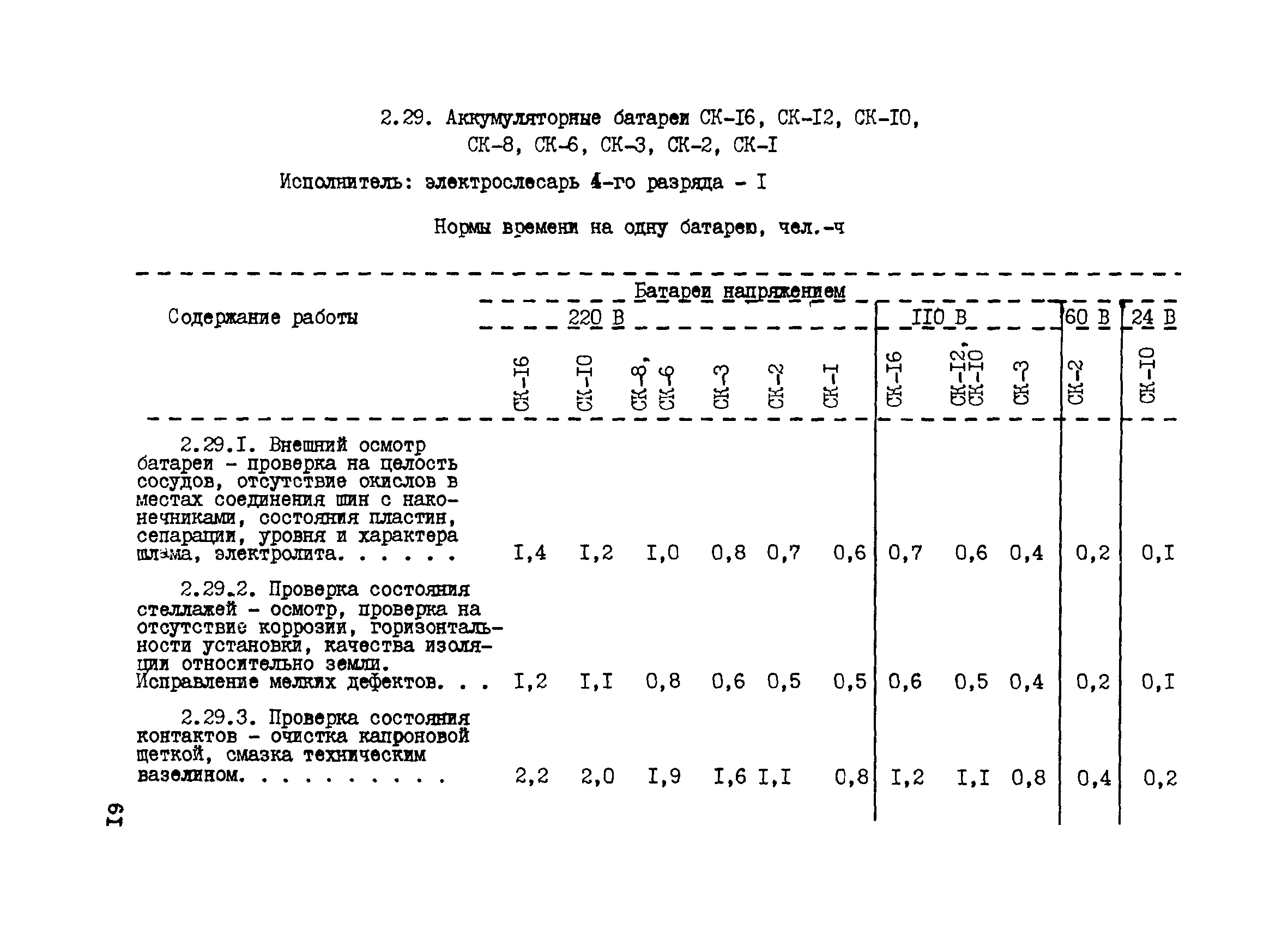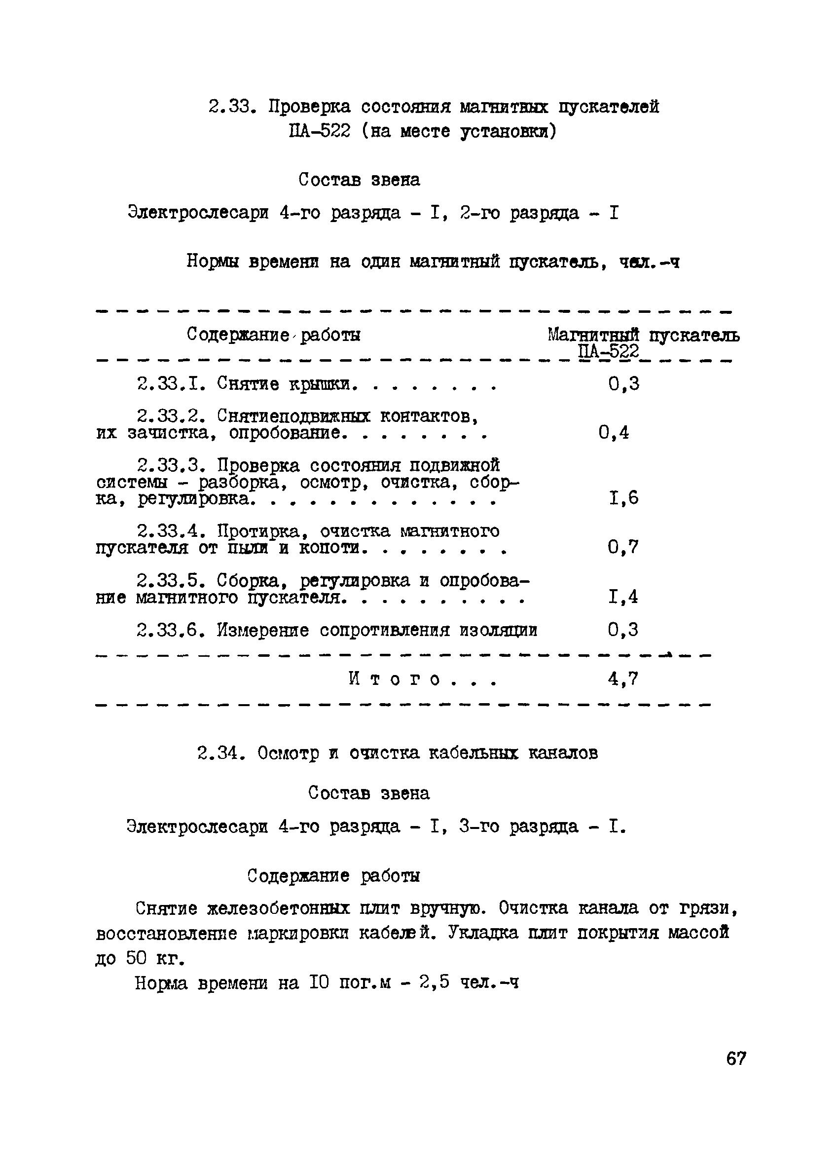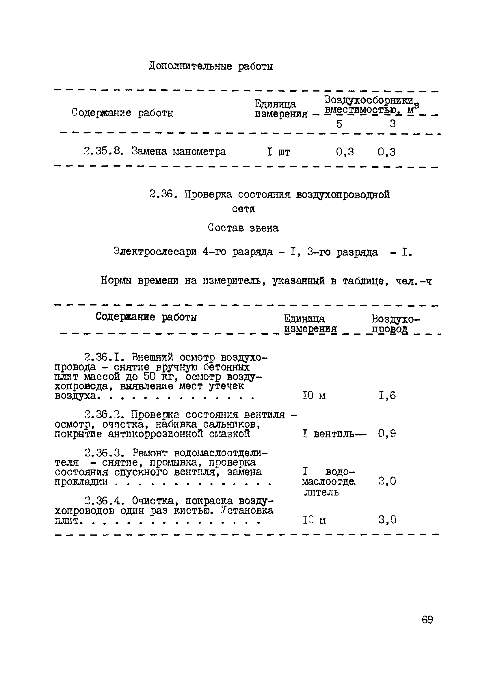 Нормы времени на капитальный, текущий ремонты и техническое обслуживание оборудования подстанций напряжением 35 - 500 кВ. Часть II. Текущий ремонт и техническое обслуживание| Статус: | справочные материалы, мп, тпр | | Название рус.: | Нормы времени на капитальный, текущий ремонты и техническое обслуживание оборудования подстанций напряжением 35 - 500 кВ. Часть II. Текущий ремонт и техническое обслуживание | | Дата добавления в базу: | 01.09.2013 | | Дата актуализации: | 01.01.2021 | | Область применения: | Нормы применяются при капитальном, ткущем ремонтах и техническом обслуживании оборудования подстанций напряжением 35 - 500 кВ. | | Оглавление: | 2. Текущий ремонт и техническое обслуживание 2.1 Синхронные компенсаторы с водородным охлаждением КСВ-100. КСВ-75, КСВ-50, КСВ-37,5 2.2 Синхронные компенсаторы с воздушным охлаждением КС-30, КС-15, КС-10, КС -7,5 2.3 Воздушные выключатели с воздухонаполненным отделителем ВВ-500, ВВ-500Б, ВВ-330, ВВН-330-15, ВВН-220-15, ВВН-220-10, ВВН-154-8, ВВН-110-6, ВВШ-154В, ВВШ-110 2.4 Воздушные выключатели ВВН-220/1000-7000, ВВН-220/2000-7000, ВВ-220, ВВН-154/800-4000, ВН-40001, ВВ-2503, ВВН-110/800-4000 2.5 Воздушные выключатели ВВБ-330, ВВД-330, ВВБ-220-12. ВВБ-220-У-15, ВВУ-110-40/2000 2.6 Воздушные выключатели ВВН-35, ВВН-35-2, ВВУ-35 2.7 Воздушные выключатели ВВ-15-6000. ВВ-15-5500, ВВ-15-600 2.8 Масляные выключатели МКП-220, У-220, У-220М, МКП-180, МКП-160, МКП-110, МКП-110М, У-110 2.9 Масляные выключатели ВМК-110, ВМК-35 2.10 Масляные выключатели МГ-110 2.11 Масляные выключатели МКП-35, ВМ-35, ВМД-35, С-35, ВТД-35 2.12 Масляные выключатели ВМП-35П, ВМПЭ-35, ВМП-10, ВМП-10П, ВМП-10К, ВМПП-10, ВМГ-133. ВМГ-10, ВММ-10, ВГ-10, МГГ-10 2.13 Электромагнитные выключатели ВЭМ-6-2000/40-125, ВЭМ-6-3200/40-125 2.14 Масляные выключатели ВМ-23. ВМ-22, ВМ-16, ВМ-14, ВМ-10, ВМБ-10, ВМП-16, ВМП-14 2.15 Разъединители РОНЗ-I-500, РОНЗ-I-330, РОНЗ-I-220 2.16 Разъединители РЛНД-500, РНД-330. РЛНД-220, РЛНД-150, РЛНД-110, РЛНД-35, РЛНД-100, РДНД-6 2.17 Разъединители РЛНЗ-220, РЛНЗ-150, РЛН-110, РЛН-35. РЛН-10, РЛН-6 2.18 Шинный разъединитель РВК-10/3000 одного присоединения 2.19 Отделители ОД-220М. ОД-150М, ОД-110М, ОДЗ-110М, ОД-35, ОДЗ-35 2.20 Короткозамыкатели КЗ-220М, КЗ-150М, КЗ-110М, КЗ-35 2.21 Трансформаторы напряжения НКФ-500, НКФ-330, НКФ-220, НКФ-150, НКФ-110, ЗНОМ-35, НОМ-10, НОМ-6 2.22 Трансформаторы тока ТФКНД-500, ТФКН-330, ТРН-330, ТФНД-220, ТФНД-150, ТФНД-110, ТФНД-35, ТПФЛ-10 2.23 Компрессоры ВШ-3/40, ВКУ-60/40 2.24 Разрядники РВМК-500, РВМГ-500, РВМК-330, РВМГ-330, РВМГ-154, РВС-330, РВС-220, РВС-154, РВС-110. РВС-35, РВП-10, РВП-6 2.25 Высокочастотные заградители ВЗ-2000-1,2, ВЗ-1000-0,6, ВЗ-600-0,25 2.26 Система шин ЗРУ-6-10 кВ 2.27 Система шин ОРУ-500, 330, 220, 150, 110, 25 кВ 2.28 Конденсаторы связи СМР-166/3-0,014, СМР-133/3-0.0186, СМР-110/3-0,0064, СМР-66/3-0,0044, СММ-20.3-0,107 2.29 Аккумуляторные батареи СК-16. СК-12, СК-10, СК-8, СК-6, СК-3, СК22, СК-1 2.30 Сухой реактор РБ-10 (600А) 2.31 Масляный токоограничивающий реактор РТДТ-35-1000-10 наружной установки 2.32 Ремонт двигателей -генераторов 2.33 Проверка состояния магнитных пускателей ПА-522 (на месте установки) 2.34 Осмотр и очистка кабельных каналов 2.35 Ремонт воздухосборников 2.36 Проверка состояния воздухопроводной сети 2.37. Восстановление надписей 2.38 Ремонт панели щита постоянного и переменного тока 2.39 Ремонт дистиллятора АА-1 2.40 Ремонт фильтр-пресса ФП-2/3000 2.41 Ремонт центрифуги СМ-1,5 (на месте установки) 2.42 Ремонт предохранителей ПК-6(7,5 А), ПК-10 (20А) 2.43 Ремонт стреляющего предохранителя ПСН-35 2.44 Проверка состояния противопожарного инвентаря 2.45 Замена баллонов с углекислым газом 2.46 Измерение распределения напряжения по элементам изоляторов ИШД-35 и ШТ-35 (штангой) 2.47 Ремонт переносных заземлений для устро