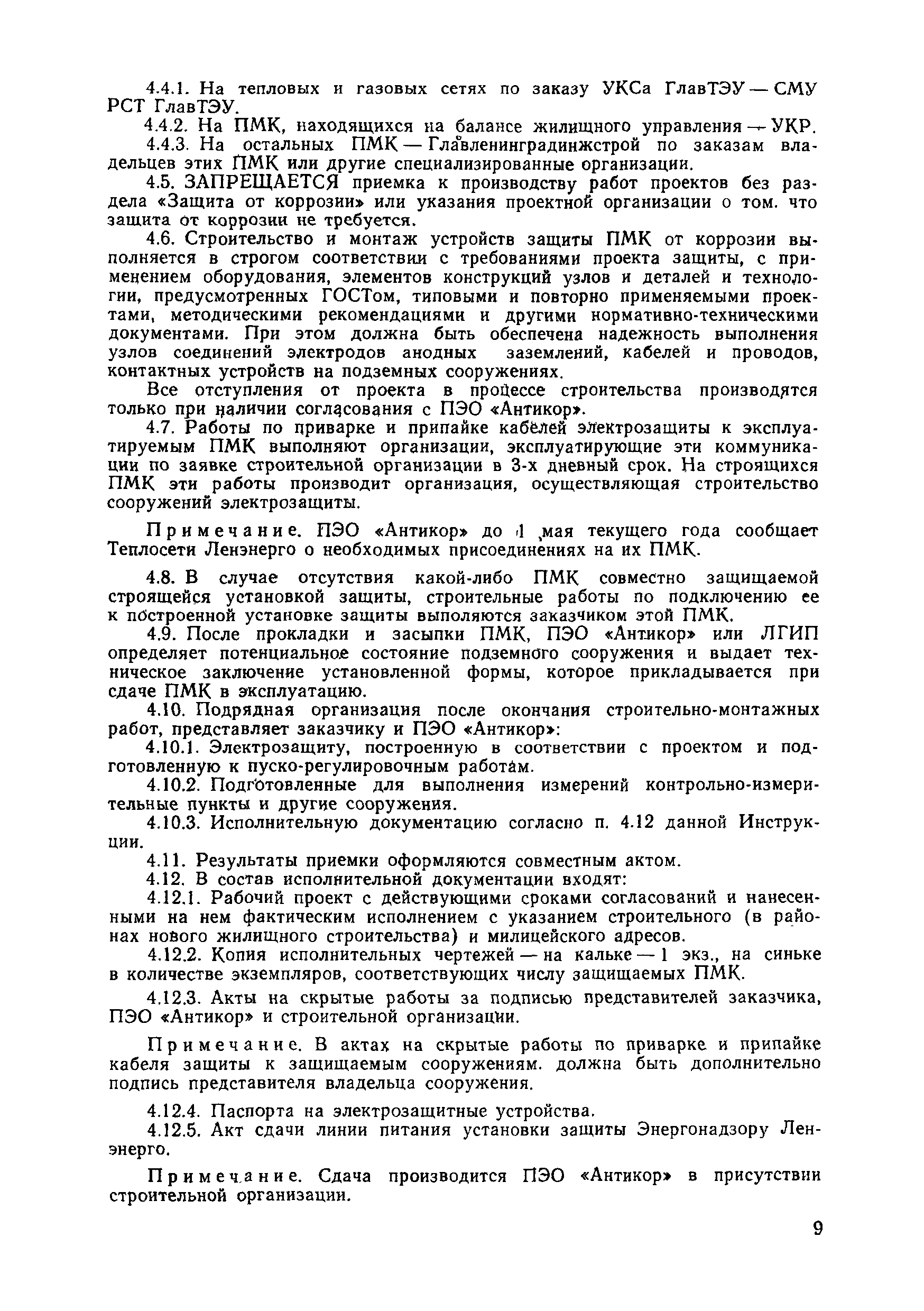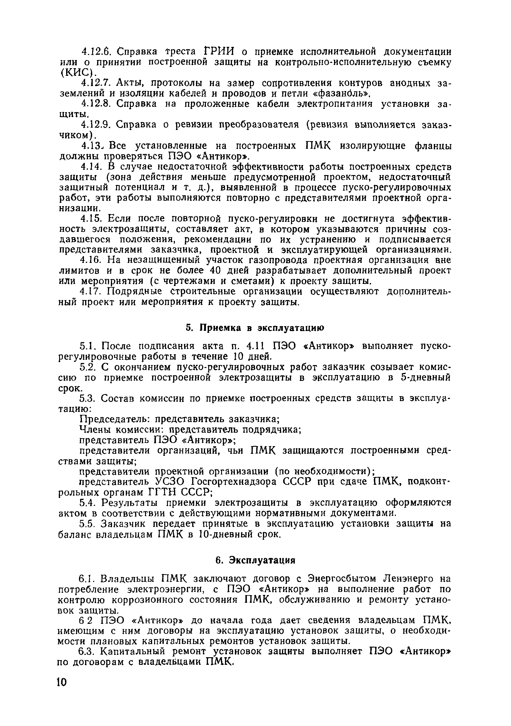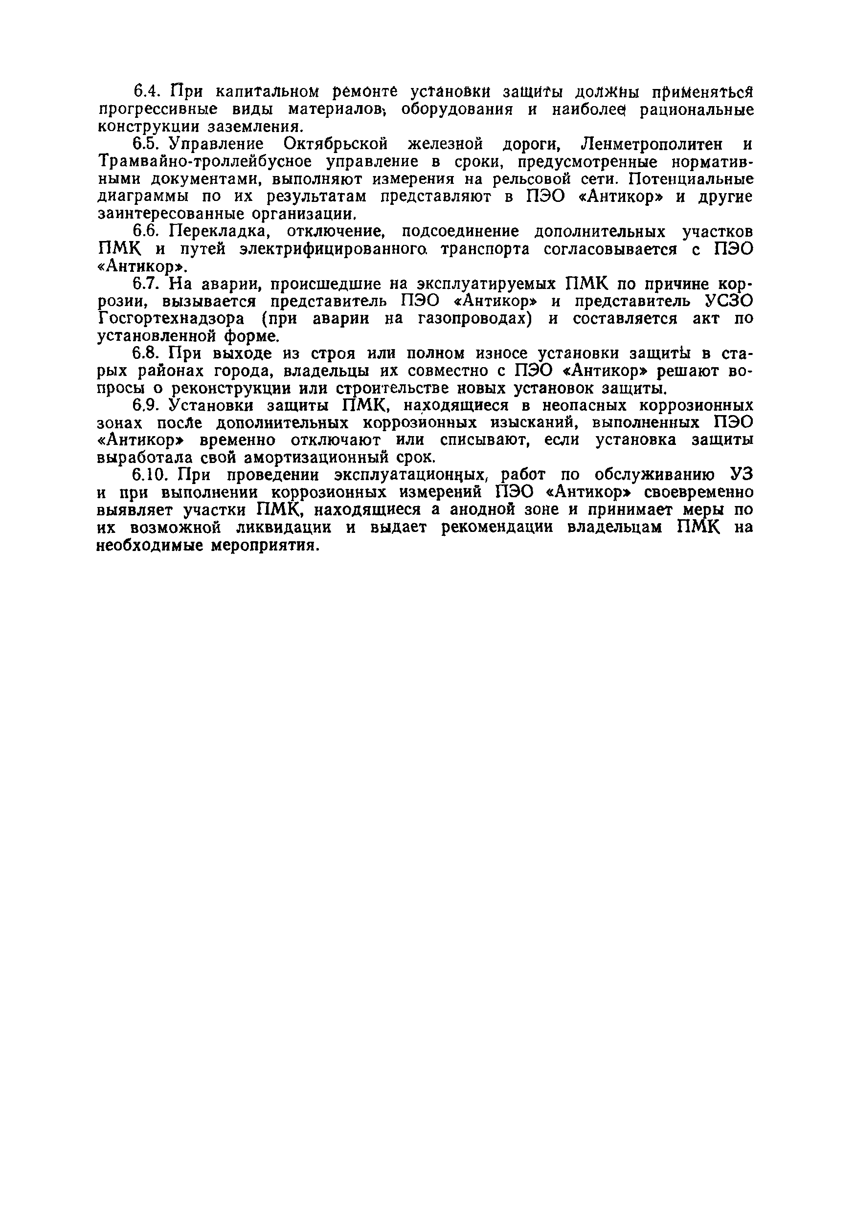 Инструкция о порядке проектирования, строительства и эксплуатации устройств защиты от коррозии подземных металлических коммуникаций на территории Ленинграда и его пригородов| Статус: | не установлен срок действия | | Название рус.: | Инструкция о порядке проектирования, строительства и эксплуатации устройств защиты от коррозии подземных металлических коммуникаций на территории Ленинграда и его пригородов | | Дата добавления в базу: | 01.09.2013 | | Дата актуализации: | 01.01.2021 | | Область применения: | Инструкция устанавливает единый порядок по вопросам проектирования, строительства и эксплуатации ПМК, распространяется на все действующие и строящиеся ПМК, в частности: газопроводы, тепловые сети, стальные водопроводы, кабельные сети связи и др., расположенные на территории города независимо от их ведомственной принадлежности. Инструкция обязательна для всех организаций, ведущих проектирование, строительство и эксплуатацию подземных металлических коммуникаций (ПМК), а также для предприятий, сооружения которых являются источниками блуждающих токов. | | Оглавление: | 1. Общие положения 2. Обязанности организаций 3. Проектирование 4. Строительство 5. Приемка в эксплуатацию 6. Эксплуатация | | Утверждён: | 10.09.1984 Исполком Ленсовета (Lensoviet Ispolkom 609)
