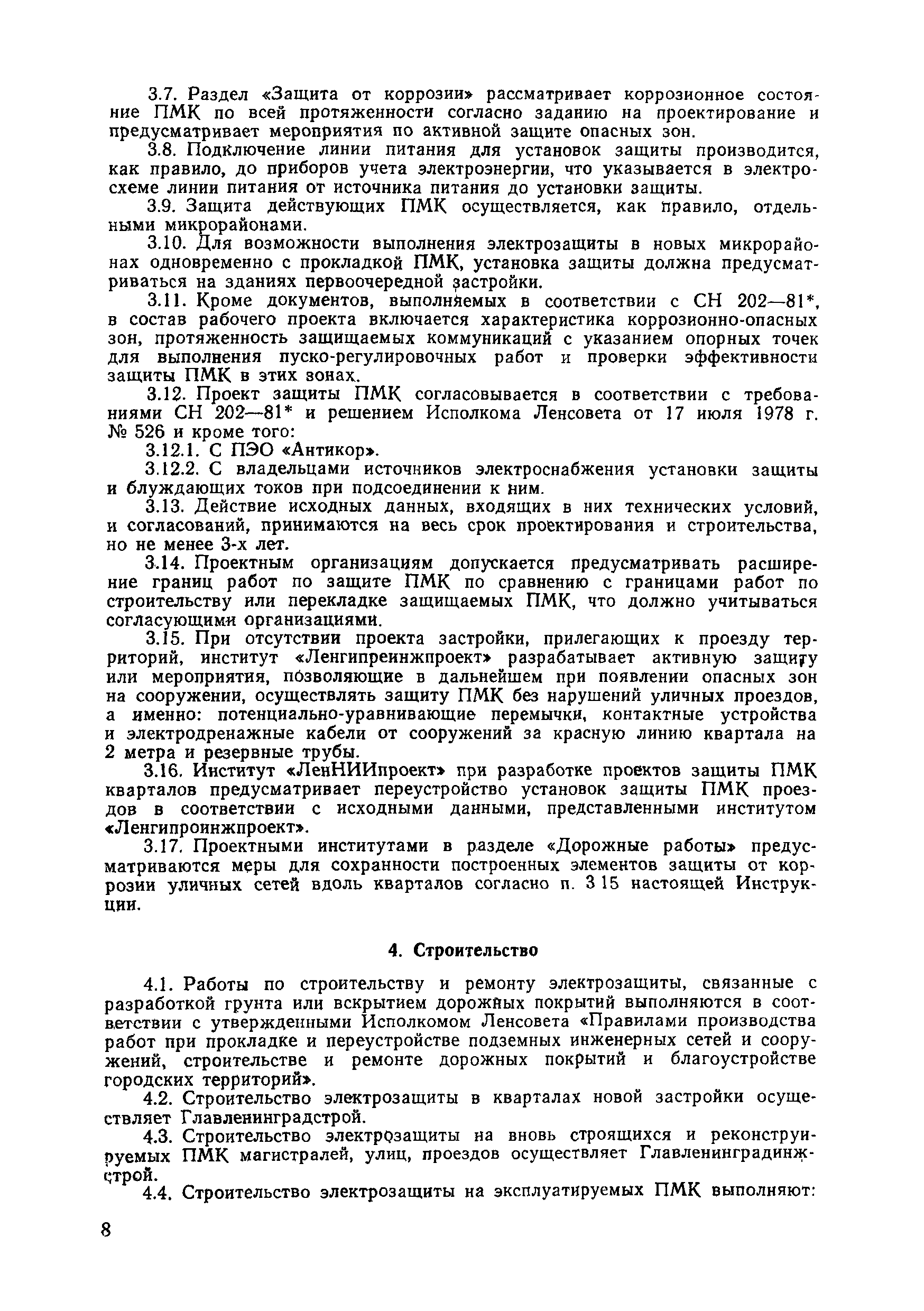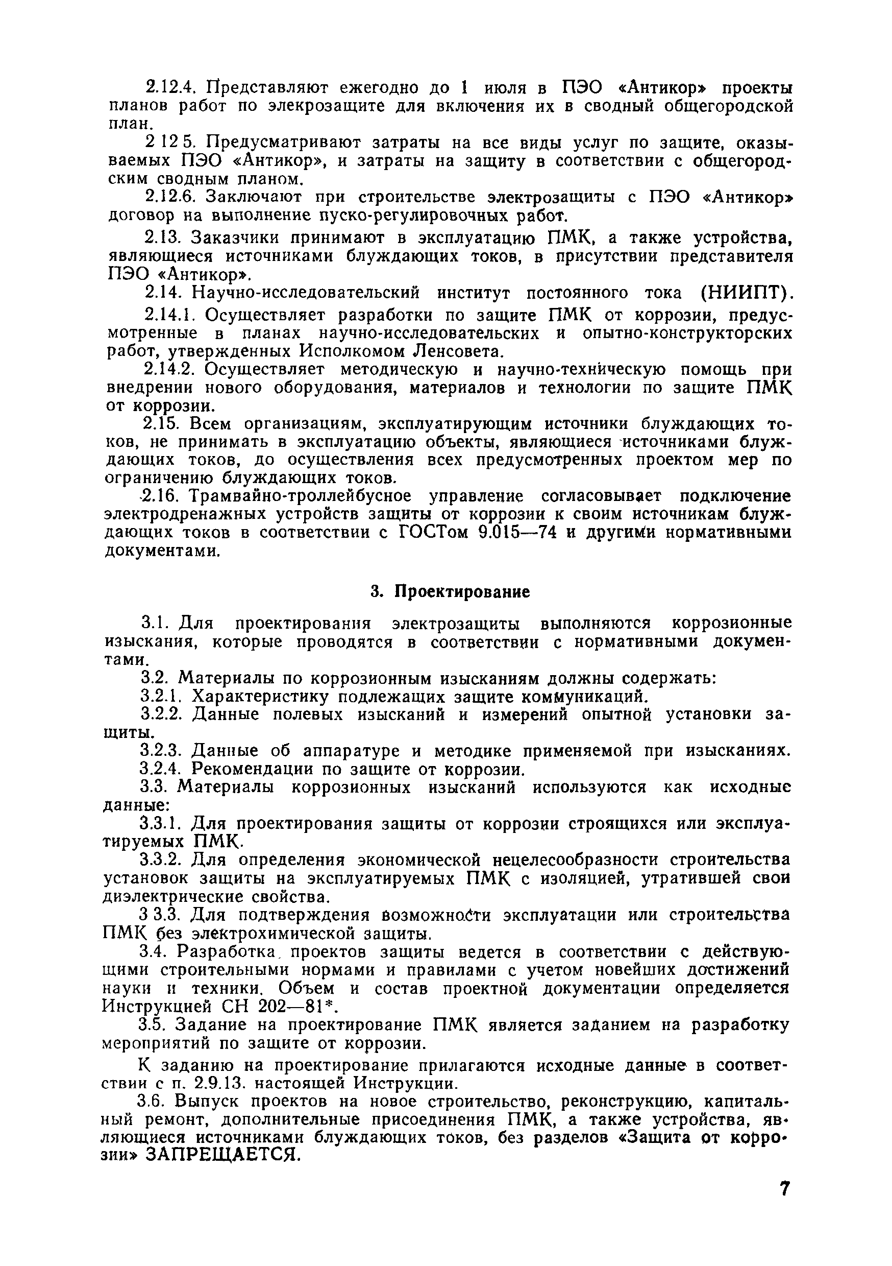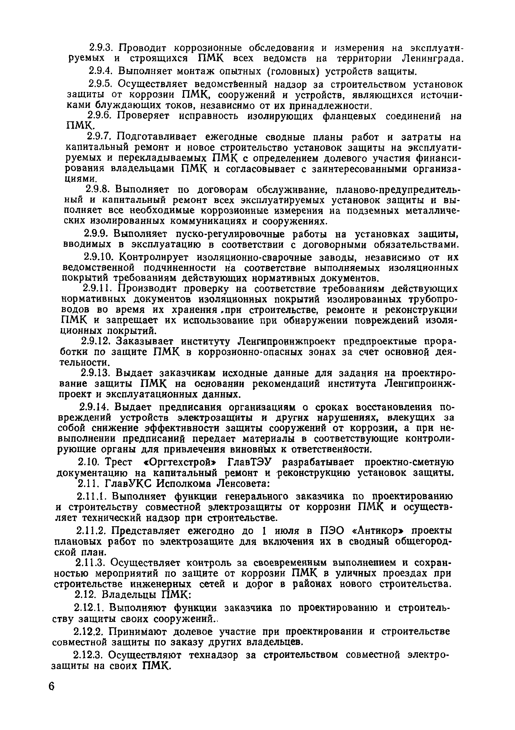 Инструкция о порядке проектирования, строительства и эксплуатации устройств защиты от коррозии подземных металлических коммуникаций на территории Ленинграда и его пригородов| Статус: | не установлен срок действия | | Название рус.: | Инструкция о порядке проектирования, строительства и эксплуатации устройств защиты от коррозии подземных металлических коммуникаций на территории Ленинграда и его пригородов | | Дата добавления в базу: | 01.09.2013 | | Дата актуализации: | 01.01.2021 | | Область применения: | Инструкция устанавливает единый порядок по вопросам проектирования, строительства и эксплуатации ПМК, распространяется на все действующие и строящиеся ПМК, в частности: газопроводы, тепловые сети, стальные водопроводы, кабельные сети связи и др., расположенные на территории города независимо от их ведомственной принадлежности. Инструкция обязательна для всех организаций, ведущих проектирование, строительство и эксплуатацию подземных металлических коммуникаций (ПМК), а также для предприятий, сооружения которых являются источниками блуждающих токов. | | Оглавление: | 1. Общие положения 2. Обязанности организаций 3. Проектирование 4. Строительство 5. Приемка в эксплуатацию 6. Эксплуатация | | Утверждён: | 10.09.1984 Исполком Ленсовета (Lensoviet Ispolkom 609)
