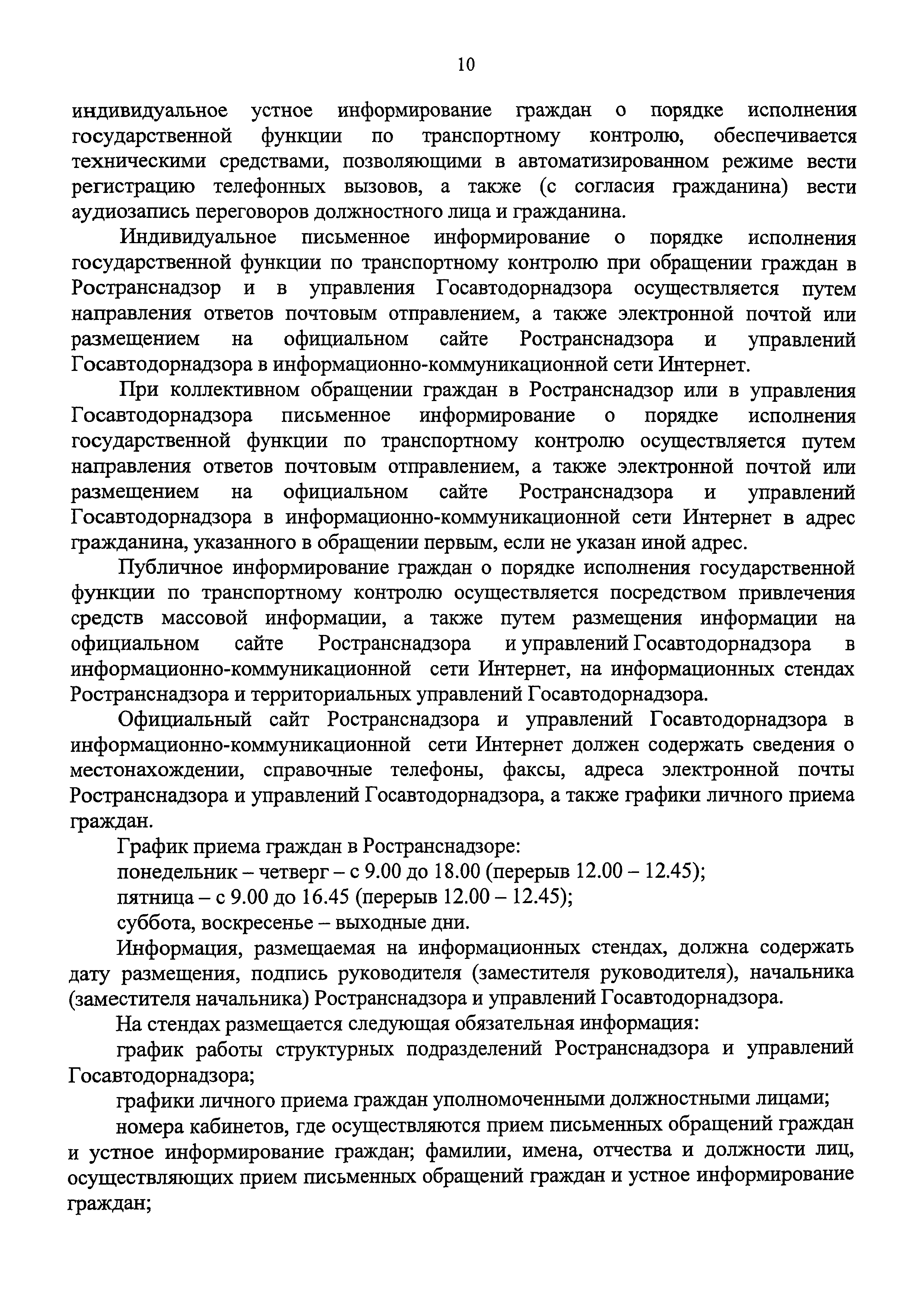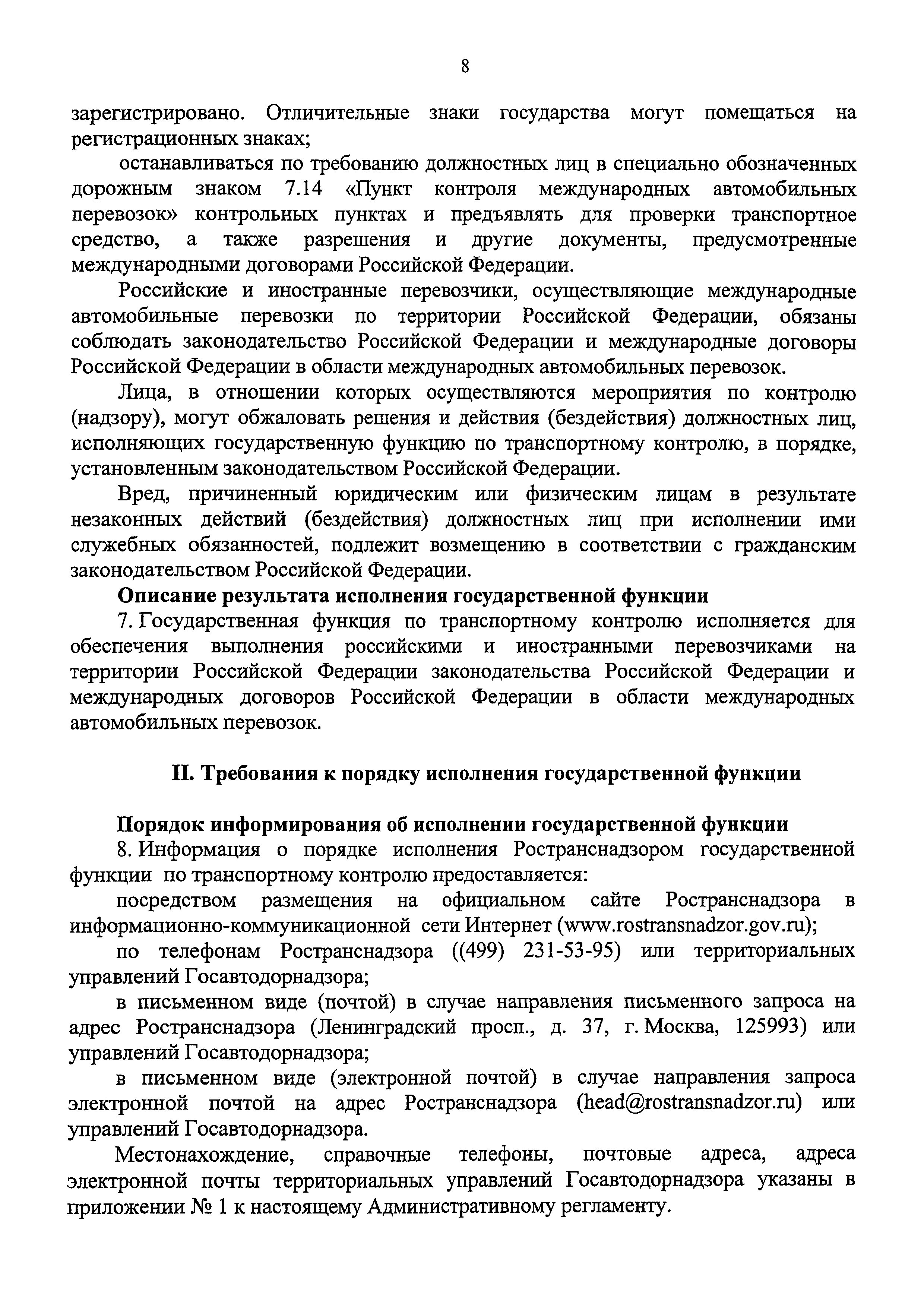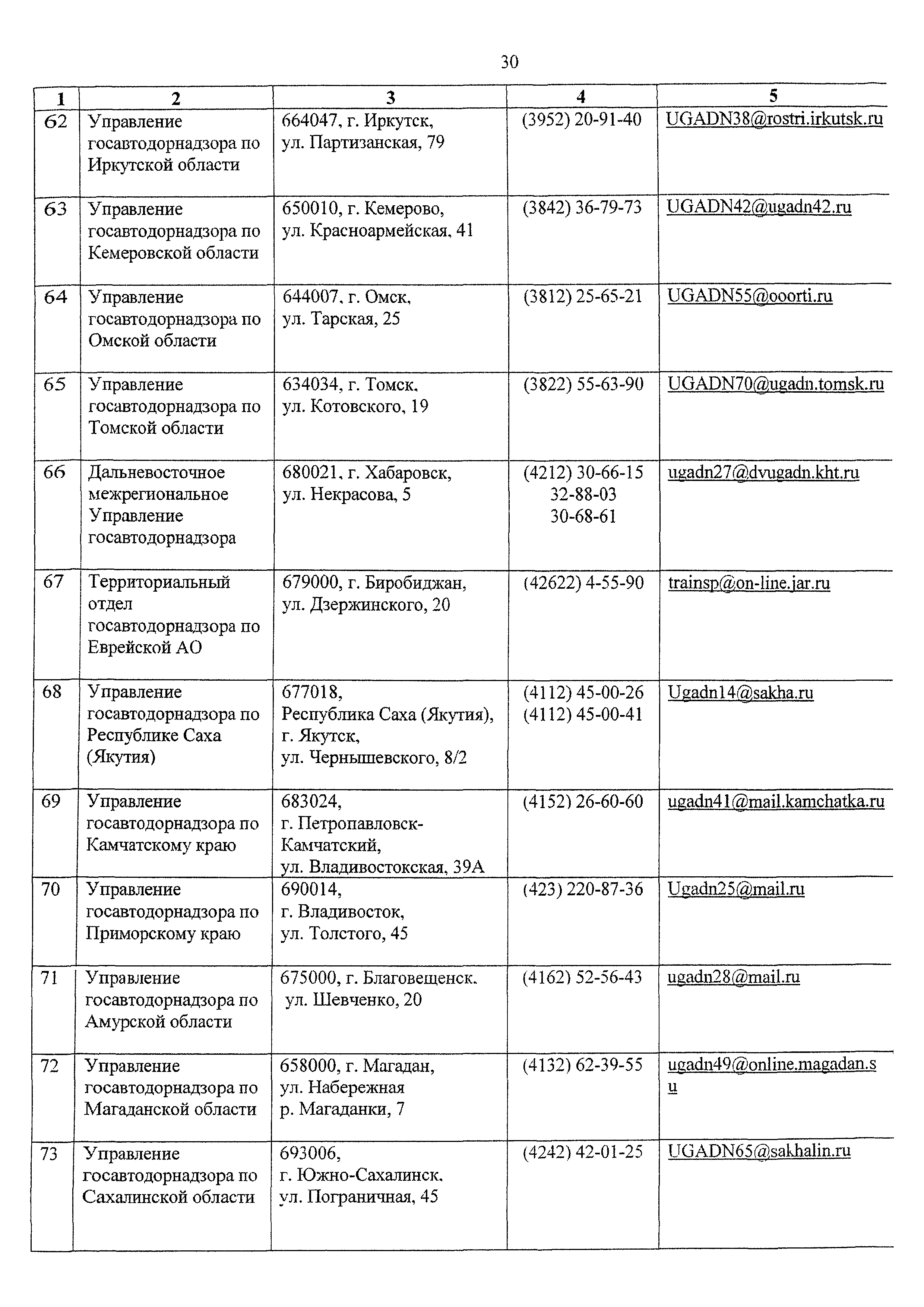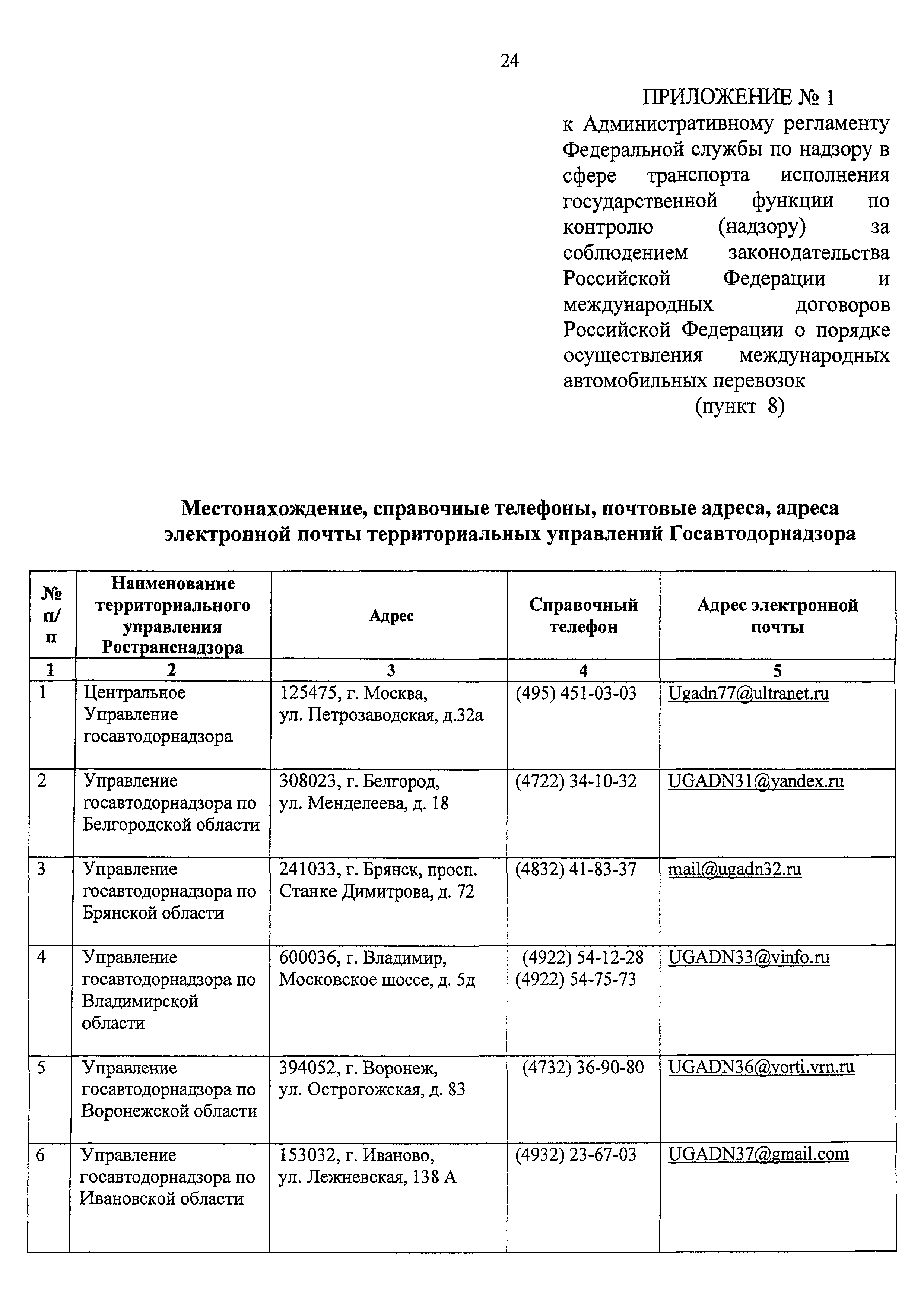 | Оглавление: | I. Общие положения II. Требования к порядку исполнения государственной функции III. Состав, последовательность и сроки выполнения административных процедур (действий), требования к порядку их выполнения, в том числе особенности выполнения административных процедур (действий) в электронной форме IV. Порядок и формы контроля за исполнением государственной функции V. Досудебный (внесудебный) порядок обжалования решений и действий (бездействия) Ространснадзора и (или) управления Госавтодорнадзора, исполняющих государственную функцию, а также их должностных лиц Приложение № 1. Местонахождение, справочные телефоны, почтовые адреса, адреса электронной почты территориальных управлений Госавтодорнадзора |