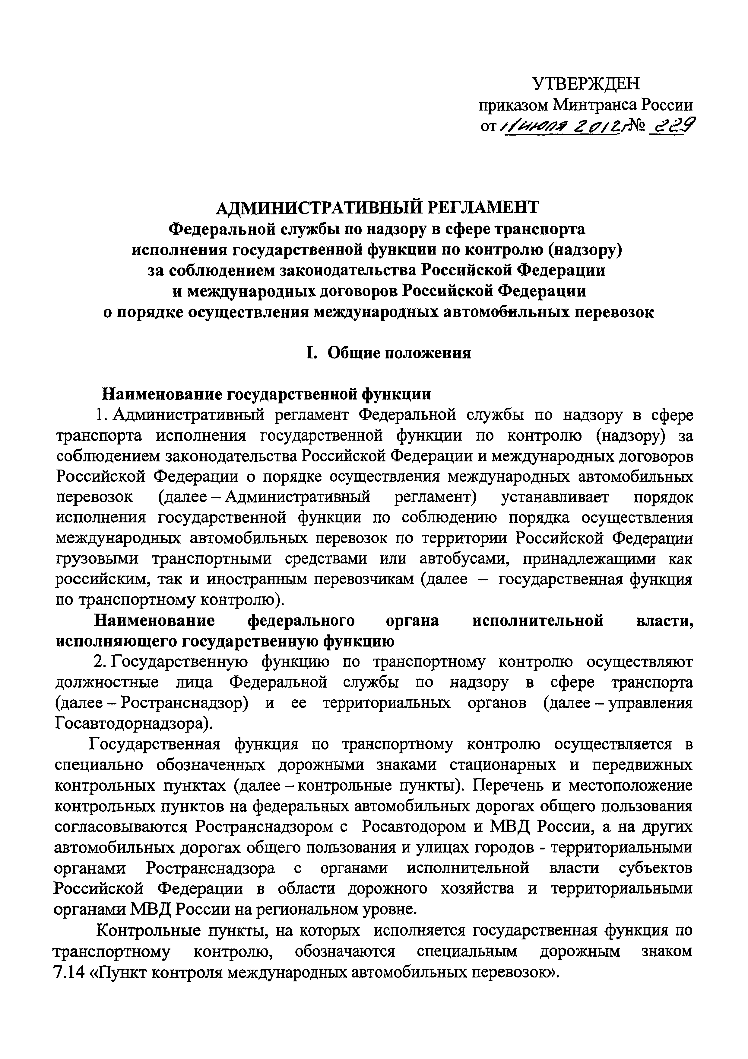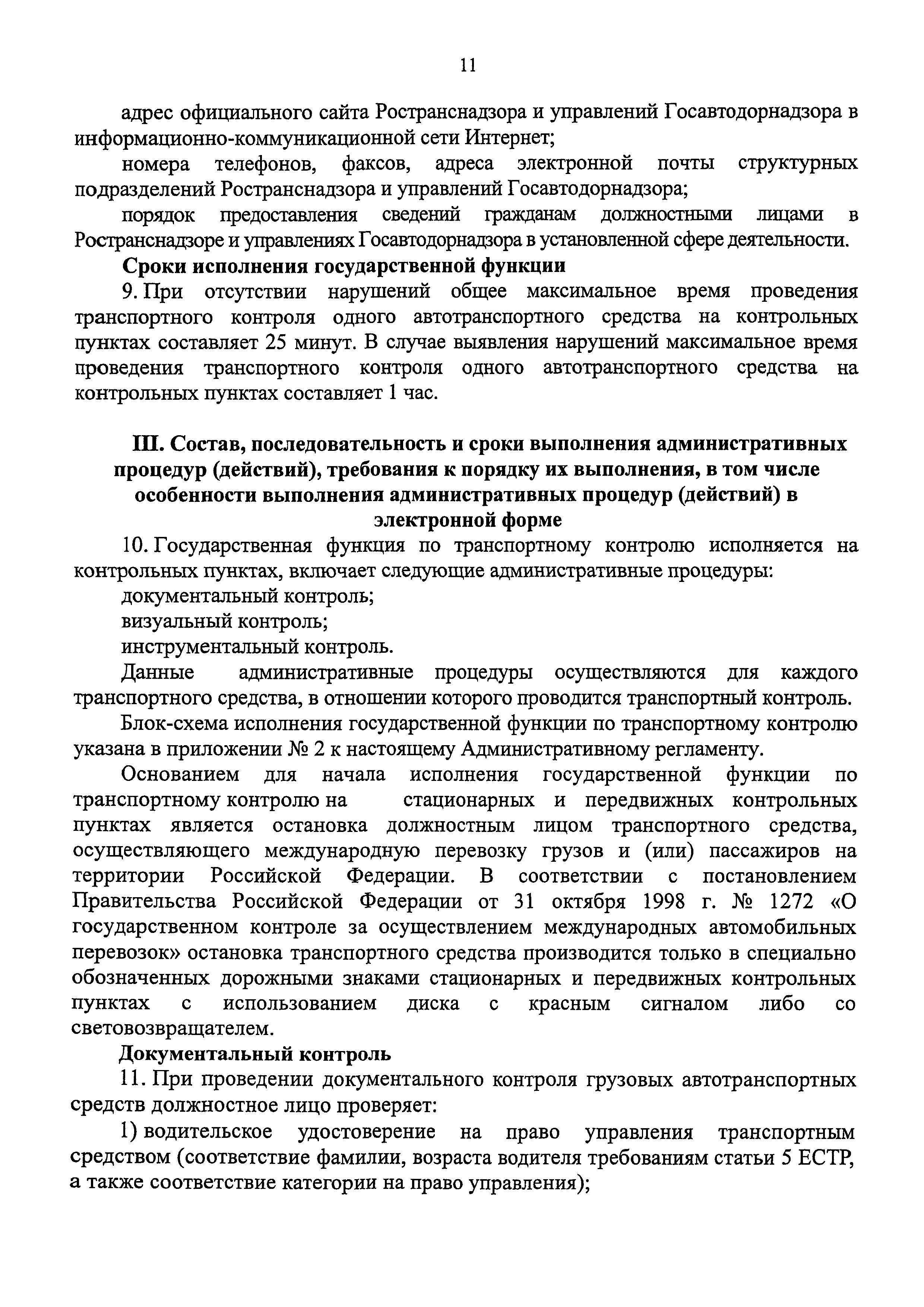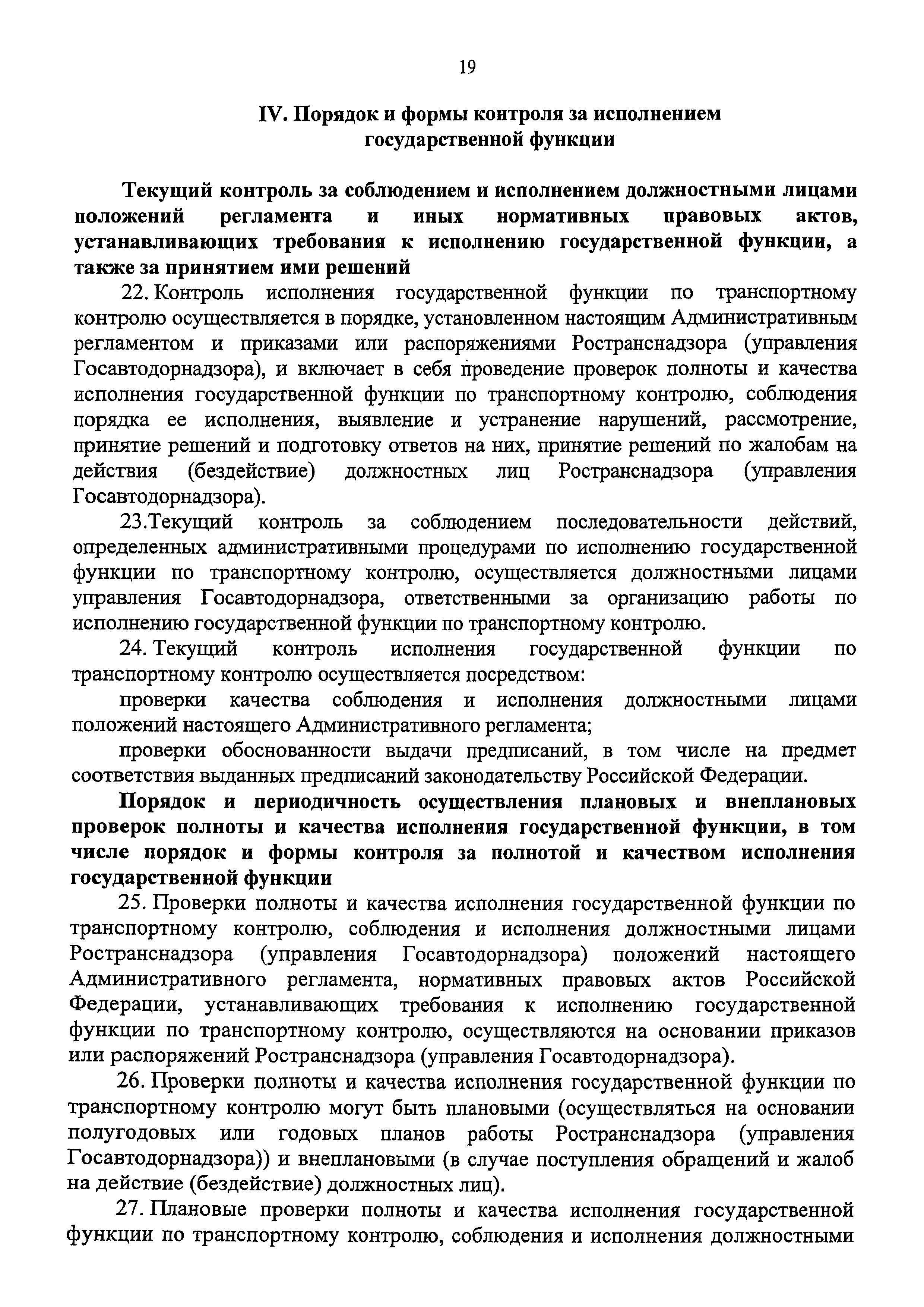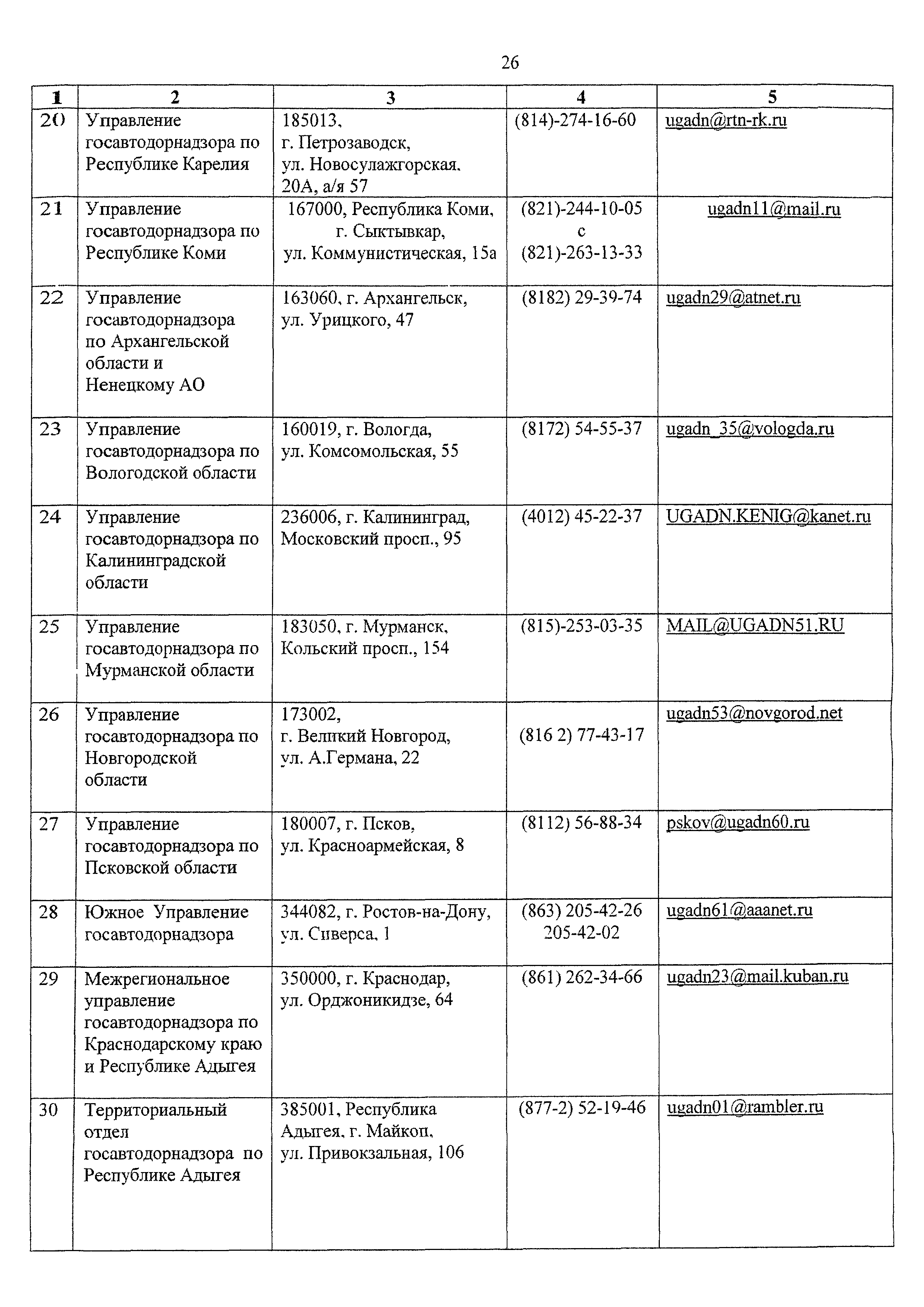 | Оглавление: | I. Общие положения II. Требования к порядку исполнения государственной функции III. Состав, последовательность и сроки выполнения административных процедур (действий), требования к порядку их выполнения, в том числе особенности выполнения административных процедур (действий) в электронной форме IV. Порядок и формы контроля за исполнением государственной функции V. Досудебный (внесудебный) порядок обжалования решений и действий (бездействия) Ространснадзора и (или) управления Госавтодорнадзора, исполняющих государственную функцию, а также их должностных лиц Приложение № 1. Местонахождение, справочные телефоны, почтовые адреса, адреса электронной почты территориальных управлений Госавтодорнадзора |