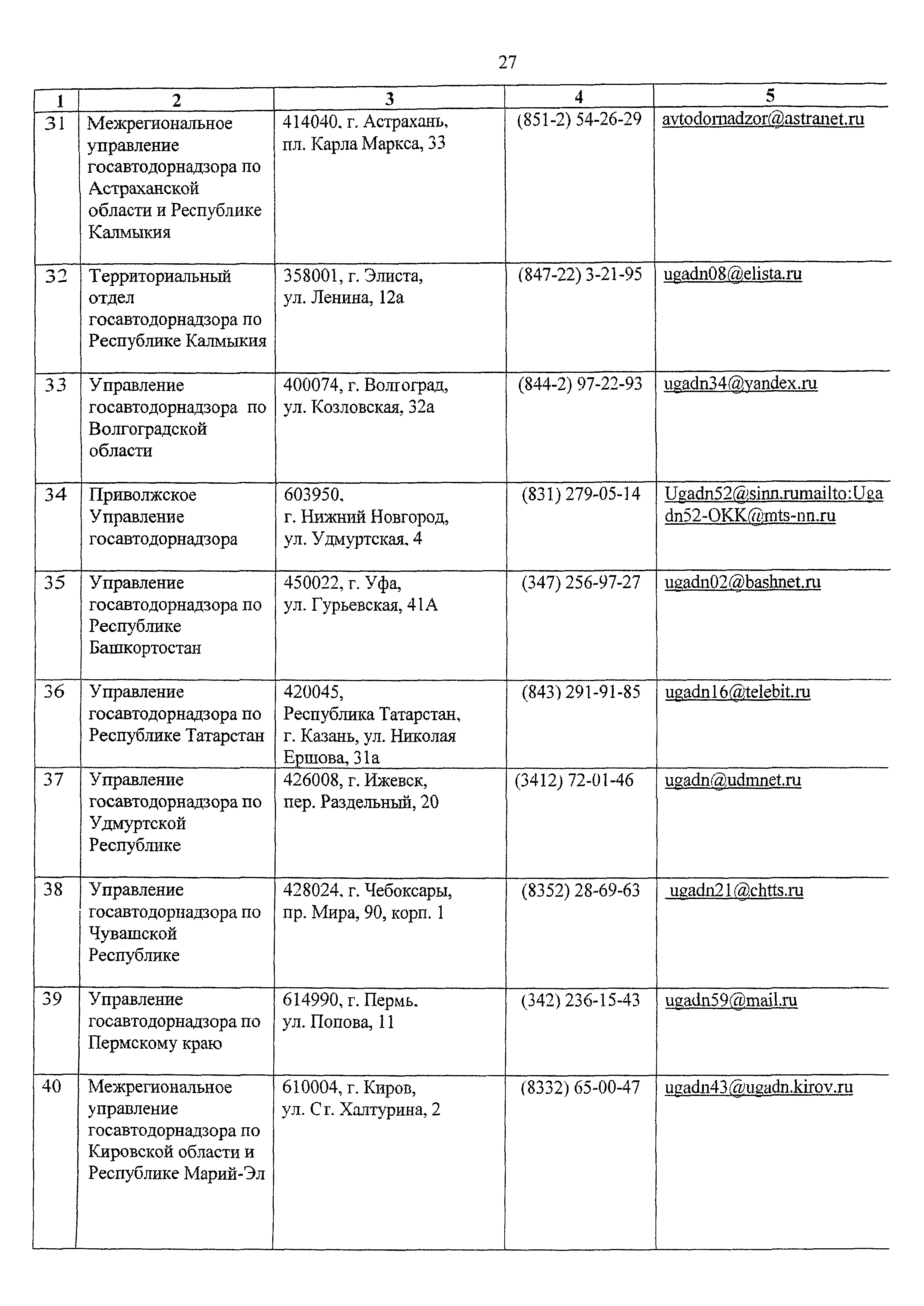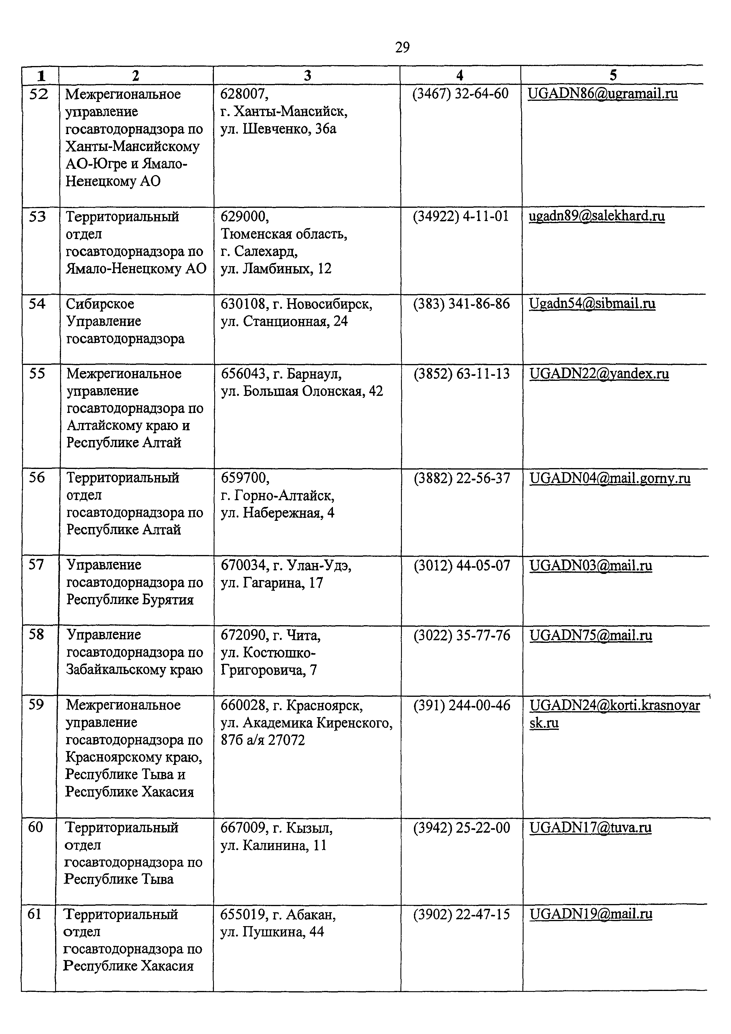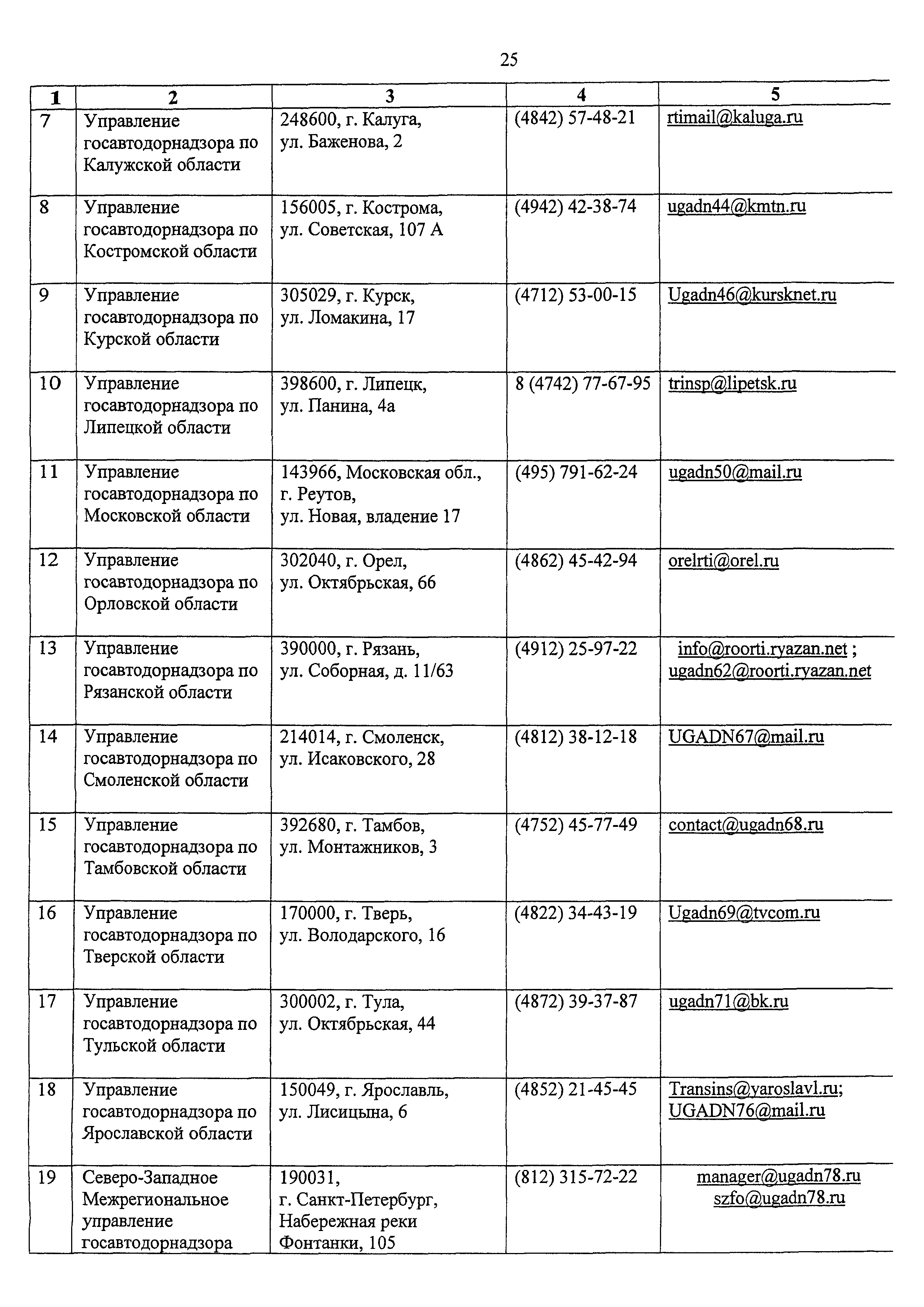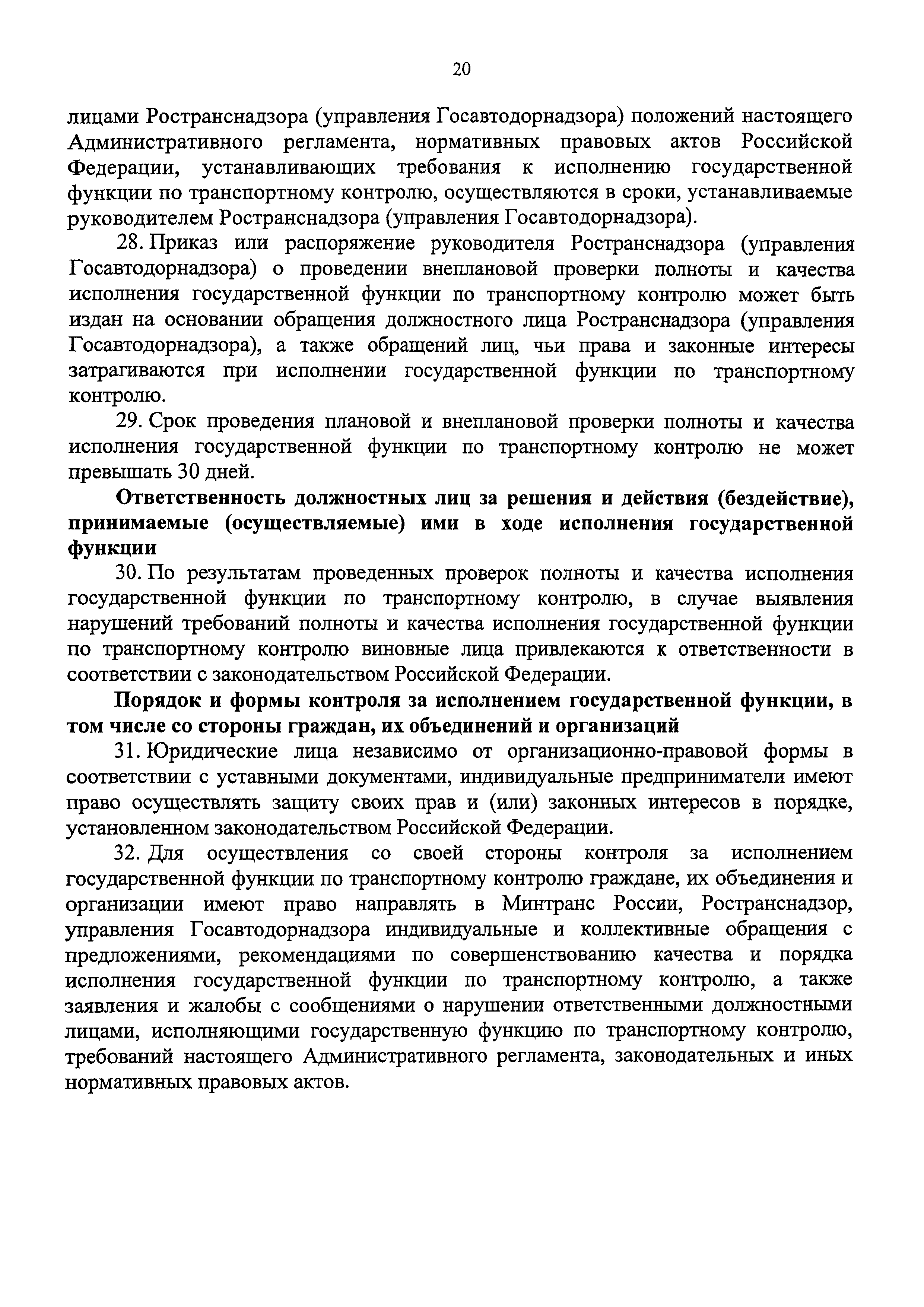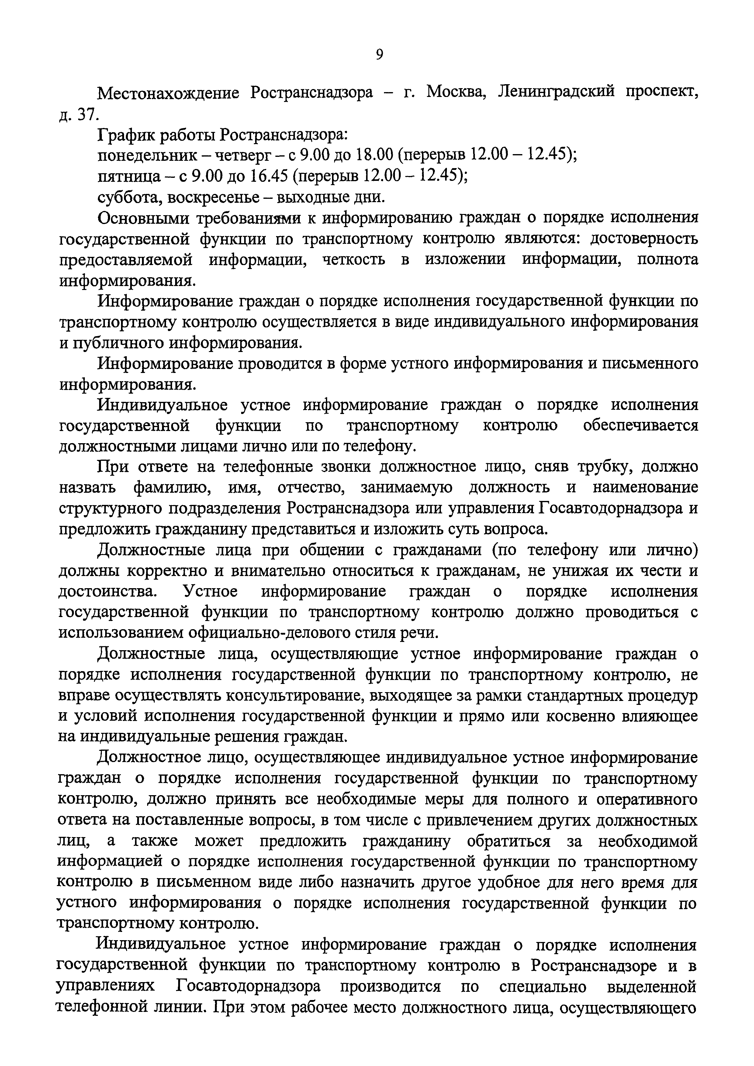 | Оглавление: | I. Общие положения II. Требования к порядку исполнения государственной функции III. Состав, последовательность и сроки выполнения административных процедур (действий), требования к порядку их выполнения, в том числе особенности выполнения административных процедур (действий) в электронной форме IV. Порядок и формы контроля за исполнением государственной функции V. Досудебный (внесудебный) порядок обжалования решений и действий (бездействия) Ространснадзора и (или) управления Госавтодорнадзора, исполняющих государственную функцию, а также их должностных лиц Приложение № 1. Местонахождение, справочные телефоны, почтовые адреса, адреса электронной почты территориальных управлений Госавтодорнадзора |