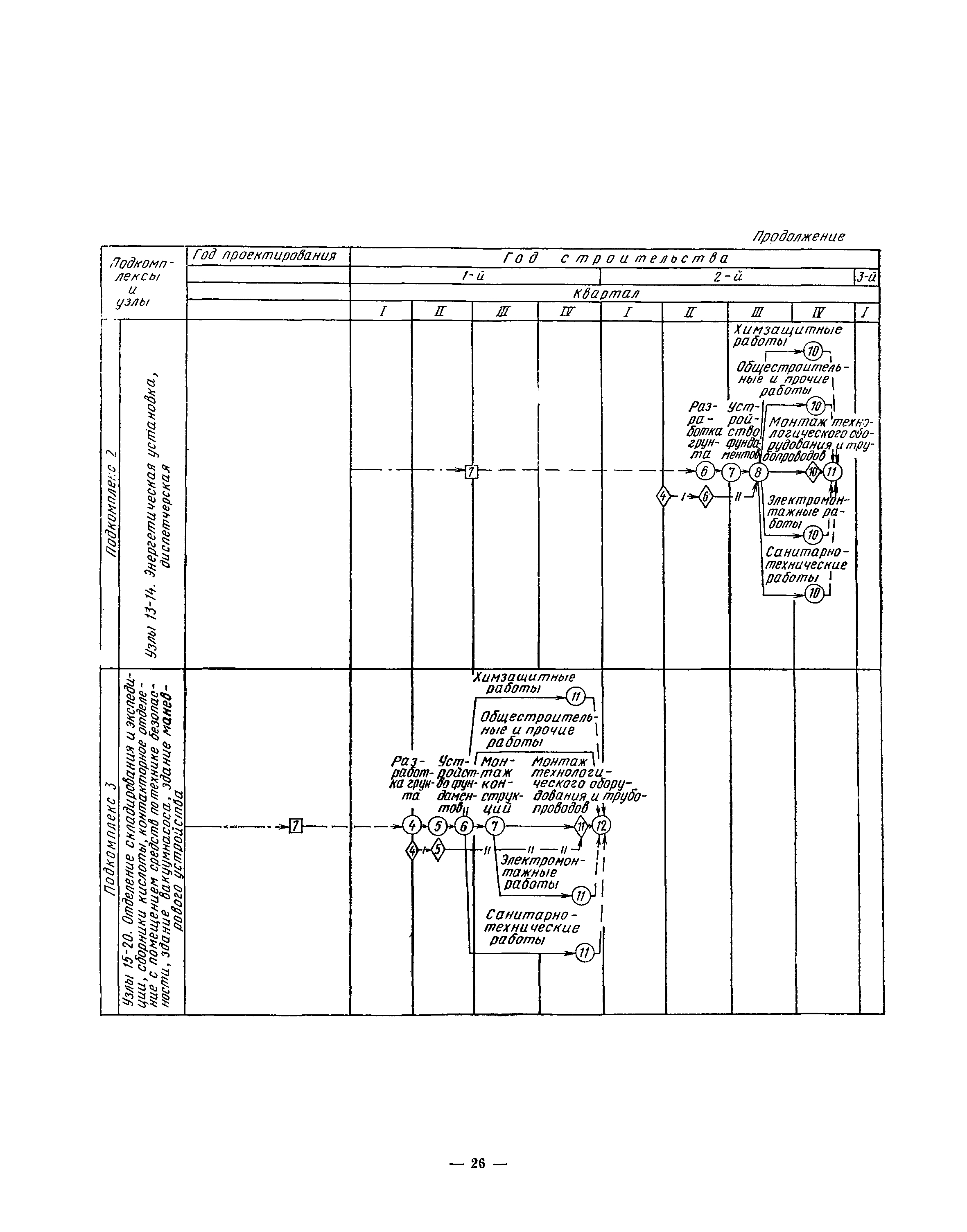 | Оглавление: | Введение 1. Характеристика условий и объектов строительства Природно-климатическая характеристика площадки строительства Объемно-планировочные, технологические и конструктивные особенности объектов предприятия химической промышленности 2. Организационно-технологические схемы возведения основных зданий в сооружений Календарный план строительства Строительный генеральный план 3. Методы производства работ 4. Указания по составу, точности, методам и порядку построения геодезической разбивочной основы 5. Вопросы техники безопасности 6. Объемы строительных, монтажных п специальных работ 7. Потребность в строительных конструкциях, изделиях, деталях, полуфабрикатах, материалах в оборудовании 8. Потребность в основных строительных машинах 9. Потребность в рабочих кадрах, жилье и зданиях культурно-бытового назначения 10. Потребность в материально-технических ресурсах 11. Потребность в инвентарных зданиях 12. Структура управления строительством 13. Оценка экономической эффективности проекта организации строительства 14. Технико-экономические показатели Приложение 1. Комплексный, укрупненный поузловой сетевой график Приложение 2. Схема последовательности ввода узлов с учетом межузловых ограничений во времени |
