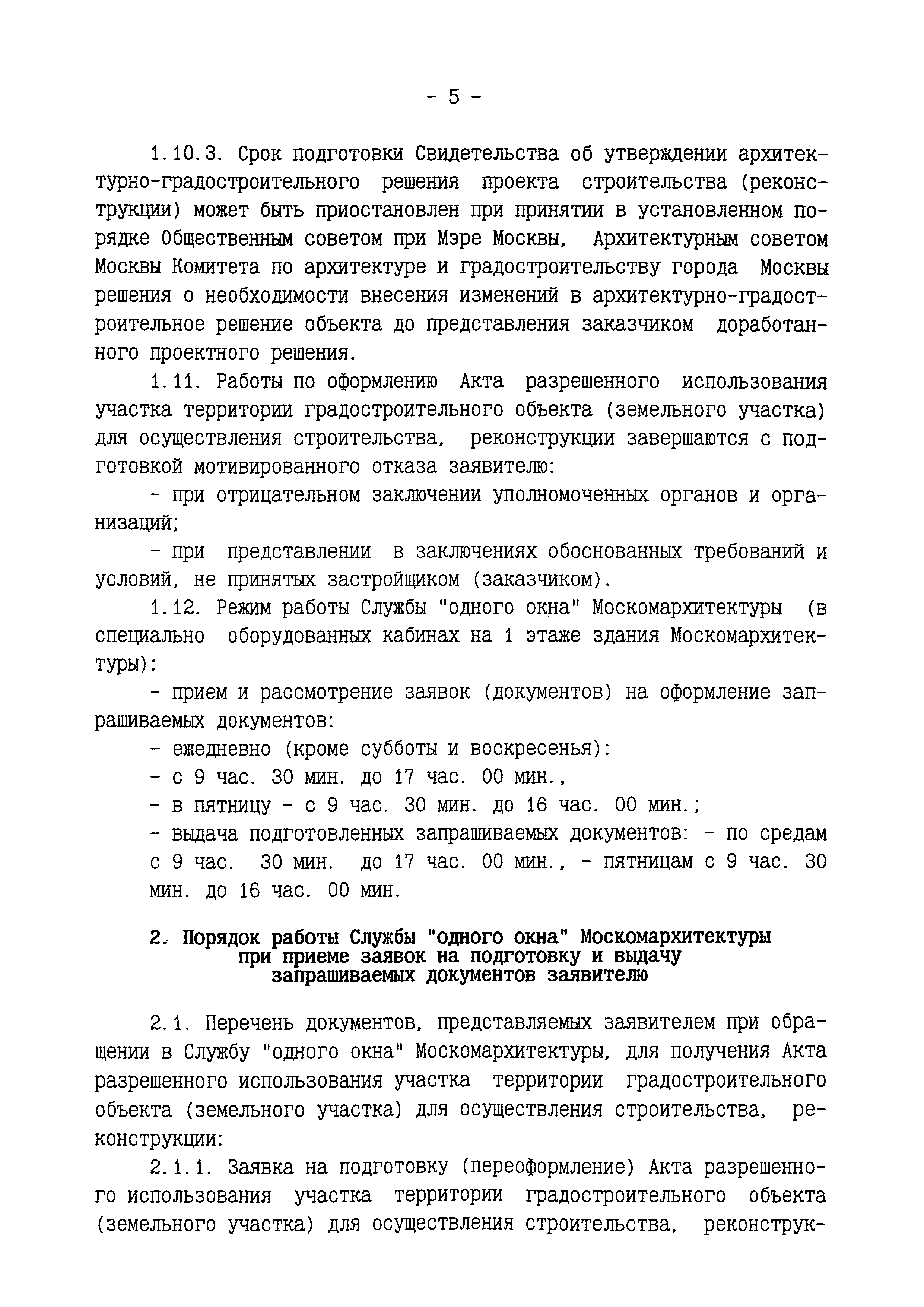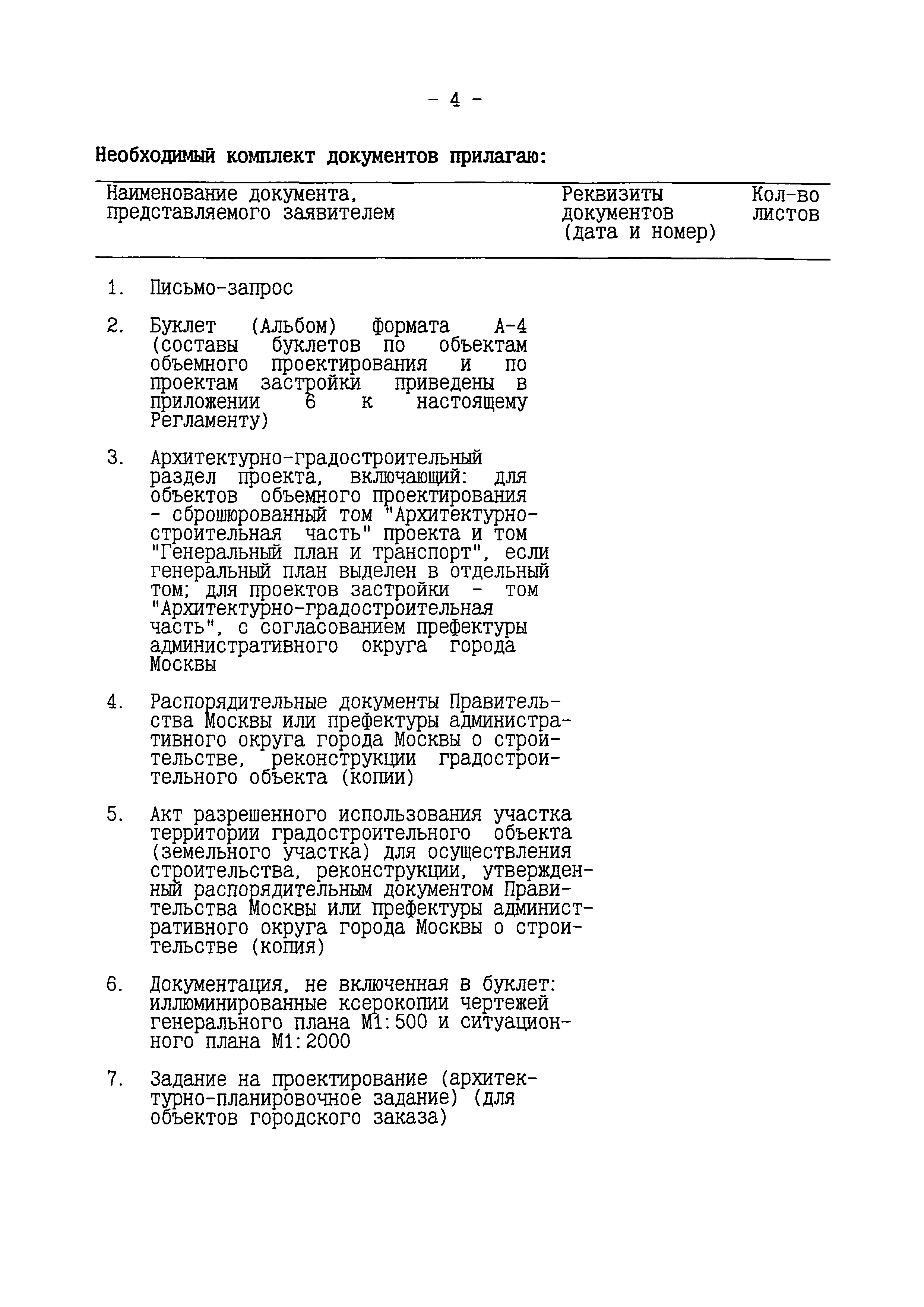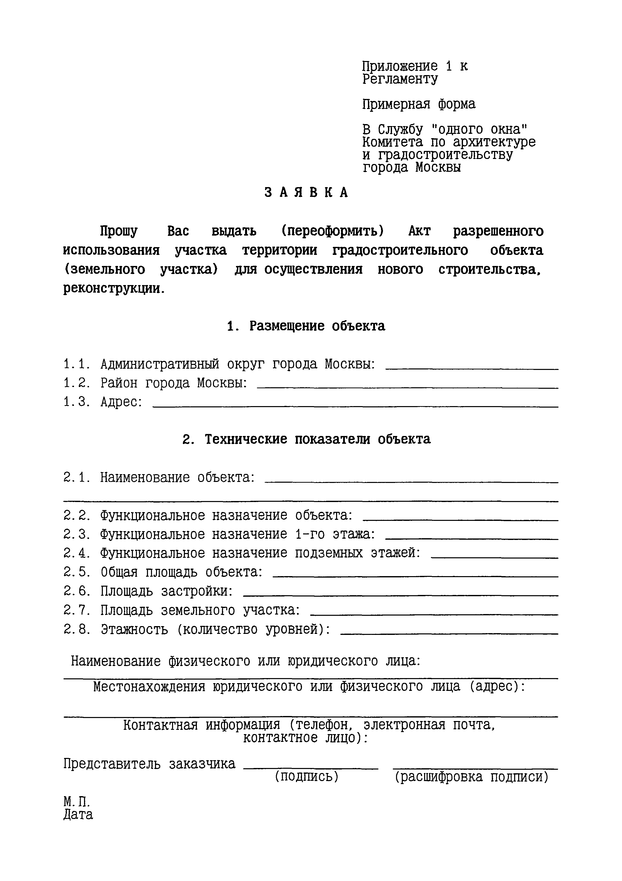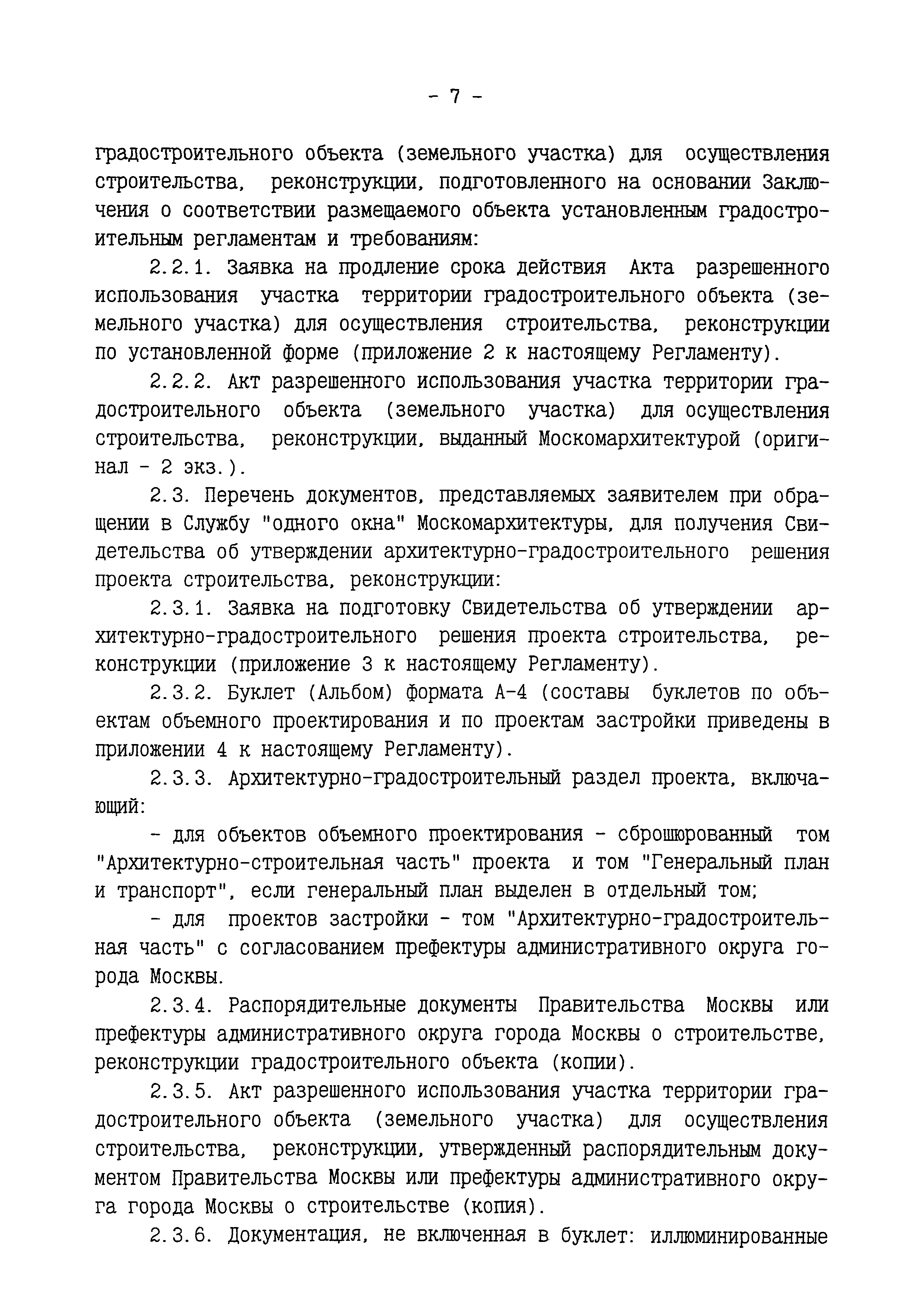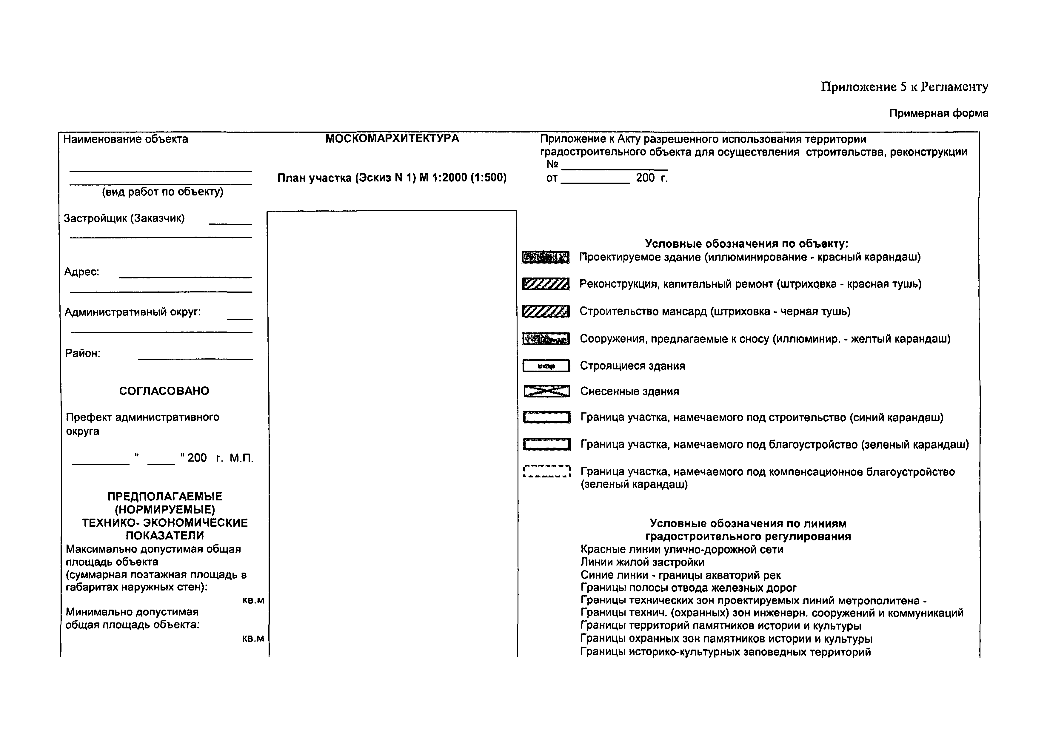 | Оглавление: | 1. Общие положения 2. Порядок работы Службы "одного окна" Москомархитектуры при приеме заявок на подготовку и выдачу запрашиваемых документов заявителю 3. Порядок подготовки и оформления Москомархитектурой запрашиваемых заявителями документов 4. Порядок выдачи Службой "одного окна" Москомархитектуры запрашиваемых документов заявителю 5. Хранение невостребованных запрашиваемых документов 6. Контроль за соблюдением настоящего Регламента Приложение 1. Заявка выдачу (переоформление) Акта разрешенного использования участка территории градостроительного объекта (земельного участка) для осуществления нового строительства, реконструкции Приложение 2. Заявка на продление Акта разрешенного использования участка территории градостроительного объекта (земельного участка) для осуществления строительства, реконструкции Приложение 3. Заявка на подготовление Свидетельства об утверждении архитектурно-градостроительного решения проекта строительства, реконструкции Приложение 4. Требования к представляемым материалам и проектной документации Приложение 5. План участка (Эскиз № 1) |