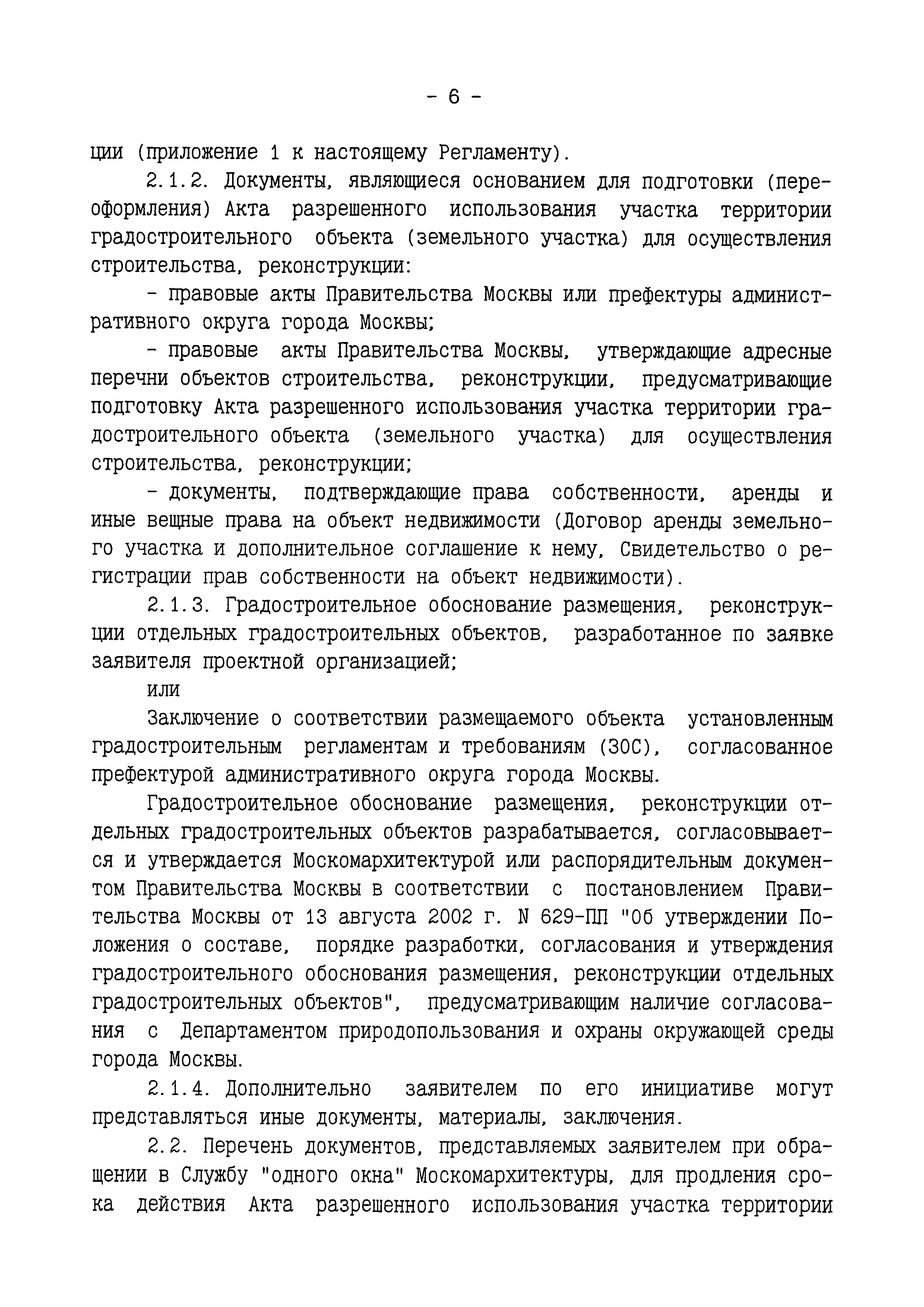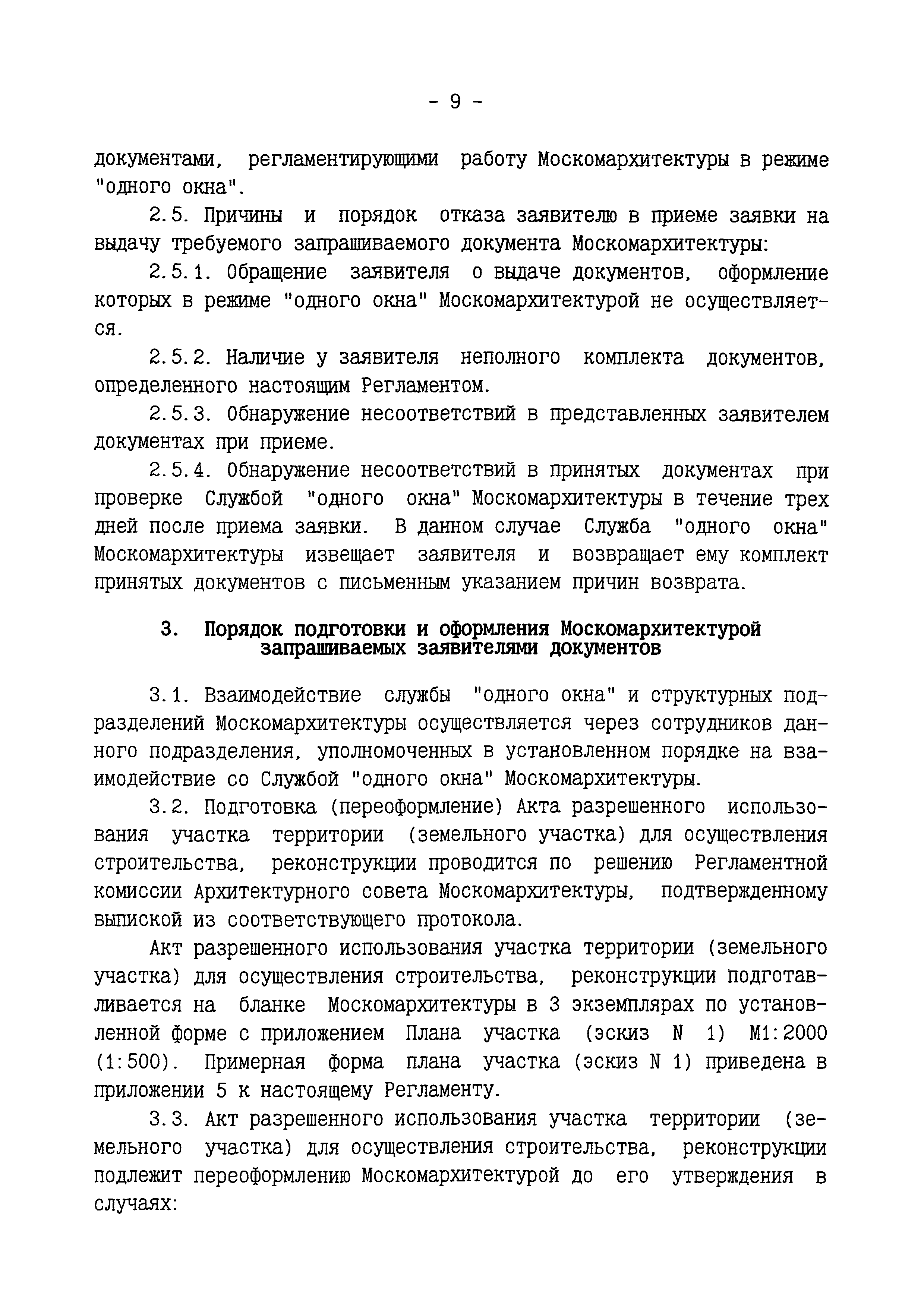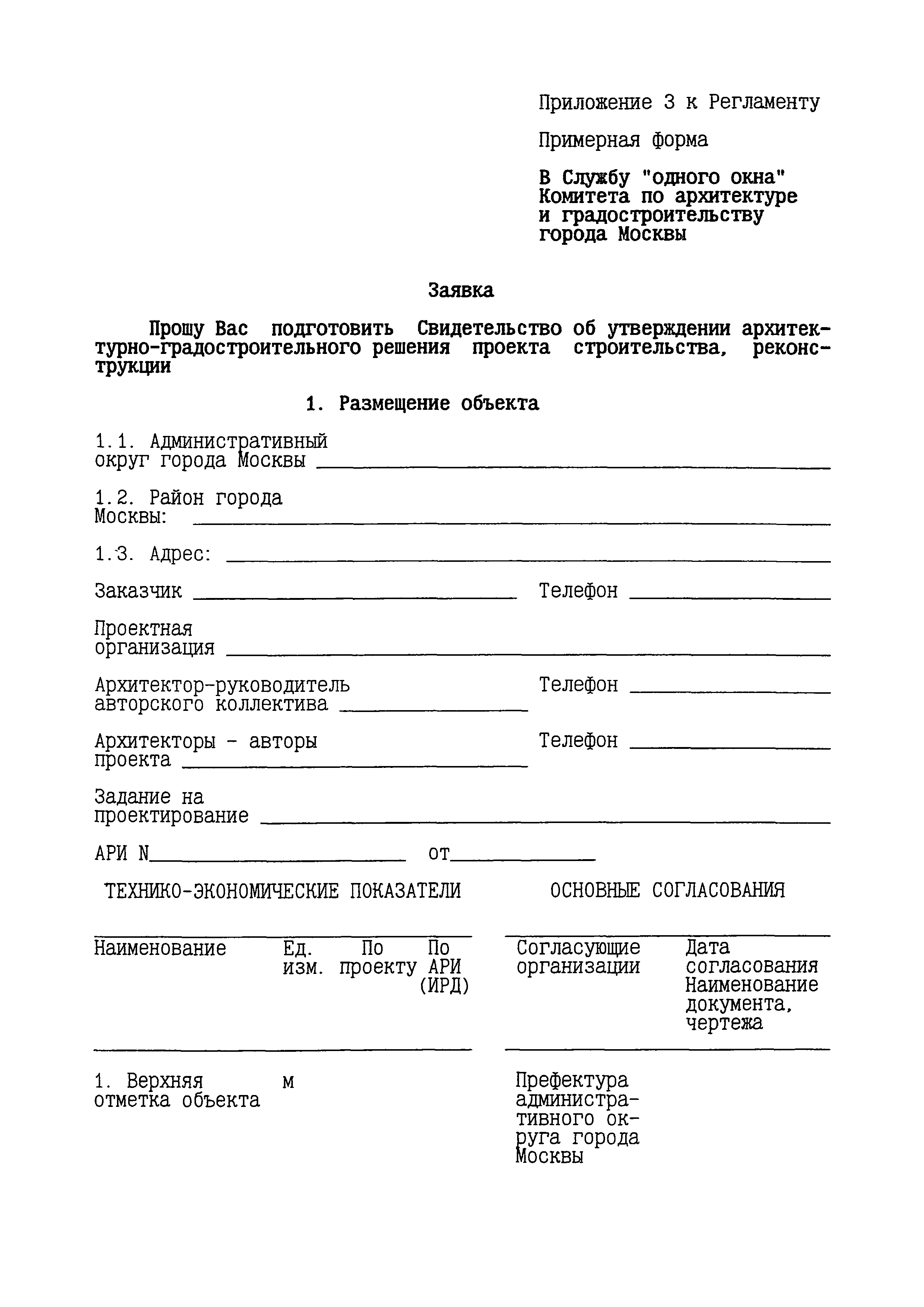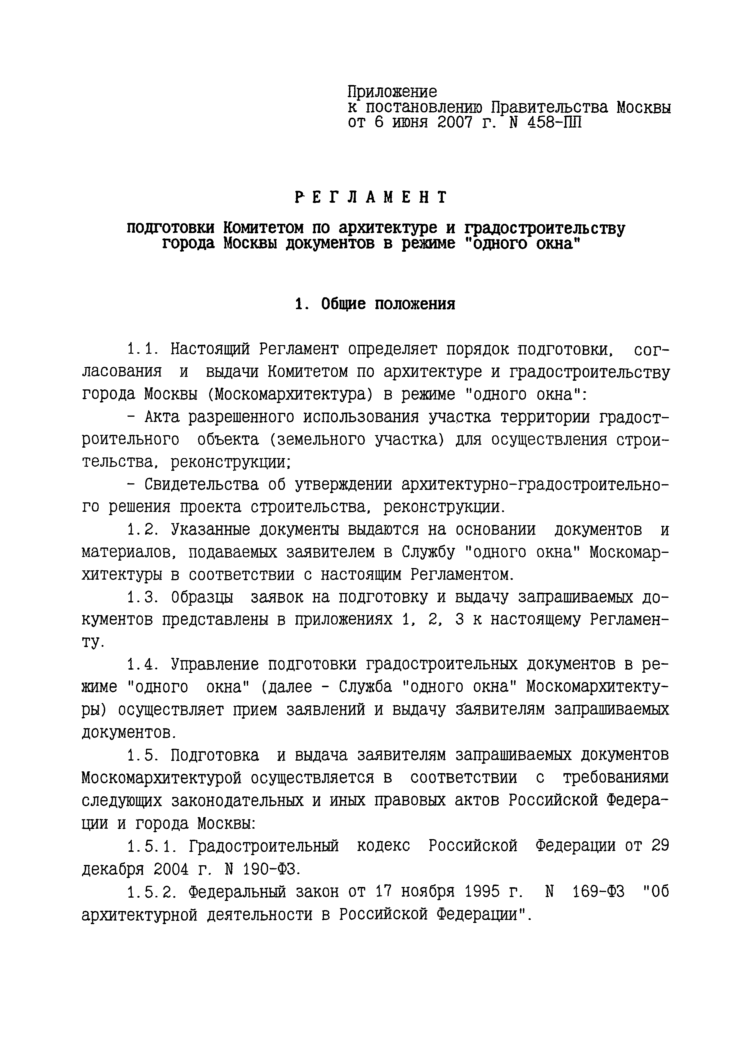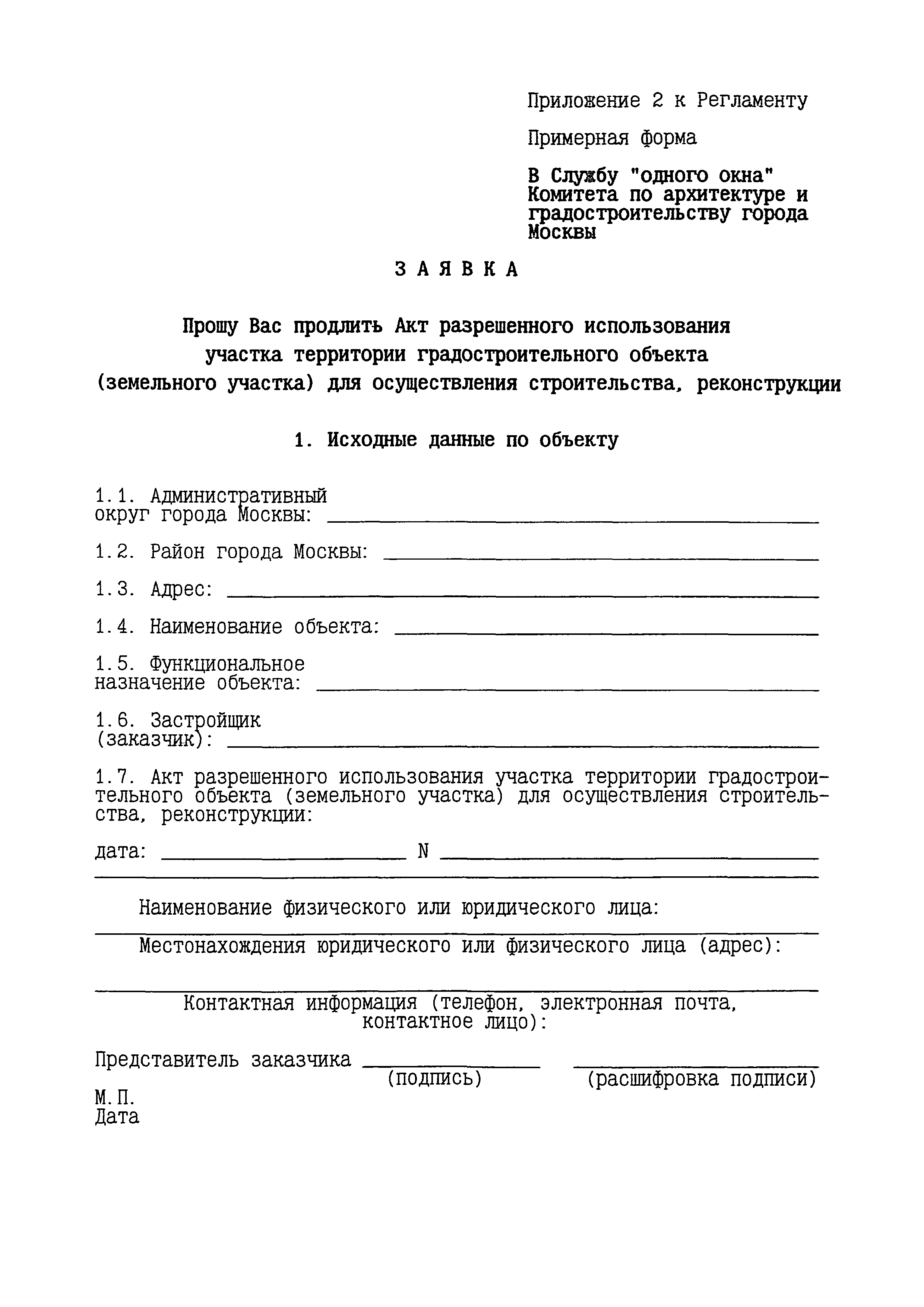 | Оглавление: | 1. Общие положения 2. Порядок работы Службы "одного окна" Москомархитектуры при приеме заявок на подготовку и выдачу запрашиваемых документов заявителю 3. Порядок подготовки и оформления Москомархитектурой запрашиваемых заявителями документов 4. Порядок выдачи Службой "одного окна" Москомархитектуры запрашиваемых документов заявителю 5. Хранение невостребованных запрашиваемых документов 6. Контроль за соблюдением настоящего Регламента Приложение 1. Заявка выдачу (переоформление) Акта разрешенного использования участка территории градостроительного объекта (земельного участка) для осуществления нового строительства, реконструкции Приложение 2. Заявка на продление Акта разрешенного использования участка территории градостроительного объекта (земельного участка) для осуществления строительства, реконструкции Приложение 3. Заявка на подготовление Свидетельства об утверждении архитектурно-градостроительного решения проекта строительства, реконструкции Приложение 4. Требования к представляемым материалам и проектной документации Приложение 5. План участка (Эскиз № 1) |