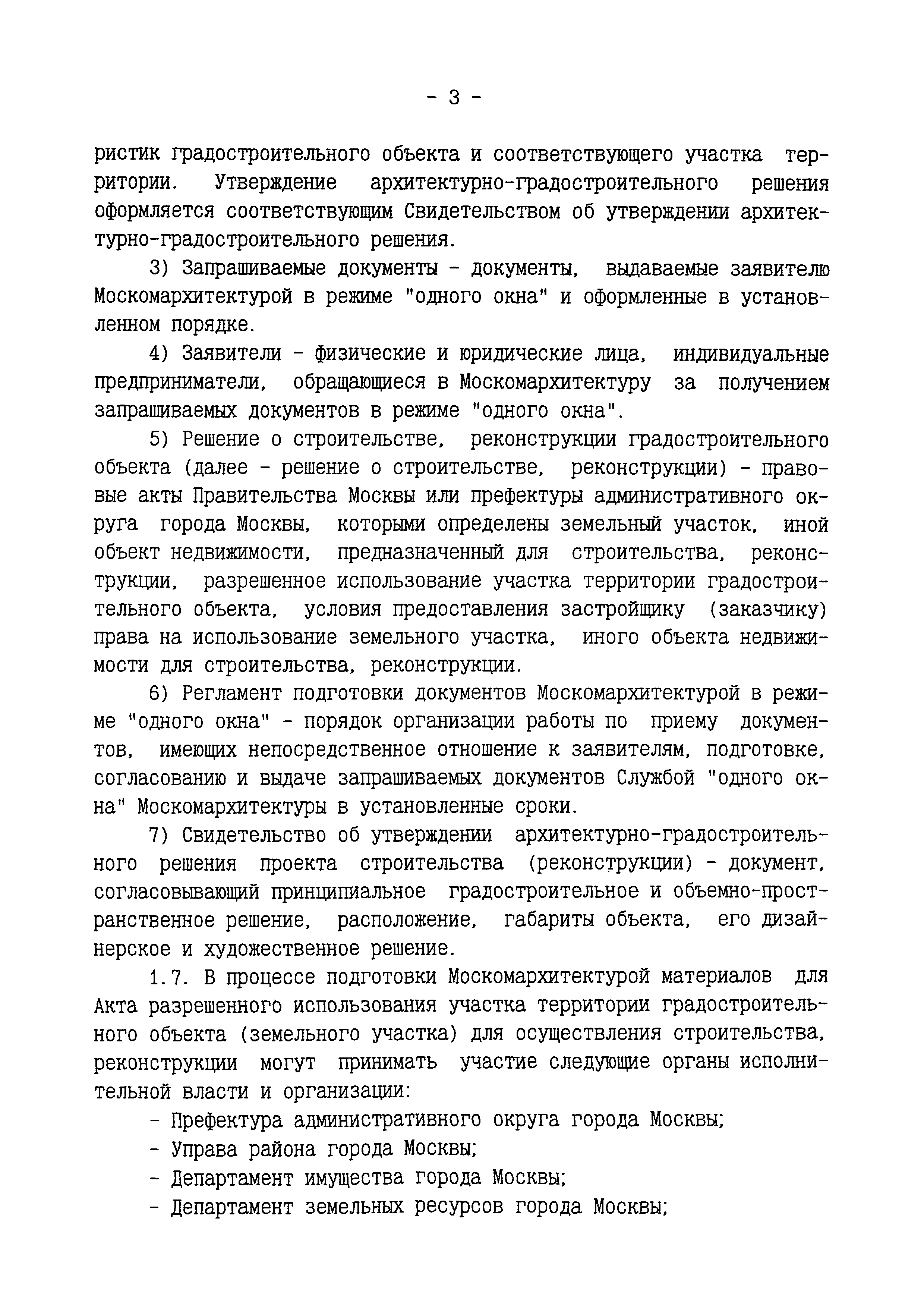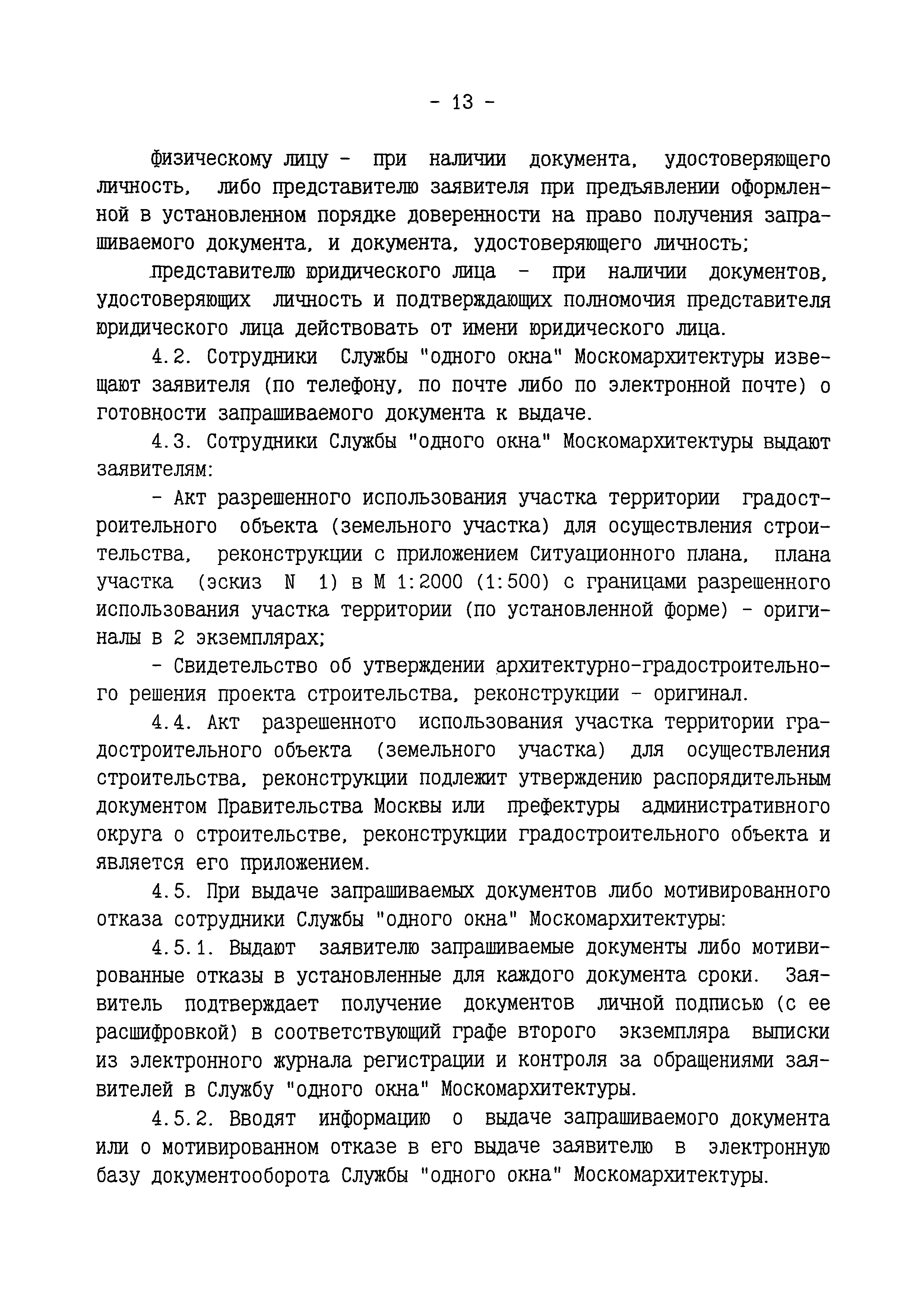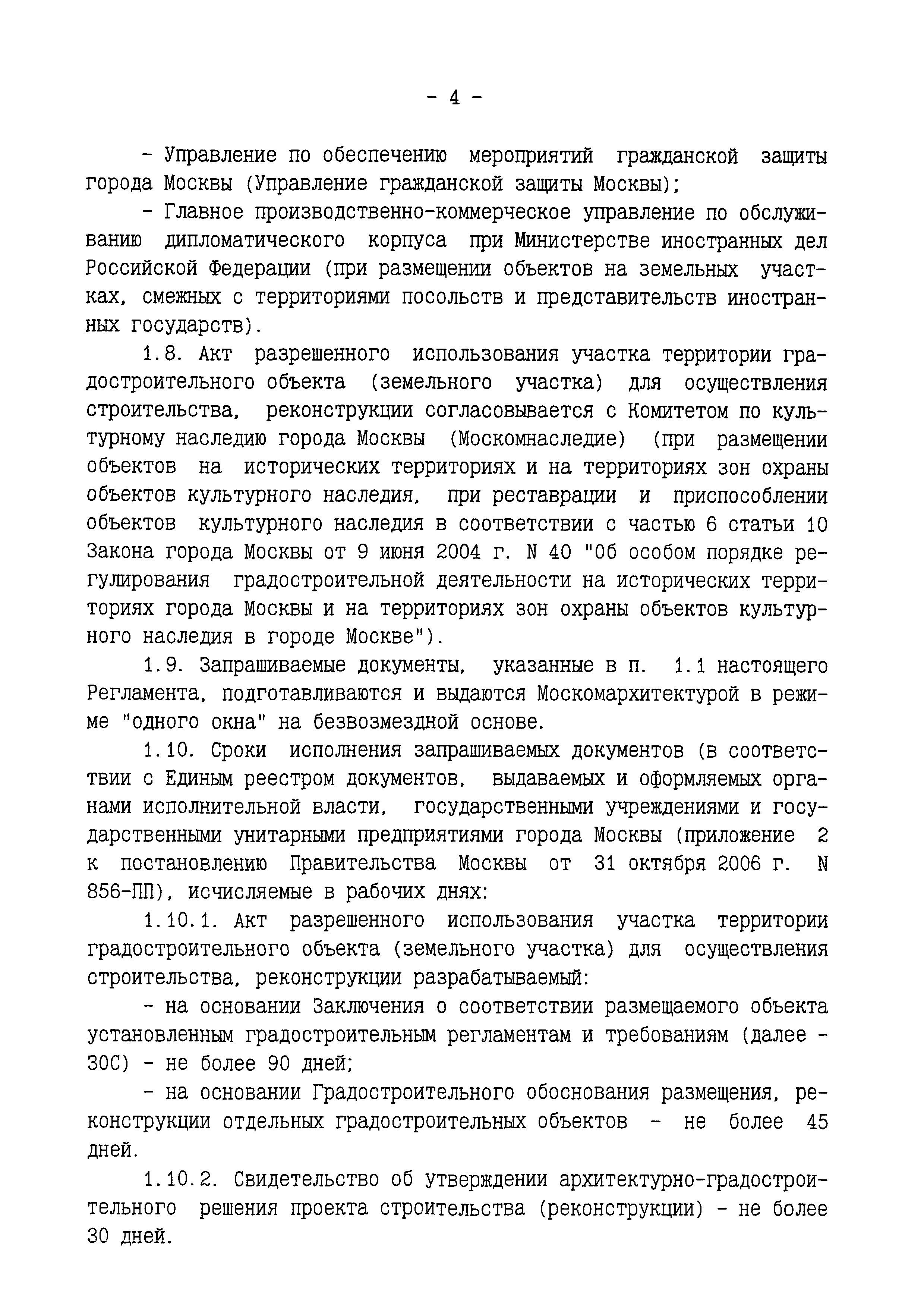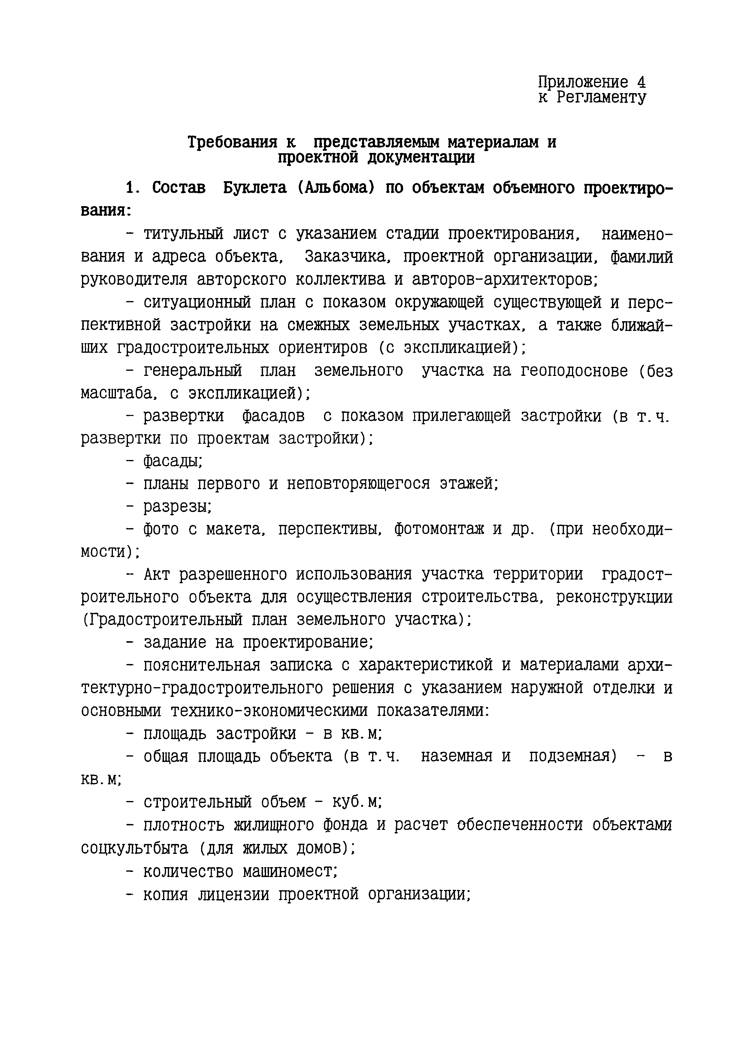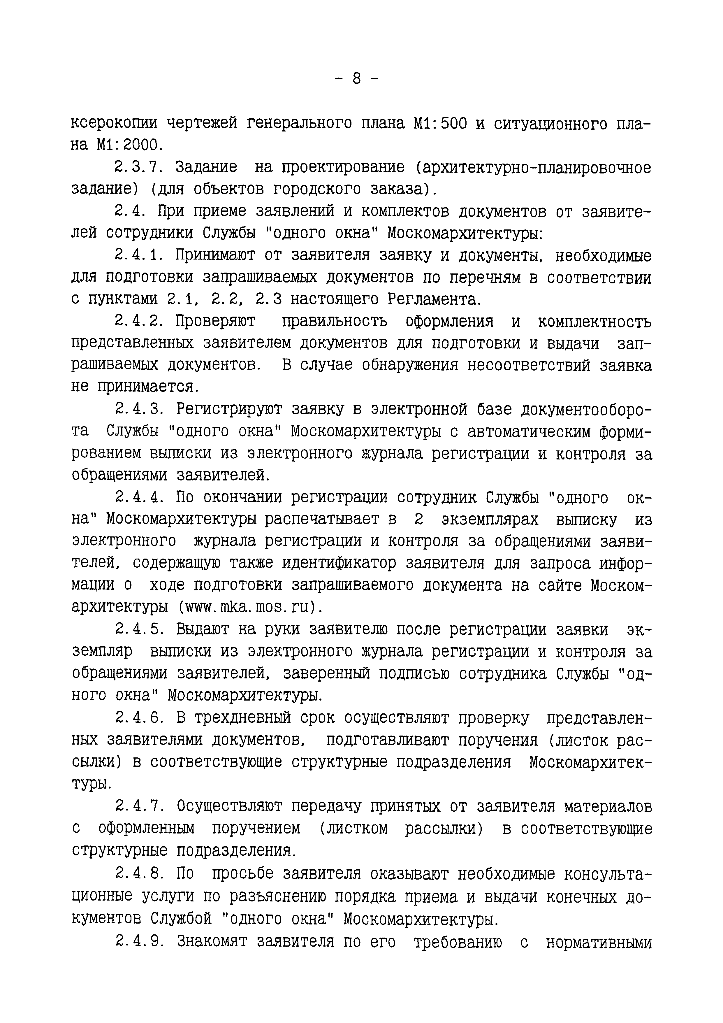 | Оглавление: | 1. Общие положения 2. Порядок работы Службы "одного окна" Москомархитектуры при приеме заявок на подготовку и выдачу запрашиваемых документов заявителю 3. Порядок подготовки и оформления Москомархитектурой запрашиваемых заявителями документов 4. Порядок выдачи Службой "одного окна" Москомархитектуры запрашиваемых документов заявителю 5. Хранение невостребованных запрашиваемых документов 6. Контроль за соблюдением настоящего Регламента Приложение 1. Заявка выдачу (переоформление) Акта разрешенного использования участка территории градостроительного объекта (земельного участка) для осуществления нового строительства, реконструкции Приложение 2. Заявка на продление Акта разрешенного использования участка территории градостроительного объекта (земельного участка) для осуществления строительства, реконструкции Приложение 3. Заявка на подготовление Свидетельства об утверждении архитектурно-градостроительного решения проекта строительства, реконструкции Приложение 4. Требования к представляемым материалам и проектной документации Приложение 5. План участка (Эскиз № 1) |