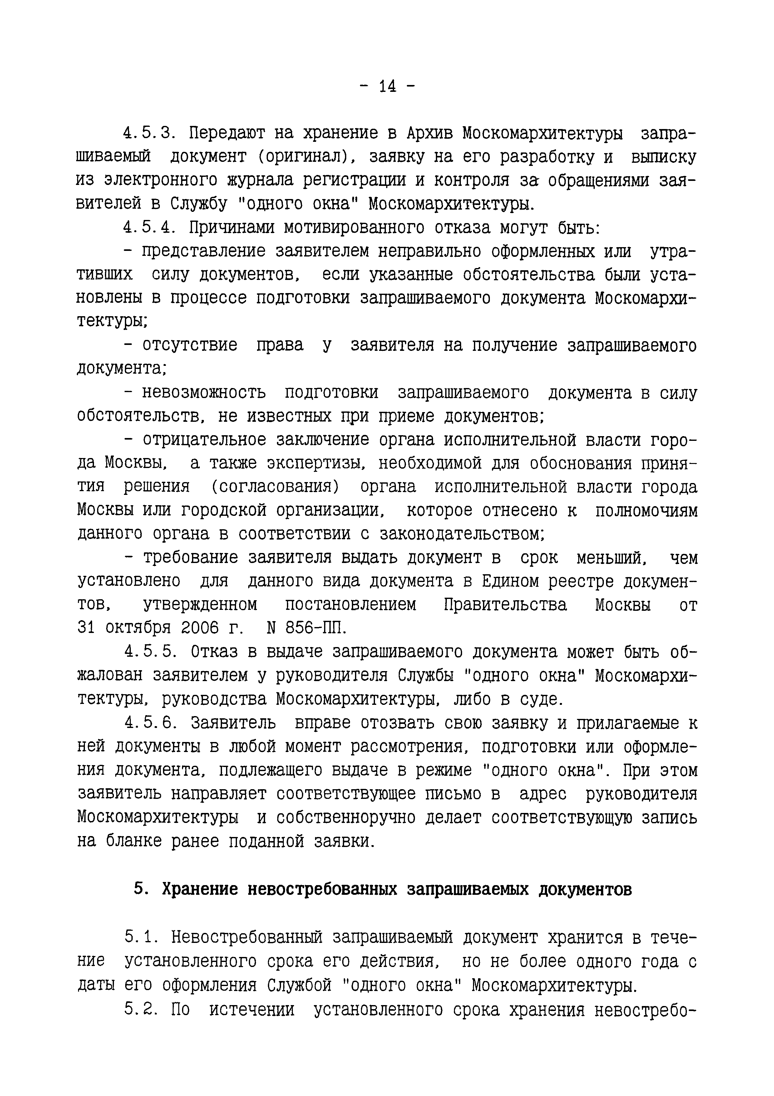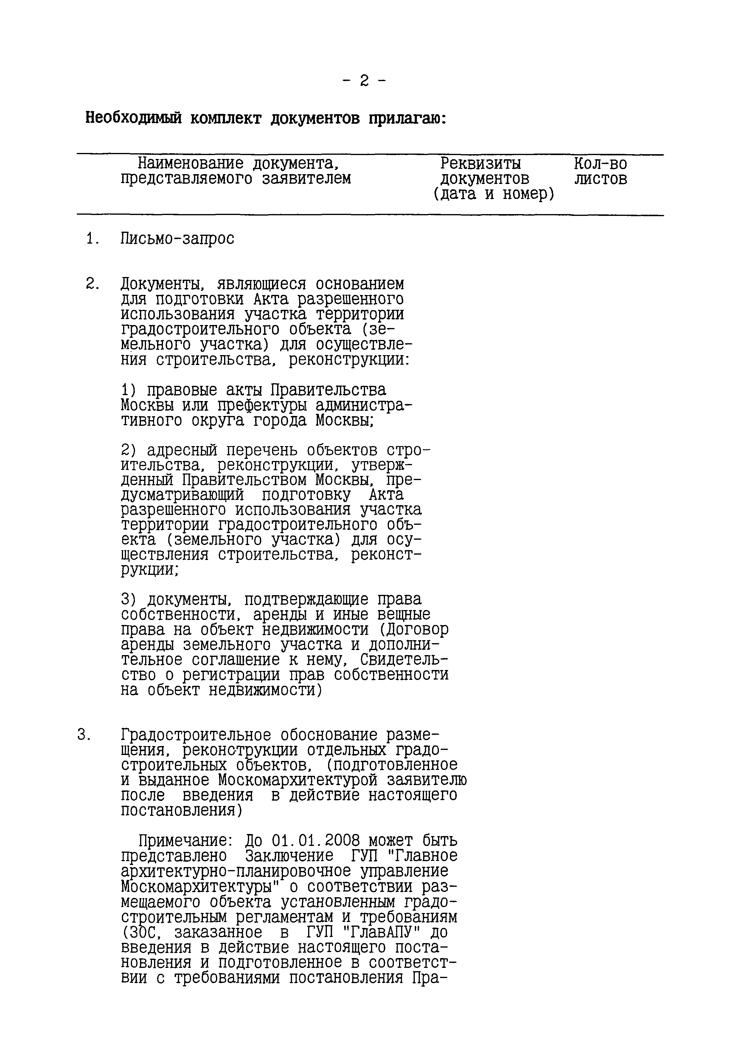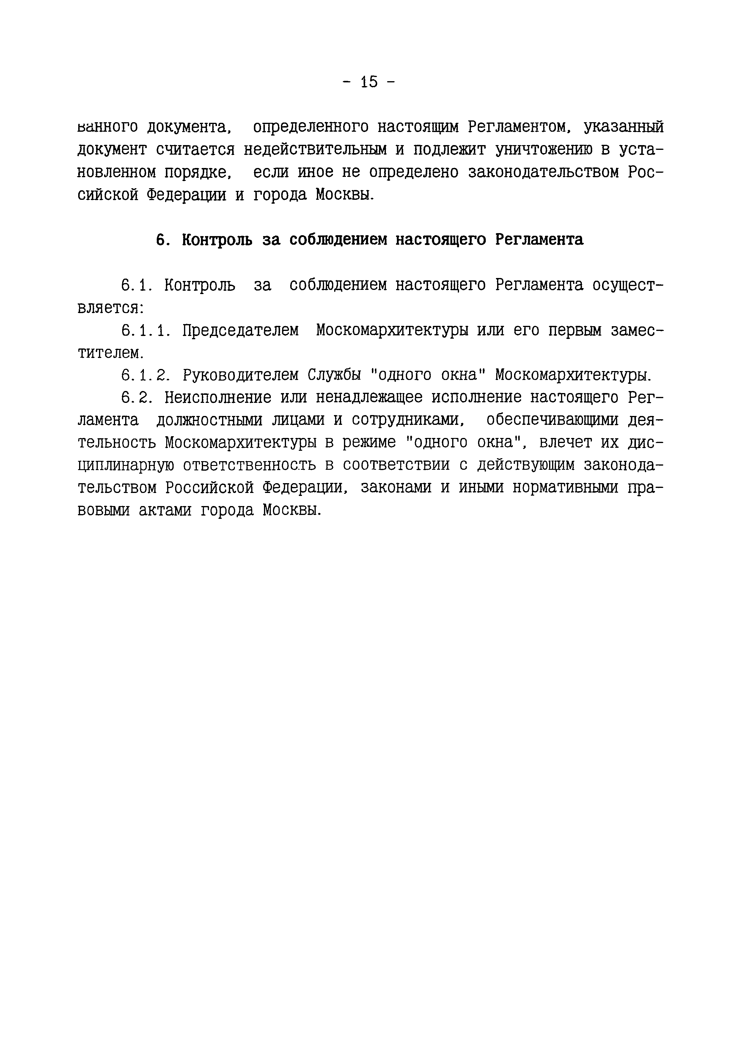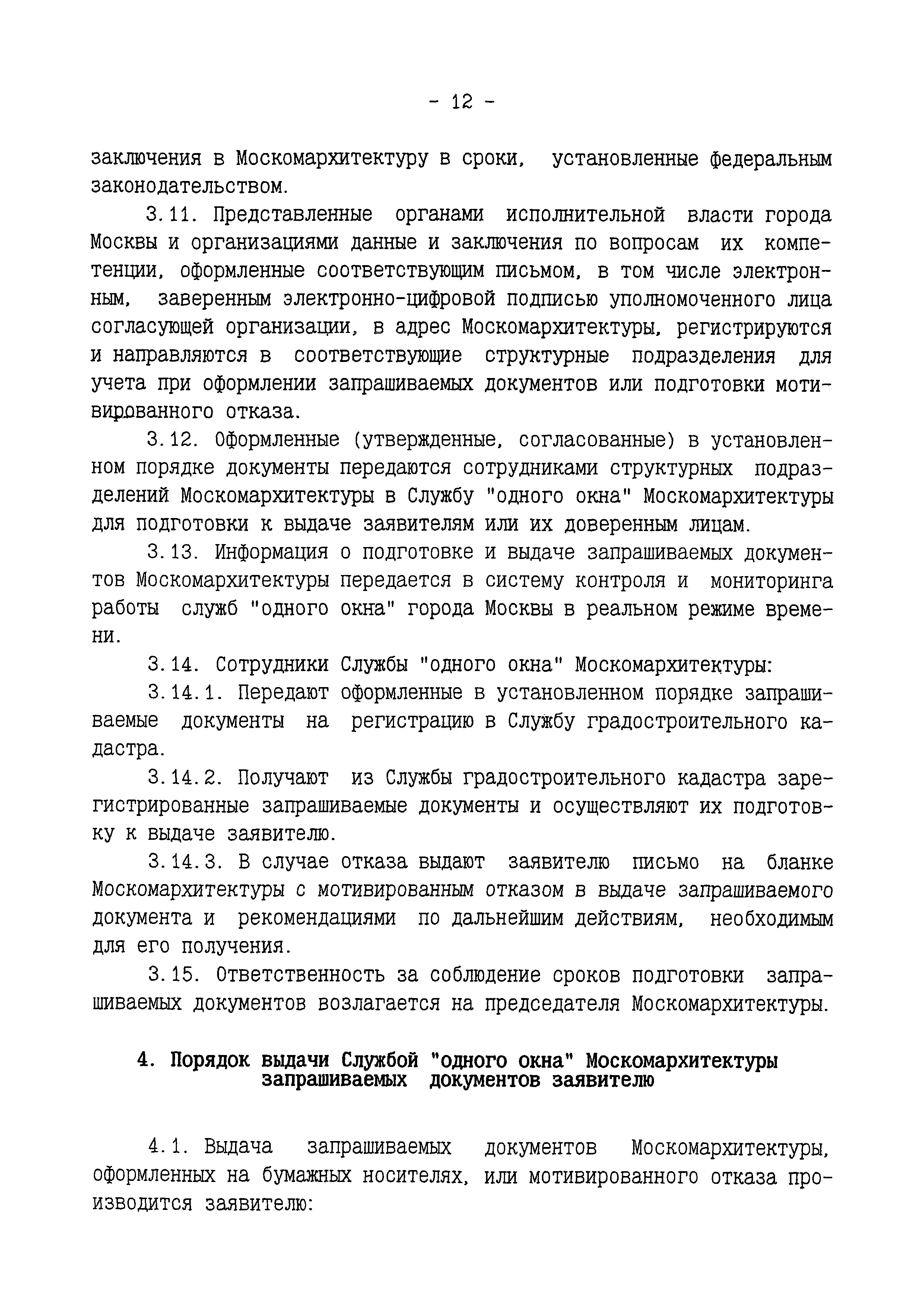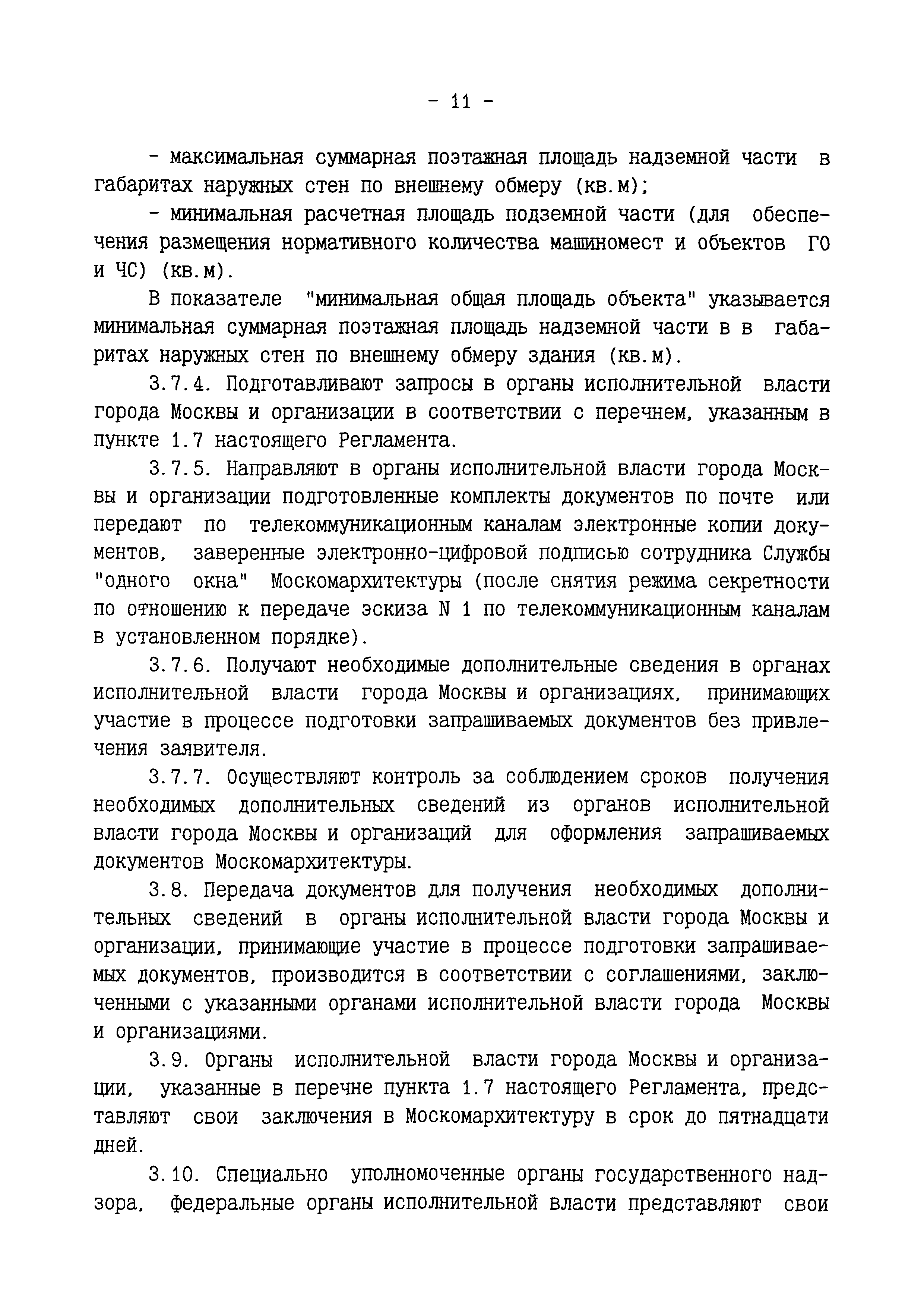 | Оглавление: | 1. Общие положения 2. Порядок работы Службы "одного окна" Москомархитектуры при приеме заявок на подготовку и выдачу запрашиваемых документов заявителю 3. Порядок подготовки и оформления Москомархитектурой запрашиваемых заявителями документов 4. Порядок выдачи Службой "одного окна" Москомархитектуры запрашиваемых документов заявителю 5. Хранение невостребованных запрашиваемых документов 6. Контроль за соблюдением настоящего Регламента Приложение 1. Заявка выдачу (переоформление) Акта разрешенного использования участка территории градостроительного объекта (земельного участка) для осуществления нового строительства, реконструкции Приложение 2. Заявка на продление Акта разрешенного использования участка территории градостроительного объекта (земельного участка) для осуществления строительства, реконструкции Приложение 3. Заявка на подготовление Свидетельства об утверждении архитектурно-градостроительного решения проекта строительства, реконструкции Приложение 4. Требования к представляемым материалам и проектной документации Приложение 5. План участка (Эскиз № 1) |