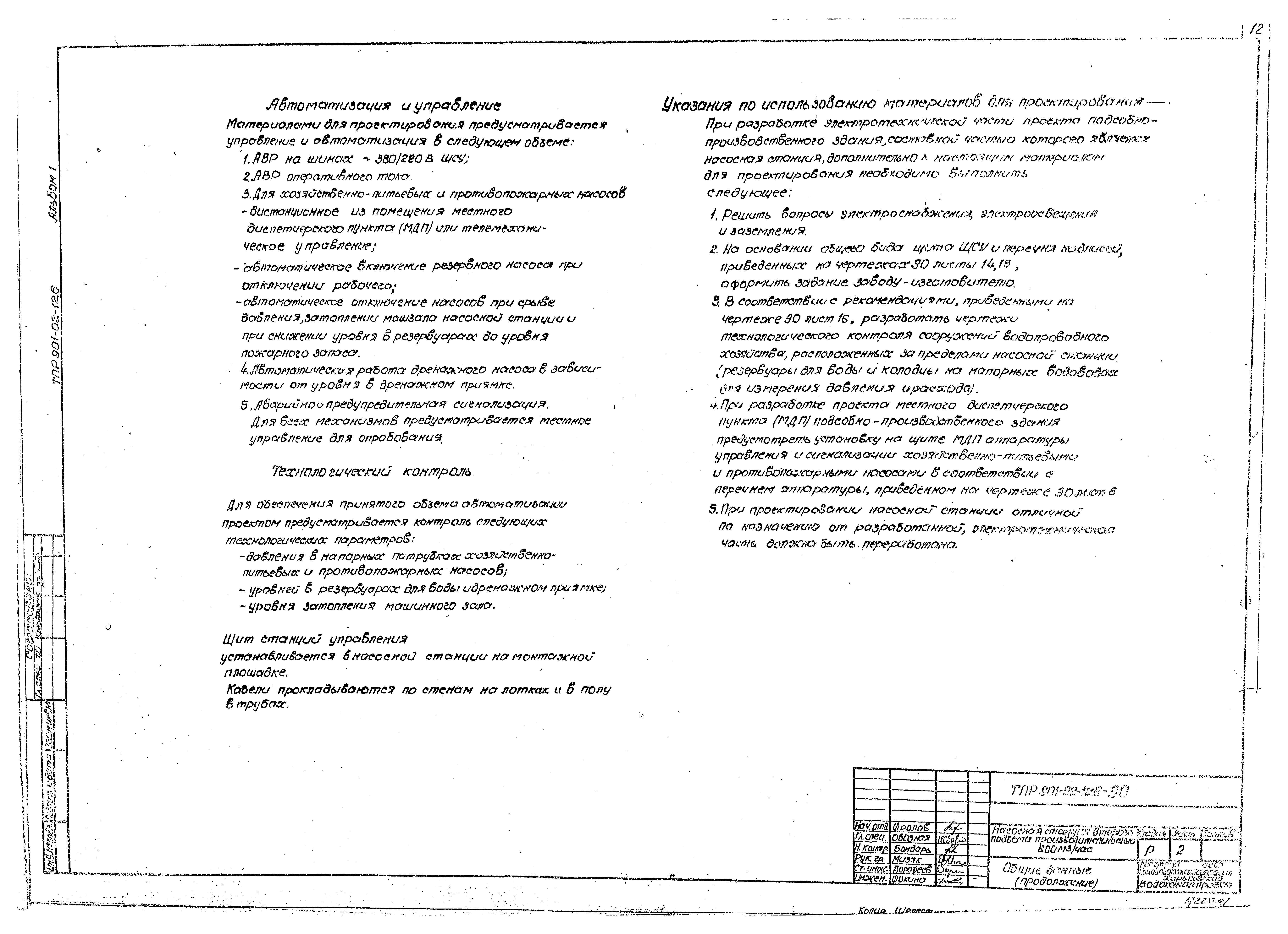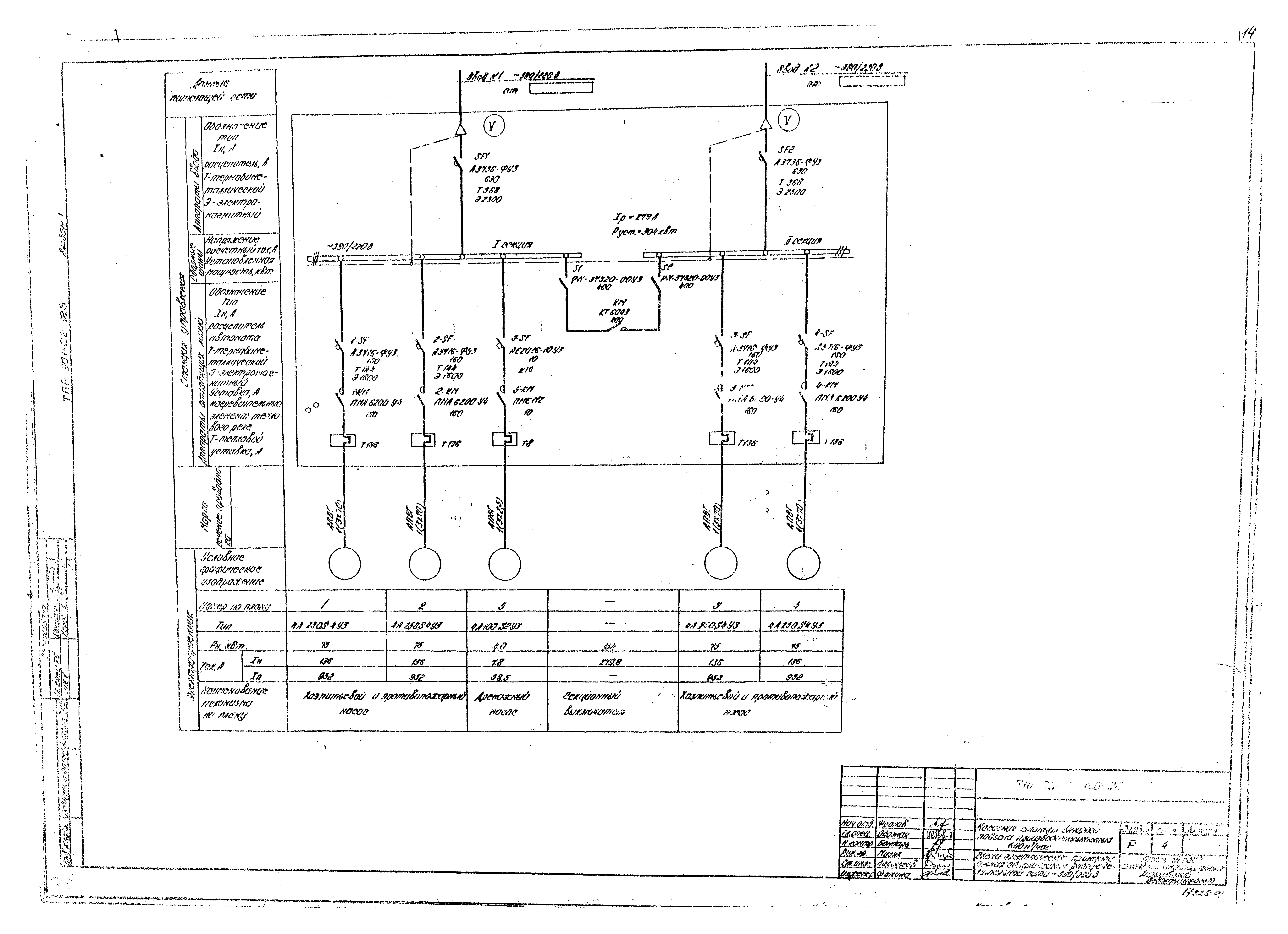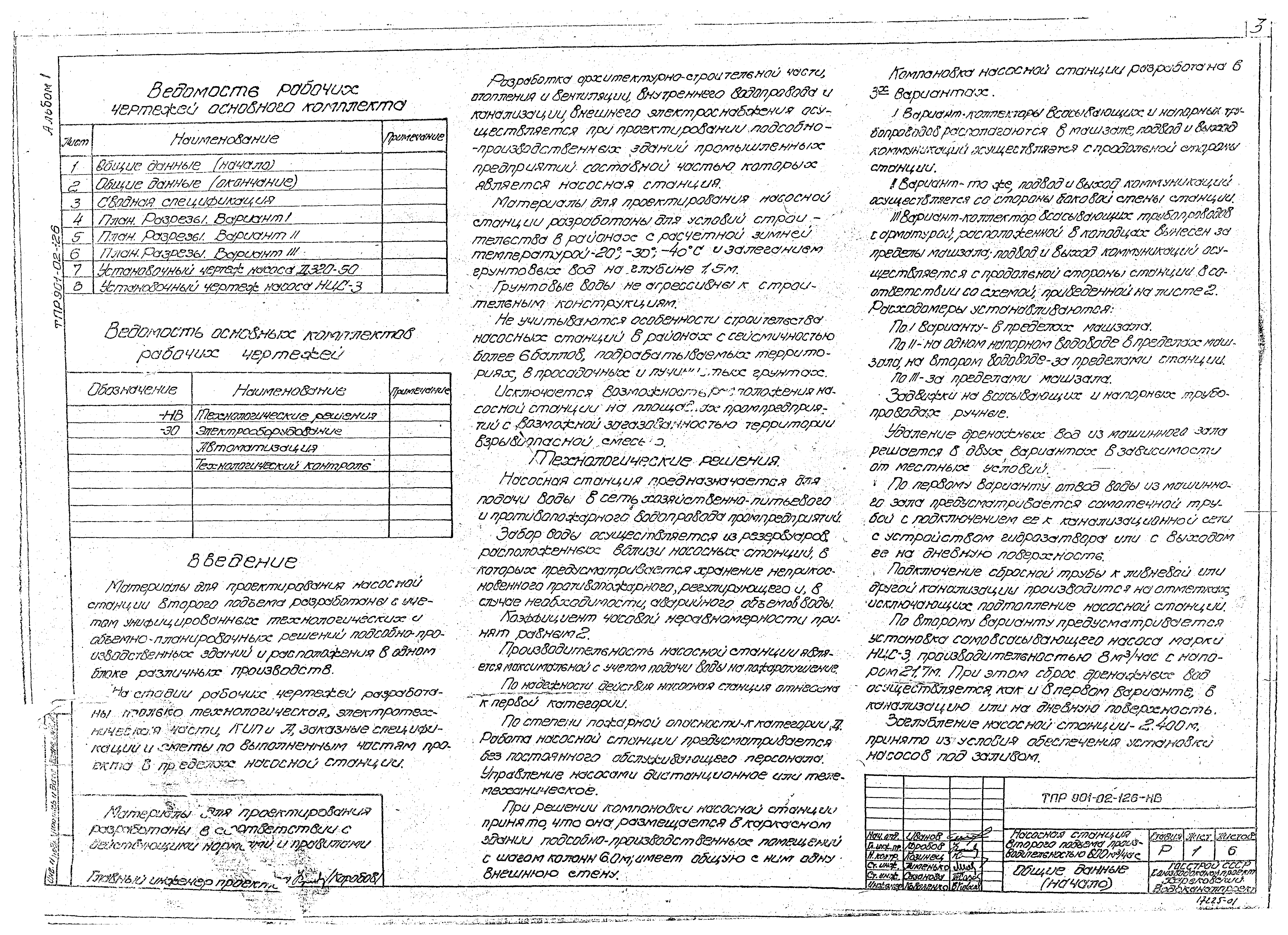 | Оглавление: | Содержание Технологические решения Общие данные Сводная спецификация План. Разрезы. Вариант I План. Разрезы. Вариант II План. Разрезы. Вариант III Установочный чертеж насоса ДЗ20-50 Установочный чертеж насоса НИС-3 Электрооборудование, автоматизация, технологический контроль Общие данные Схема электрическая принципиальная однолинейная распределительной сети 380/220 В Схема электрическая принципиальная АВР 0,4 кВ и оперативного тока Схема электрическая принципиальная управления насосами Схема электрическая принципиальная управления насосами. Перечень элементов Схема электрическая принципиальная контроля уровней Схема электрическая принципиальная сигнализации Схема подключения электрооборудования План расположения электрооборудования. Прокладка кабелей Кабельный журнал. Трубозаготовительная ведомость Щит станций управления ЩСУ. Общий вид. Таблица перечня надписей Щит станций управления ЩСУ. Панели 1, 2, 3, 4. Общие виды Схема функциональная технологического контроля Задания на разработку строительной и сантехнической частей проекта |