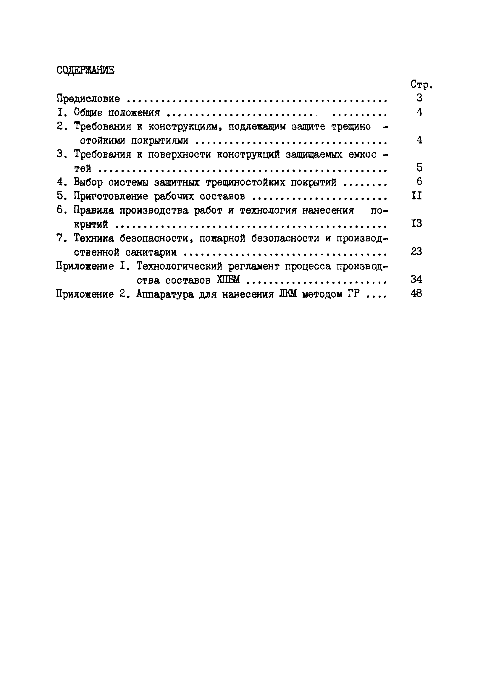 | Оглавление: | Предисловие 1. Общие положения 2. Требования к конструкциям, подлежащим защите трещиностойким покрытиям 3. Требования к поверхности конструкций защищаемых емкостей 4. Выбор системы защитных трещиностойких покрытий 5. Приготовление рабочих составов 6. Правила производства работ и технология нанесения покрытий 7. Техника безопасности, пожарной безопасности и производственной санитарии Приложение 1. Технологический регламент процесса производства составов ХПБМ Приложение 2. Аппаратура для нанесения ЛКМ методом ГР |