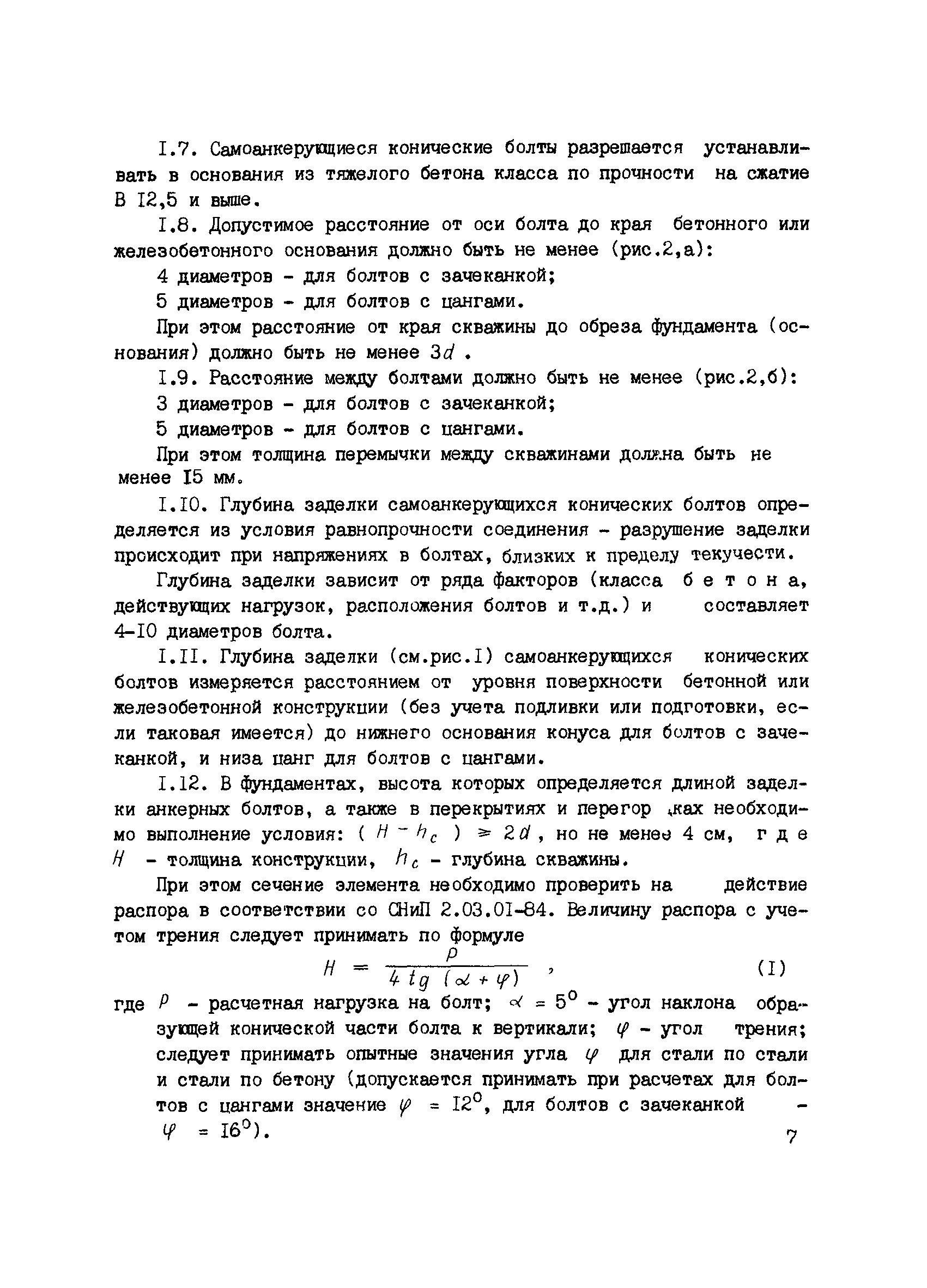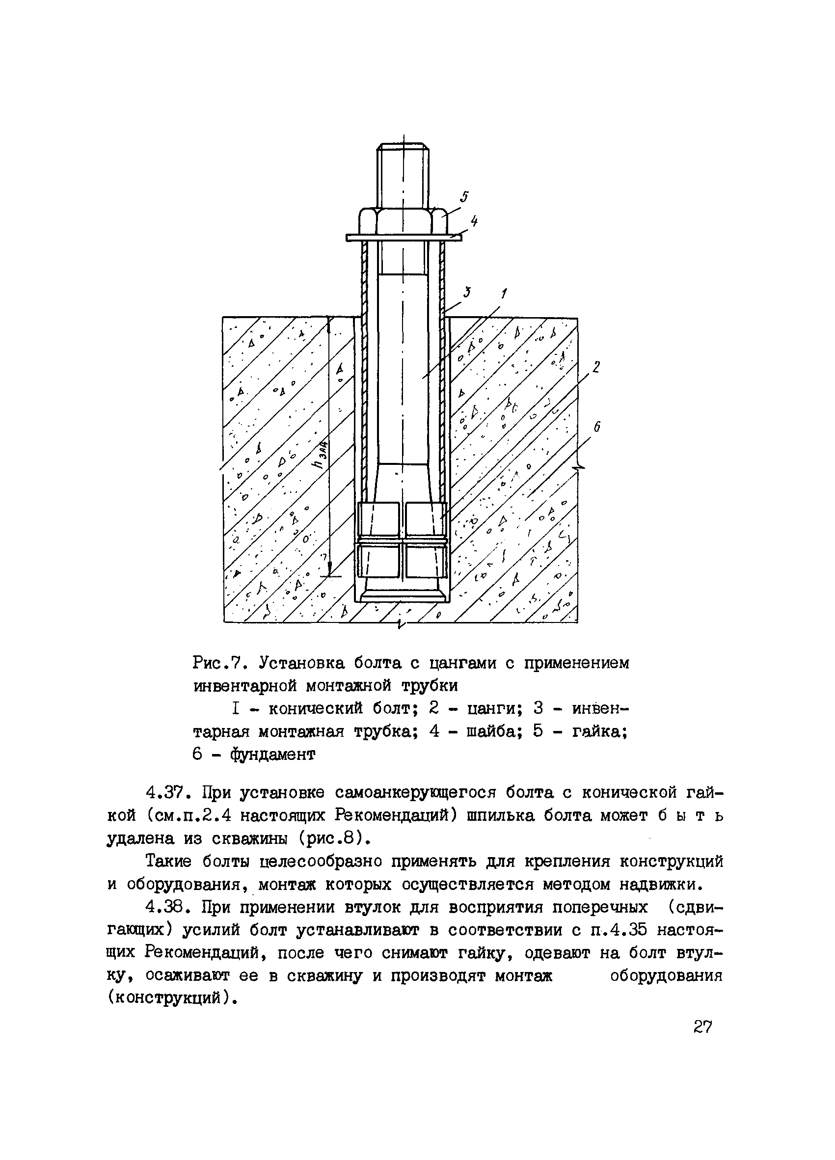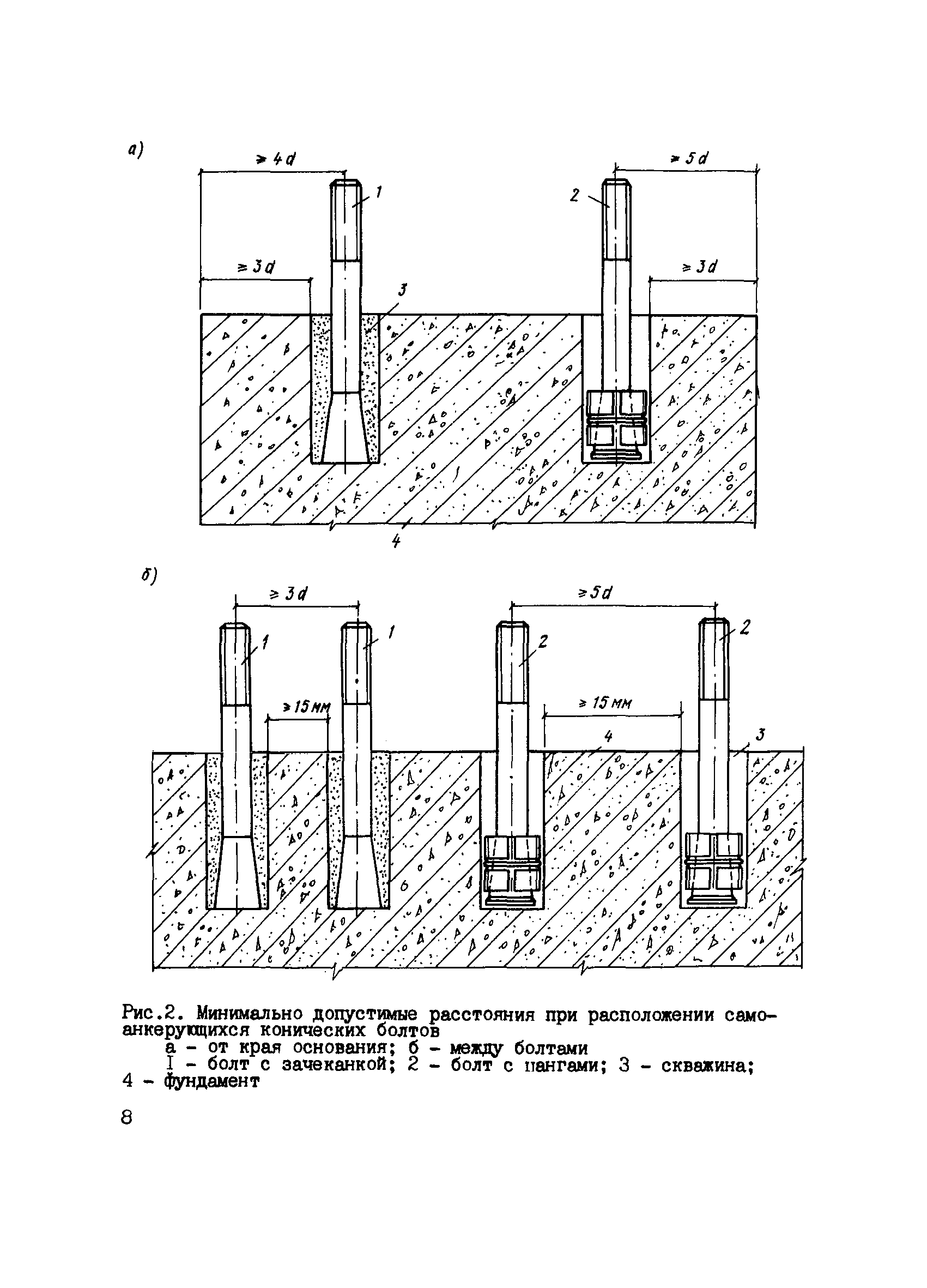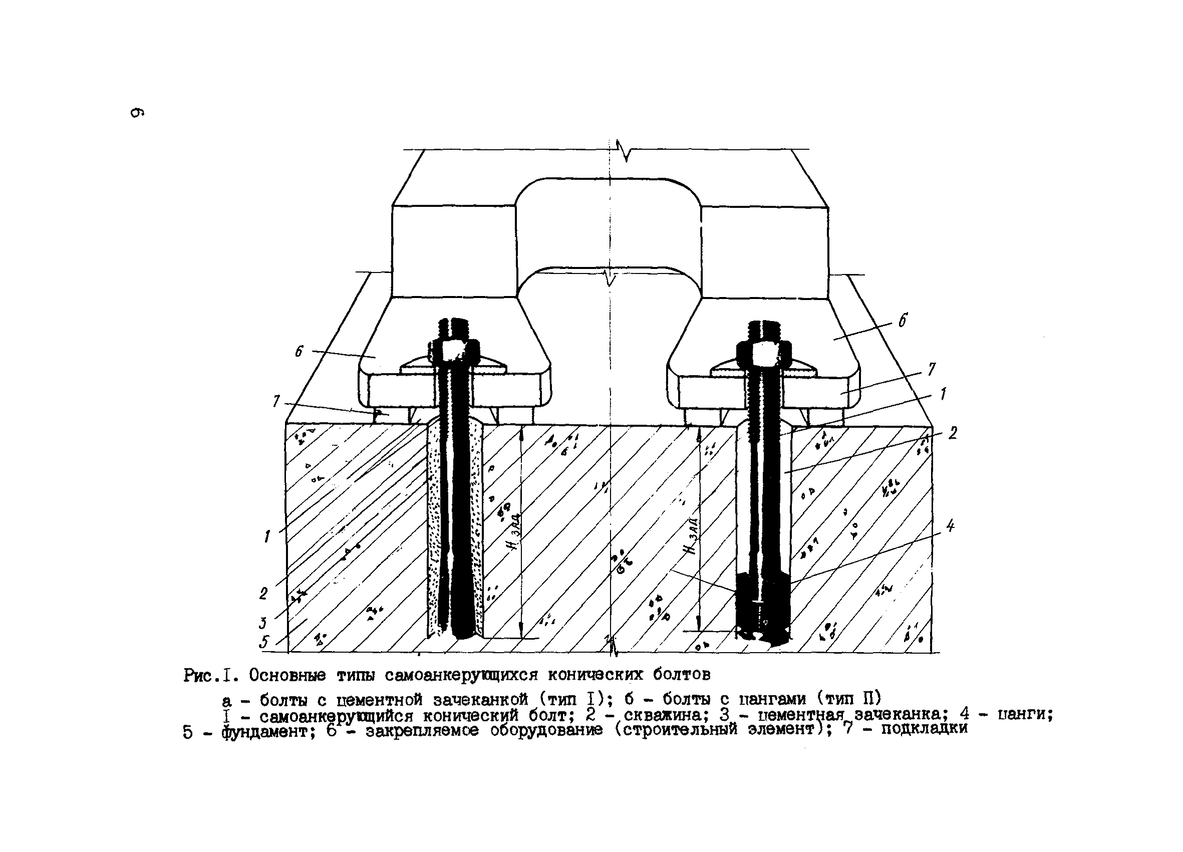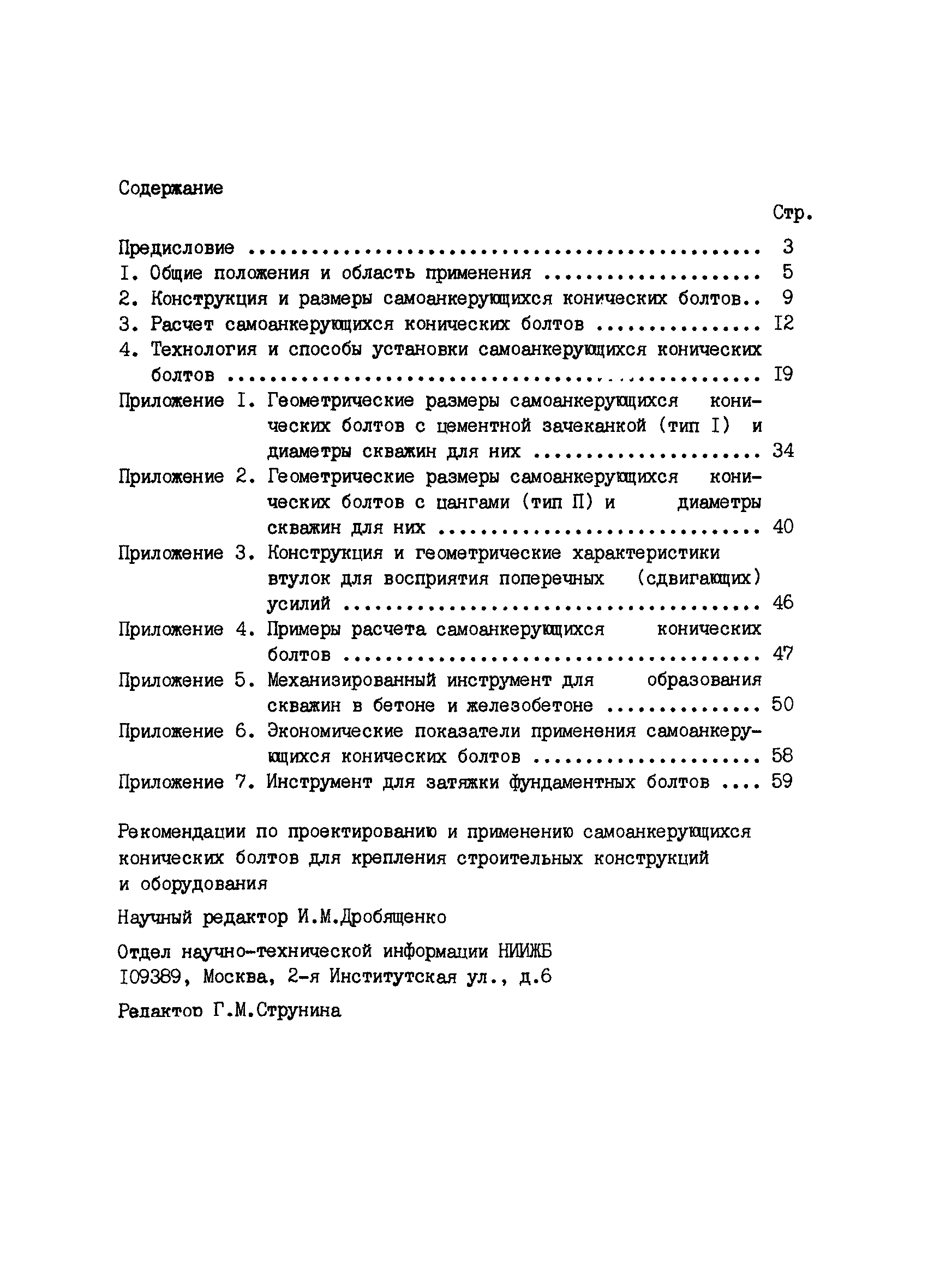 | Оглавление: | Предисловие 1. Общие положения и область применения 2. Конструкция и размеры самоанкерующихся конических болтов 3. Расчет самоанкерующихся конических болтов 4. Технология и способы установки самоанкерующихся конических болтов Приложение 1 Геометрические размеры самоанкерукщихся конических болтов с цементной зачеканкой (тип I) и диаметры скважин для них Приложение 2 Геометрические размеры самоанкерующихся конических болтов с цангами (тип II) и диаметры скважин для них Приложение 3 Конструкция и геометрические характеристики втулок для восприятия поперечных (сдвигающих) усилий Приложение 4 Примеры расчета самоанкерующихся конических болтов Приложение 5 Механизированный инструмент для образования скважин в бетоне и железобетоне Приложение 6 Экономические показатели применения самоанкерущихся конических болтов Приложение 7 Инструмент для затяжки фундаментных болтов |
