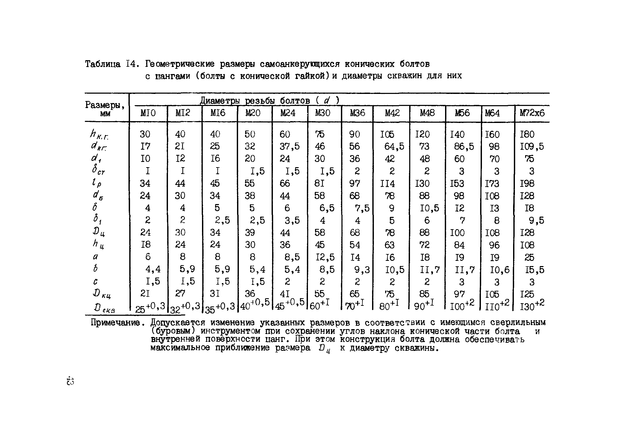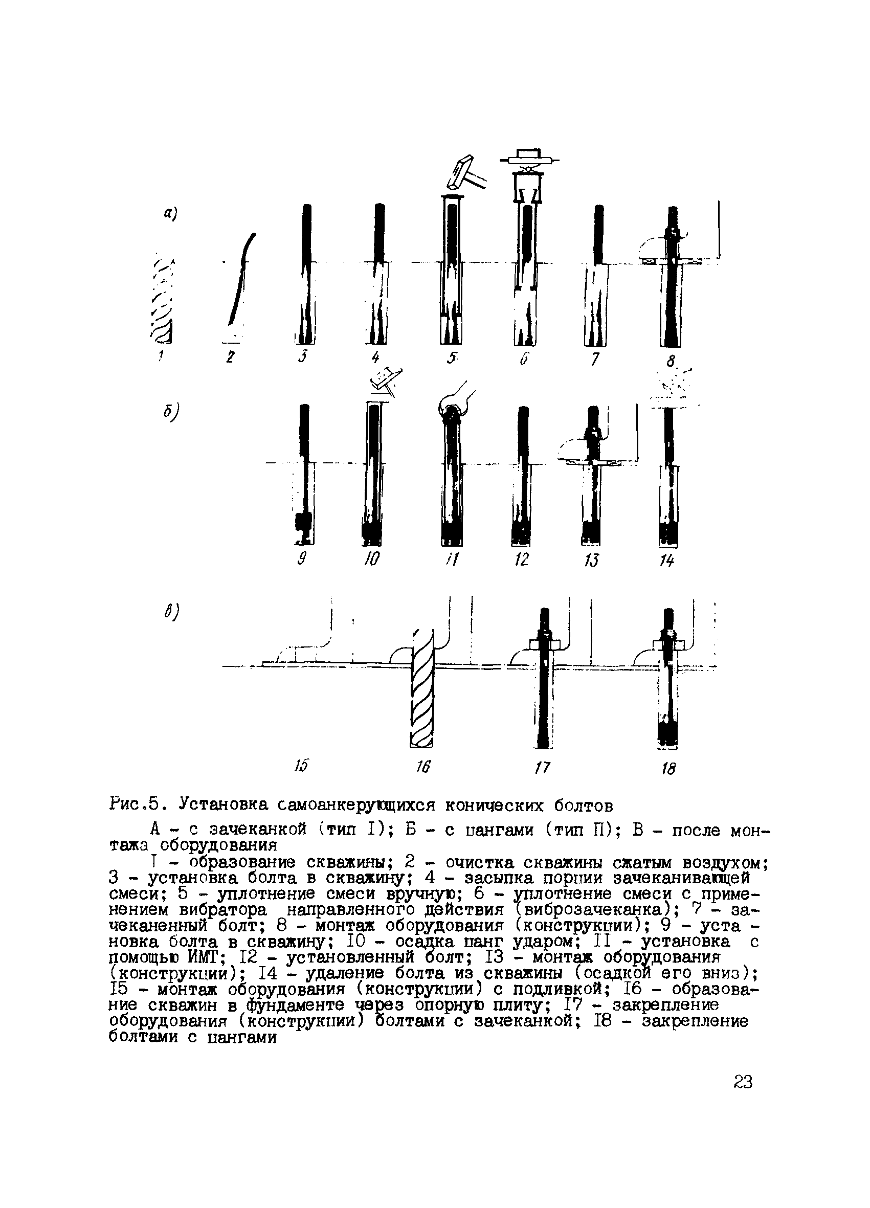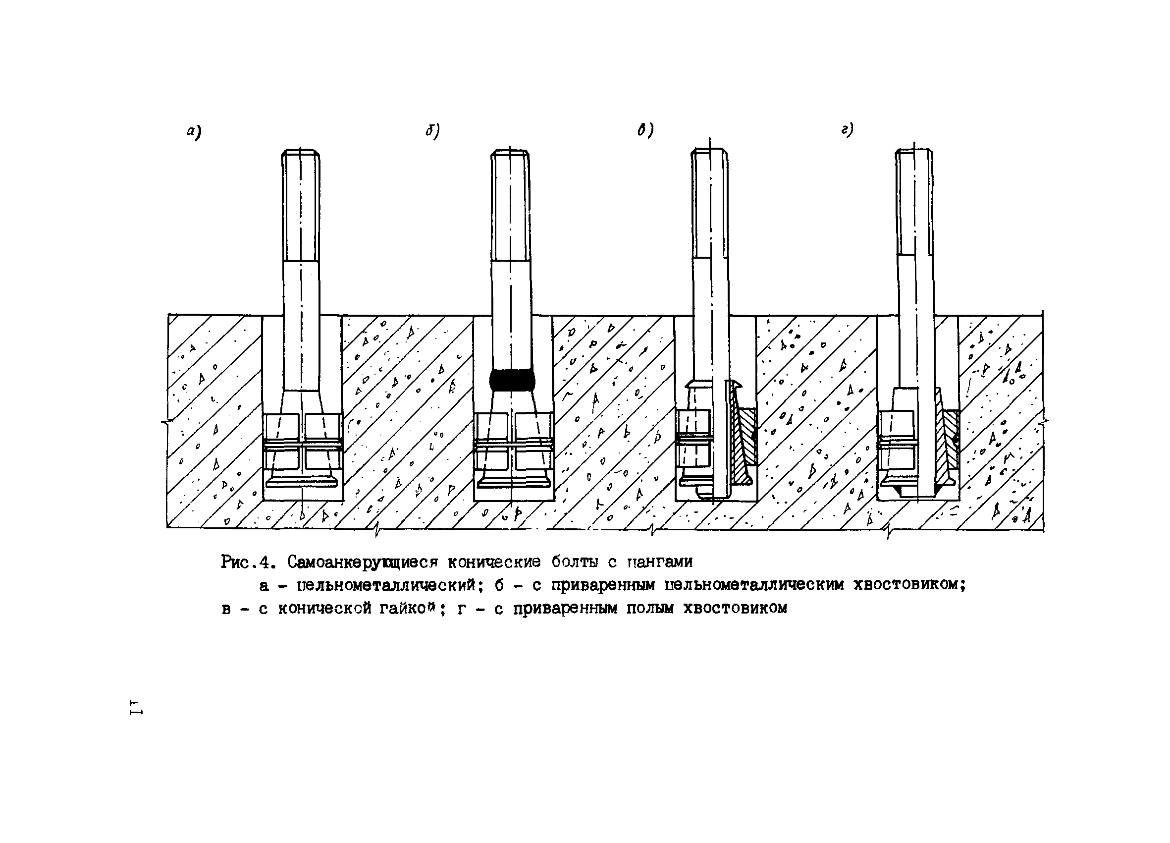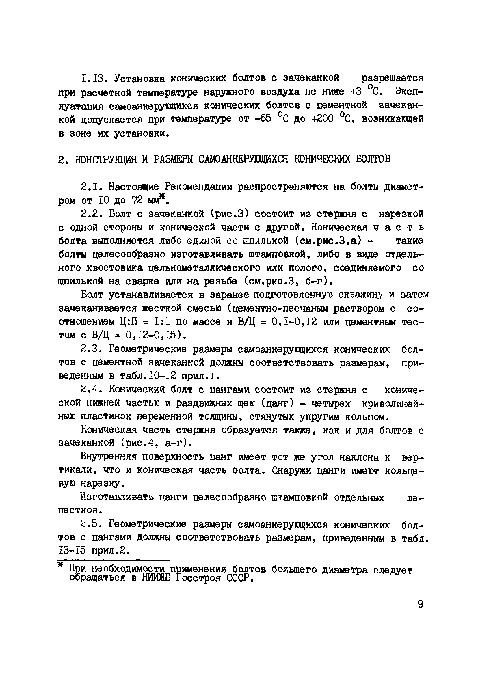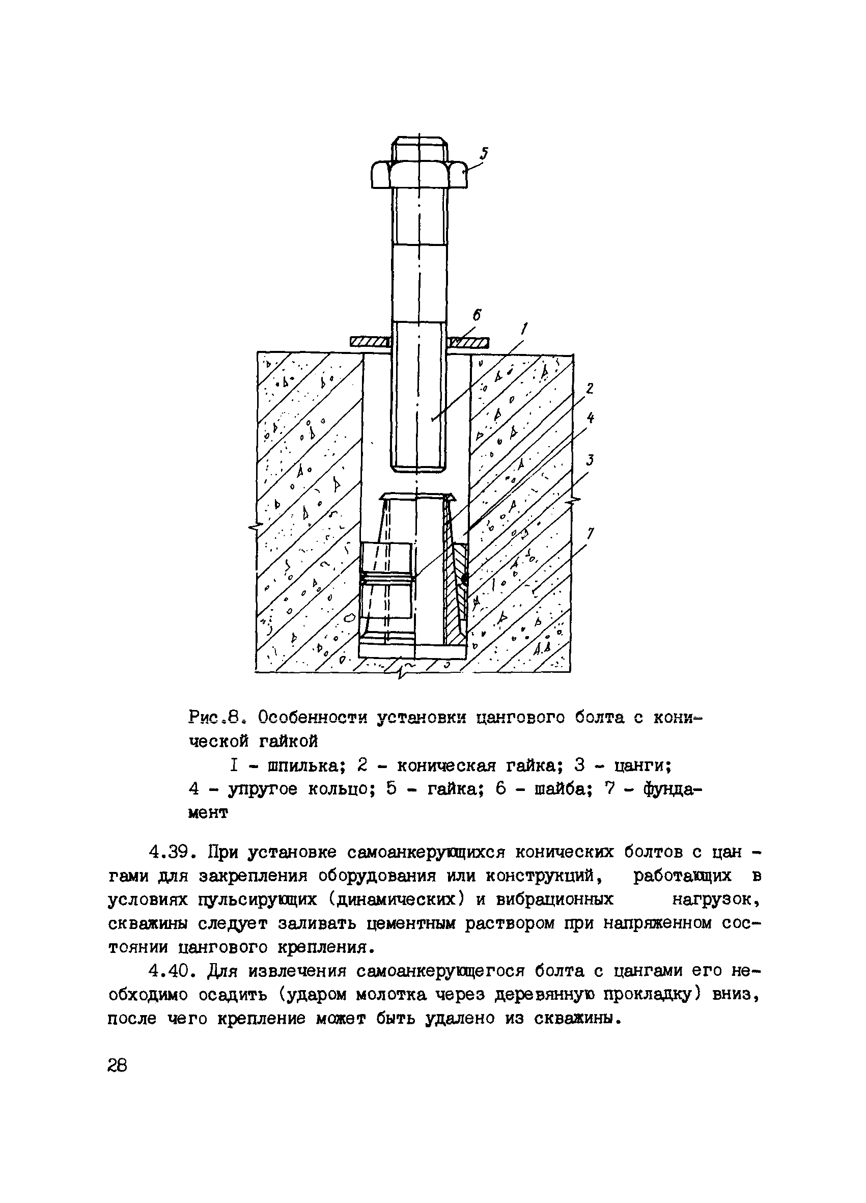 | Оглавление: | Предисловие 1. Общие положения и область применения 2. Конструкция и размеры самоанкерующихся конических болтов 3. Расчет самоанкерующихся конических болтов 4. Технология и способы установки самоанкерующихся конических болтов Приложение 1 Геометрические размеры самоанкерукщихся конических болтов с цементной зачеканкой (тип I) и диаметры скважин для них Приложение 2 Геометрические размеры самоанкерующихся конических болтов с цангами (тип II) и диаметры скважин для них Приложение 3 Конструкция и геометрические характеристики втулок для восприятия поперечных (сдвигающих) усилий Приложение 4 Примеры расчета самоанкерующихся конических болтов Приложение 5 Механизированный инструмент для образования скважин в бетоне и железобетоне Приложение 6 Экономические показатели применения самоанкерущихся конических болтов Приложение 7 Инструмент для затяжки фундаментных болтов |