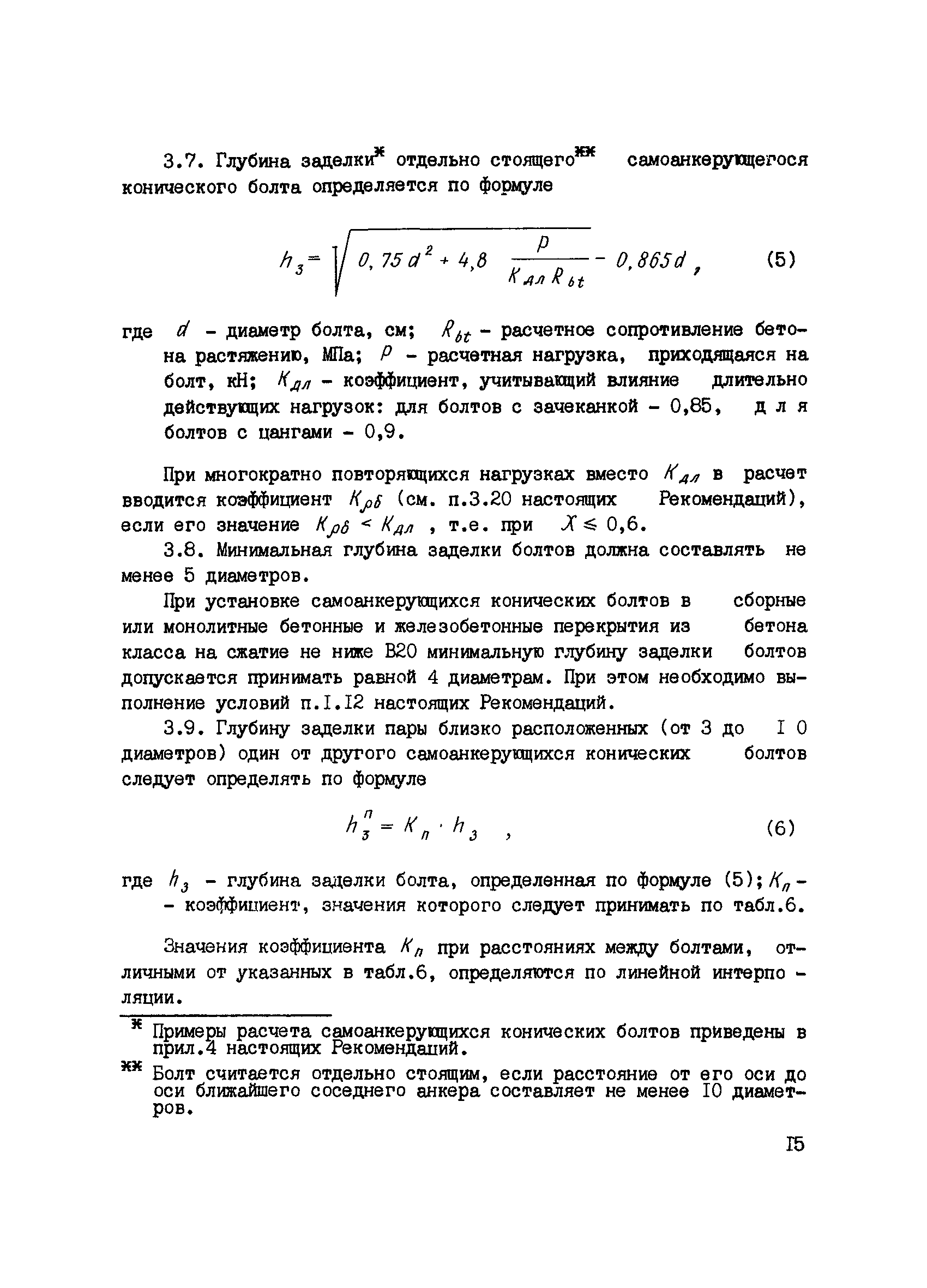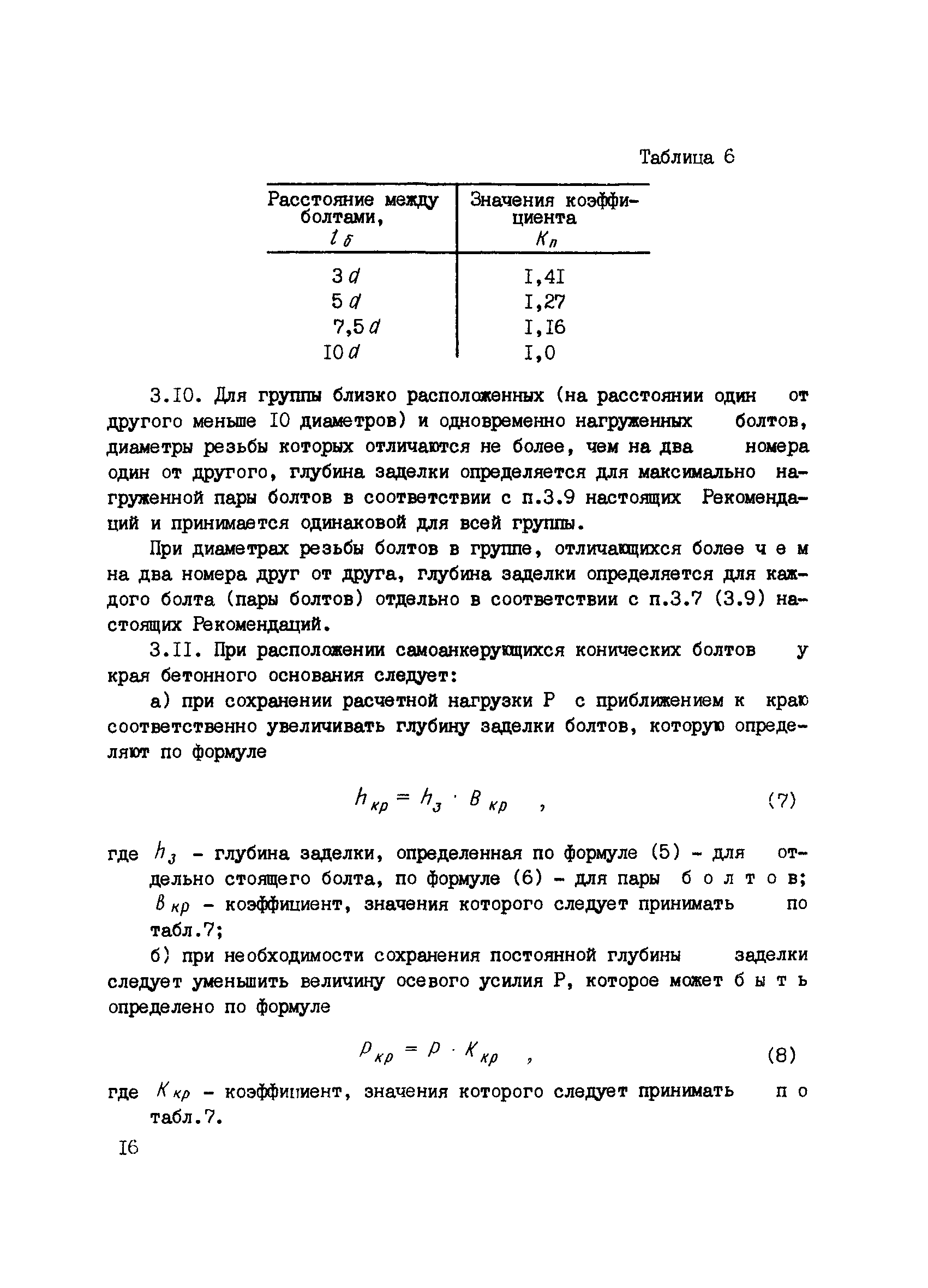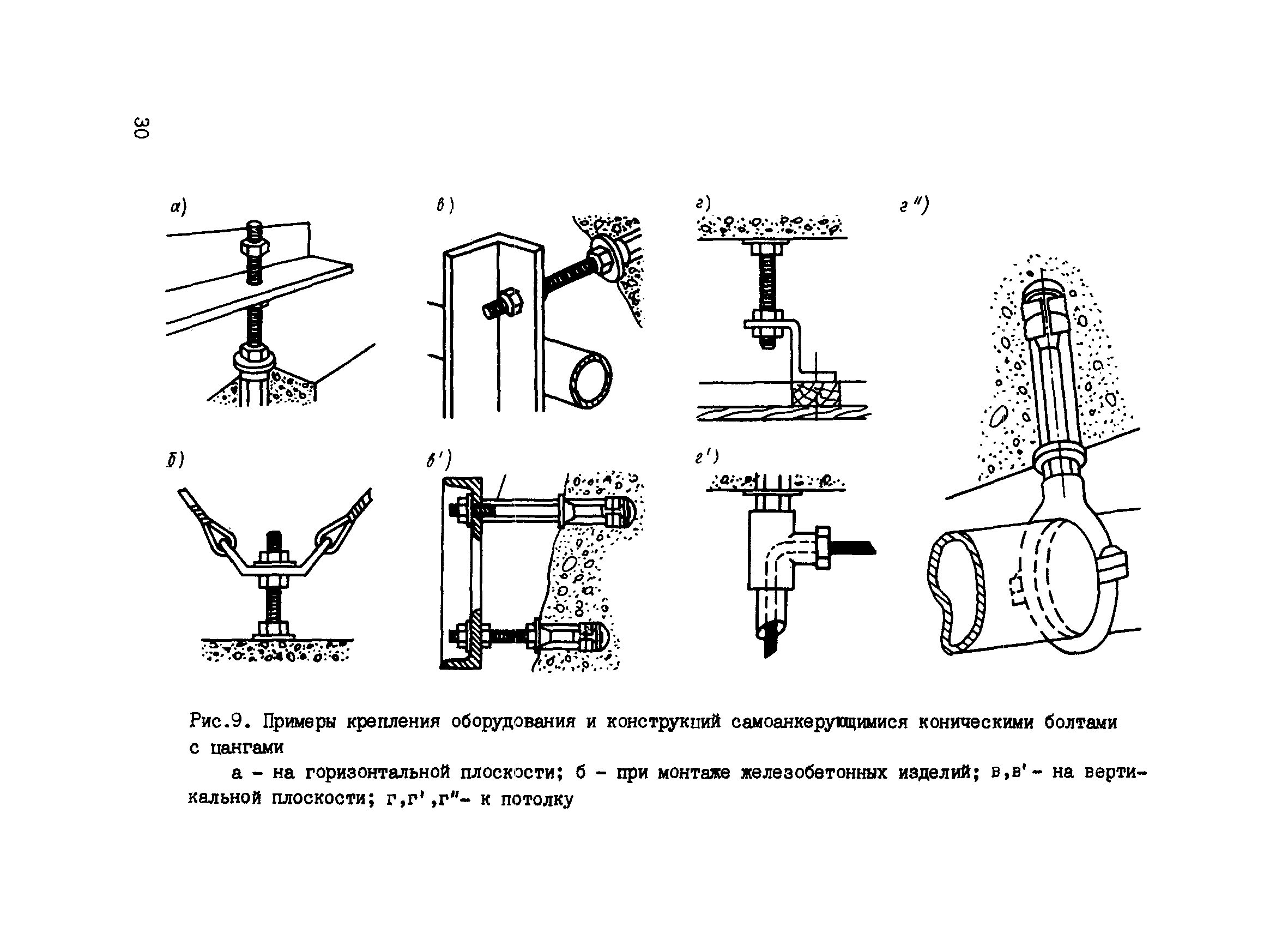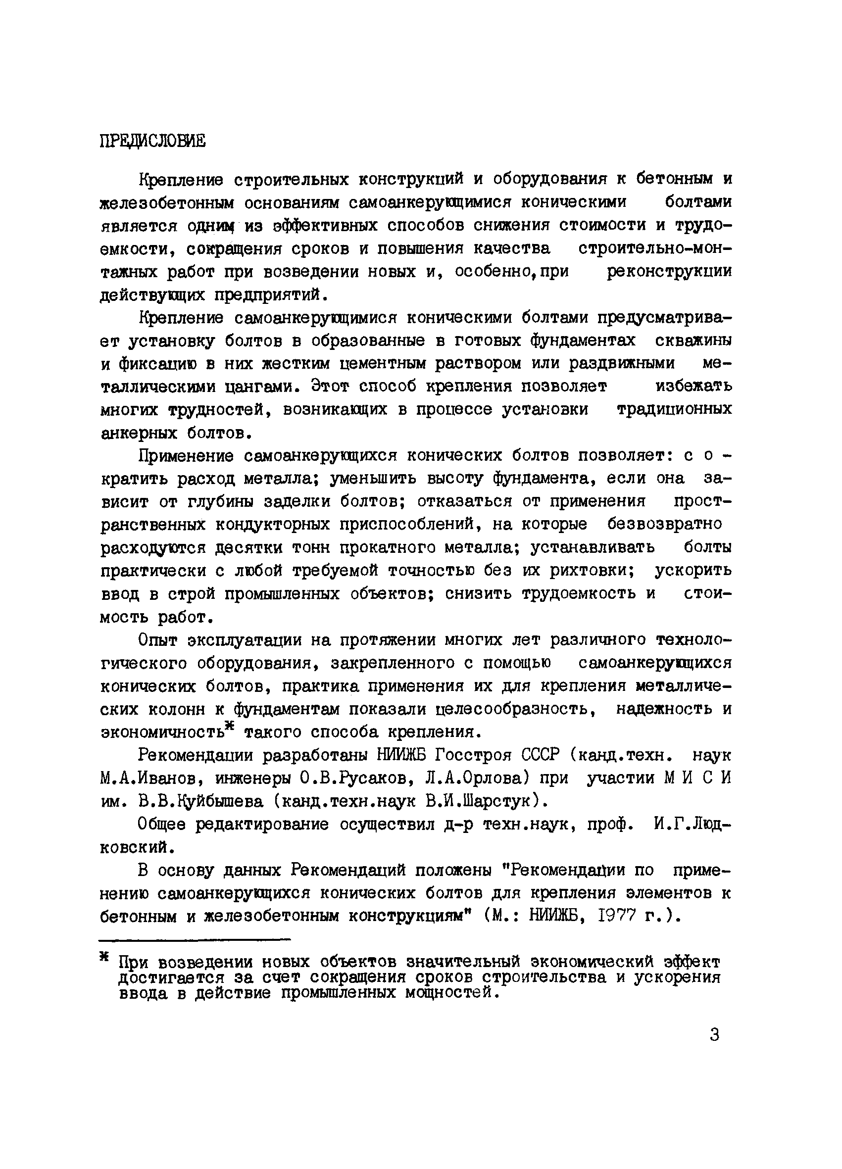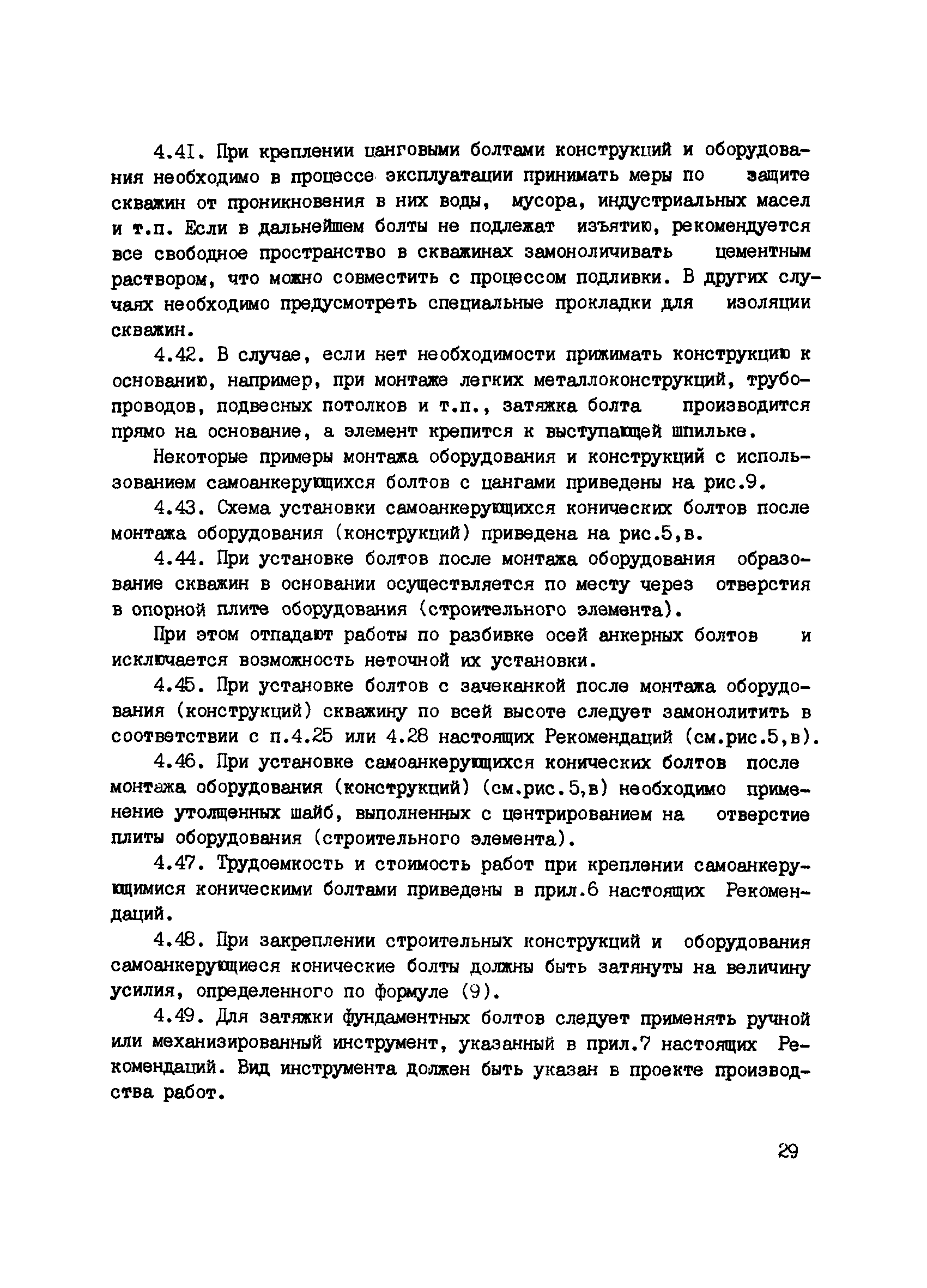 | Оглавление: | Предисловие 1. Общие положения и область применения 2. Конструкция и размеры самоанкерующихся конических болтов 3. Расчет самоанкерующихся конических болтов 4. Технология и способы установки самоанкерующихся конических болтов Приложение 1 Геометрические размеры самоанкерукщихся конических болтов с цементной зачеканкой (тип I) и диаметры скважин для них Приложение 2 Геометрические размеры самоанкерующихся конических болтов с цангами (тип II) и диаметры скважин для них Приложение 3 Конструкция и геометрические характеристики втулок для восприятия поперечных (сдвигающих) усилий Приложение 4 Примеры расчета самоанкерующихся конических болтов Приложение 5 Механизированный инструмент для образования скважин в бетоне и железобетоне Приложение 6 Экономические показатели применения самоанкерущихся конических болтов Приложение 7 Инструмент для затяжки фундаментных болтов |