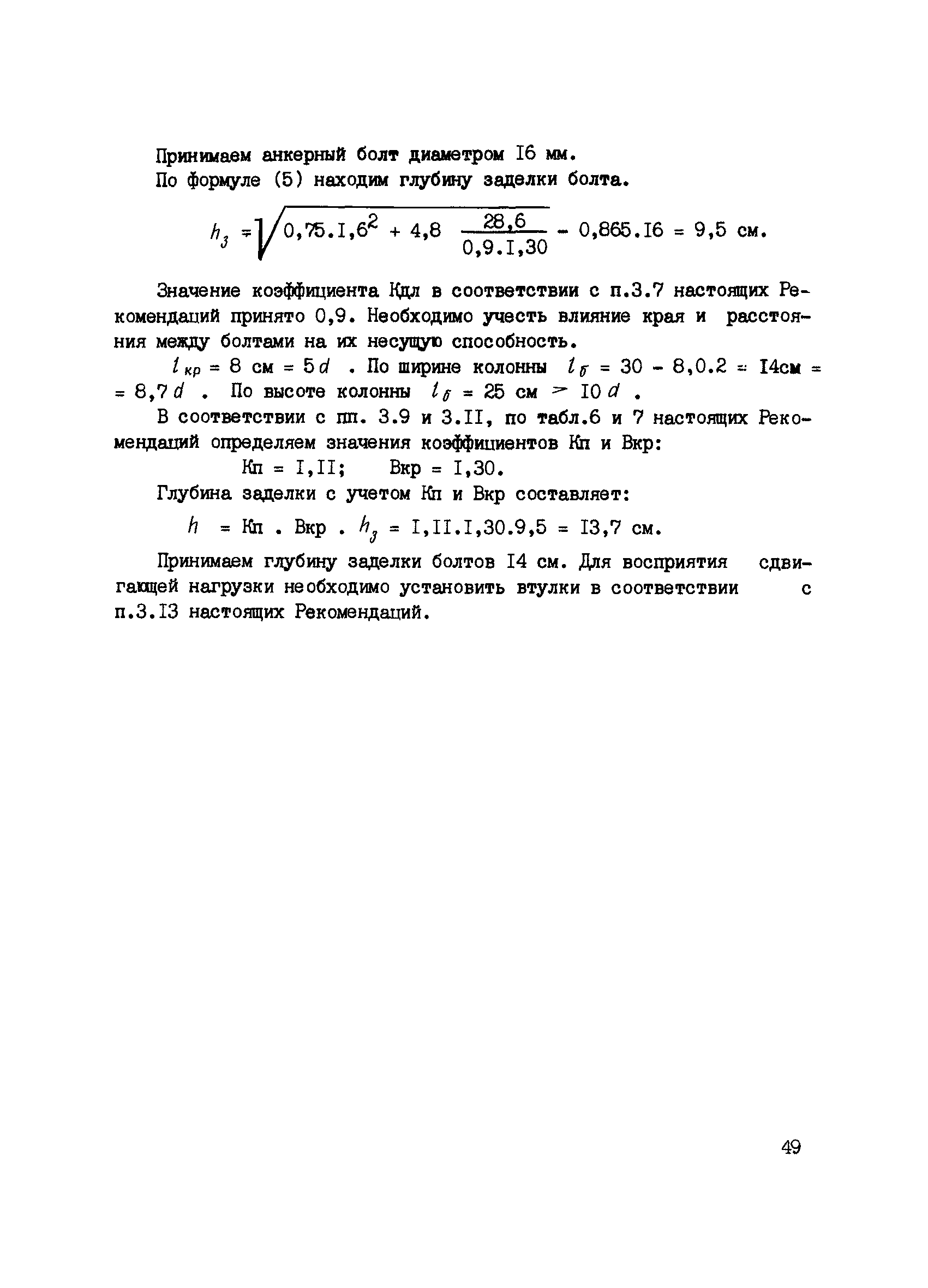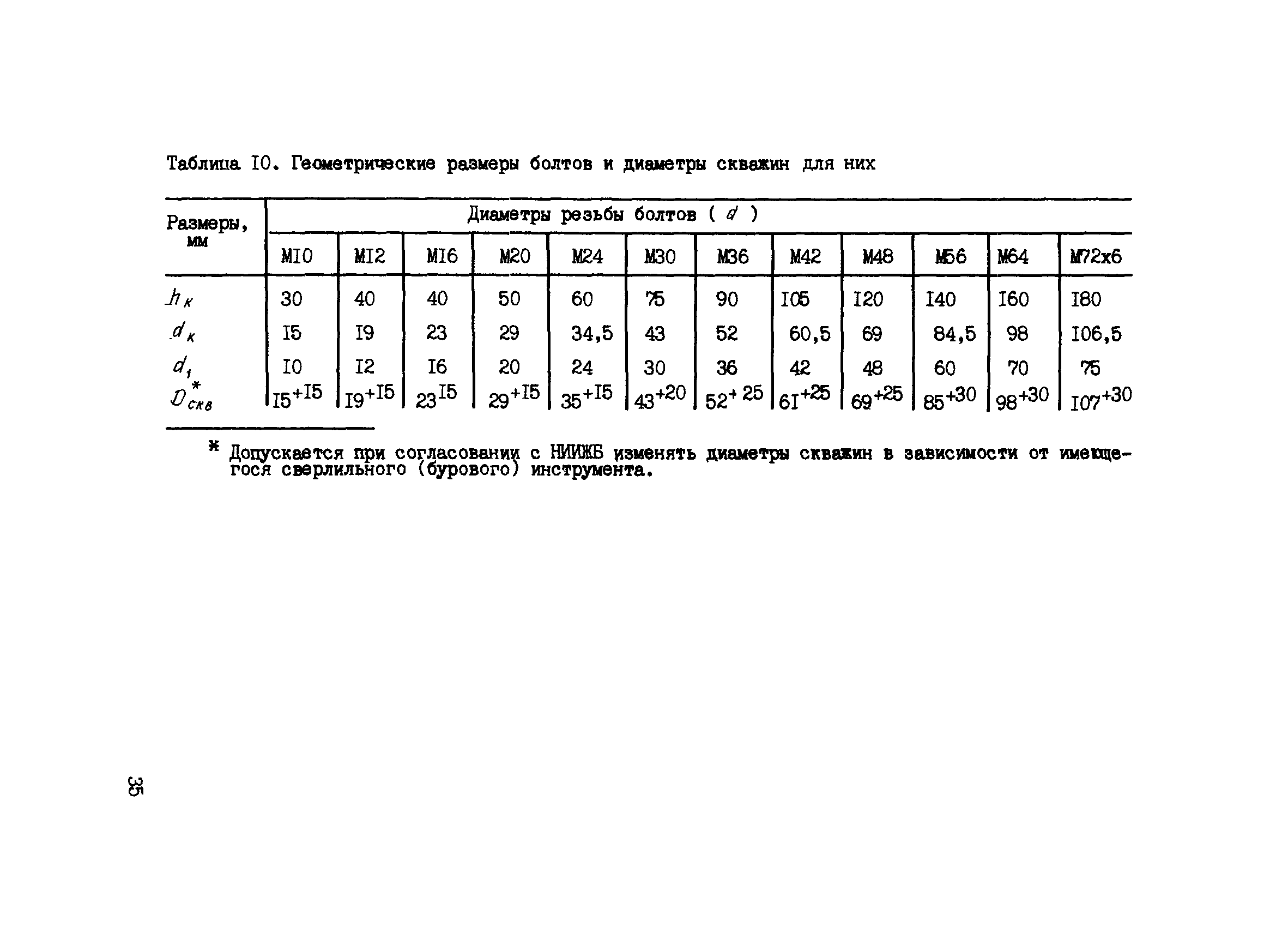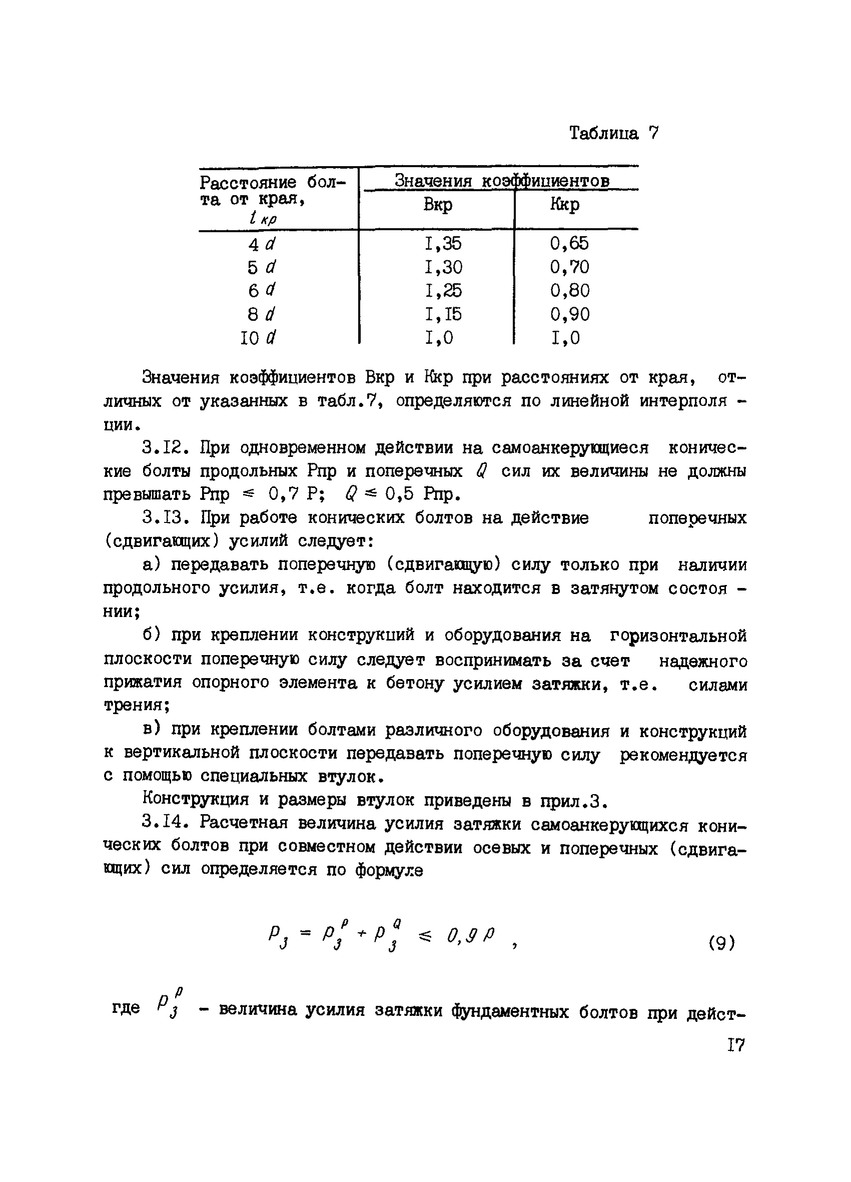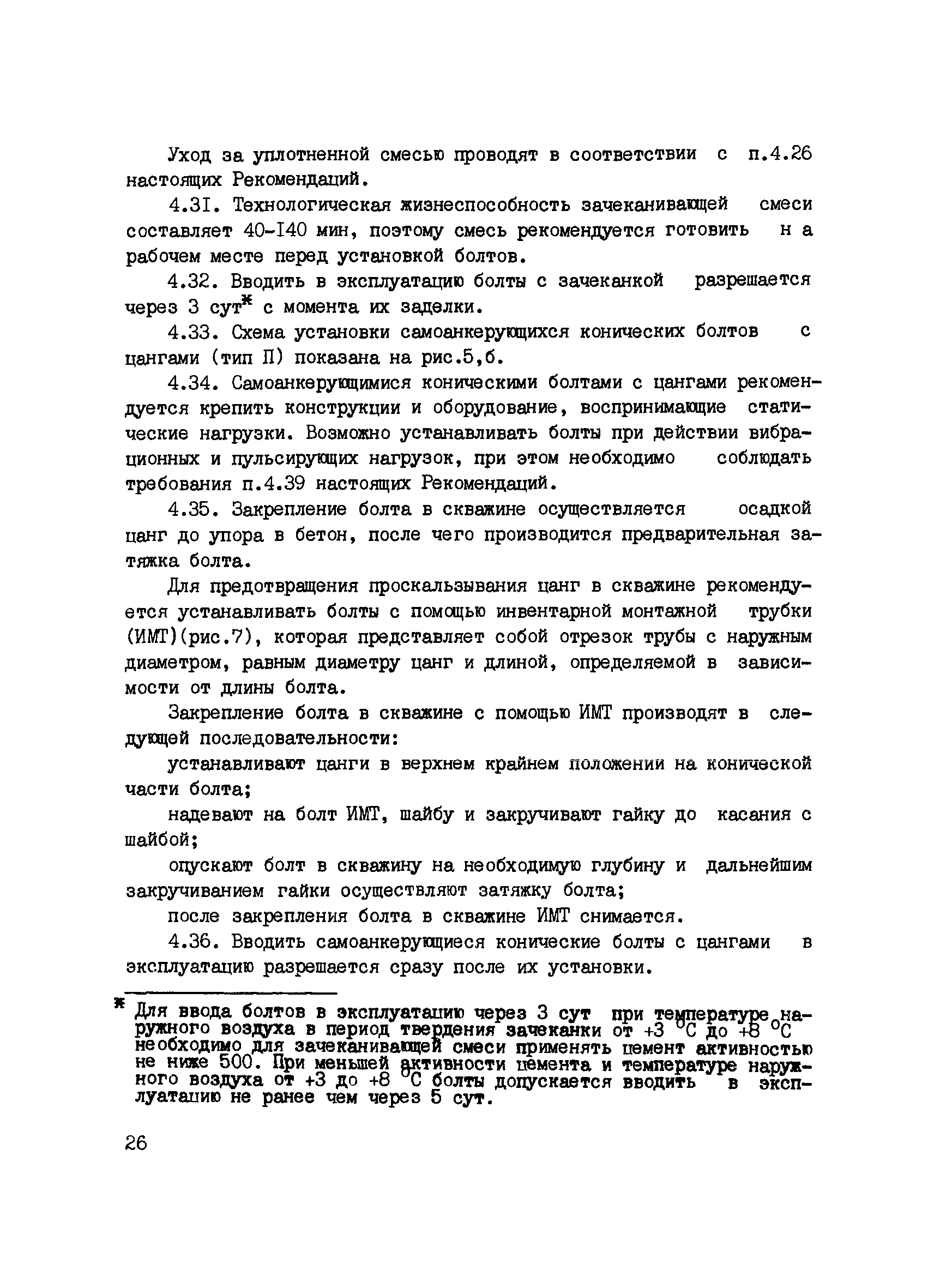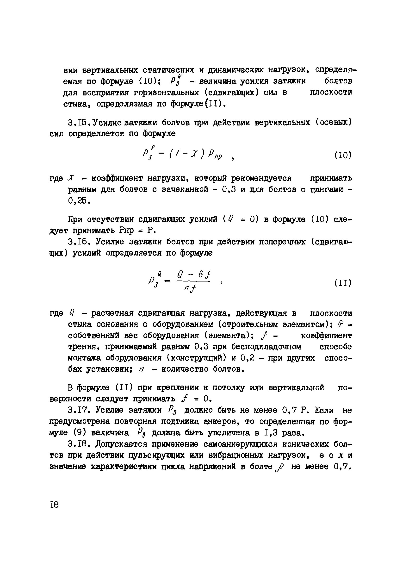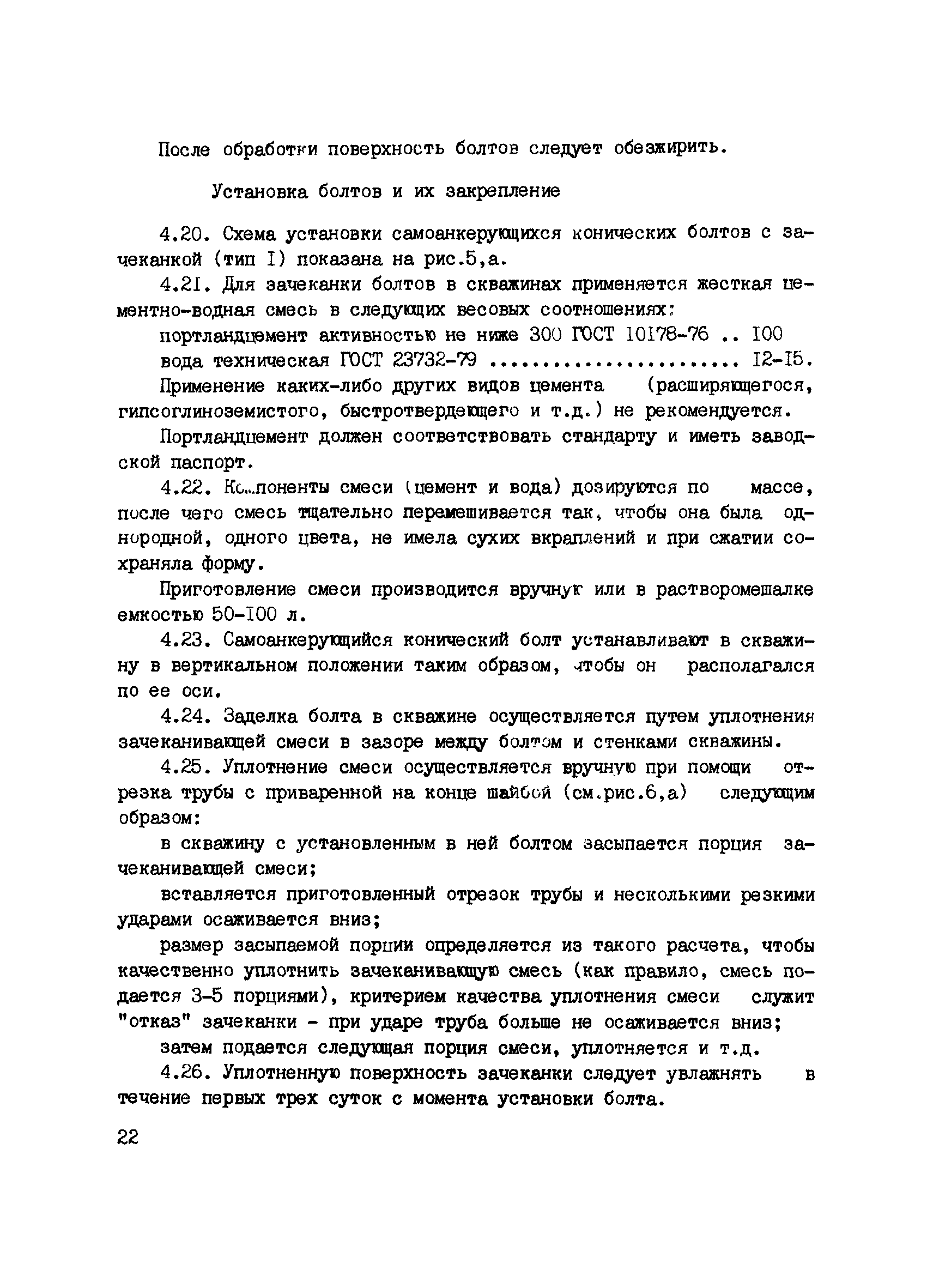 | Оглавление: | Предисловие 1. Общие положения и область применения 2. Конструкция и размеры самоанкерующихся конических болтов 3. Расчет самоанкерующихся конических болтов 4. Технология и способы установки самоанкерующихся конических болтов Приложение 1 Геометрические размеры самоанкерукщихся конических болтов с цементной зачеканкой (тип I) и диаметры скважин для них Приложение 2 Геометрические размеры самоанкерующихся конических болтов с цангами (тип II) и диаметры скважин для них Приложение 3 Конструкция и геометрические характеристики втулок для восприятия поперечных (сдвигающих) усилий Приложение 4 Примеры расчета самоанкерующихся конических болтов Приложение 5 Механизированный инструмент для образования скважин в бетоне и железобетоне Приложение 6 Экономические показатели применения самоанкерущихся конических болтов Приложение 7 Инструмент для затяжки фундаментных болтов |
