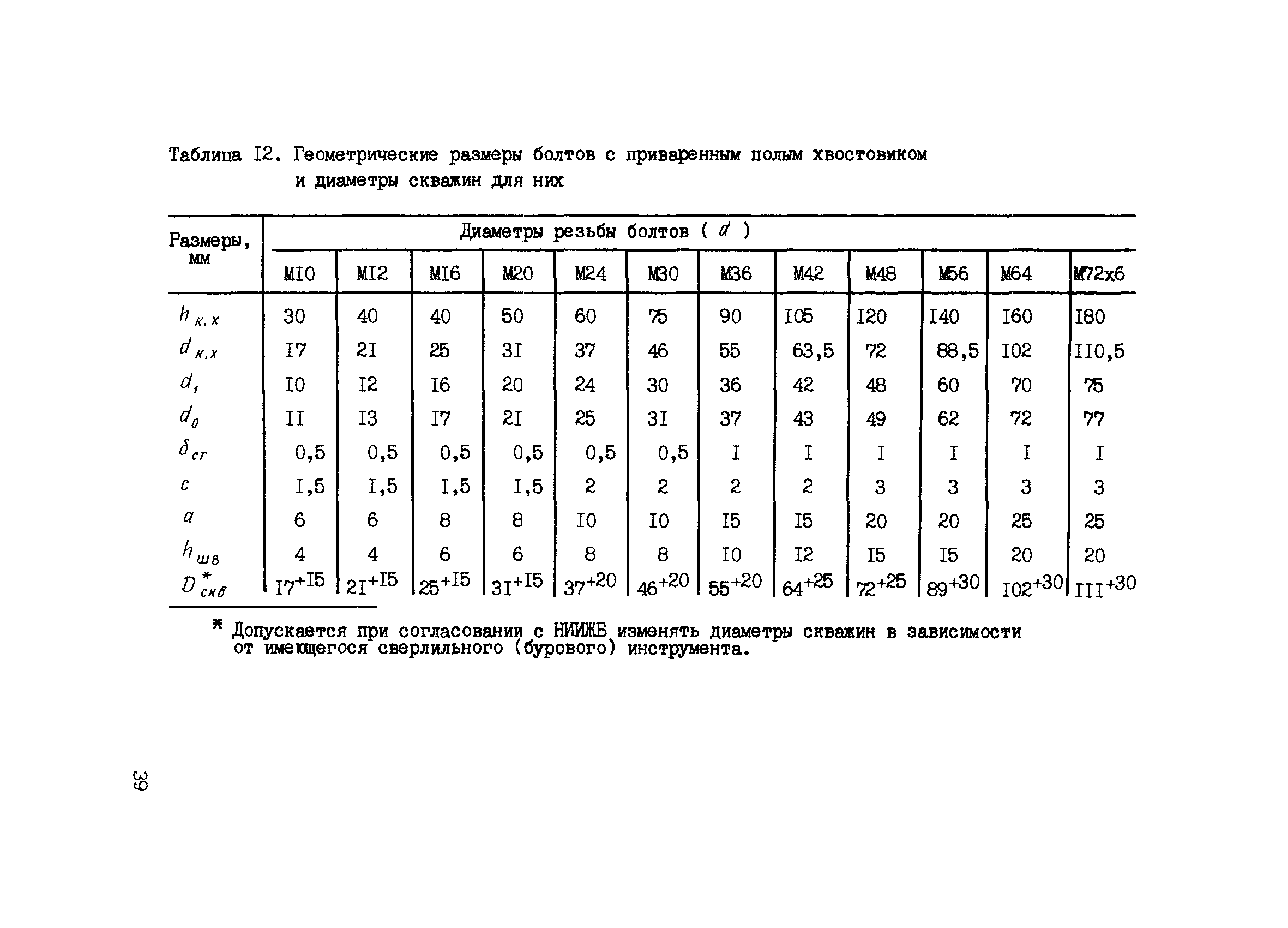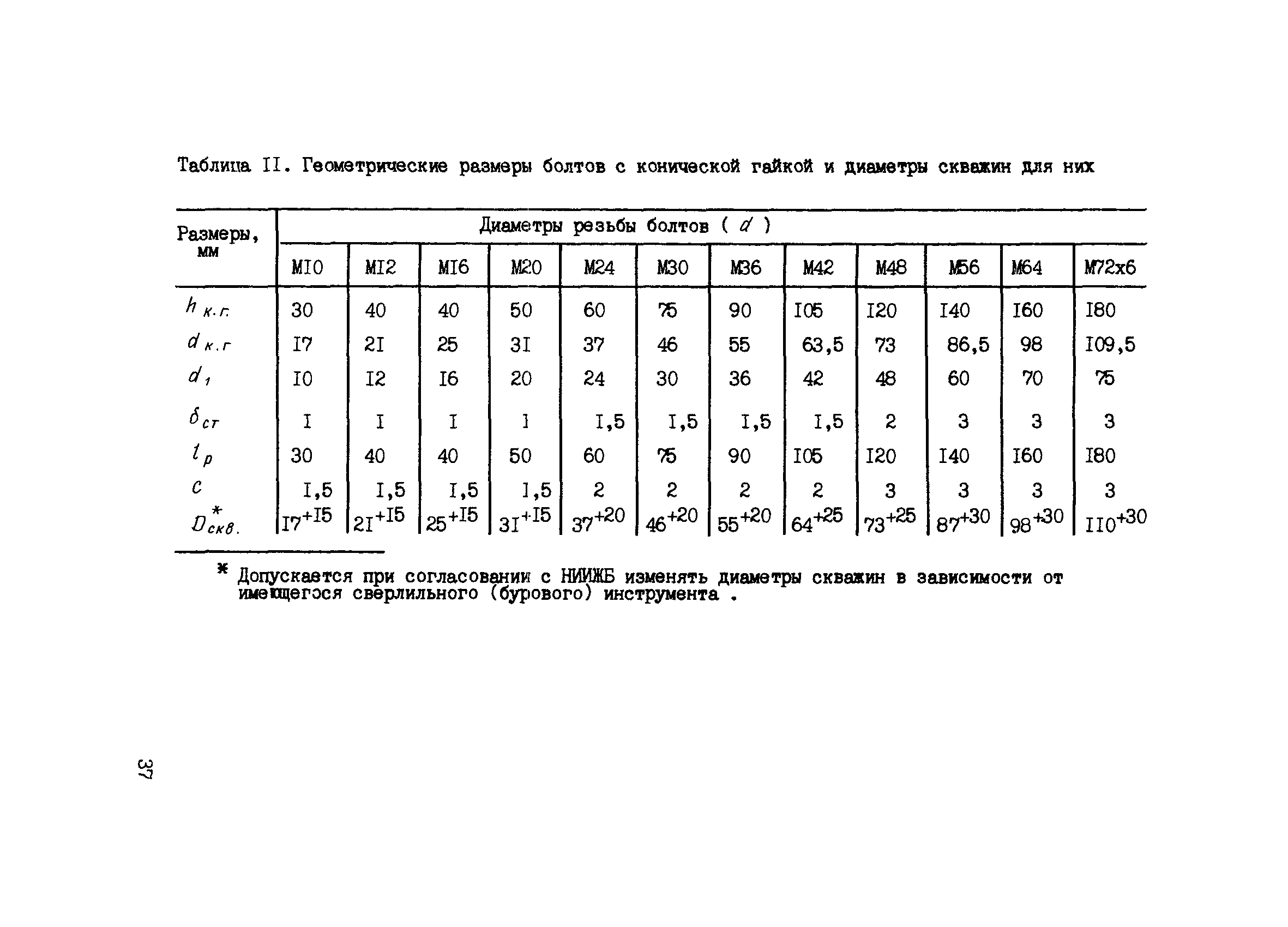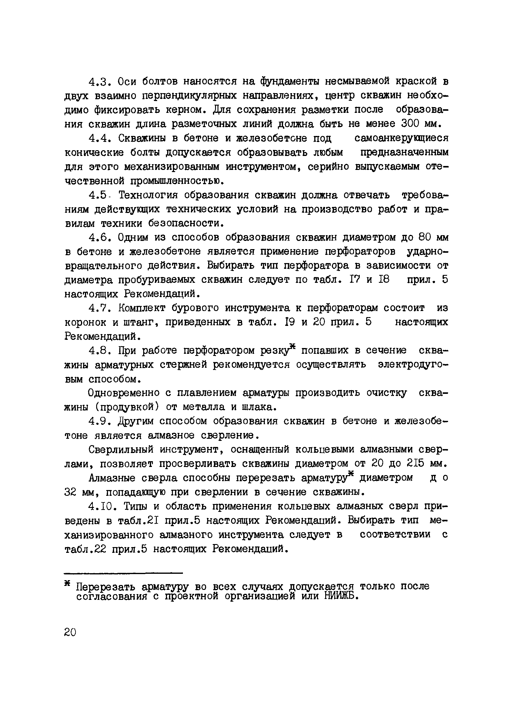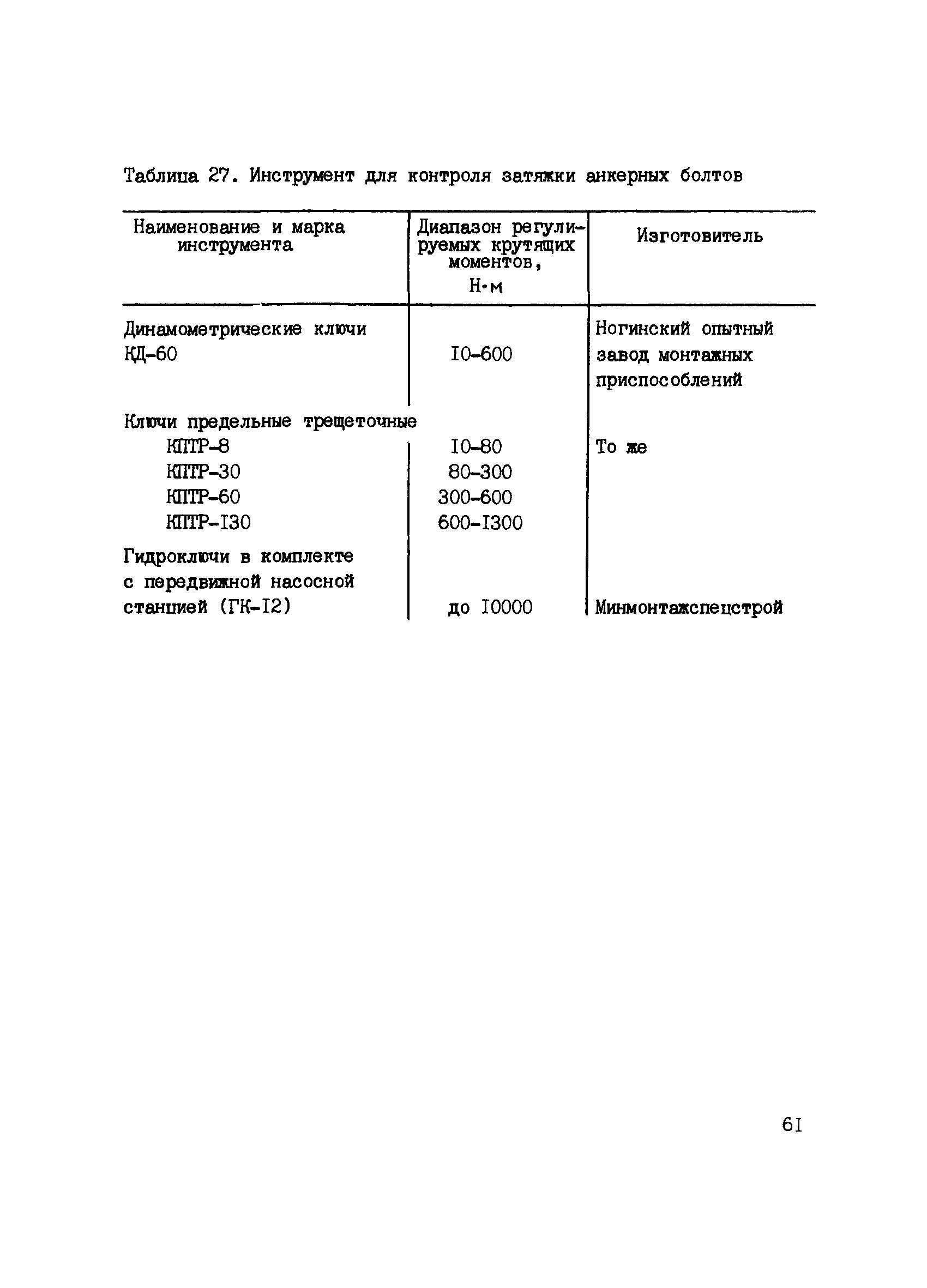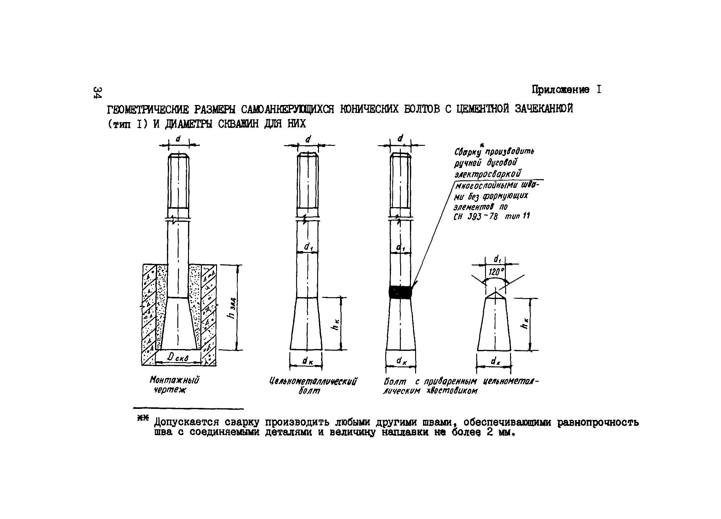 | Оглавление: | Предисловие 1. Общие положения и область применения 2. Конструкция и размеры самоанкерующихся конических болтов 3. Расчет самоанкерующихся конических болтов 4. Технология и способы установки самоанкерующихся конических болтов Приложение 1 Геометрические размеры самоанкерукщихся конических болтов с цементной зачеканкой (тип I) и диаметры скважин для них Приложение 2 Геометрические размеры самоанкерующихся конических болтов с цангами (тип II) и диаметры скважин для них Приложение 3 Конструкция и геометрические характеристики втулок для восприятия поперечных (сдвигающих) усилий Приложение 4 Примеры расчета самоанкерующихся конических болтов Приложение 5 Механизированный инструмент для образования скважин в бетоне и железобетоне Приложение 6 Экономические показатели применения самоанкерущихся конических болтов Приложение 7 Инструмент для затяжки фундаментных болтов |