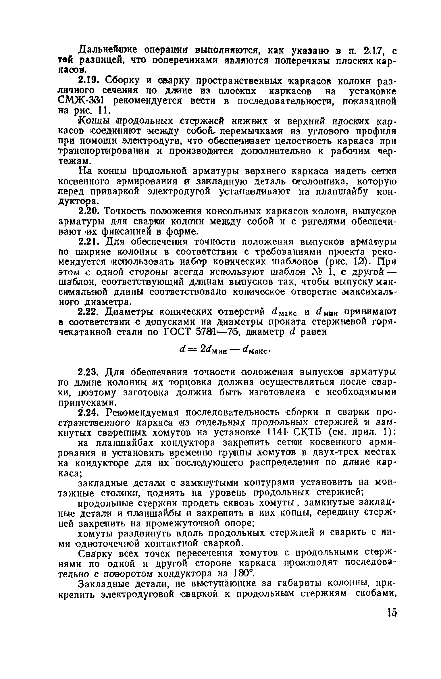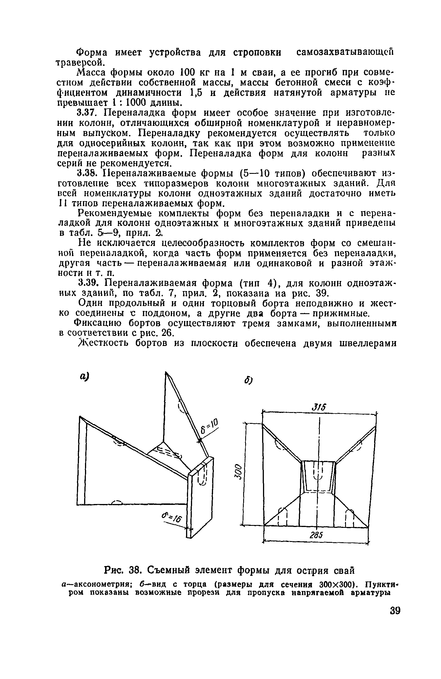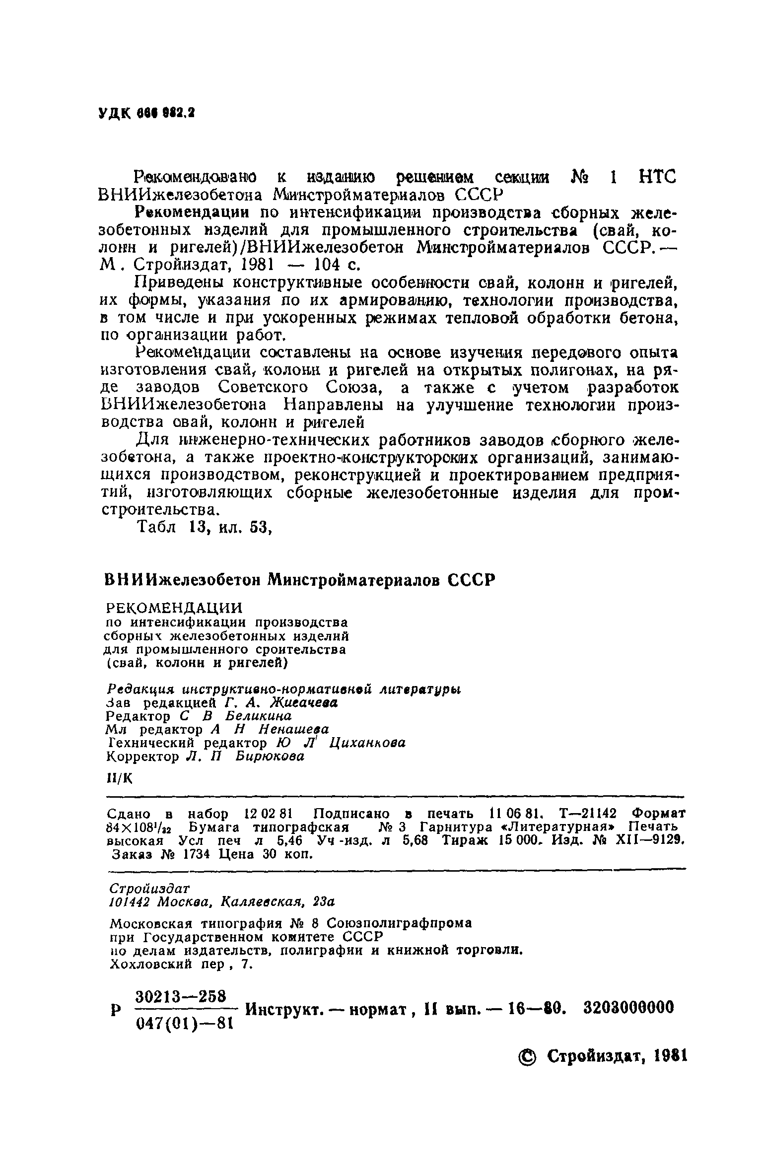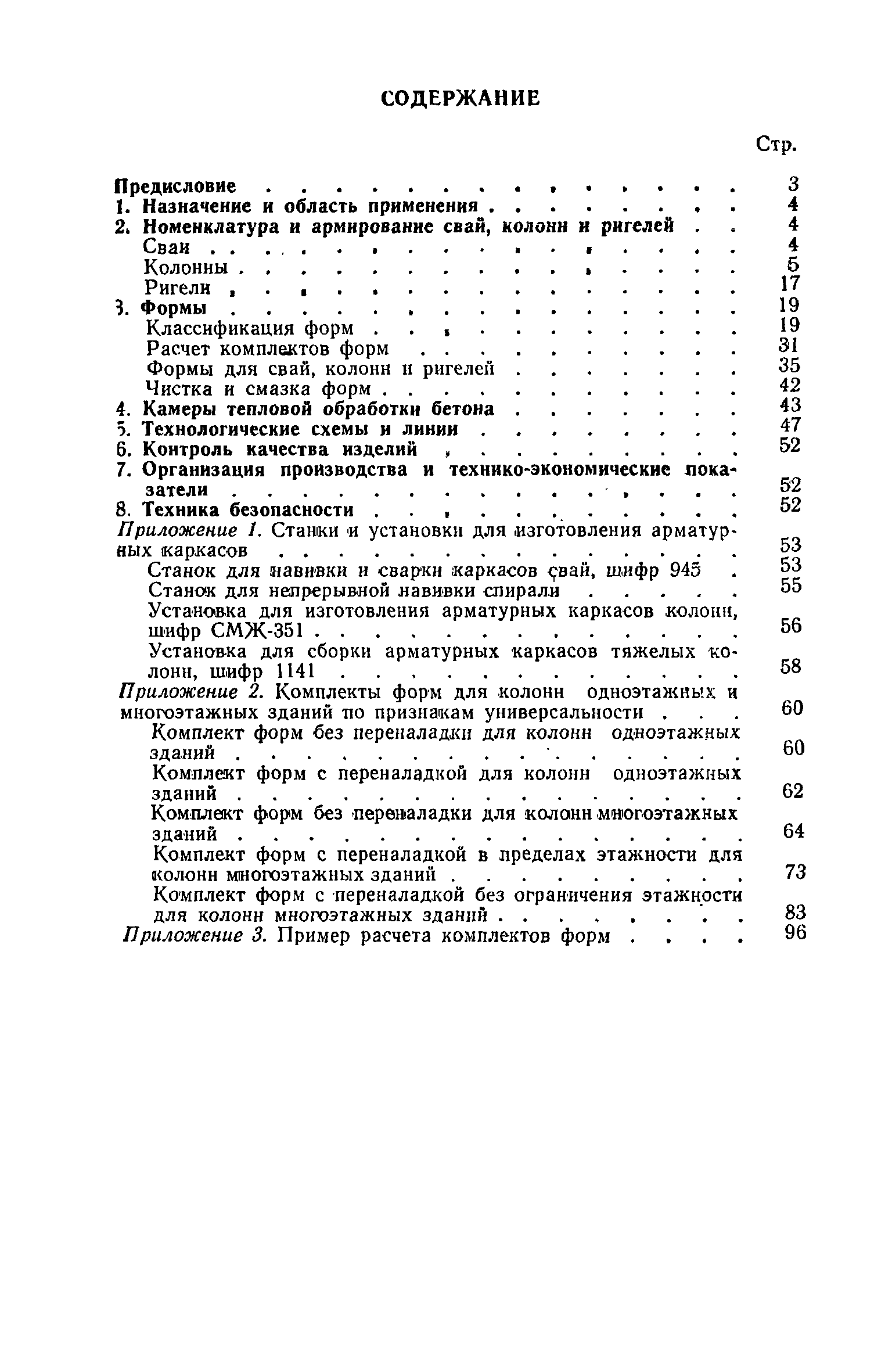 Рекомендации по интенсификации производства сборных железобетонных изделий для промышленного строительства (свай, колонн и ригелей)| Статус: | справочные материалы, мп, тпр | | Название рус.: | Рекомендации по интенсификации производства сборных железобетонных изделий для промышленного строительства (свай, колонн и ригелей) | | Дата добавления в базу: | 01.09.2013 | | Дата актуализации: | 01.01.2021 | | Область применения: | В документе приведены конструктивные особенности свай, колонн и ригелей, их формы, указания по их армированию, технологии производства, в том числе и при ускоренных режимах тепловой обработки бетона, по организации работ. Рекомендации составлены на основе изучения передового опыта изготовления свай колонн и ригелей на открытых полигонах, на ряде заводов Советского Союза, а также с учетом разработок ВНИИжелезобетона и направлены на улучшение технологии производства свай, колонн и ригелей. Для инженерно-технических работников заводов сборного железобетона, а также проектно-конструкторских организаций, занимающихся производством, реконструкцией и проектированием предприятий, изготовляющих сборные железобетонные изделия для промышленного строительства. | | Оглавление: | Предисловие 1. Назначение и область применения 2. Номенклатура и армирование свай, колонн и ригелей Сваи Колонны Ригели 3. Формы Классификация форм Расчет комплектов форм Формы для свай, колонн и ригелей Чистка и смазка форм 4. Камеры тепловой обработки бетона 5. Технологические схемы и линии 6. Контроль качества изделий 7. Организация производства и технико-экономические показатели 8. Техника безопасности Приложение 1. Станки и установки для изготовления арматурных каркасов Станок для навивки и сварки каркасов свай, шифр 945 Станок для непрерывной навивки спирали Установка для изготовления арматурных каркасов колонн, шифр СМЖ-351 Установка для сборки арматурных каркасов тяжелых колонн, шифр 1141 Приложение 2. Комплекты форм для колонн одноэтажных и многоэтажных зданий по признакам универсальности Комплект форм без перекладки для колонн одноэтажных зданий Комплект форм с переналадкой для колонн одноэтажных зданий Комплект форм без переналадки для колонн многоэтажных зданий Комплект форм с переналадкой в пределах этажности для колонн многоэтажных зданий Комплект форм с переналадкой без ограничения этажности для колонн многоэтажных зданий Приложение 3. Пример расчета комплектов форм | | Утверждён: | ВНИИжелезобетон Минстройматериалов СССР