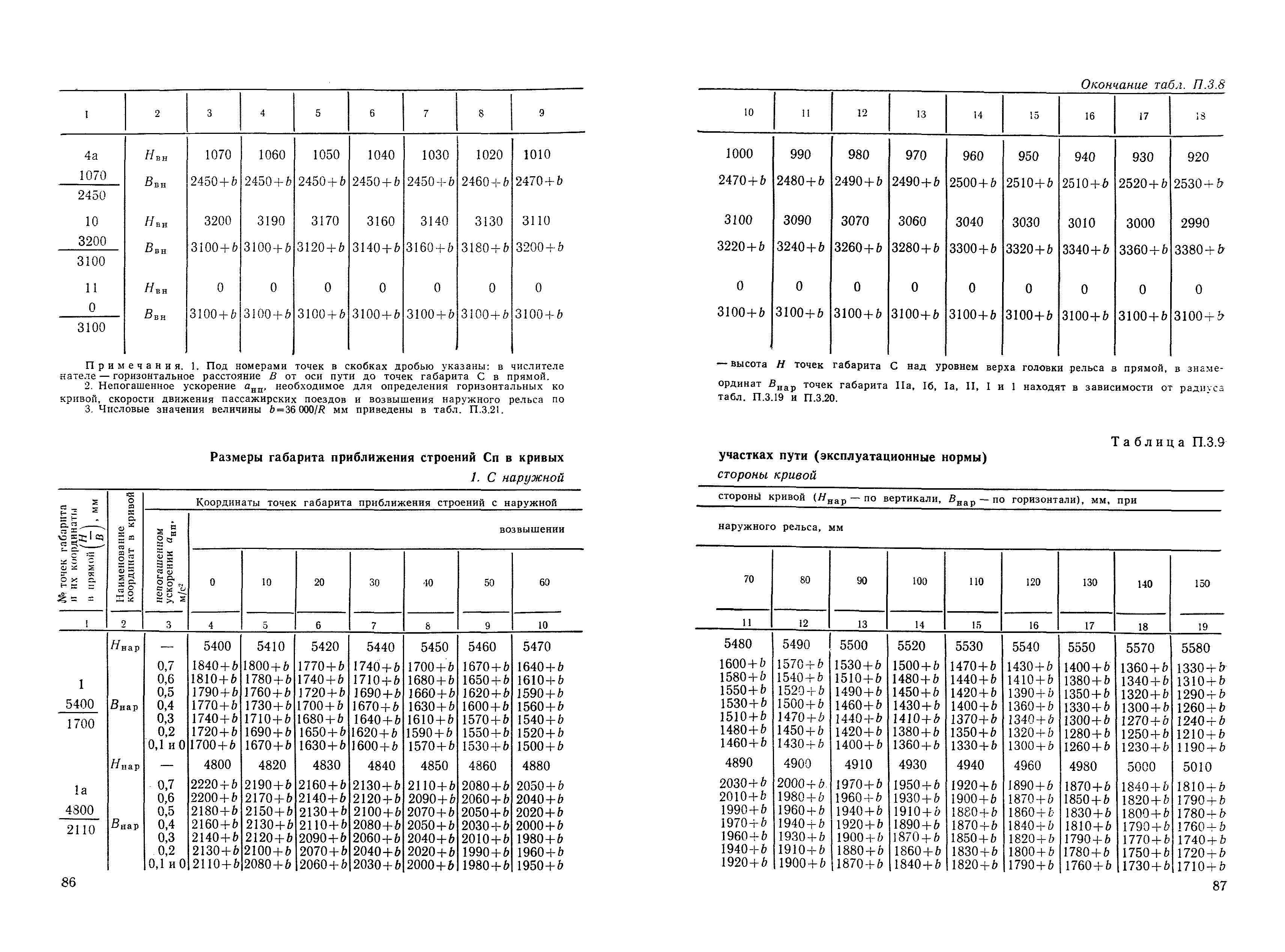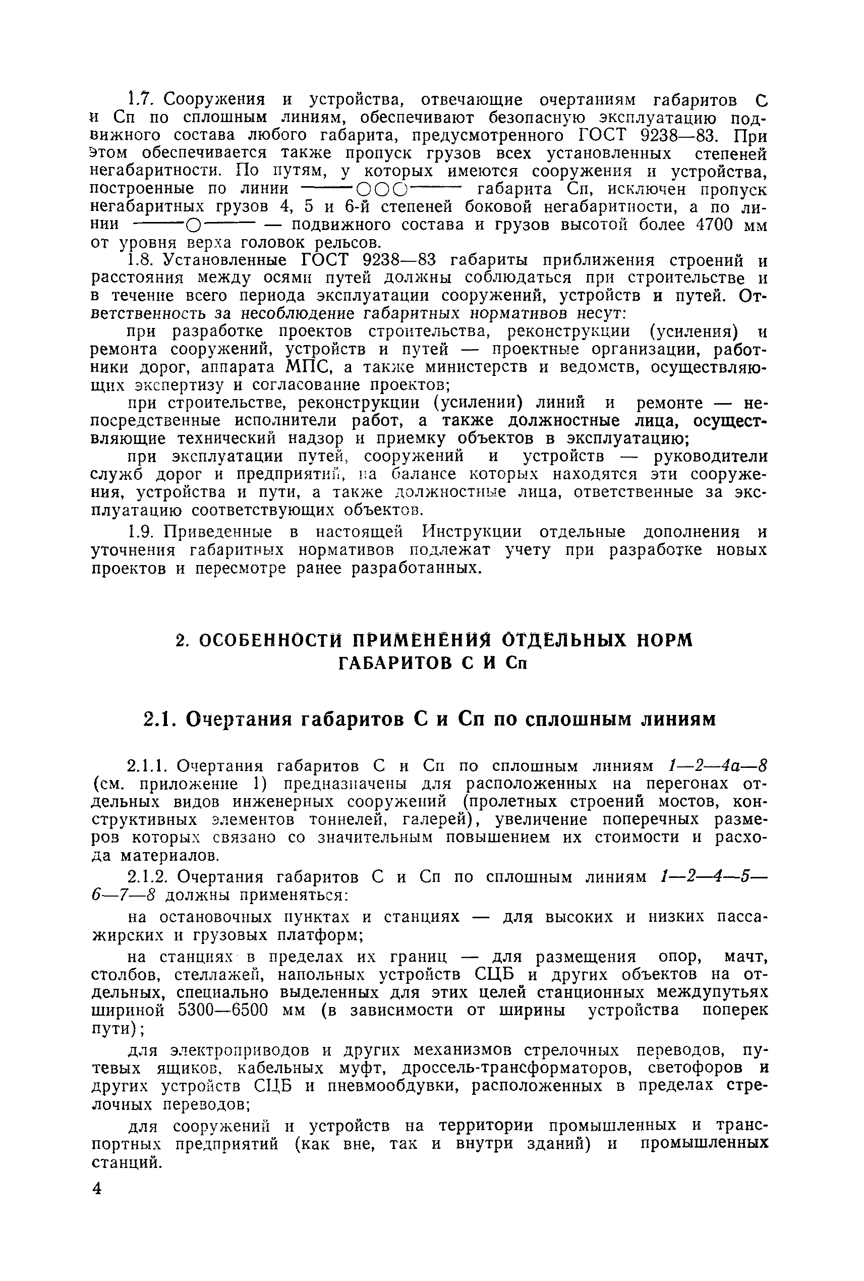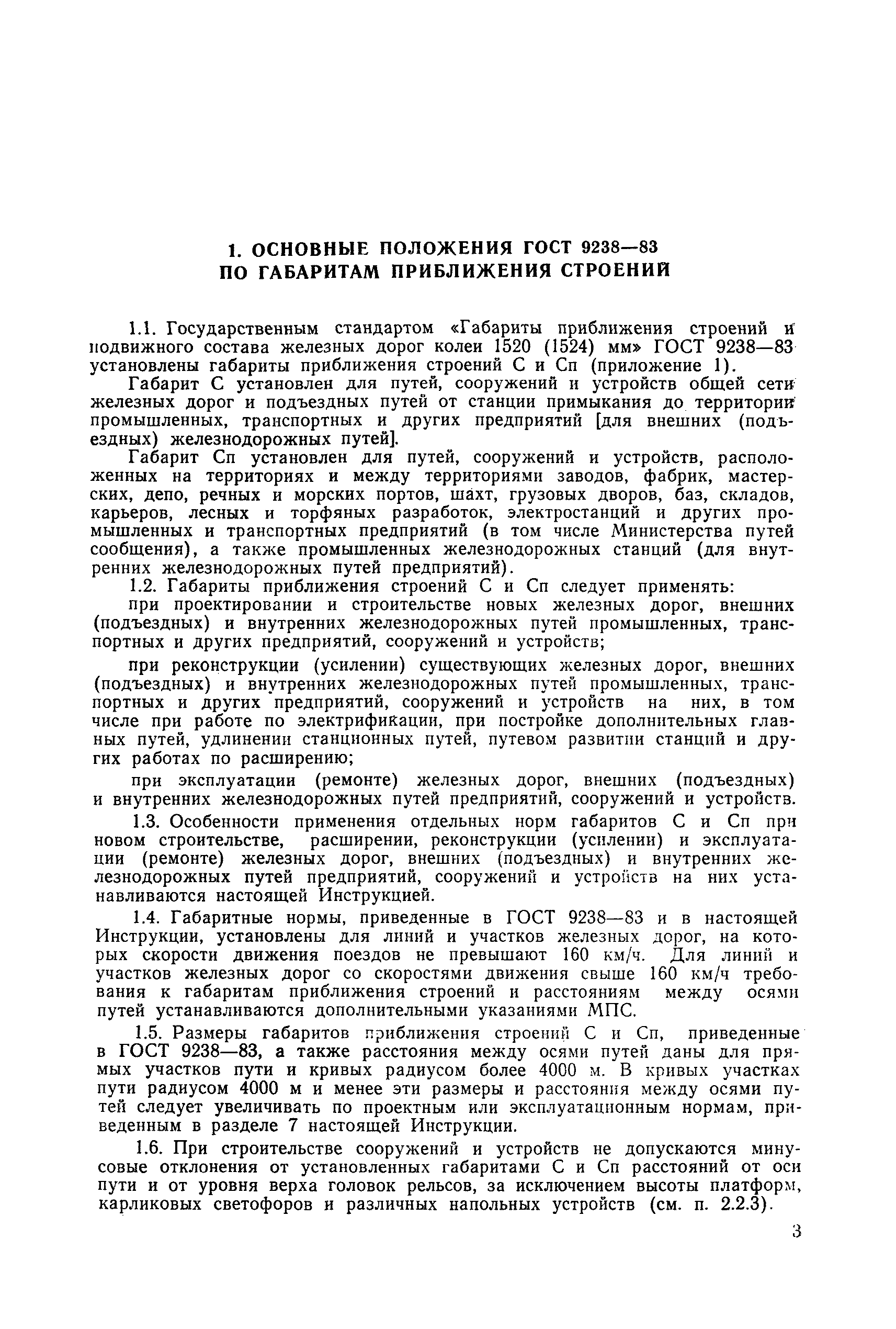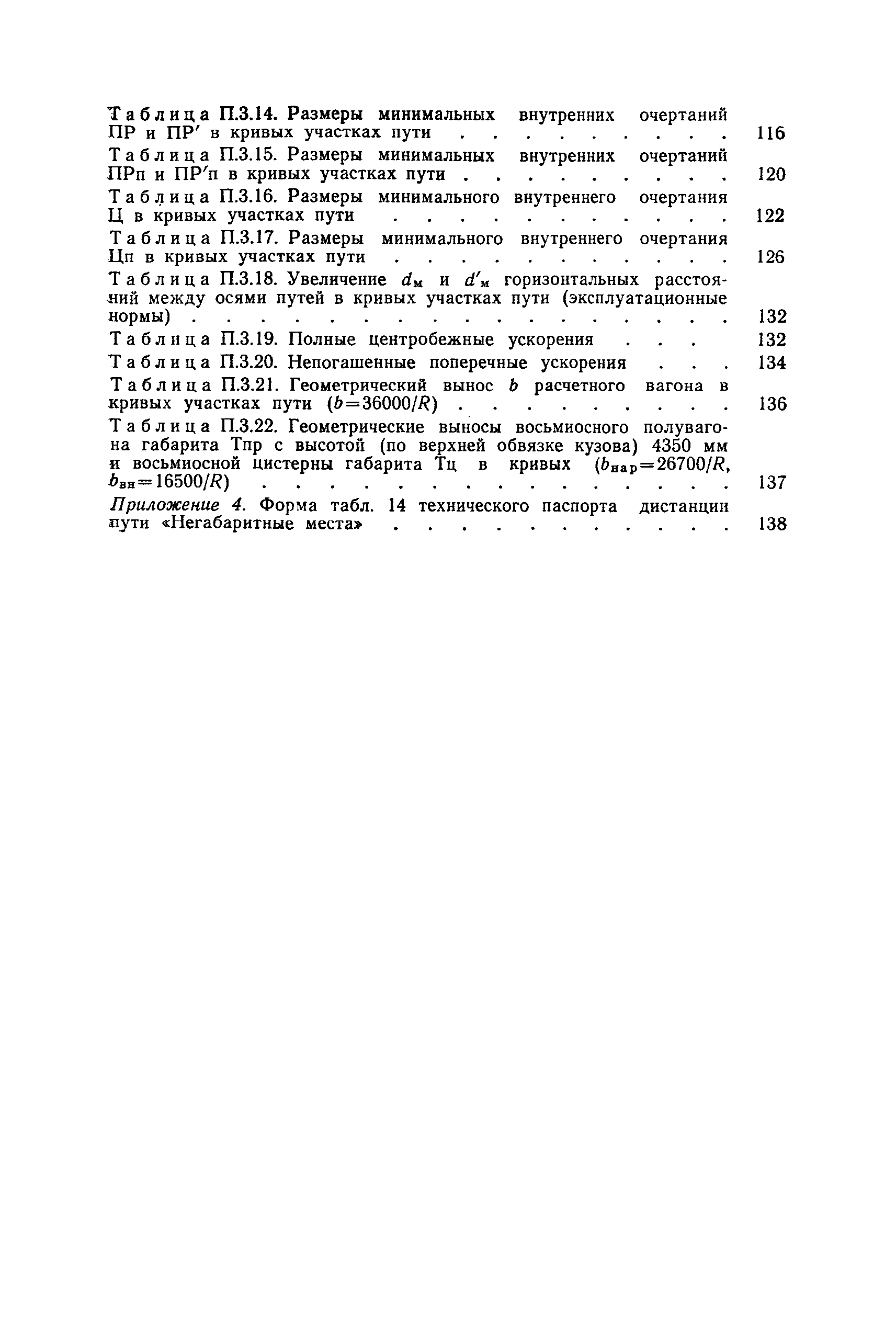 Инструкция по применению габаритов приближения строений ГОСТ 9238-83| Статус: | привязан к неактуализированному документу | | Название рус.: | Инструкция по применению габаритов приближения строений ГОСТ 9238-83 | | Дата добавления в базу: | 01.11.2014 | | Дата актуализации: | 01.01.2021 | | Область применения: | Инструкция включает требования к габаритным размерам сооружений, устройств и междупутий при подготовке железных дорог к эксплуатации подвижного состава габаритов Тпр и Тц, а также требования по контролю за габаритами приближения строений и учету негабаритных объектов. Инструкция предназначена для руководства при проектировании, строительстве и эксплуатации железных дорог колец 1520 (1524) мм общей сети Союза ССР, внешних (подъездных) и внутренних железнодорожных путей предприятий. | | Оглавление: | 1. Основные положения ГОСТ 9238—83 по габаритам приближения строений 2. Особенности применения отдельных норм габаритов С и Сп 2.1. Очертания габаритов С и Сп по сплошным линиям 2.2. Габариты пассажирских и грузовых платформ 2.3. Линия габаритов С и Сп (расстояние от оси пути 3100 мм) 2.4. Линия габарита Сп (расстояние от оси пути 2000 мм) 2.5. Линии габарита Сп 2.6. Верхнее очертание габарита С для электрифицированных линий 3. Минимальное внутреннее очертание переустраиваемых существующих инженерных сооружений 4. Расстояния между осями смежных путей 5. Минимально допустимые габаритные требования к сооружениям, устройствам и расстояниям между осями смежных путей при подготовке к эксплуатации восьмиосных полувагонов габарита Тпр и цистерн габарита Тц 5.1. Общие положения 5.2. Требования к габаритам сооружений и устройств 5.3. Минимально допустимые расстояния между осями путей при эксплуатации подвижного состава габаритов Тпр и Тц 6. Расстояния до материалов, запасных частей и оборудования, размещаемых у путей 7. Изменение размеров габаритов приближения строений и расстояний между осями путей в кривых участках пути 7.1. Общие положения 7.2. Проектные нормы 7.3. Эксплуатационные нормы 7.4. Отводы уширений габаритов приближения строений на подходах к кривым участкам пути 8. Контроль габаритов, учет и устранение негабаритных мест 8.1. Общие положения 8.2. Производство габаритных промеров 8.3. Негабаритные сооружения, устройства и расстояния между осями путей, их учет, переустройство и отчетность по ним Приложение 1. Габариты приближения строений С и Сп, установленные ГОСТ 9238—83 Приложение 2. Минимально допустимые горизонтальные и вертикальные зазоры между сооружениями или устройствами и габаритом подвижного состава или конкретным подвижным составом Таблиц а П.2.1. Минимально допустимые горизонтальные зазоры , между сооружениями или устройствами и габаритом подвижного состава или конкретным подвижным составом Таблица П.2.2. Минимально допустимые вертикальные зазоры между сооружениями или устройствами и габаритом подвижного состава или конкретным подвижным составом Приложение 3. Таблицы норм изменения размеров габаритов приближения строений и расстояний между осями путей в кривых участках пути Таблица П.3.1. Размеры габарита приближения строений С в кривых участках пути для сооружений и устройств на перегонах и у главных путей раздельных пунктов общей сети железных дорог (проектные нормы) Таблица П.3.2. Размеры габаритов приближения строений С и Сп в кривых участках пути дл