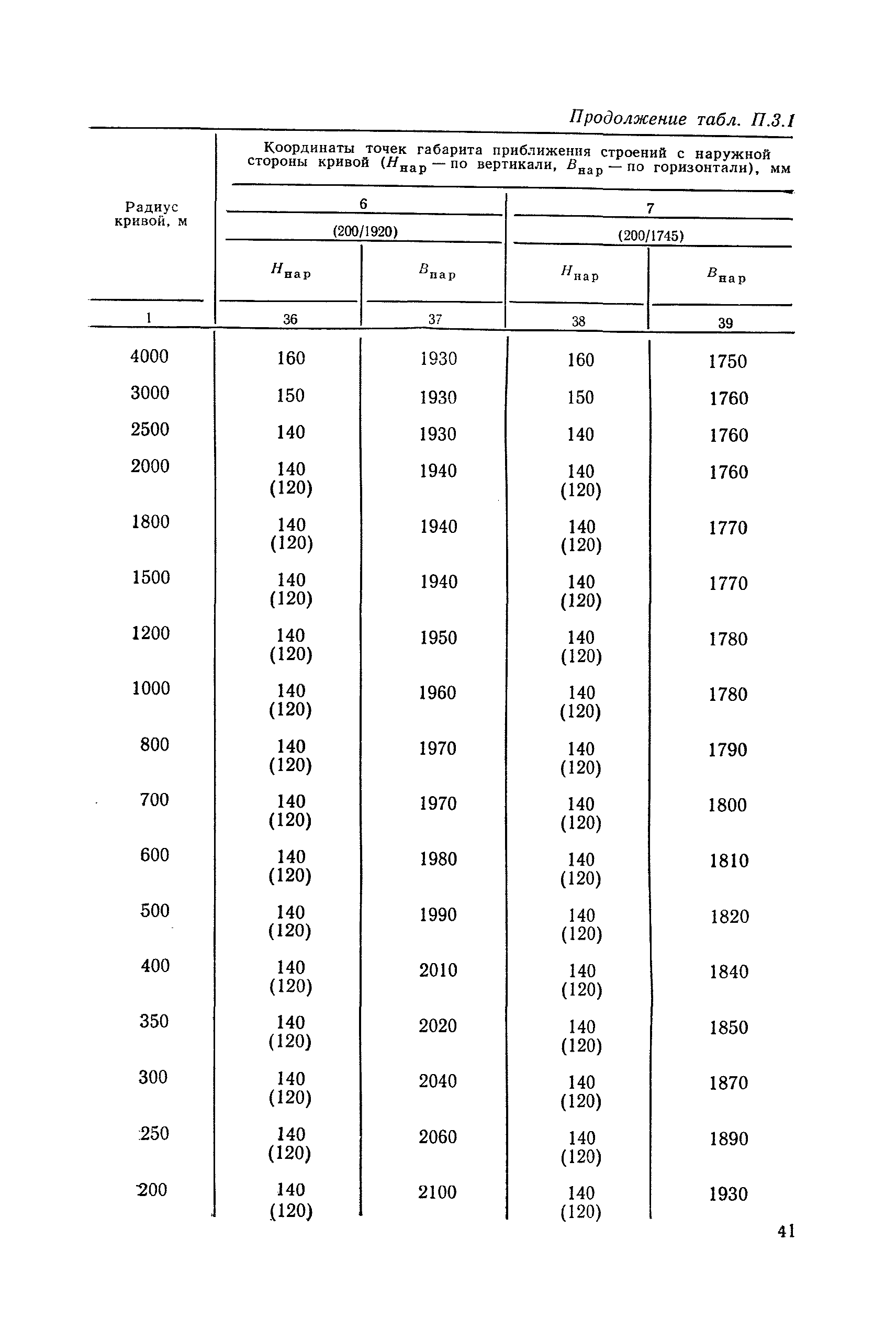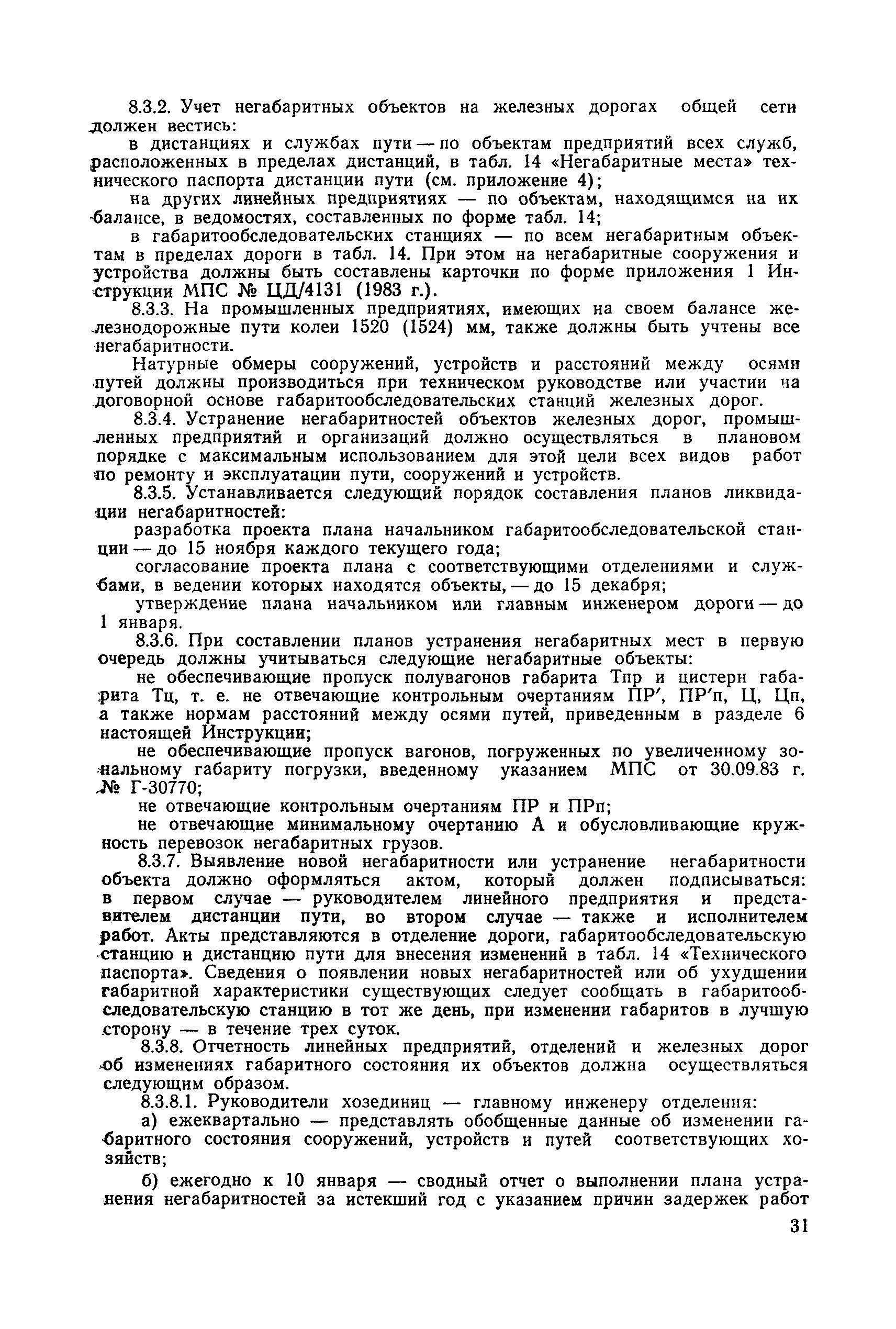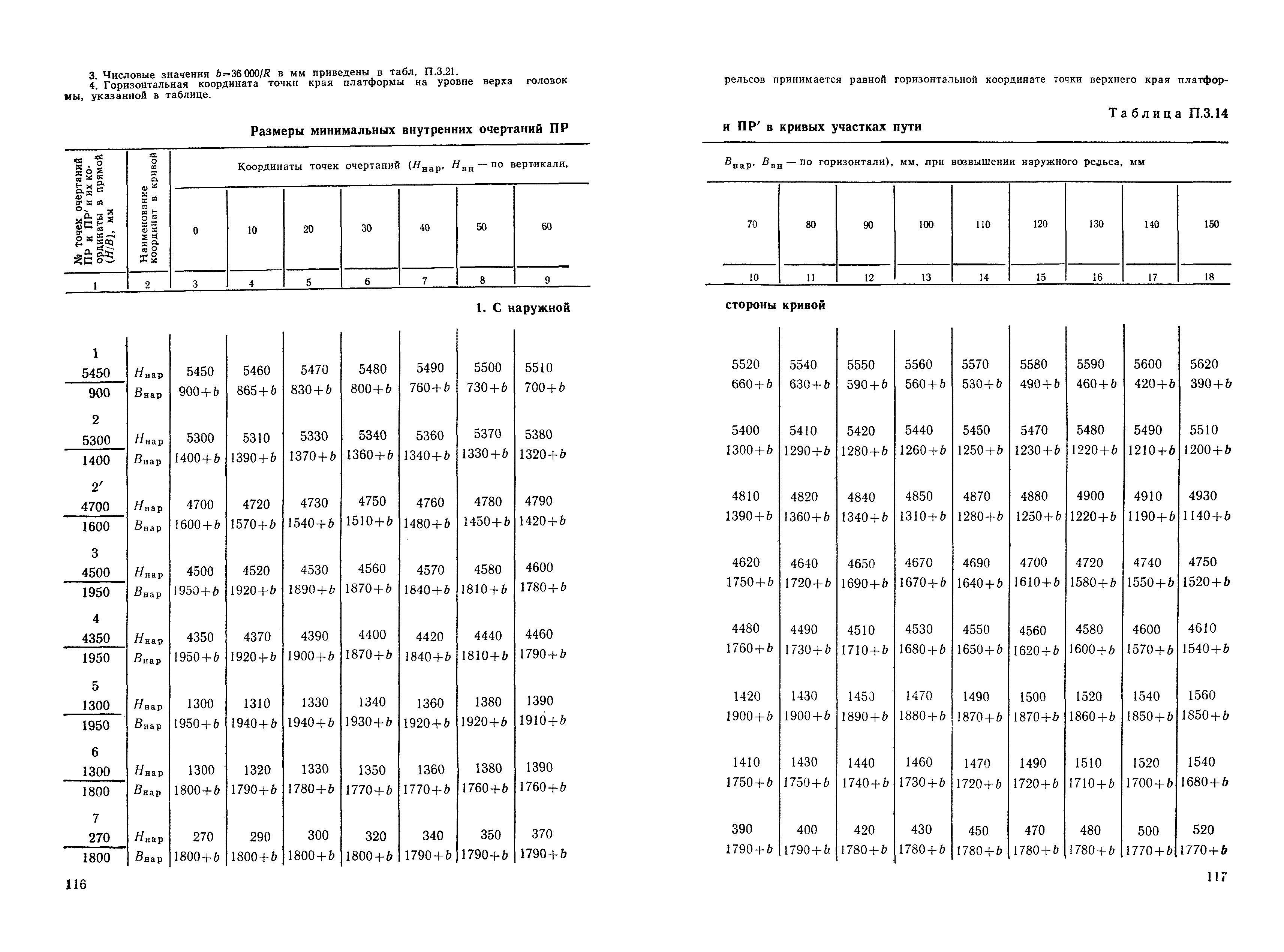 Инструкция по применению габаритов приближения строений ГОСТ 9238-83| Статус: | привязан к неактуализированному документу | | Название рус.: | Инструкция по применению габаритов приближения строений ГОСТ 9238-83 | | Дата добавления в базу: | 01.11.2014 | | Дата актуализации: | 01.01.2021 | | Область применения: | Инструкция включает требования к габаритным размерам сооружений, устройств и междупутий при подготовке железных дорог к эксплуатации подвижного состава габаритов Тпр и Тц, а также требования по контролю за габаритами приближения строений и учету негабаритных объектов. Инструкция предназначена для руководства при проектировании, строительстве и эксплуатации железных дорог колец 1520 (1524) мм общей сети Союза ССР, внешних (подъездных) и внутренних железнодорожных путей предприятий. | | Оглавление: | 1. Основные положения ГОСТ 9238—83 по габаритам приближения строений 2. Особенности применения отдельных норм габаритов С и Сп 2.1. Очертания габаритов С и Сп по сплошным линиям 2.2. Габариты пассажирских и грузовых платформ 2.3. Линия габаритов С и Сп (расстояние от оси пути 3100 мм) 2.4. Линия габарита Сп (расстояние от оси пути 2000 мм) 2.5. Линии габарита Сп 2.6. Верхнее очертание габарита С для электрифицированных линий 3. Минимальное внутреннее очертание переустраиваемых существующих инженерных сооружений 4. Расстояния между осями смежных путей 5. Минимально допустимые габаритные требования к сооружениям, устройствам и расстояниям между осями смежных путей при подготовке к эксплуатации восьмиосных полувагонов габарита Тпр и цистерн габарита Тц 5.1. Общие положения 5.2. Требования к габаритам сооружений и устройств 5.3. Минимально допустимые расстояния между осями путей при эксплуатации подвижного состава габаритов Тпр и Тц 6. Расстояния до материалов, запасных частей и оборудования, размещаемых у путей 7. Изменение размеров габаритов приближения строений и расстояний между осями путей в кривых участках пути 7.1. Общие положения 7.2. Проектные нормы 7.3. Эксплуатационные нормы 7.4. Отводы уширений габаритов приближения строений на подходах к кривым участкам пути 8. Контроль габаритов, учет и устранение негабаритных мест 8.1. Общие положения 8.2. Производство габаритных промеров 8.3. Негабаритные сооружения, устройства и расстояния между осями путей, их учет, переустройство и отчетность по ним Приложение 1. Габариты приближения строений С и Сп, установленные ГОСТ 9238—83 Приложение 2. Минимально допустимые горизонтальные и вертикальные зазоры между сооружениями или устройствами и габаритом подвижного состава или конкретным подвижным составом Таблиц а П.2.1. Минимально допустимые горизонтальные зазоры , между сооружениями или устройствами и габаритом подвижного состава или конкретным подвижным составом Таблица П.2.2. Минимально допустимые вертикальные зазоры между сооружениями или устройствами и габаритом подвижного состава или конкретным подвижным составом Приложение 3. Таблицы норм изменения размеров габаритов приближения строений и расстояний между осями путей в кривых участках пути Таблица П.3.1. Размеры габарита приближения строений С в кривых участках пути для сооружений и устройств на перегонах и у главных путей раздельных пунктов общей сети железных дорог (проектные нормы) Таблица П.3.2. Размеры габаритов приближения строений С и Сп в кривых участках пути дл