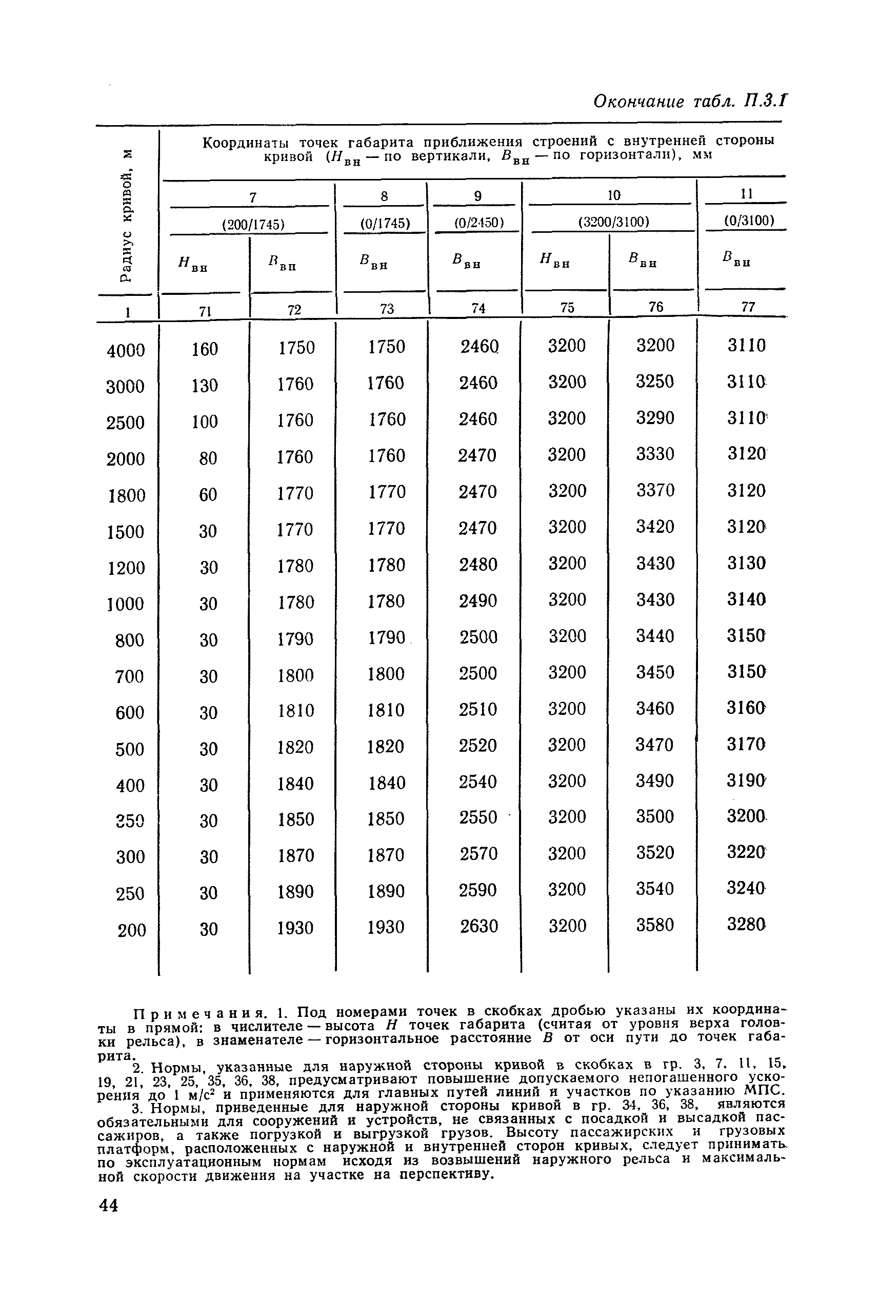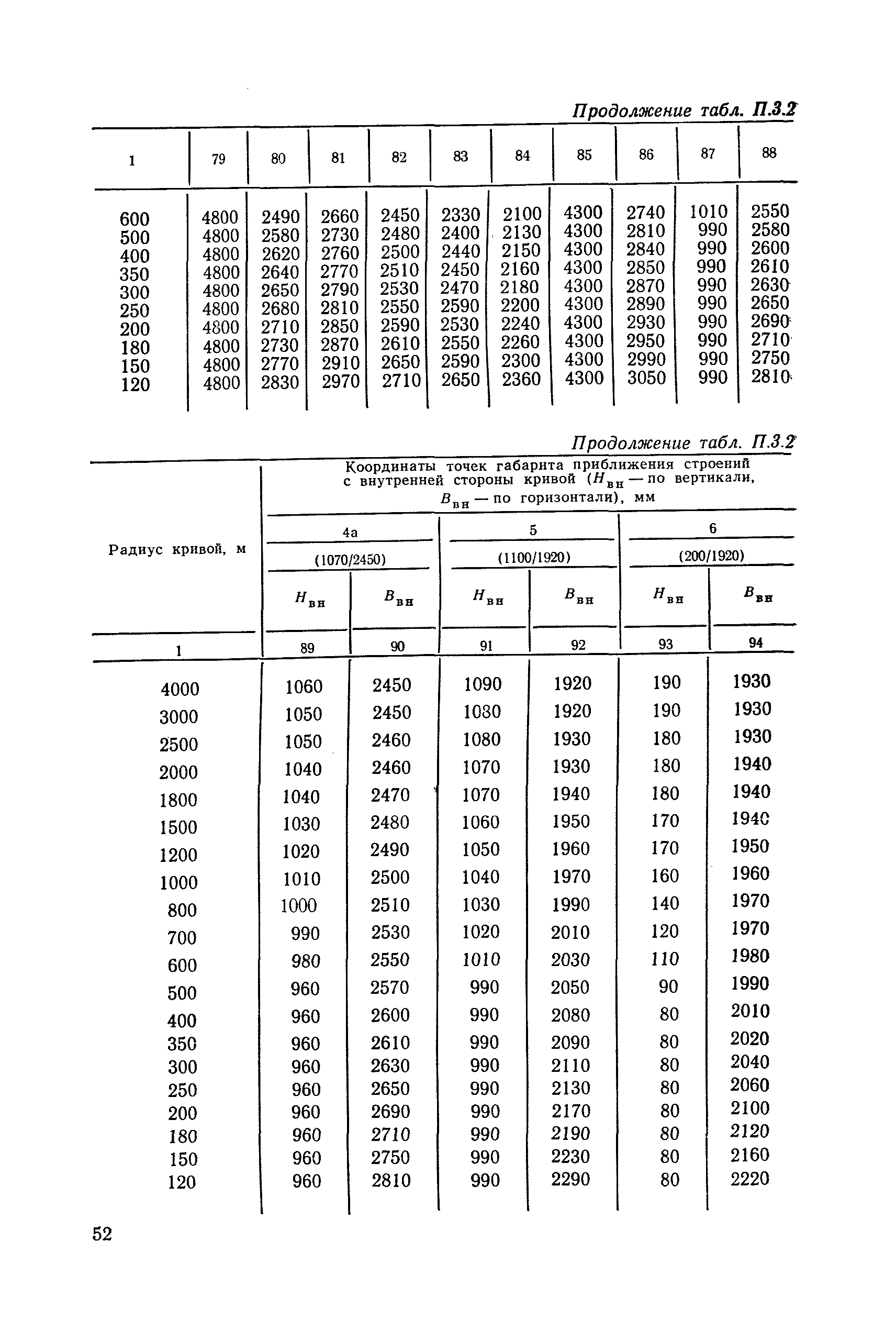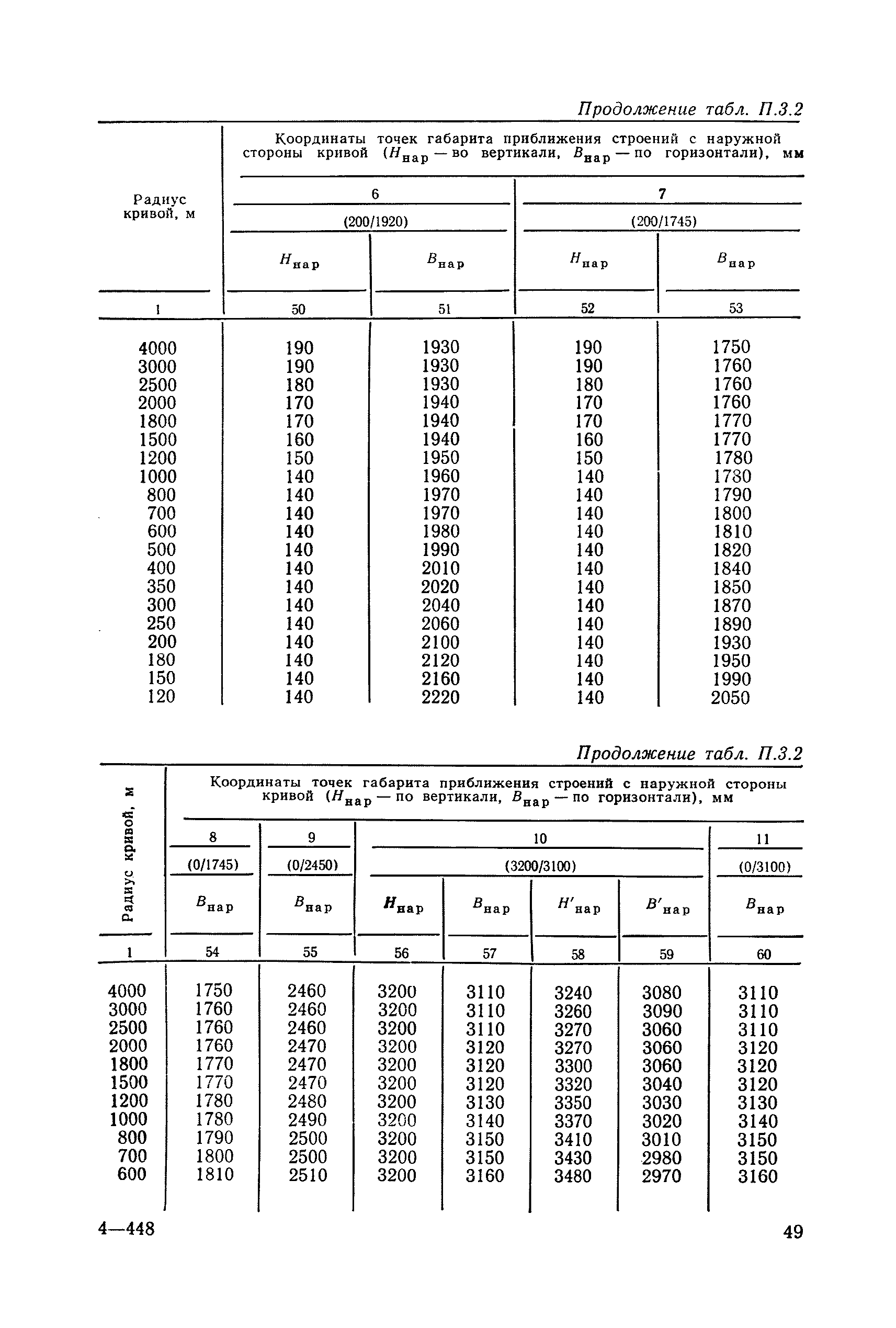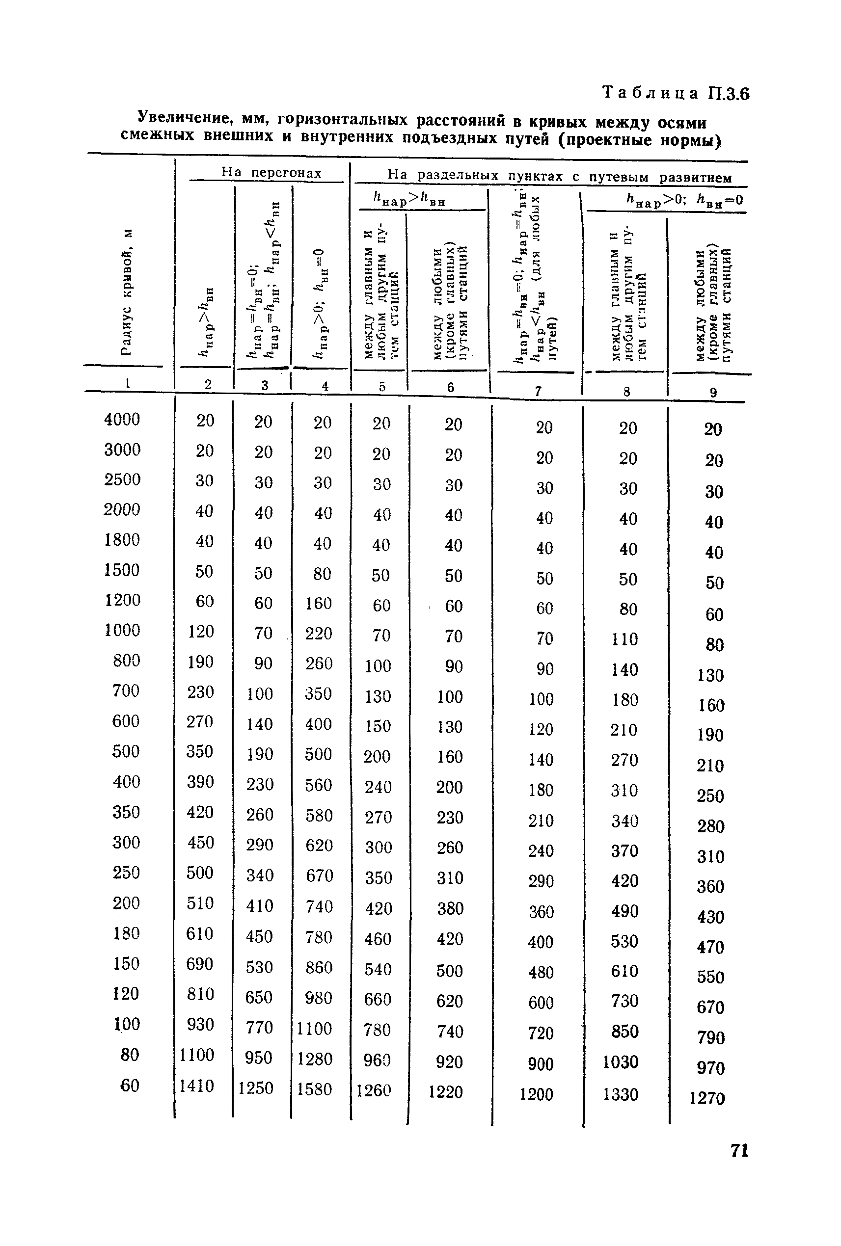 Инструкция по применению габаритов приближения строений ГОСТ 9238-83| Статус: | привязан к неактуализированному документу | | Название рус.: | Инструкция по применению габаритов приближения строений ГОСТ 9238-83 | | Дата добавления в базу: | 01.11.2014 | | Дата актуализации: | 01.01.2021 | | Область применения: | Инструкция включает требования к габаритным размерам сооружений, устройств и междупутий при подготовке железных дорог к эксплуатации подвижного состава габаритов Тпр и Тц, а также требования по контролю за габаритами приближения строений и учету негабаритных объектов. Инструкция предназначена для руководства при проектировании, строительстве и эксплуатации железных дорог колец 1520 (1524) мм общей сети Союза ССР, внешних (подъездных) и внутренних железнодорожных путей предприятий. | | Оглавление: | 1. Основные положения ГОСТ 9238—83 по габаритам приближения строений 2. Особенности применения отдельных норм габаритов С и Сп 2.1. Очертания габаритов С и Сп по сплошным линиям 2.2. Габариты пассажирских и грузовых платформ 2.3. Линия габаритов С и Сп (расстояние от оси пути 3100 мм) 2.4. Линия габарита Сп (расстояние от оси пути 2000 мм) 2.5. Линии габарита Сп 2.6. Верхнее очертание габарита С для электрифицированных линий 3. Минимальное внутреннее очертание переустраиваемых существующих инженерных сооружений 4. Расстояния между осями смежных путей 5. Минимально допустимые габаритные требования к сооружениям, устройствам и расстояниям между осями смежных путей при подготовке к эксплуатации восьмиосных полувагонов габарита Тпр и цистерн габарита Тц 5.1. Общие положения 5.2. Требования к габаритам сооружений и устройств 5.3. Минимально допустимые расстояния между осями путей при эксплуатации подвижного состава габаритов Тпр и Тц 6. Расстояния до материалов, запасных частей и оборудования, размещаемых у путей 7. Изменение размеров габаритов приближения строений и расстояний между осями путей в кривых участках пути 7.1. Общие положения 7.2. Проектные нормы 7.3. Эксплуатационные нормы 7.4. Отводы уширений габаритов приближения строений на подходах к кривым участкам пути 8. Контроль габаритов, учет и устранение негабаритных мест 8.1. Общие положения 8.2. Производство габаритных промеров 8.3. Негабаритные сооружения, устройства и расстояния между осями путей, их учет, переустройство и отчетность по ним Приложение 1. Габариты приближения строений С и Сп, установленные ГОСТ 9238—83 Приложение 2. Минимально допустимые горизонтальные и вертикальные зазоры между сооружениями или устройствами и габаритом подвижного состава или конкретным подвижным составом Таблиц а П.2.1. Минимально допустимые горизонтальные зазоры , между сооружениями или устройствами и габаритом подвижного состава или конкретным подвижным составом Таблица П.2.2. Минимально допустимые вертикальные зазоры между сооружениями или устройствами и габаритом подвижного состава или конкретным подвижным составом Приложение 3. Таблицы норм изменения размеров габаритов приближения строений и расстояний между осями путей в кривых участках пути Таблица П.3.1. Размеры габарита приближения строений С в кривых участках пути для сооружений и устройств на перегонах и у главных путей раздельных пунктов общей сети железных дорог (проектные нормы) Таблица П.3.2. Размеры габаритов приближения строений С и Сп в кривых участках пути дл