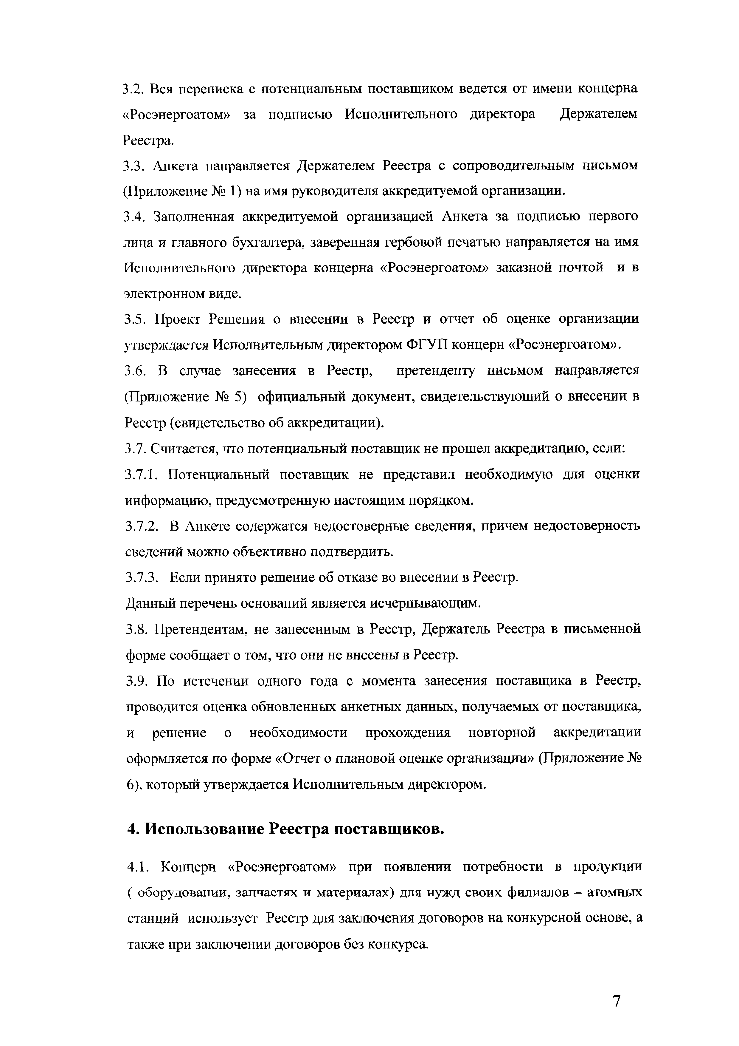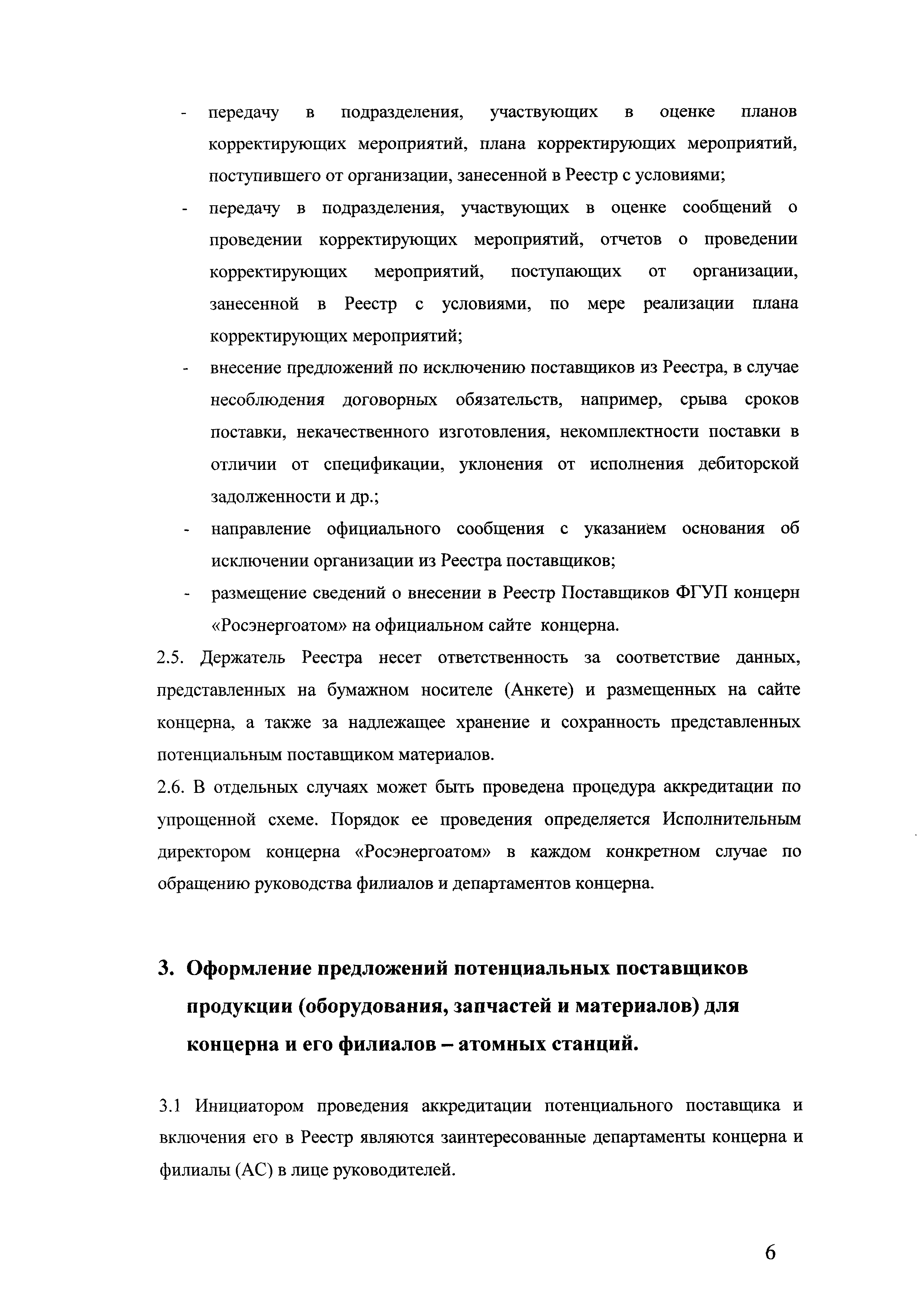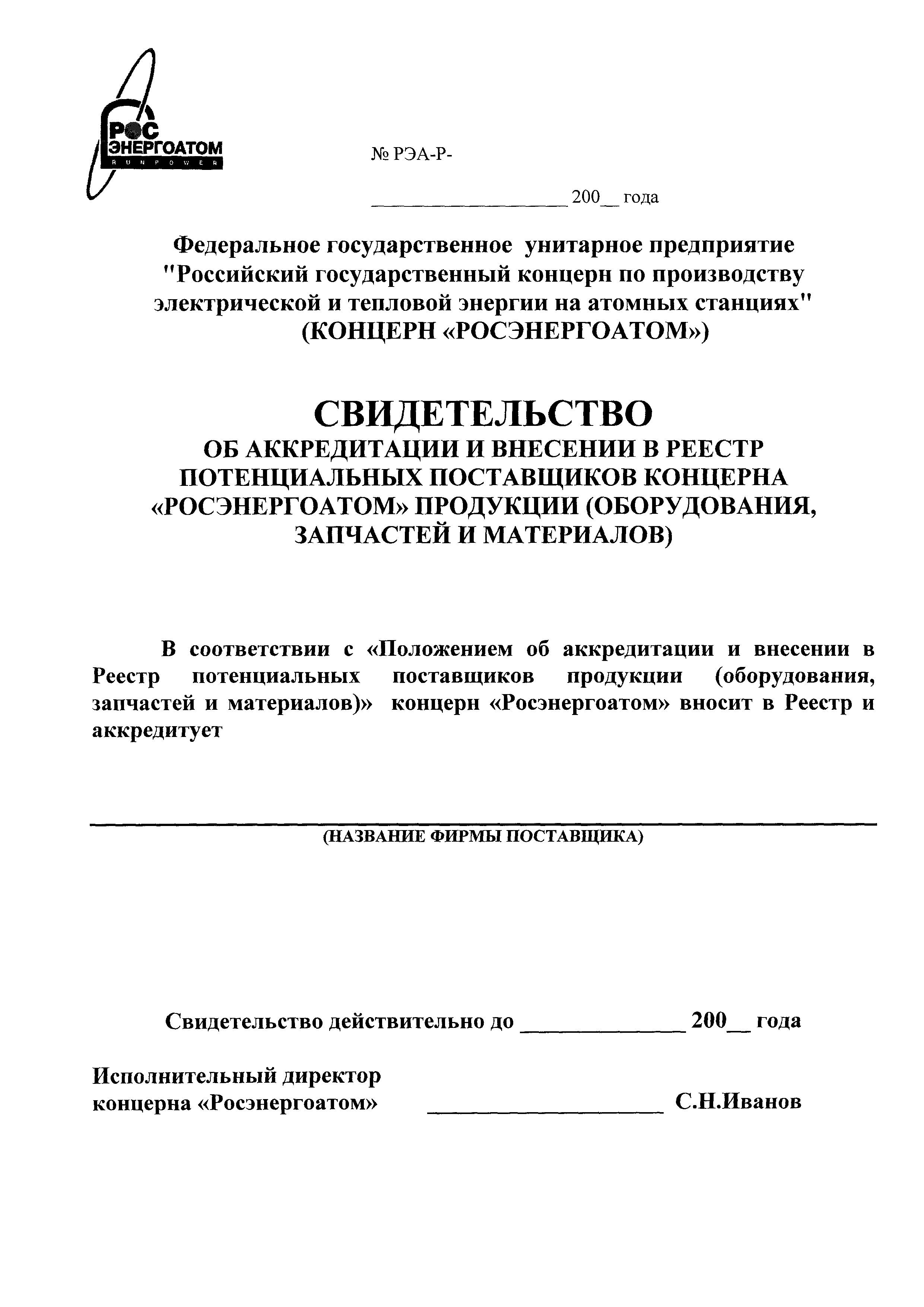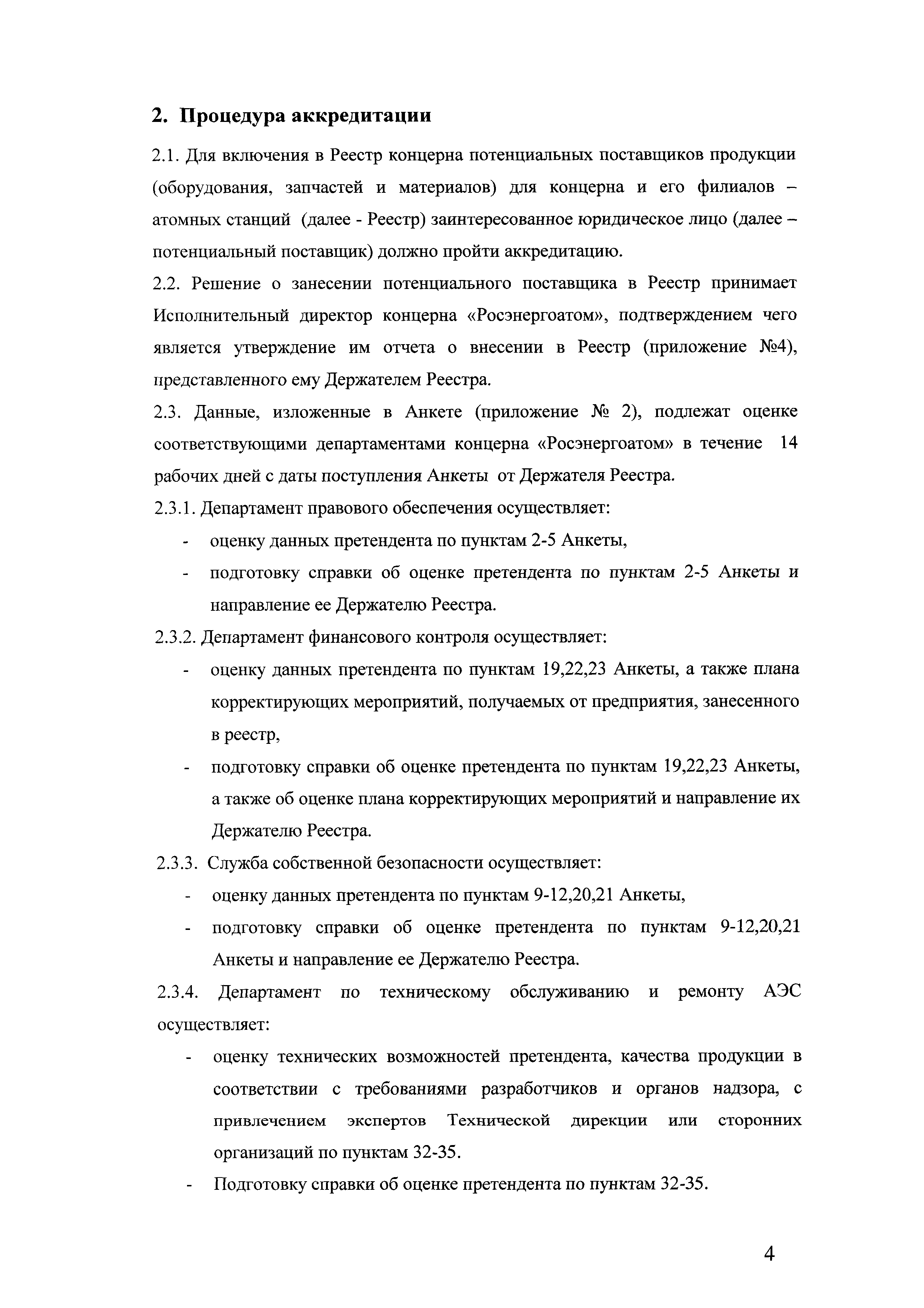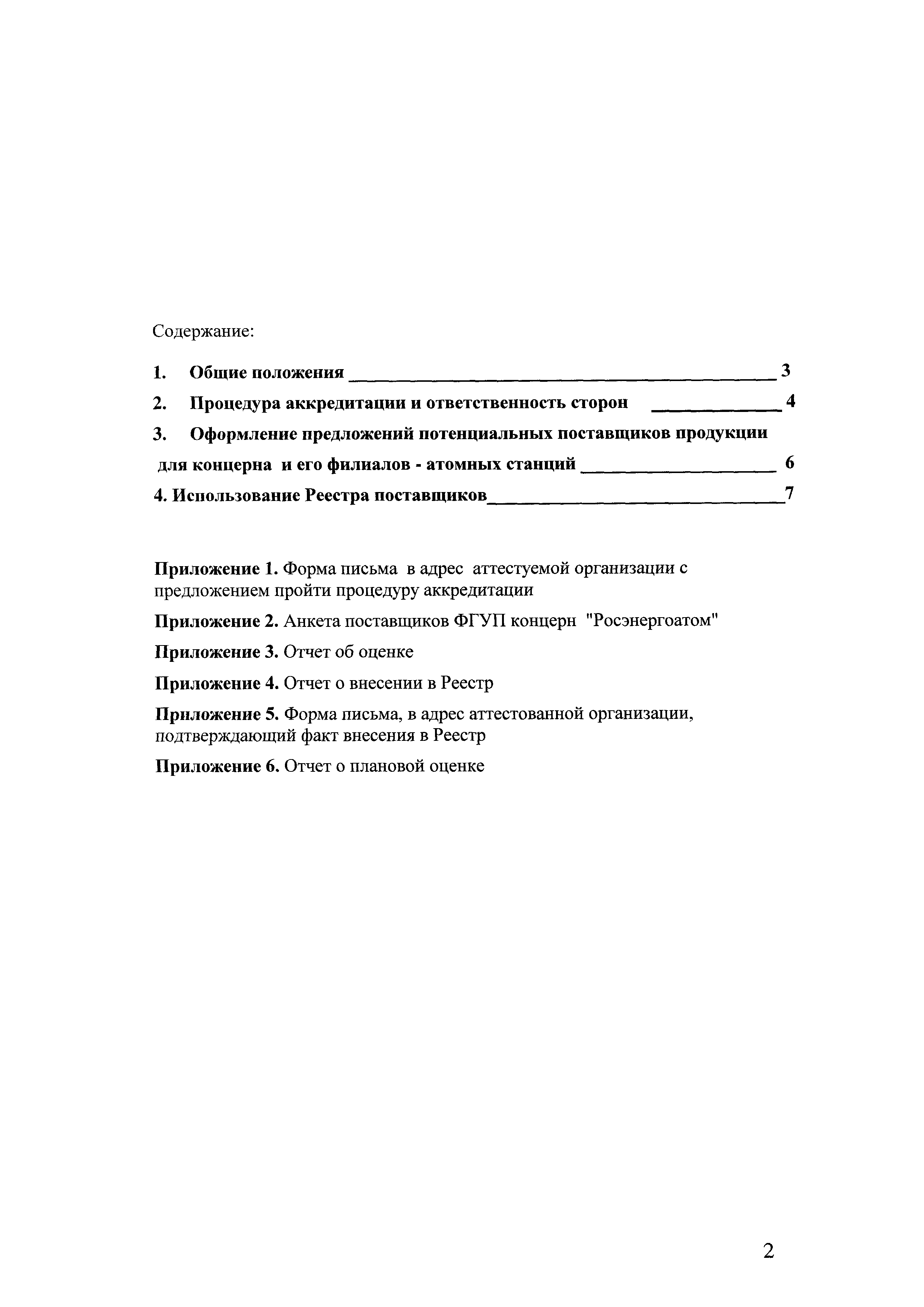Положение об аккредитации потенциальных поставщиков оборудования, запчастей и материалов для концерна "Росэнергоатом" и его филиалов - атомных станций и о внесении их в Реестр концерна "Росэнергоатом"| Статус: | не определен законодательством | | Название рус.: | Положение об аккредитации потенциальных поставщиков оборудования, запчастей и материалов для концерна "Росэнергоатом" и его филиалов - атомных станций и о внесении их в Реестр концерна "Росэнергоатом" | | Дата добавления в базу: | 01.09.2013 | | Дата актуализации: | 01.01.2021 | | Область применения: | Положение устанавливает порядок аккредитации потенциальных поставщиков оборудования, запчастей и материалов для концерна "Росэнергоатом" и его филиалов - атомных станций и внесения их в реестр концерна. | | Оглавление: | 1. Общие положения 2. Процедура аккредитации 3. Оформление предложений потенциальных поставщиков продукции (оборудования, запчастей и материалов) для концерна и его филиалов - атомных станций 4. Использование Реестра поставщиков Приложение 1. Форма письма в адрес аттестуемой организации с предложением пройти процедуру аккредитации Приложение 2. Анкета потенциального поставщика ФГУП концерн "Росэнергоатом" Приложение 3. Отчет об оценке Приложение 4. Отчет о внесении в Реестр Приложение 5. Форма письма, в адрес аттестованной организации. подтверждающий факт внесения в Реестр Приложение 6. Отчет о плановой оценке | | Утверждён: | 29.10.2002 Концерн Росэнергоатом (Rosenergoatom Concern 749)