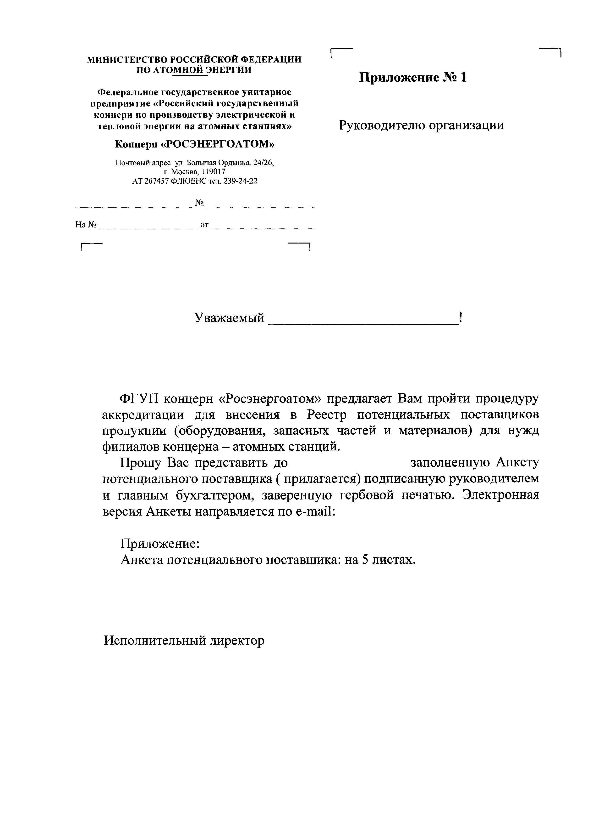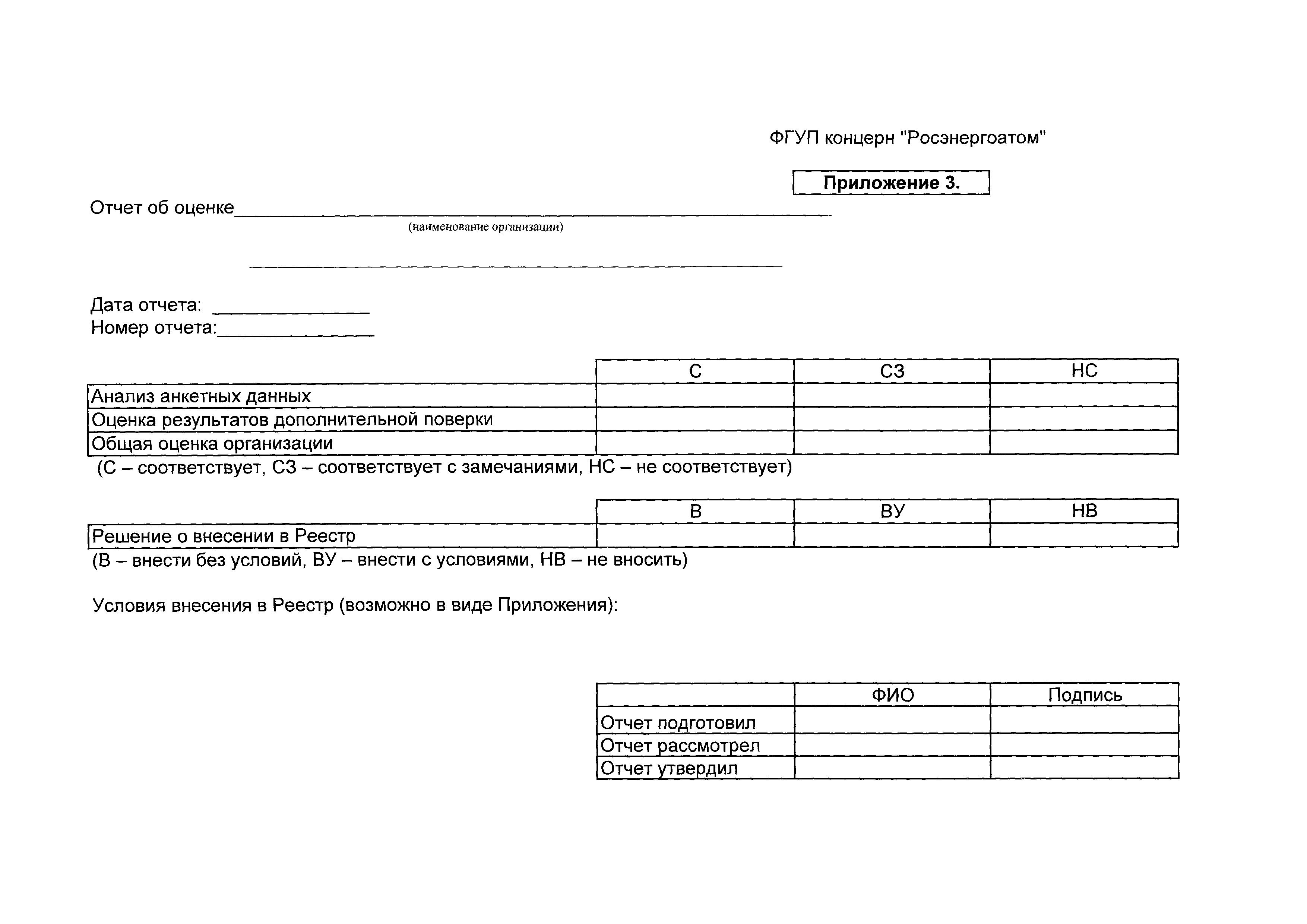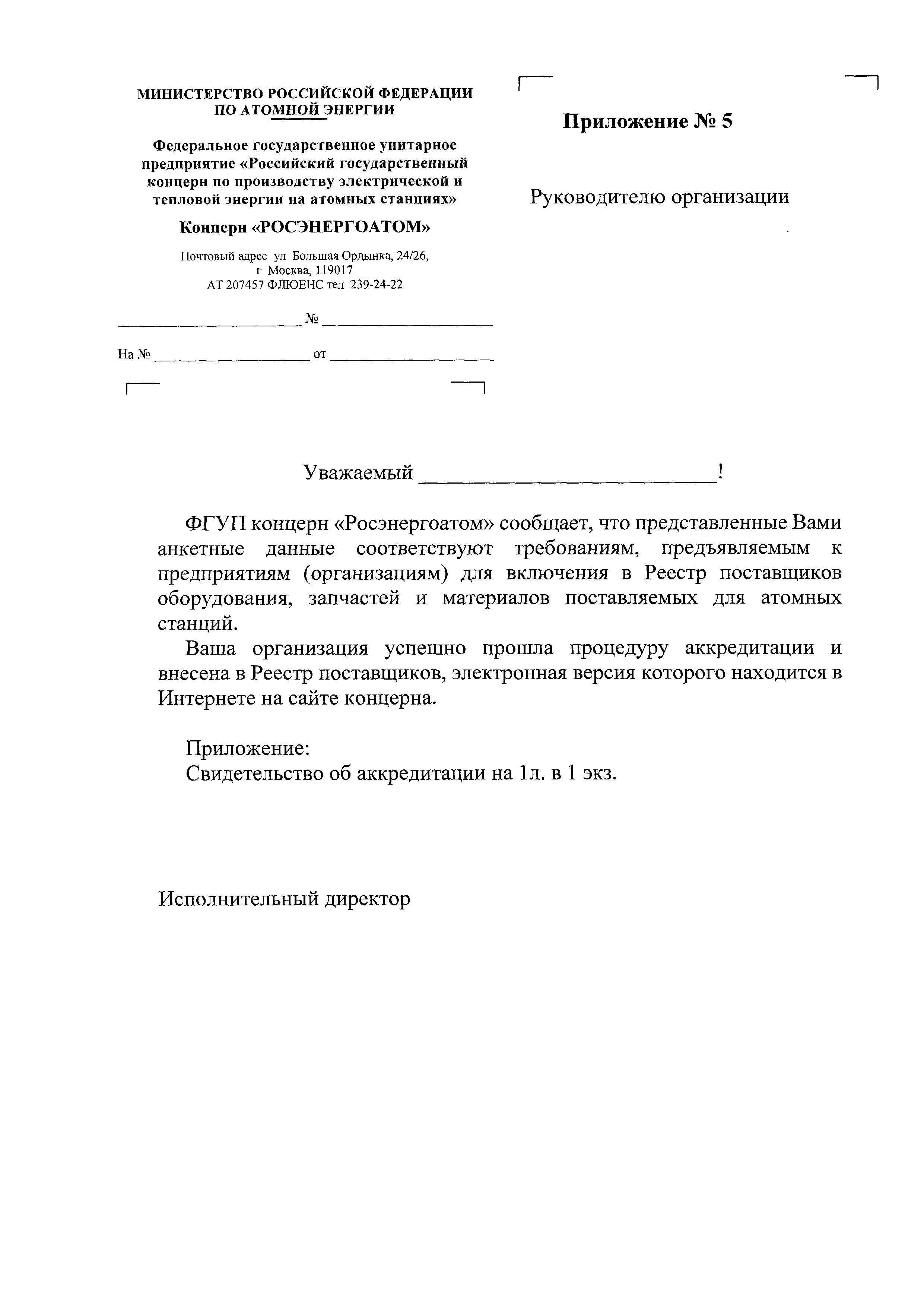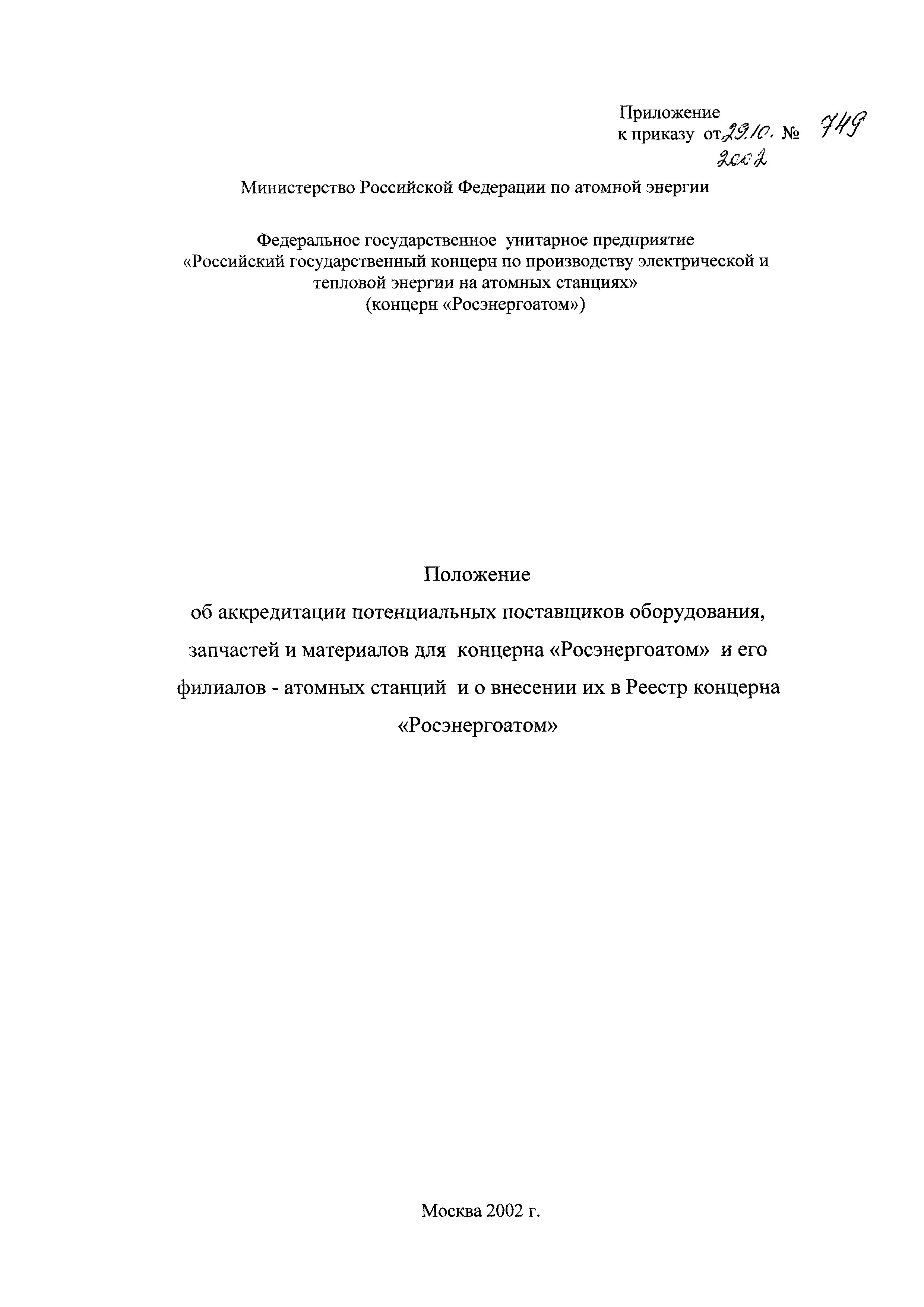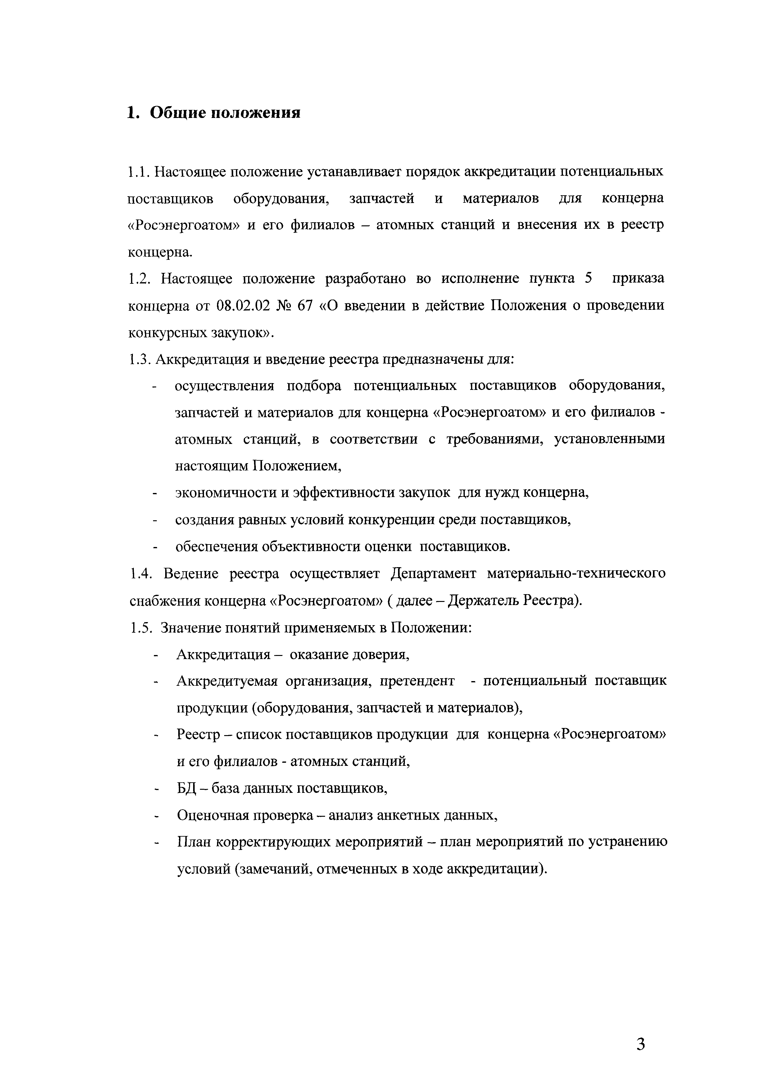Положение об аккредитации потенциальных поставщиков оборудования, запчастей и материалов для концерна "Росэнергоатом" и его филиалов - атомных станций и о внесении их в Реестр концерна "Росэнергоатом"| Статус: | не определен законодательством | | Название рус.: | Положение об аккредитации потенциальных поставщиков оборудования, запчастей и материалов для концерна "Росэнергоатом" и его филиалов - атомных станций и о внесении их в Реестр концерна "Росэнергоатом" | | Дата добавления в базу: | 01.09.2013 | | Дата актуализации: | 01.01.2021 | | Область применения: | Положение устанавливает порядок аккредитации потенциальных поставщиков оборудования, запчастей и материалов для концерна "Росэнергоатом" и его филиалов - атомных станций и внесения их в реестр концерна. | | Оглавление: | 1. Общие положения 2. Процедура аккредитации 3. Оформление предложений потенциальных поставщиков продукции (оборудования, запчастей и материалов) для концерна и его филиалов - атомных станций 4. Использование Реестра поставщиков Приложение 1. Форма письма в адрес аттестуемой организации с предложением пройти процедуру аккредитации Приложение 2. Анкета потенциального поставщика ФГУП концерн "Росэнергоатом" Приложение 3. Отчет об оценке Приложение 4. Отчет о внесении в Реестр Приложение 5. Форма письма, в адрес аттестованной организации. подтверждающий факт внесения в Реестр Приложение 6. Отчет о плановой оценке | | Утверждён: | 29.10.2002 Концерн Росэнергоатом (Rosenergoatom Concern 749)